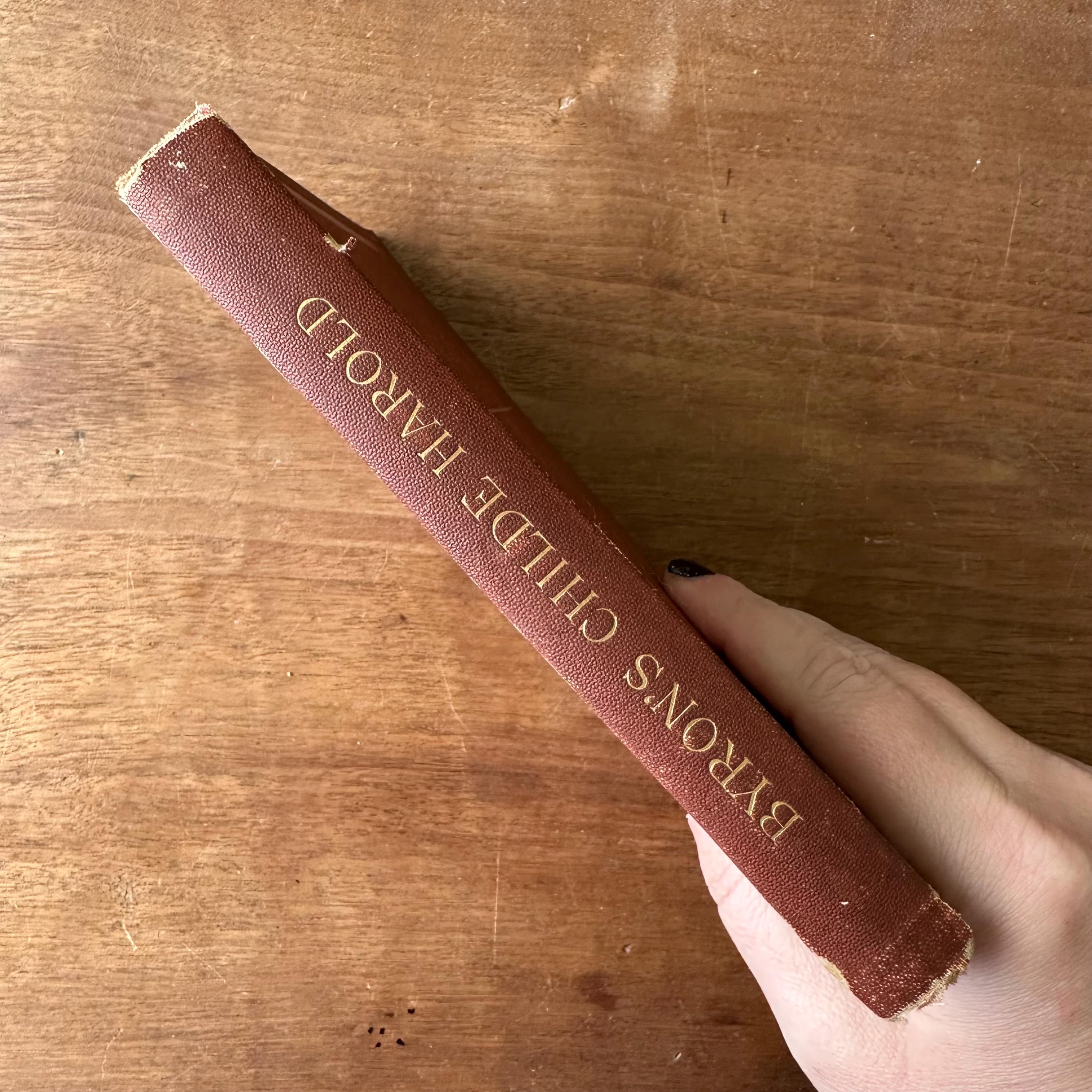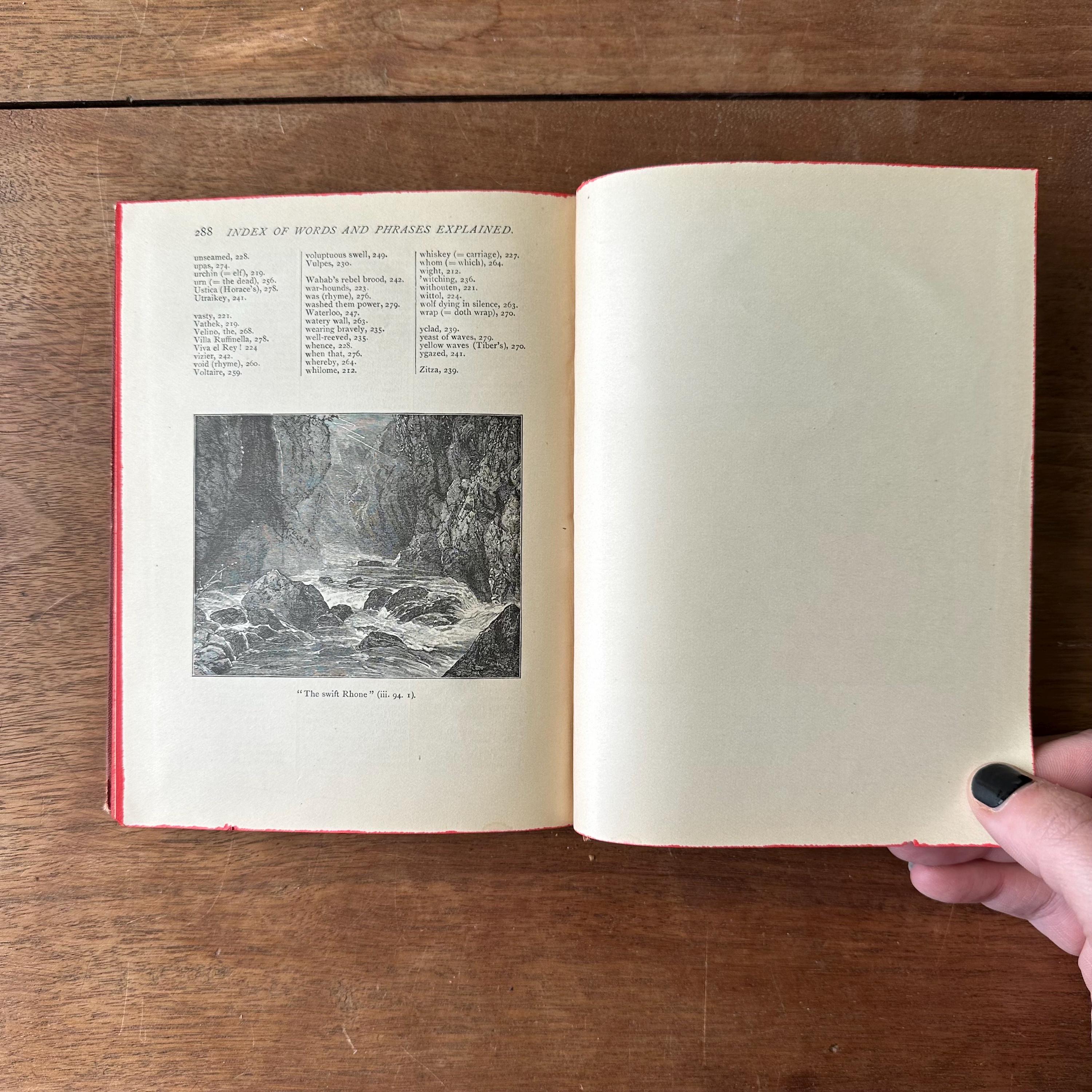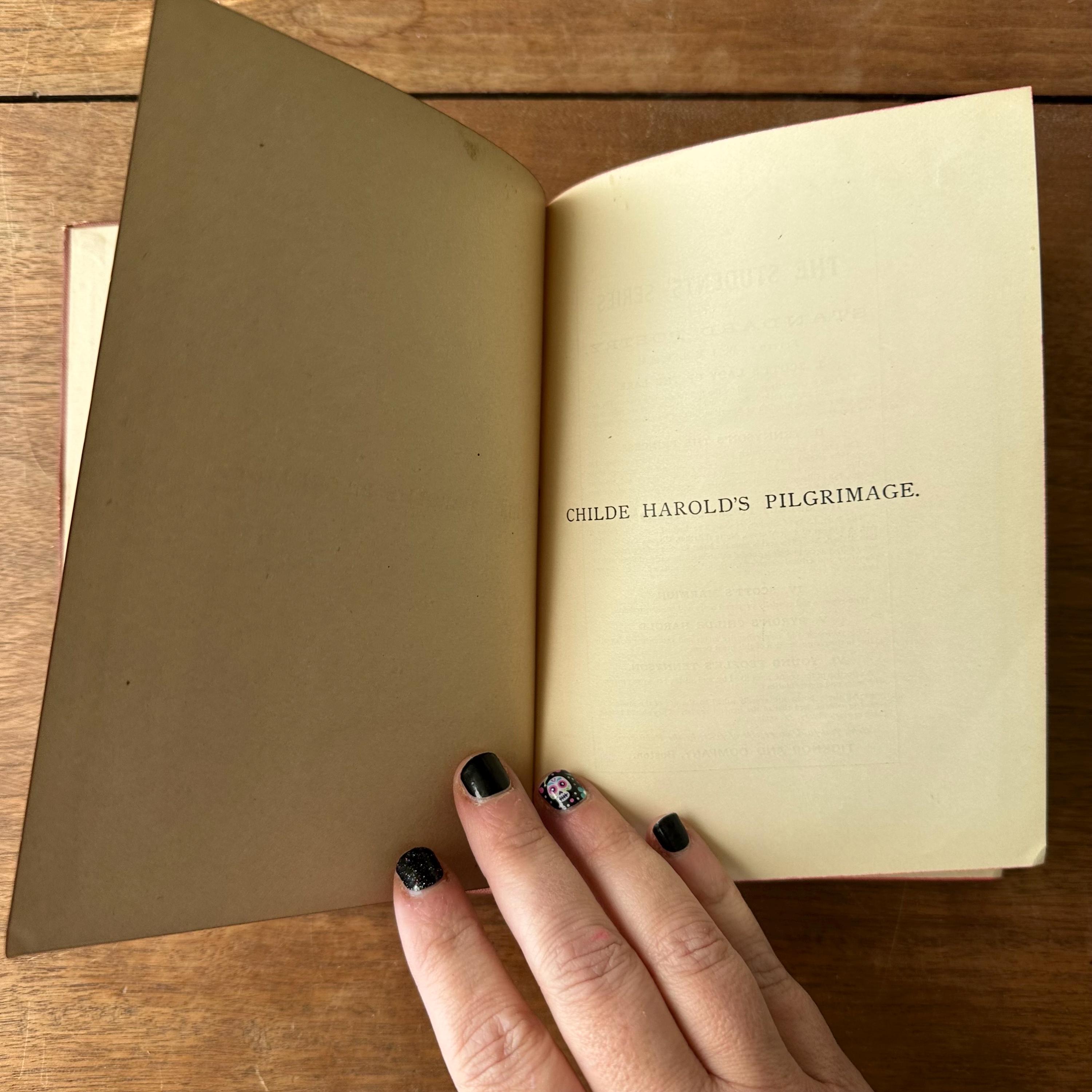 This is the antique 1886 edition of Childe Harold's Pilgrimage by Lord Byron, edited by William J. Rolfe, and published by Ticknor and Company. It has reddish-brown leather covers with gold lettering on the front cover and spine. The inside front and back cover endpapers are a brownish-gray. This edition is illustrated throughout with black and white illustrations and etchings. There are 288 pages.