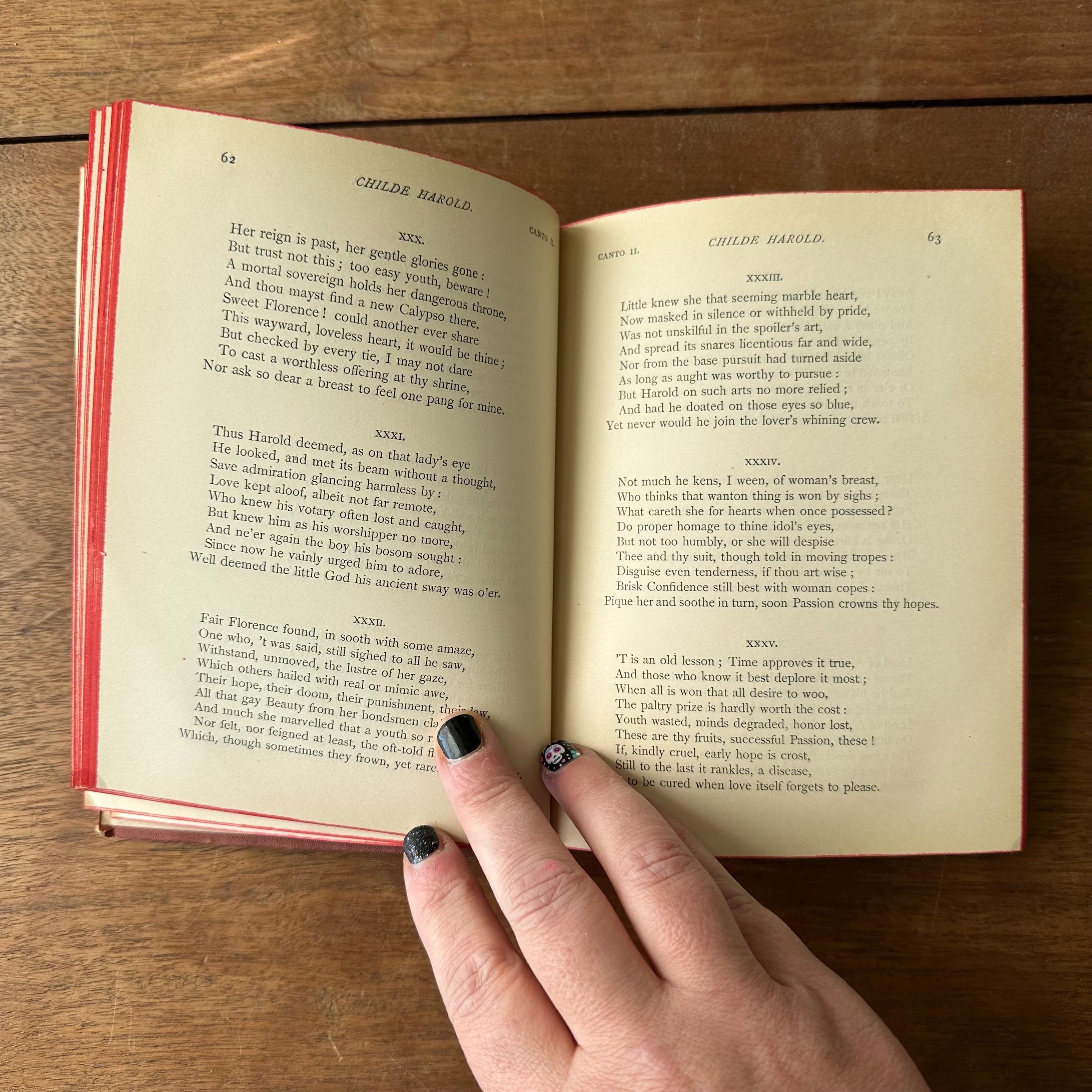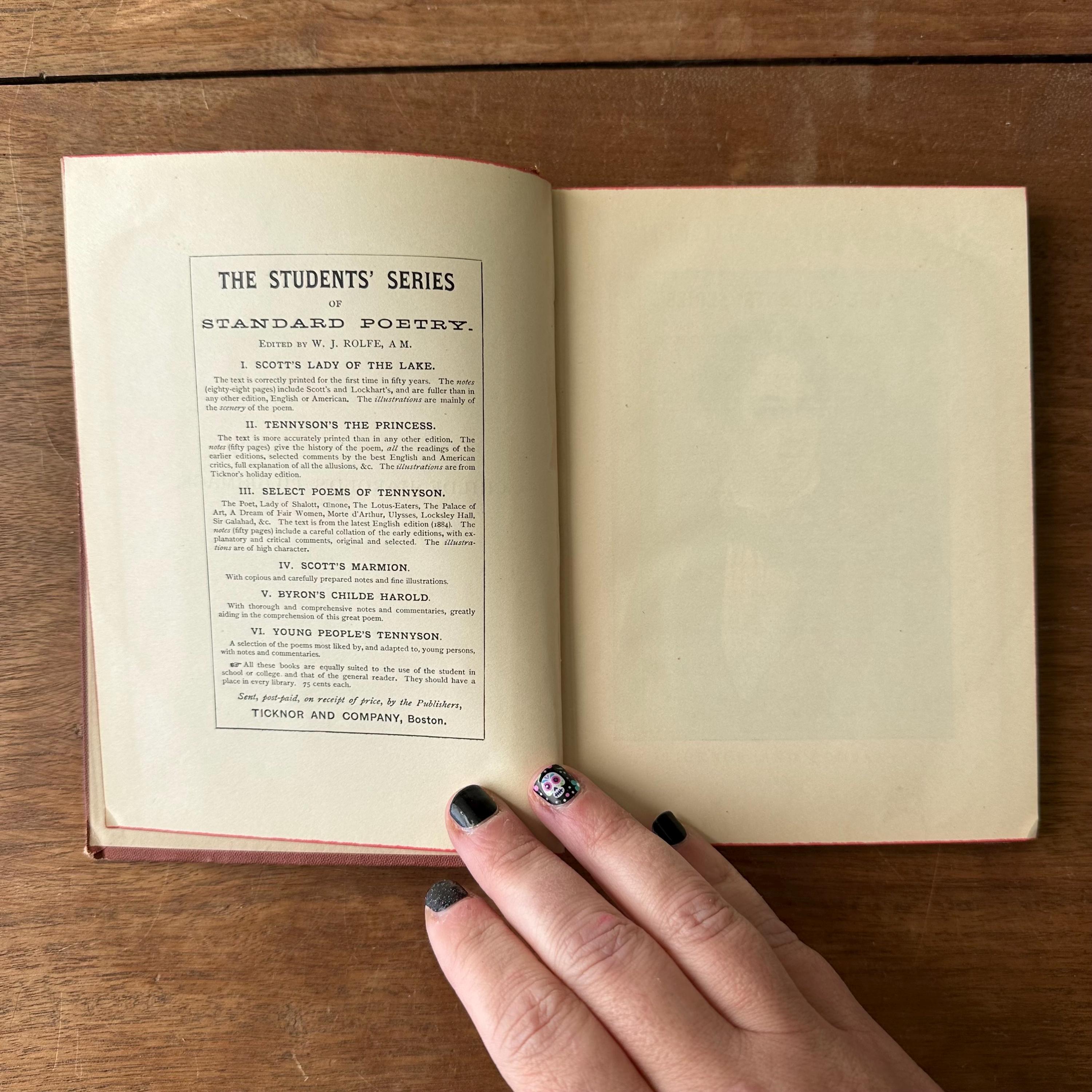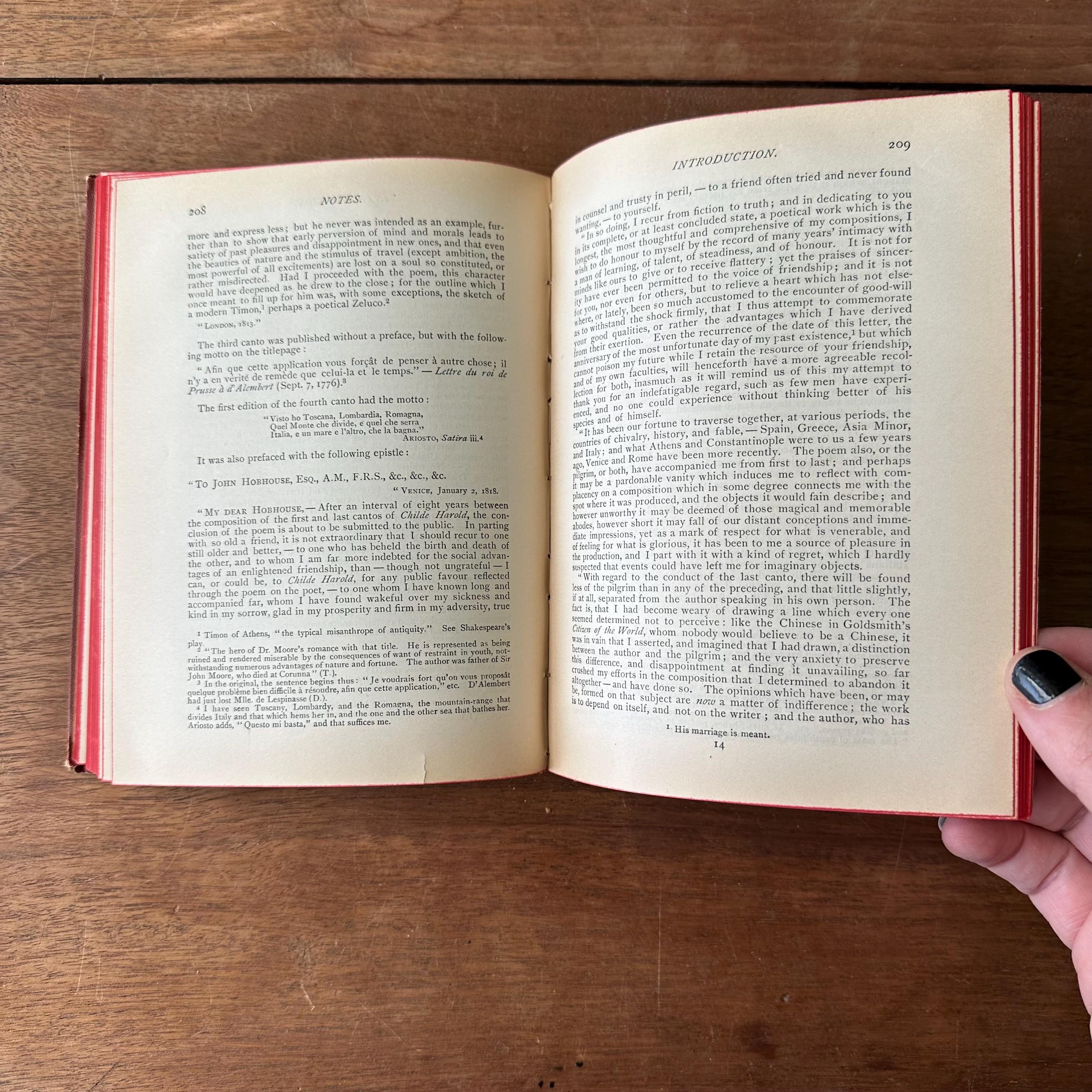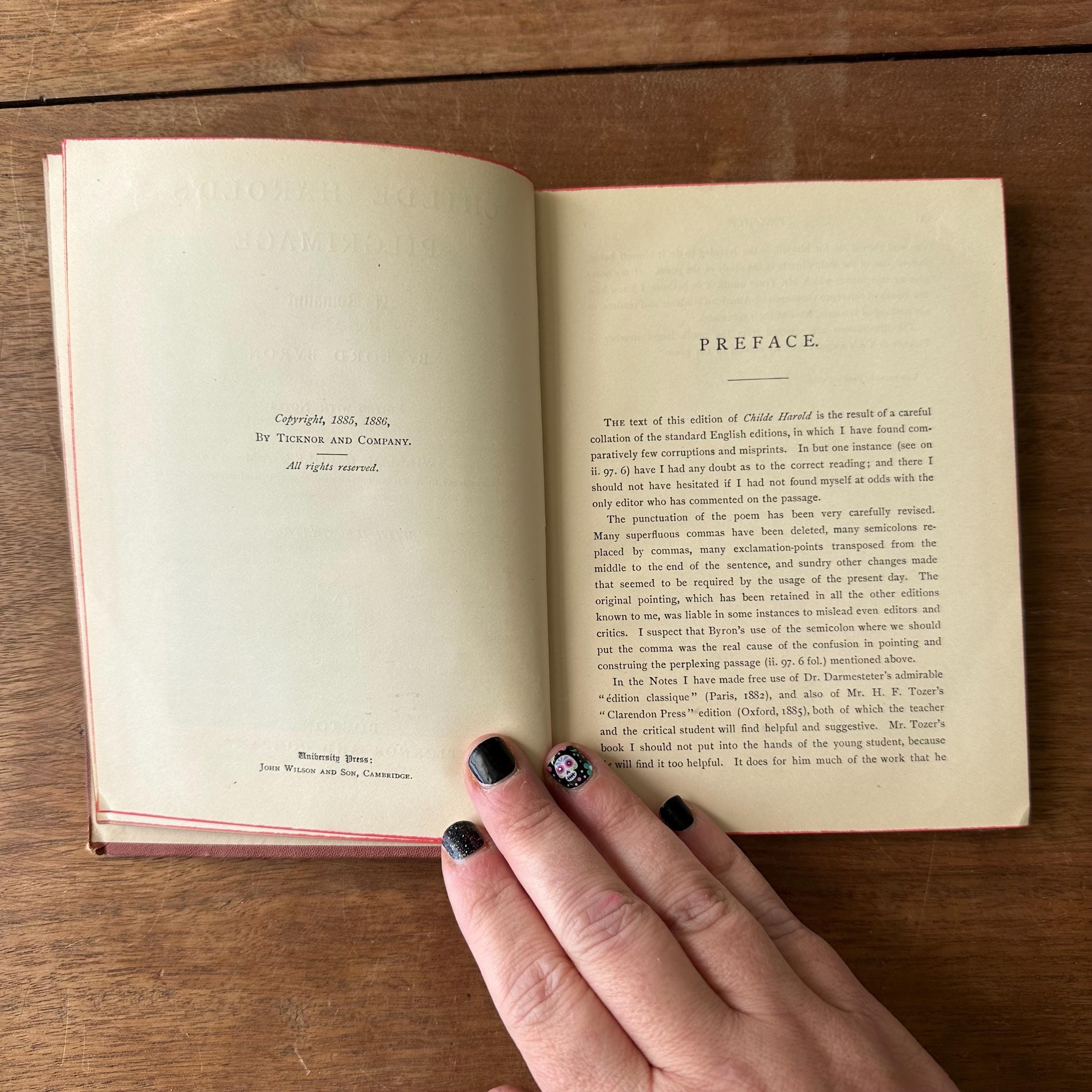 This is the antique 1886 edition of Childe Harold's Pilgrimage by Lord Byron, edited by William J. Rolfe, and published by Ticknor and Company. It has reddish-brown leather covers with gold lettering on the front cover and spine. The inside front and back cover endpapers are a brownish-gray. This edition is illustrated throughout with black and white illustrations and etchings. There are 288 pages.