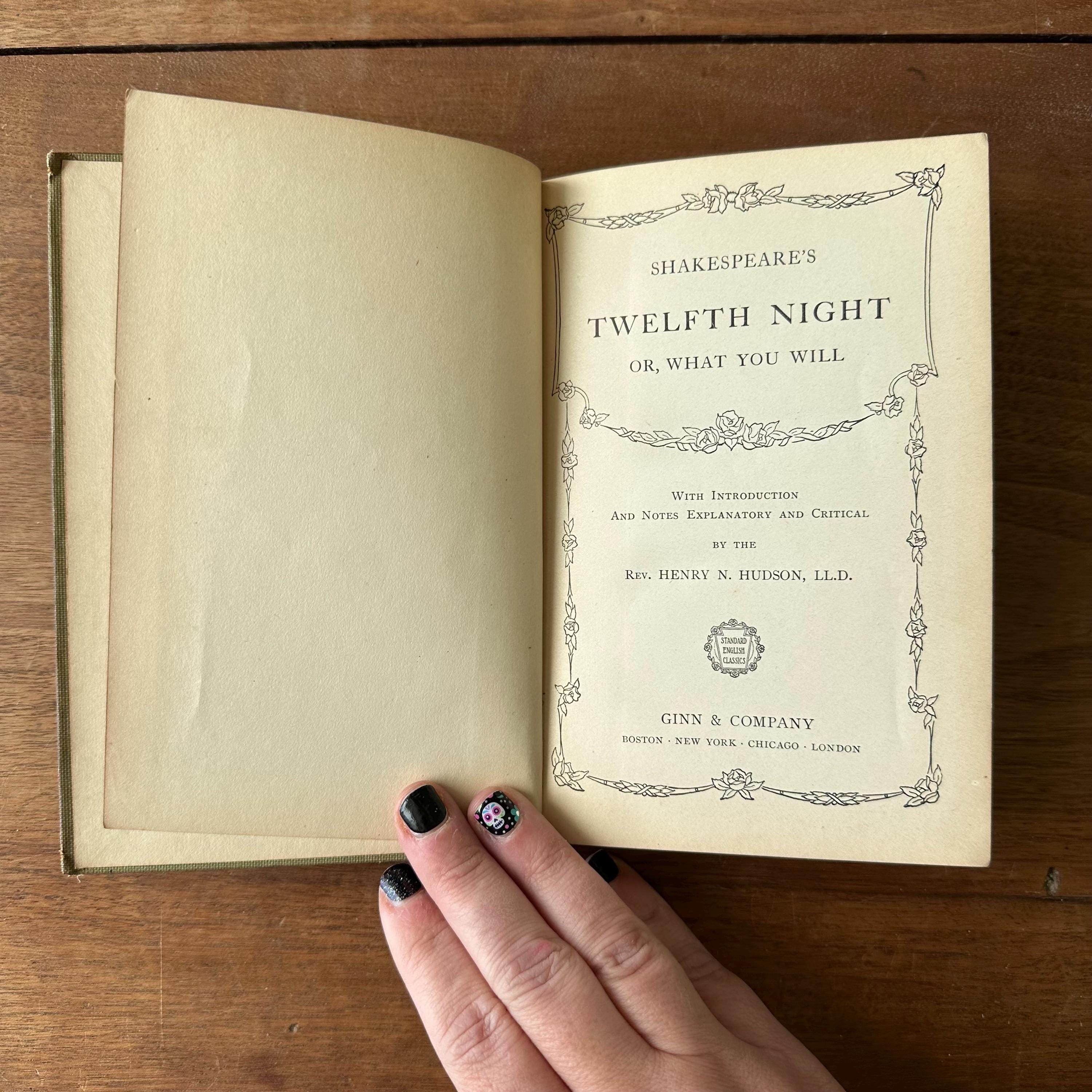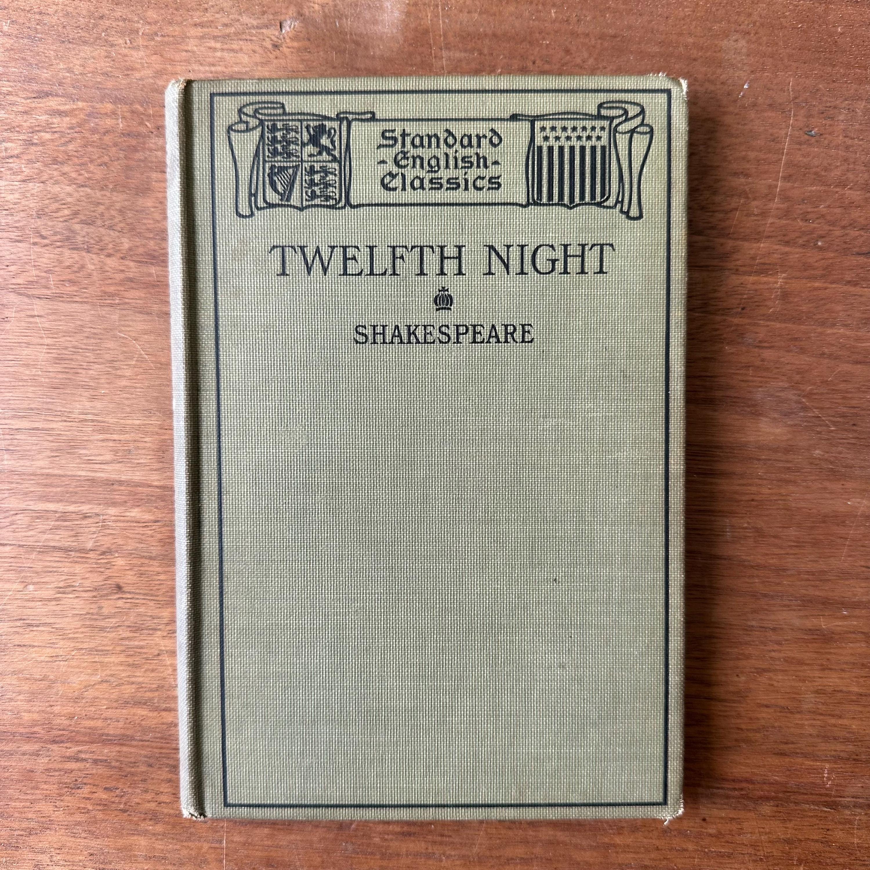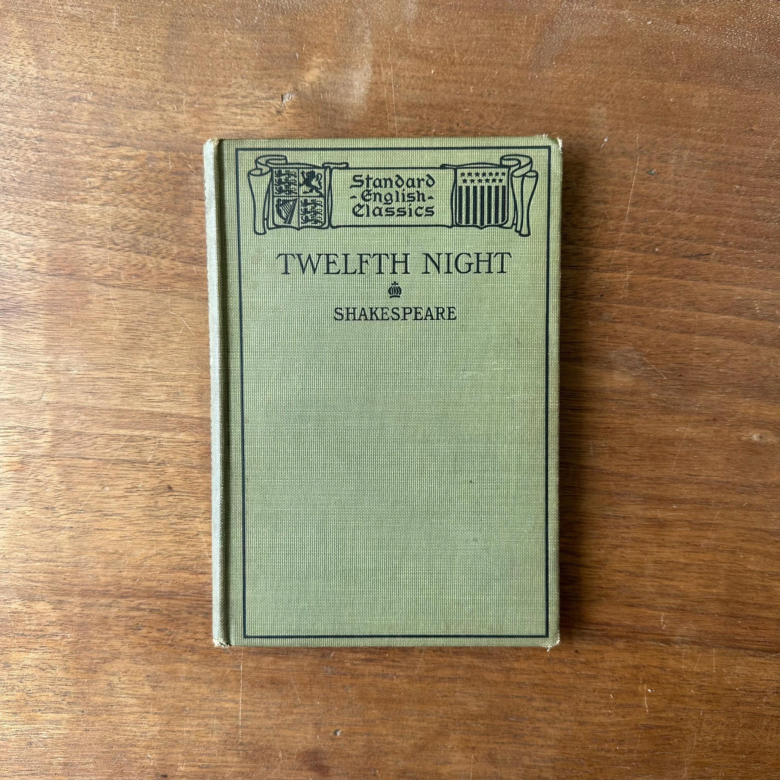 This is the antique 1908 Standard English Classics Edition of Twelfth Night by William Shakespeare, published by Ginn & Company. It has olive green covers with black lettering and illustration. The spine is also lettered in black. The title page is illustrated with a flower garland and border. This is a school edition with a section on English in schools and an introduction. There are 151 pages.
