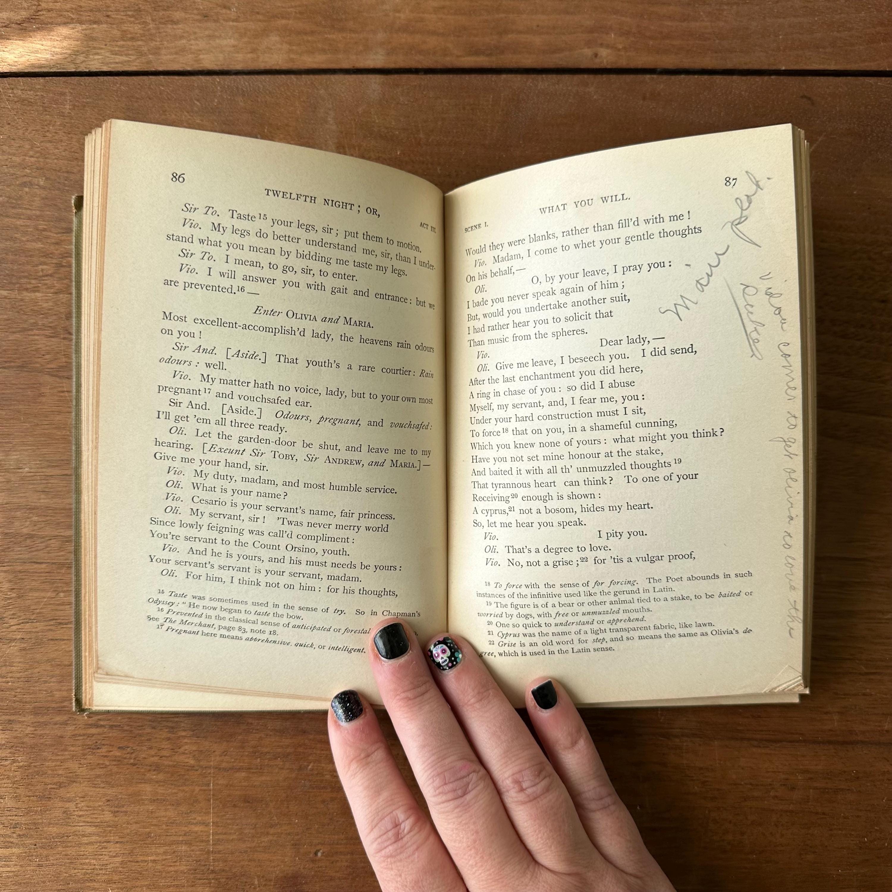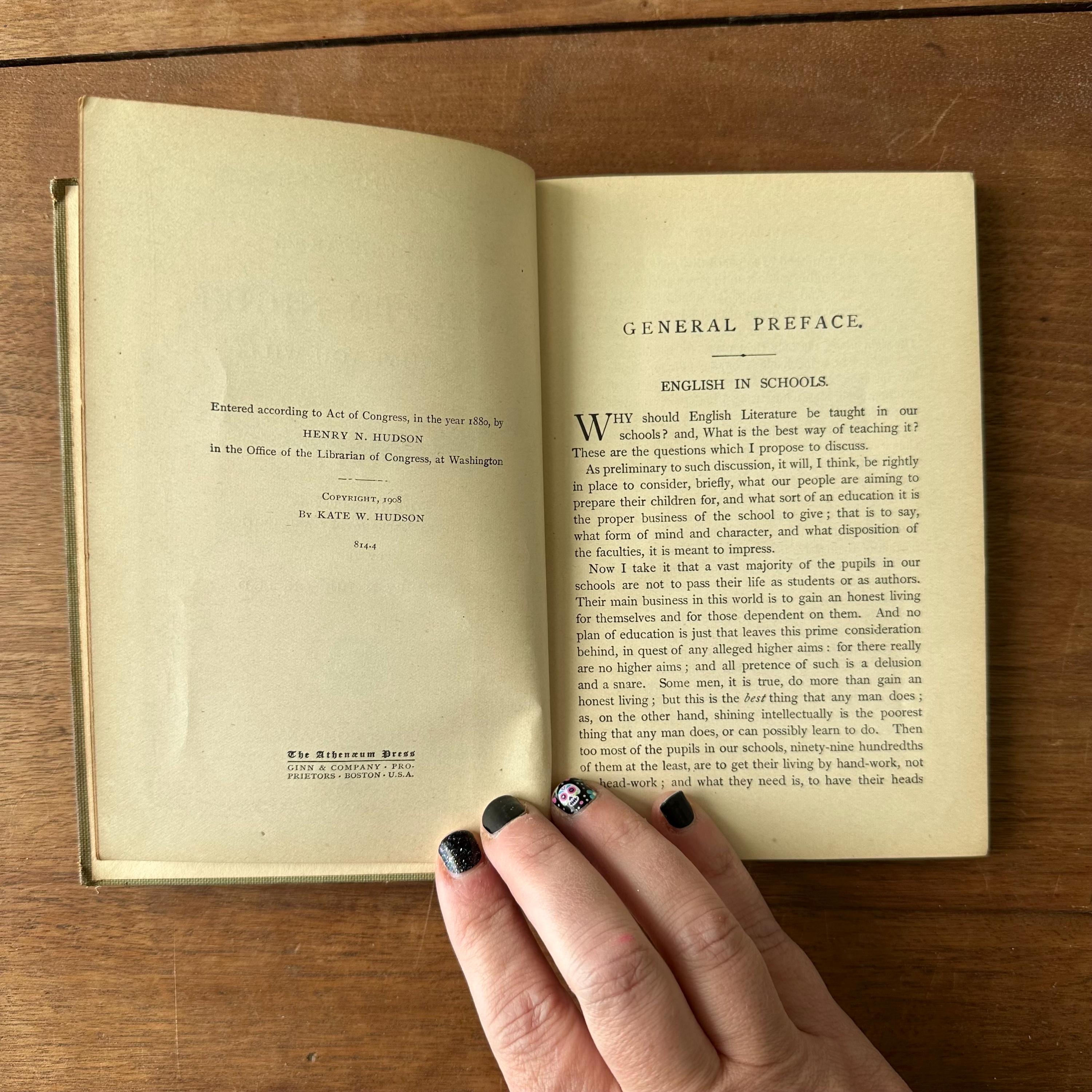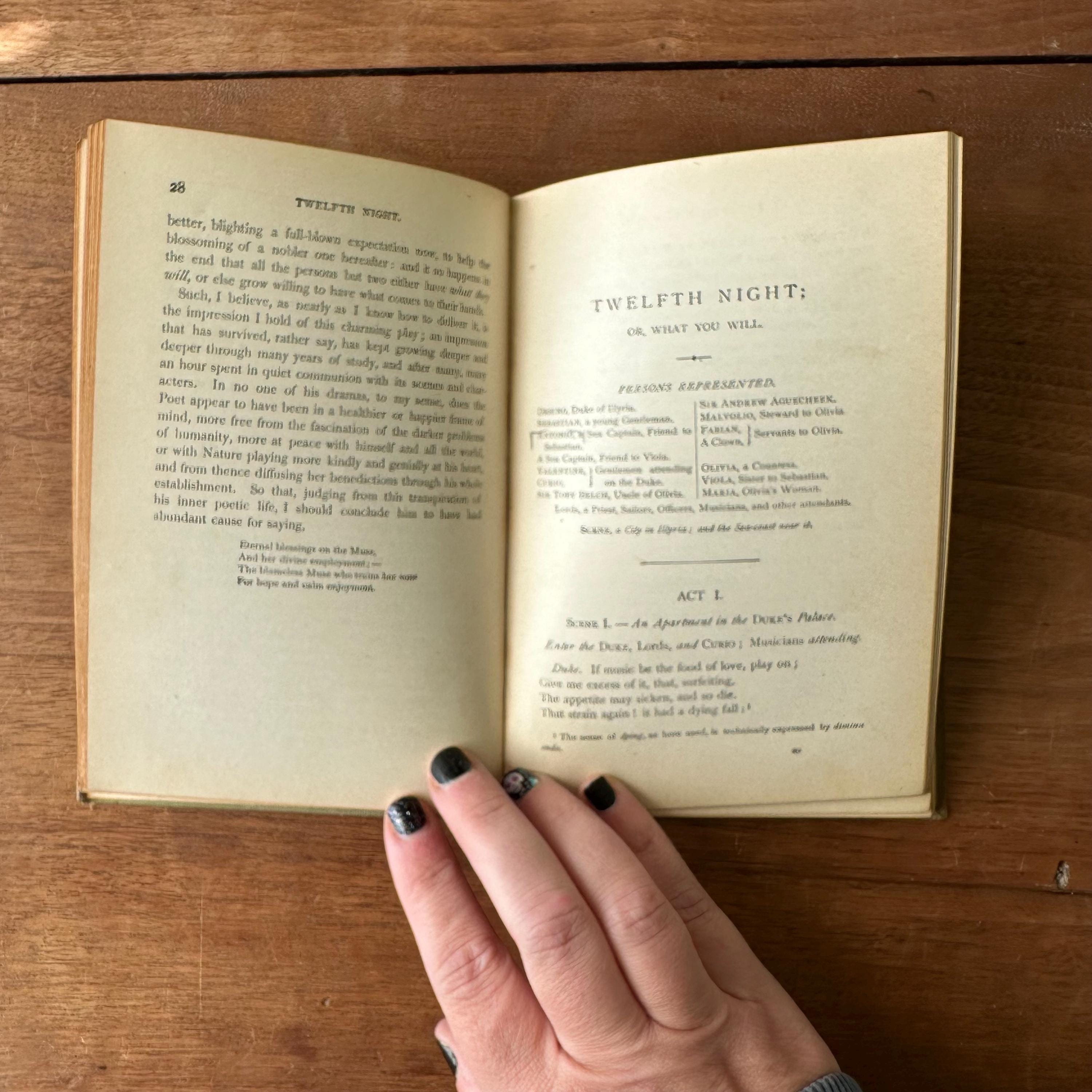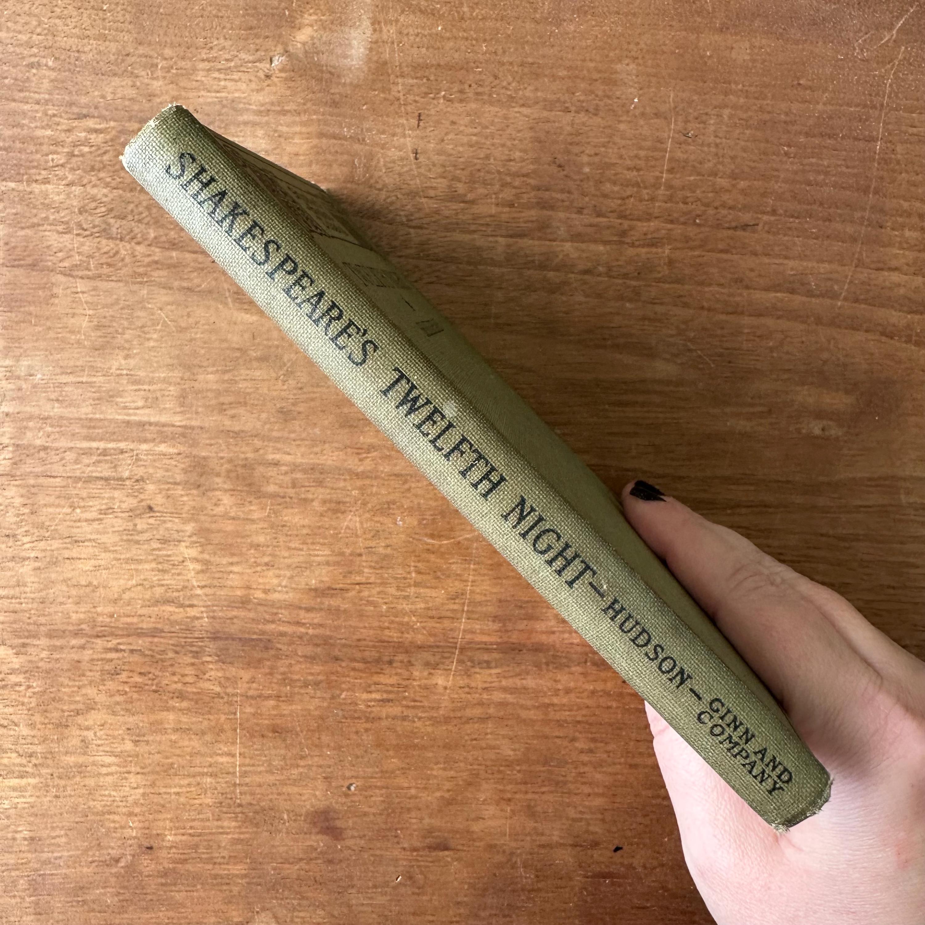 This is the antique 1908 Standard English Classics Edition of Twelfth Night by William Shakespeare, published by Ginn & Company. It has olive green covers with black lettering and illustration. The spine is also lettered in black. The title page is illustrated with a flower garland and border. This is a school edition with a section on English in schools and an introduction. There are 151 pages.