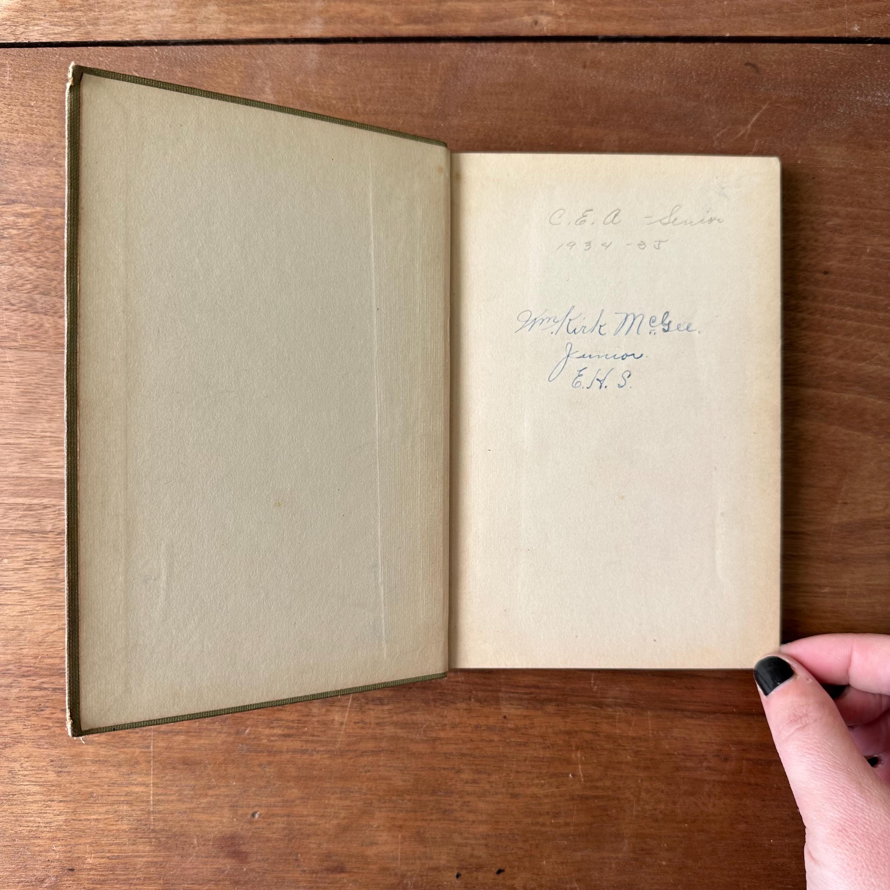 The book is in good antique condition for its age and use. The covers have general but minimal wear, with some discoloration to the spine. C.E.A. wrote their name in pencil along with Senior and the years 1934-35 inside the front cover. Wm. Kirk. McGee also wrote his name in pen along with Junior and E.H.S. There are pencil notes and marks periodically throughout the text. The covers are attached at the spines. The pages are yellowed.