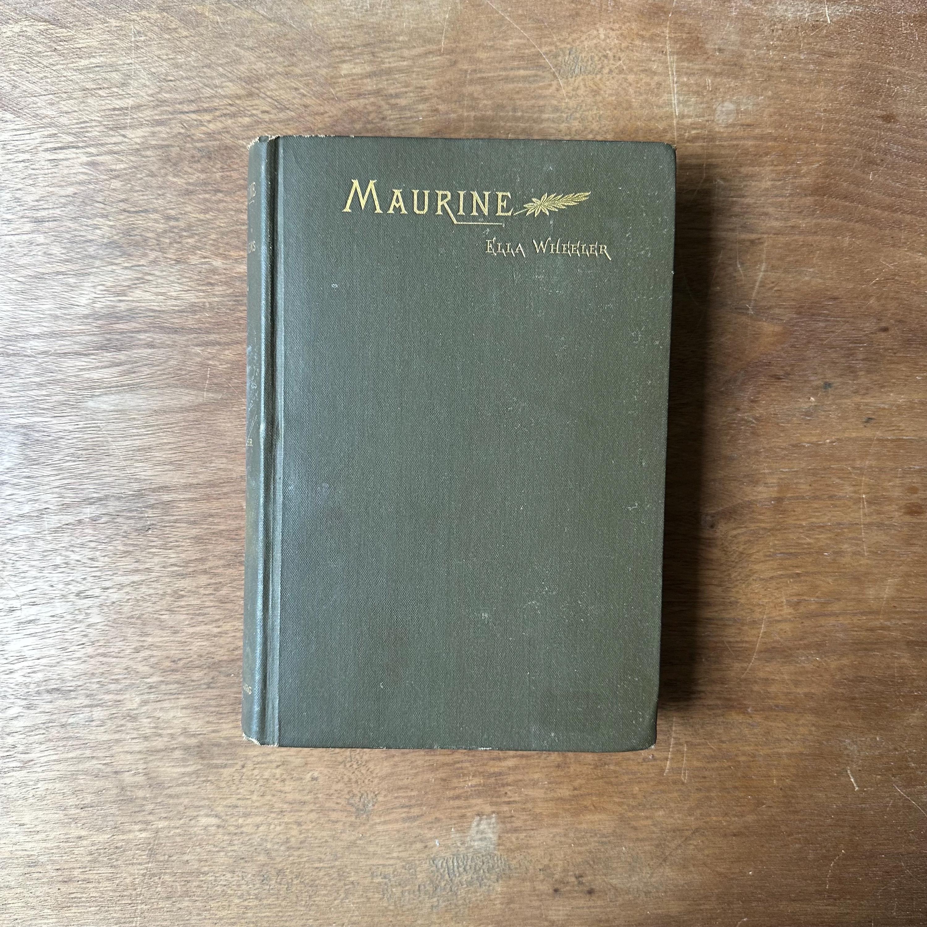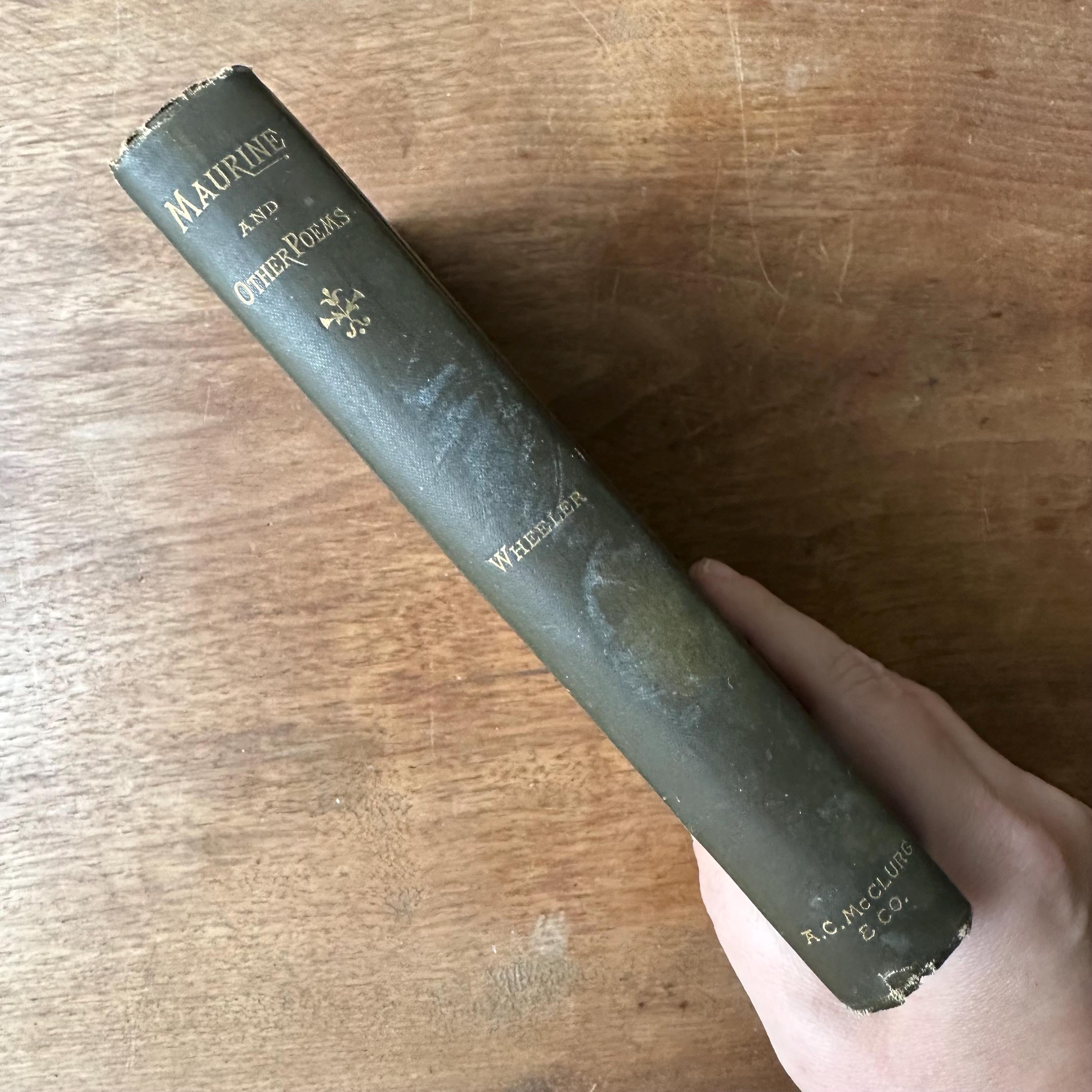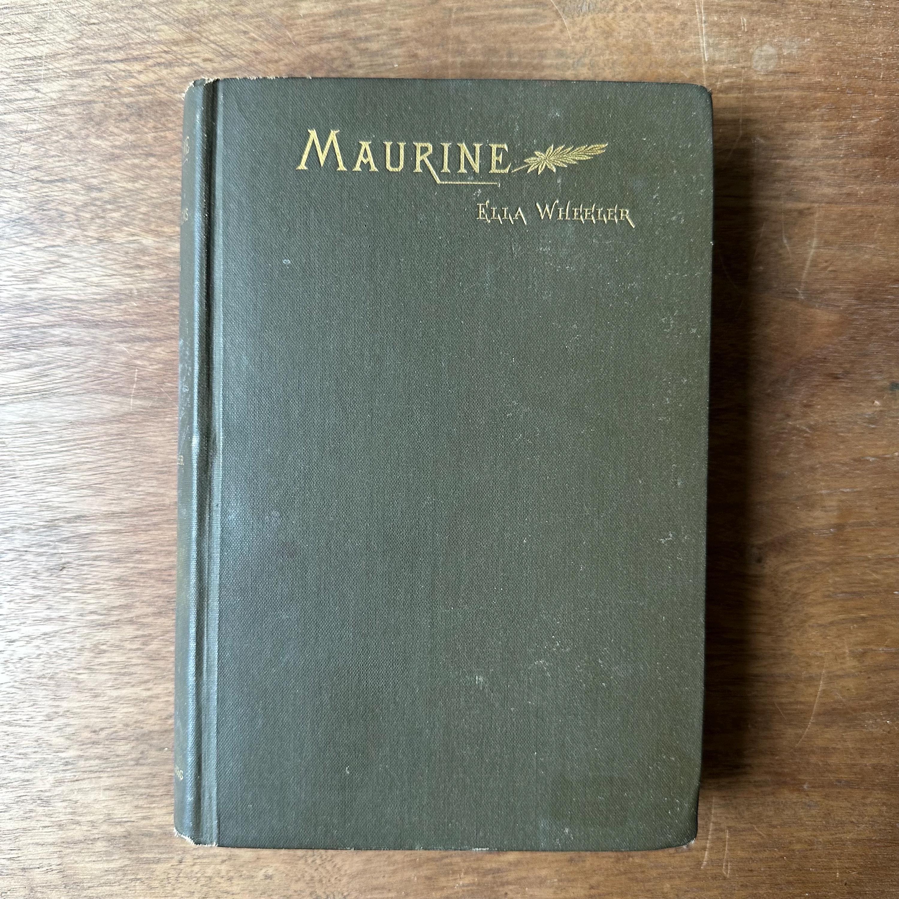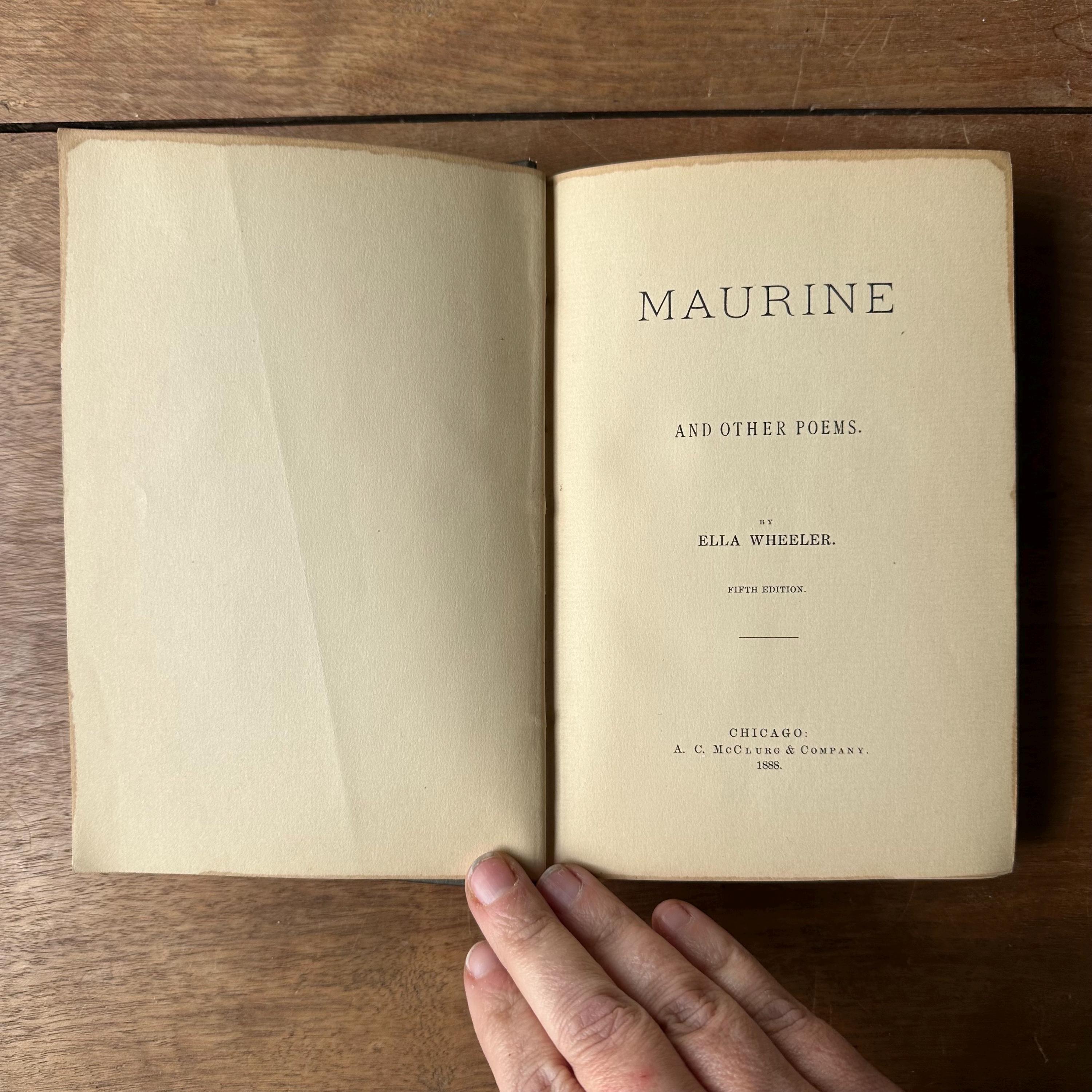 This is the antique 1888 fifth edition of Maurine and Other Poems by Ella Wheeler, published by A.C. McClurg & Company. It has brown covers with gold lettering on the cover and spine. The spine and cover are also decorated with a delicate flower and leaf design. There are 254 pages.