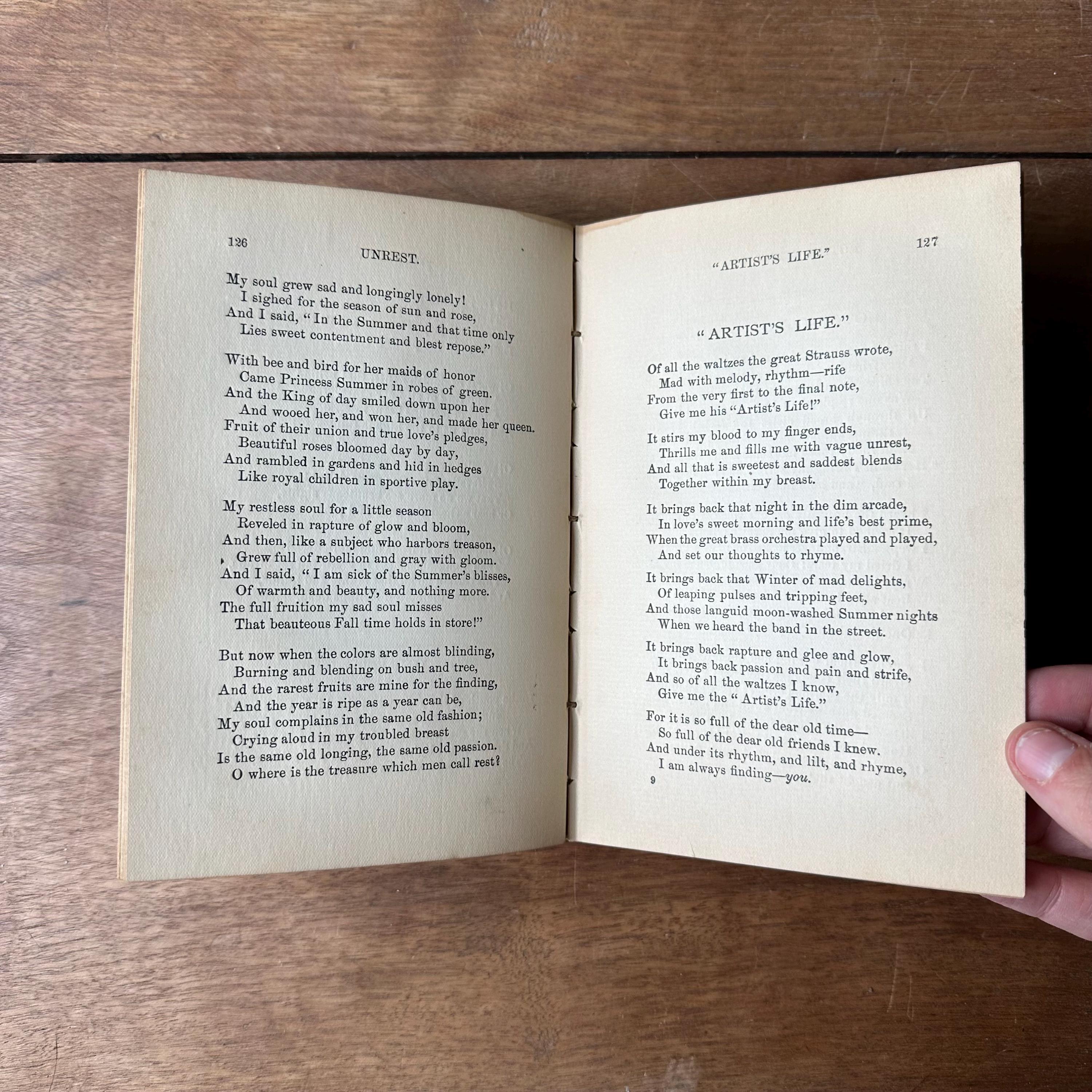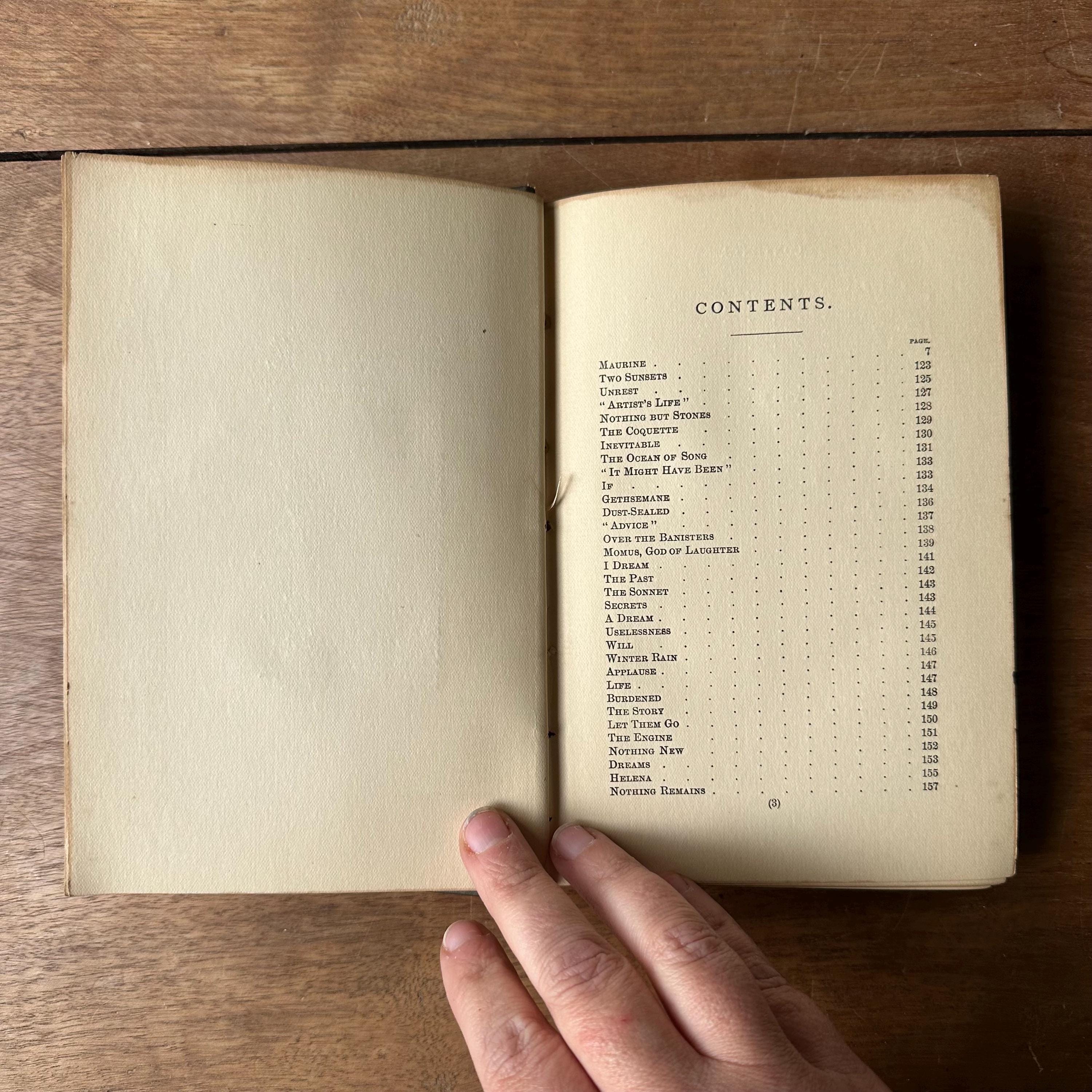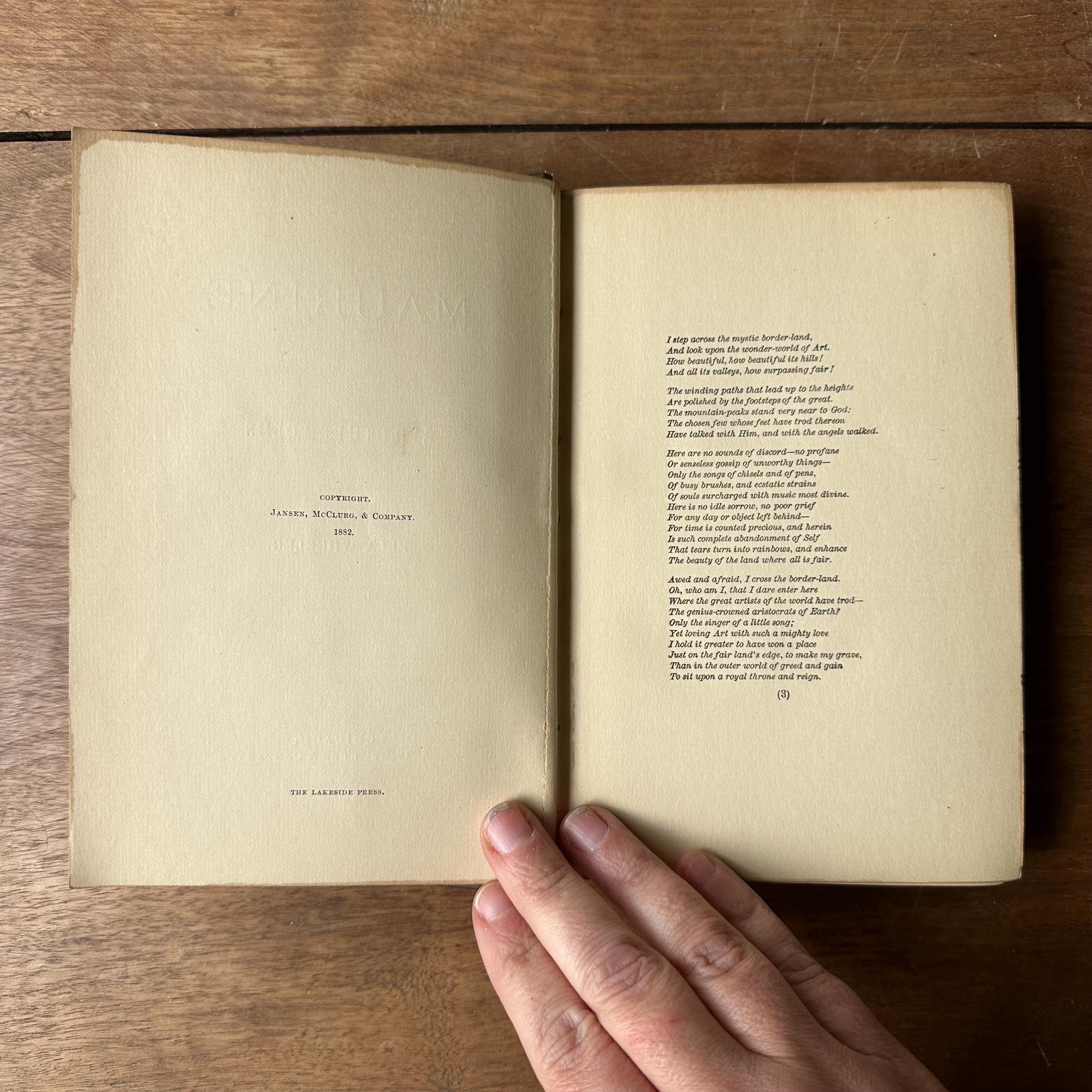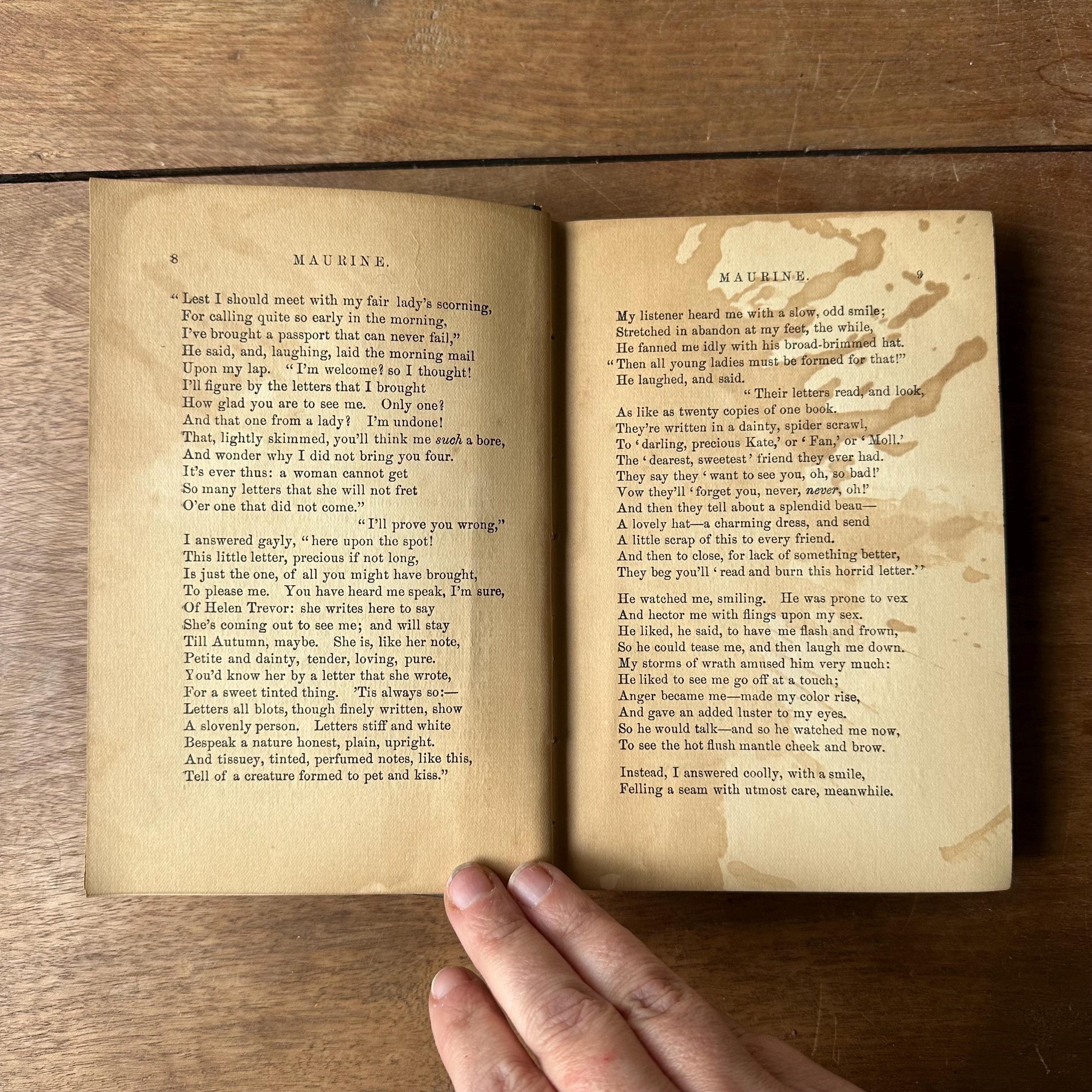 This is the antique 1888 fifth edition of Maurine and Other Poems by Ella Wheeler, published by A.C. McClurg & Company. It has brown covers with gold lettering on the cover and spine. The spine and cover are also decorated with a delicate flower and leaf design. There are 254 pages.