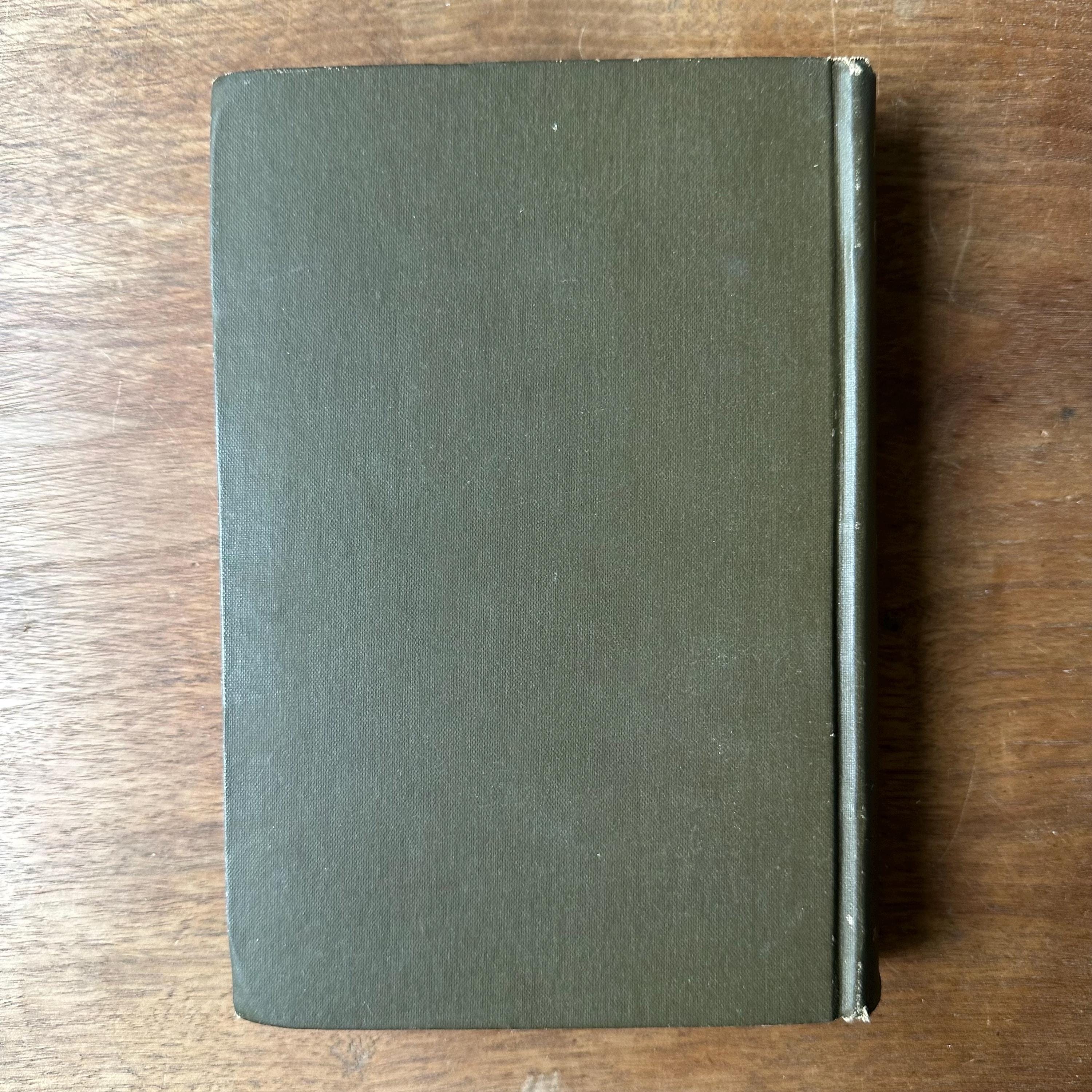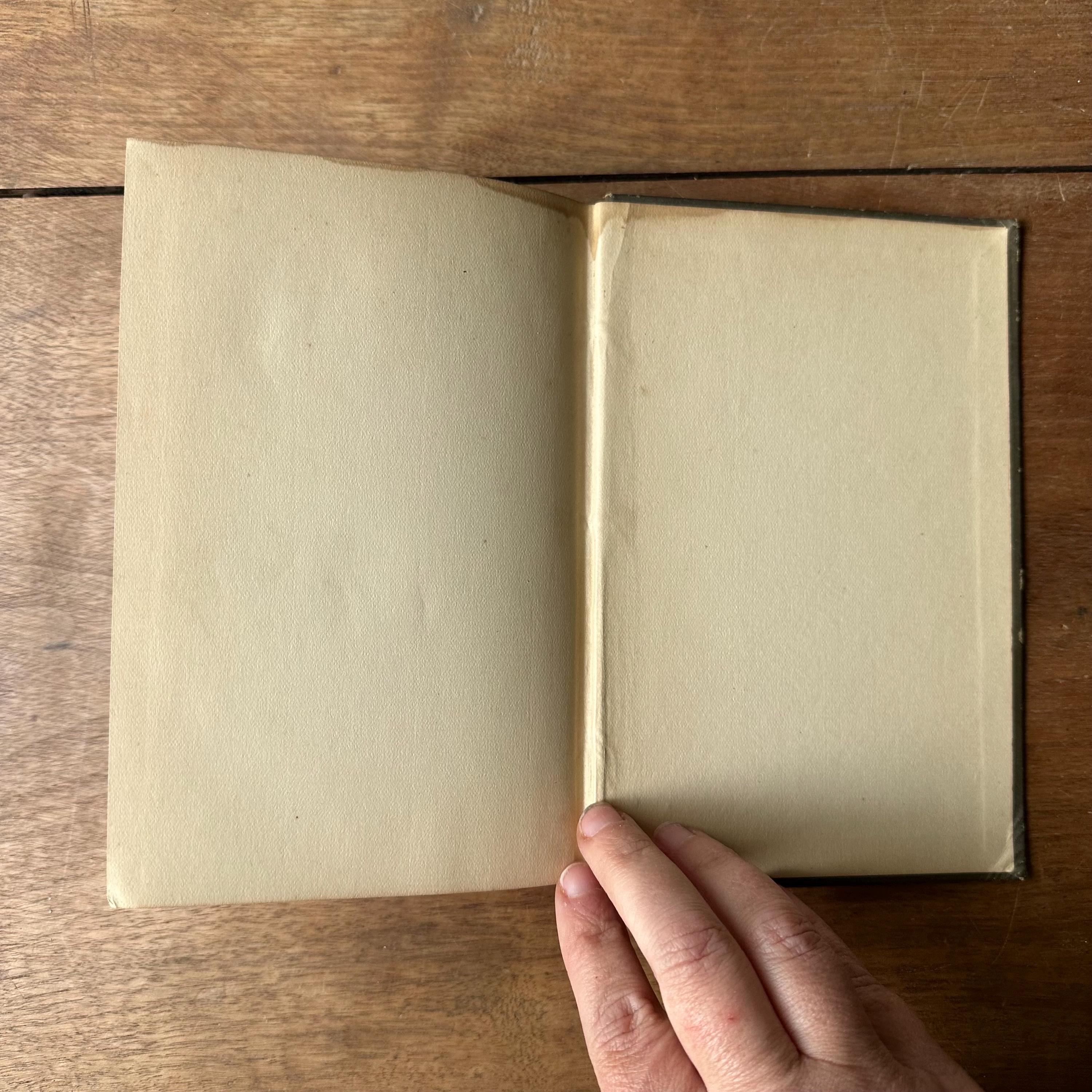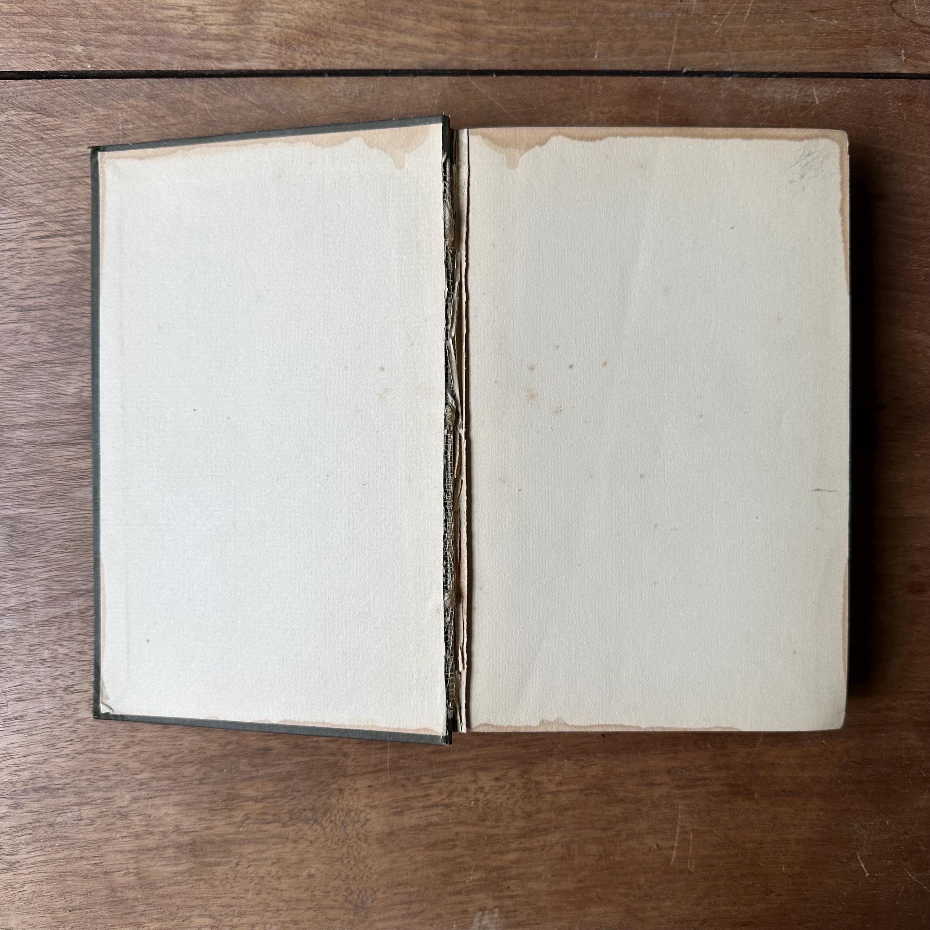 The book is in good antique condition for its age and use. It has general wear to the covers, mostly to the corners and spine edges. The spine has some discoloration. The gold lettering on cover and spine is still bright and intact. The cover has detached at the spine at the inside front cover but is still attached by the inner webbing. The back cover is still attached. The pages have yellowed, and it looks like coffee or tea got spilled at page 9.