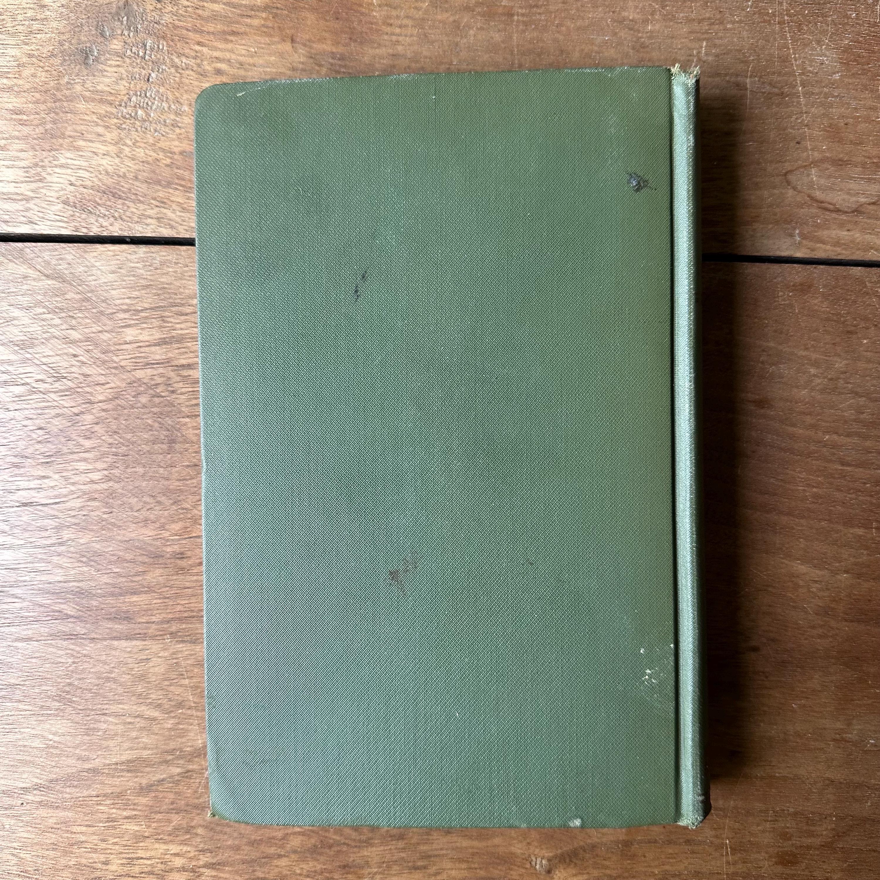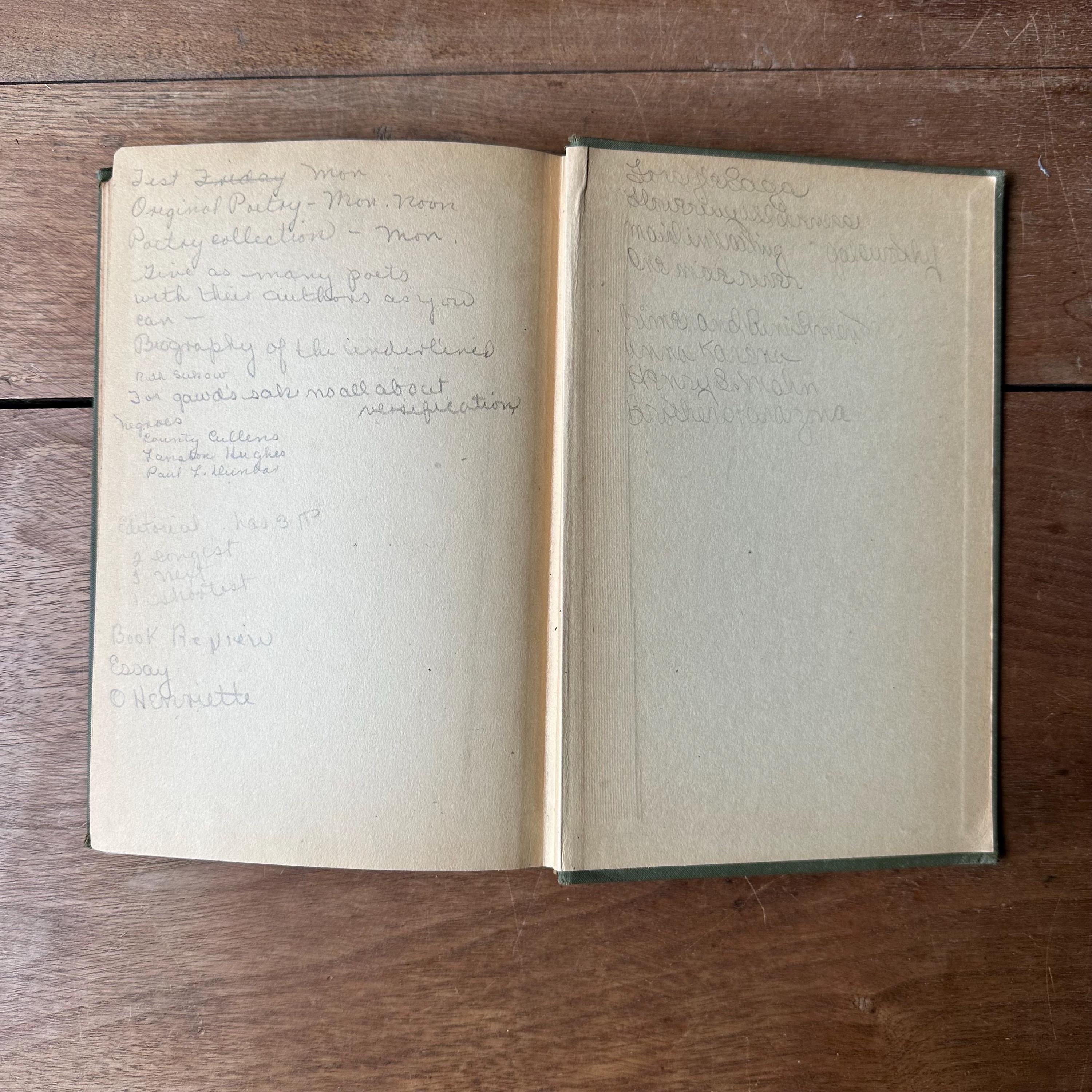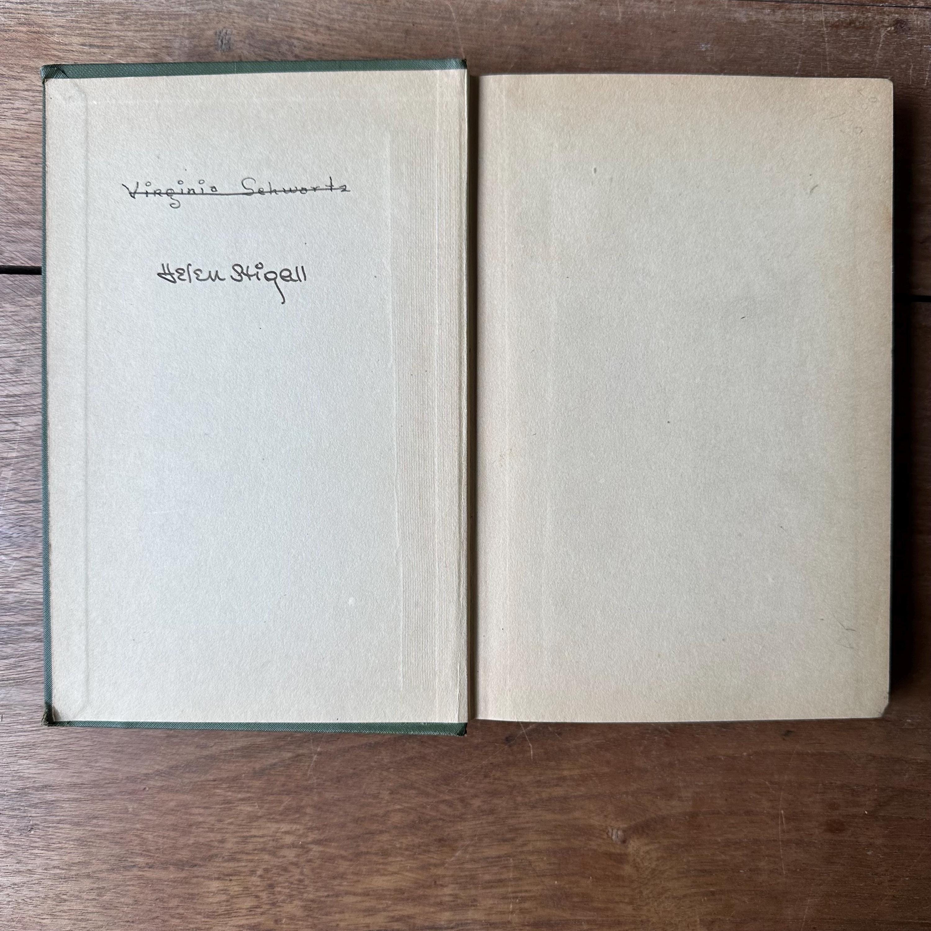The book is in good antique condition for its age and use. The covers have general wear, mostly to corners and spine edges. The spines are still attached at the covers. Virginia Schwartz wrote her name in ink inside the front cover and Helen Stigall crossed it out and wrote her name instead. There are multiple pencil notes throughout the book. The pages are yellowed.