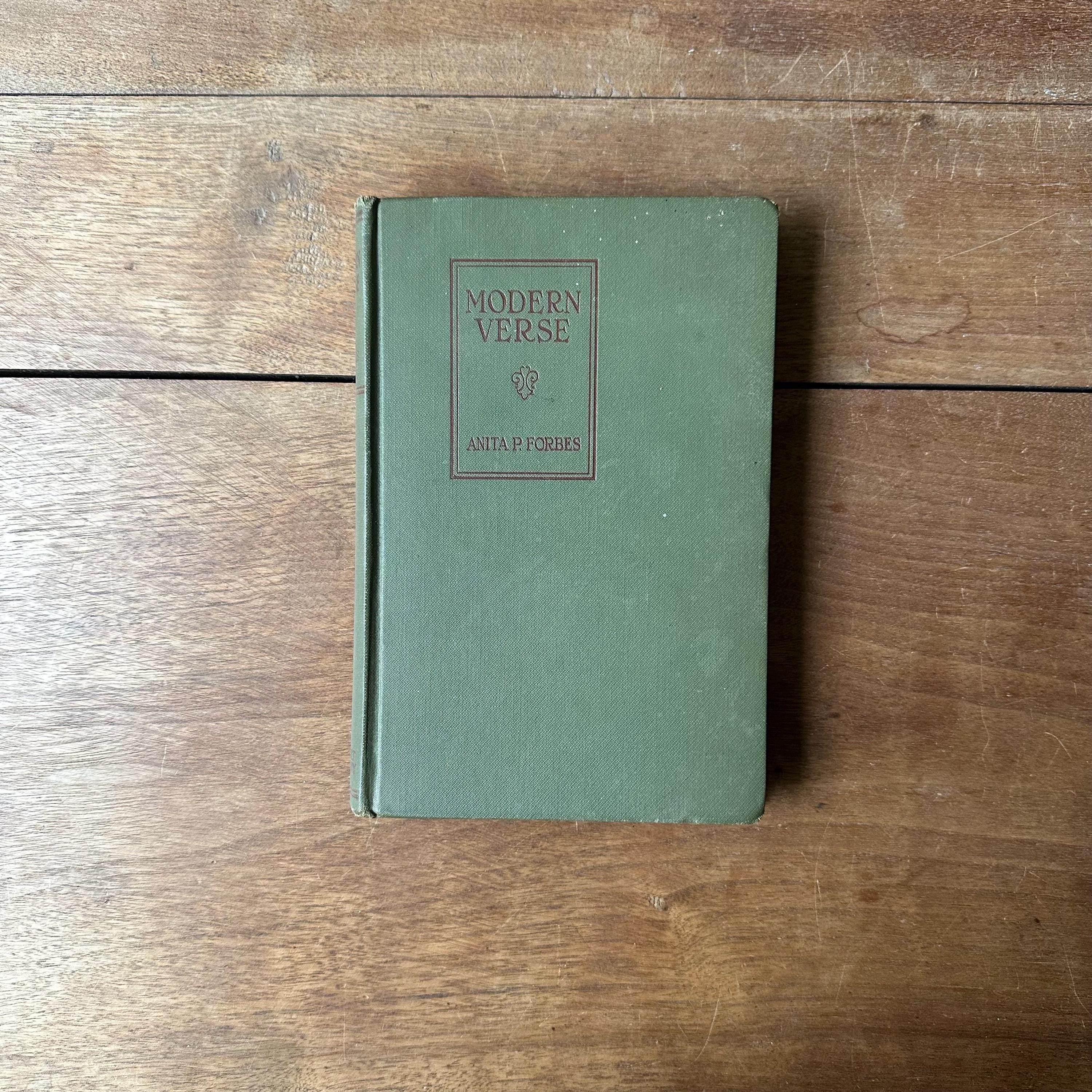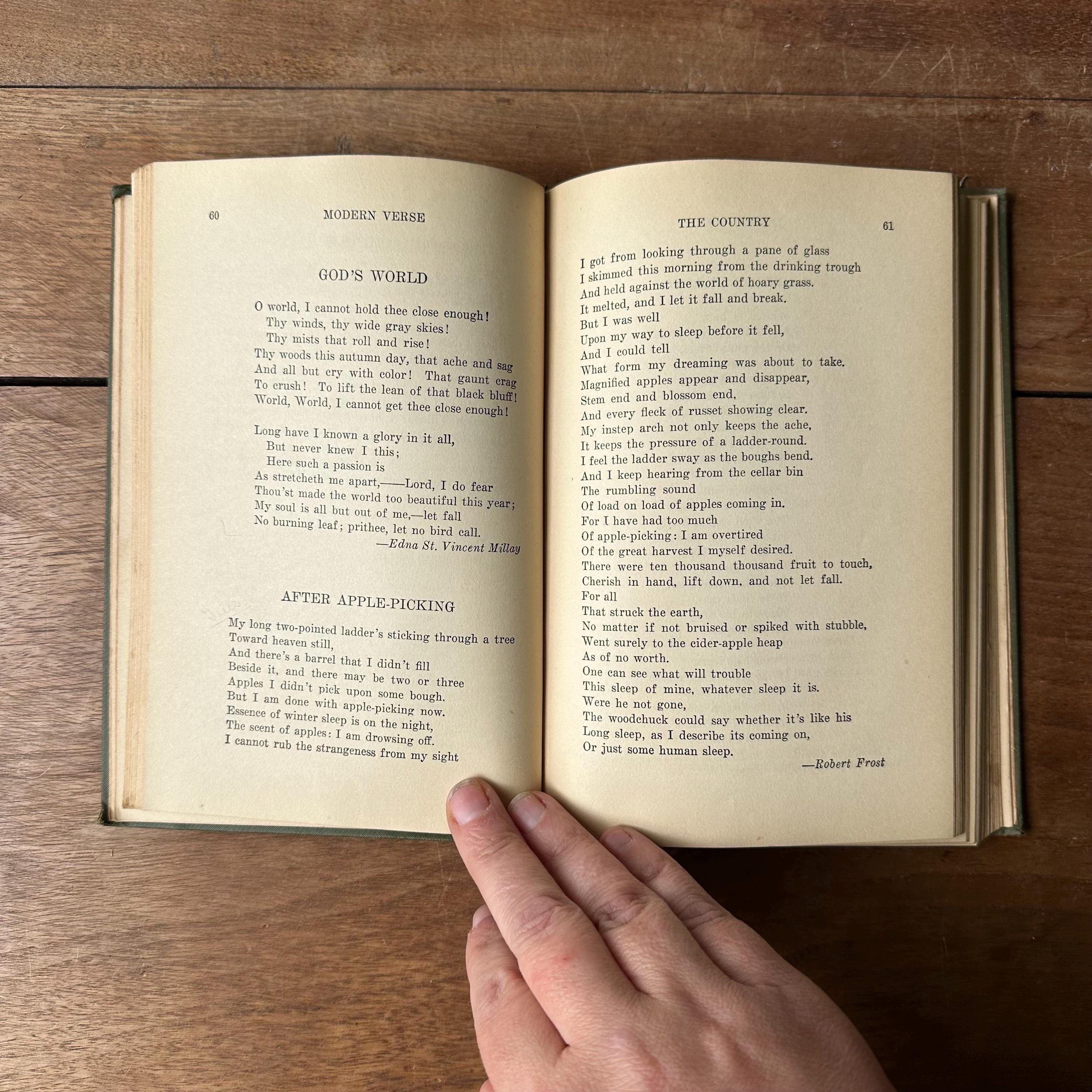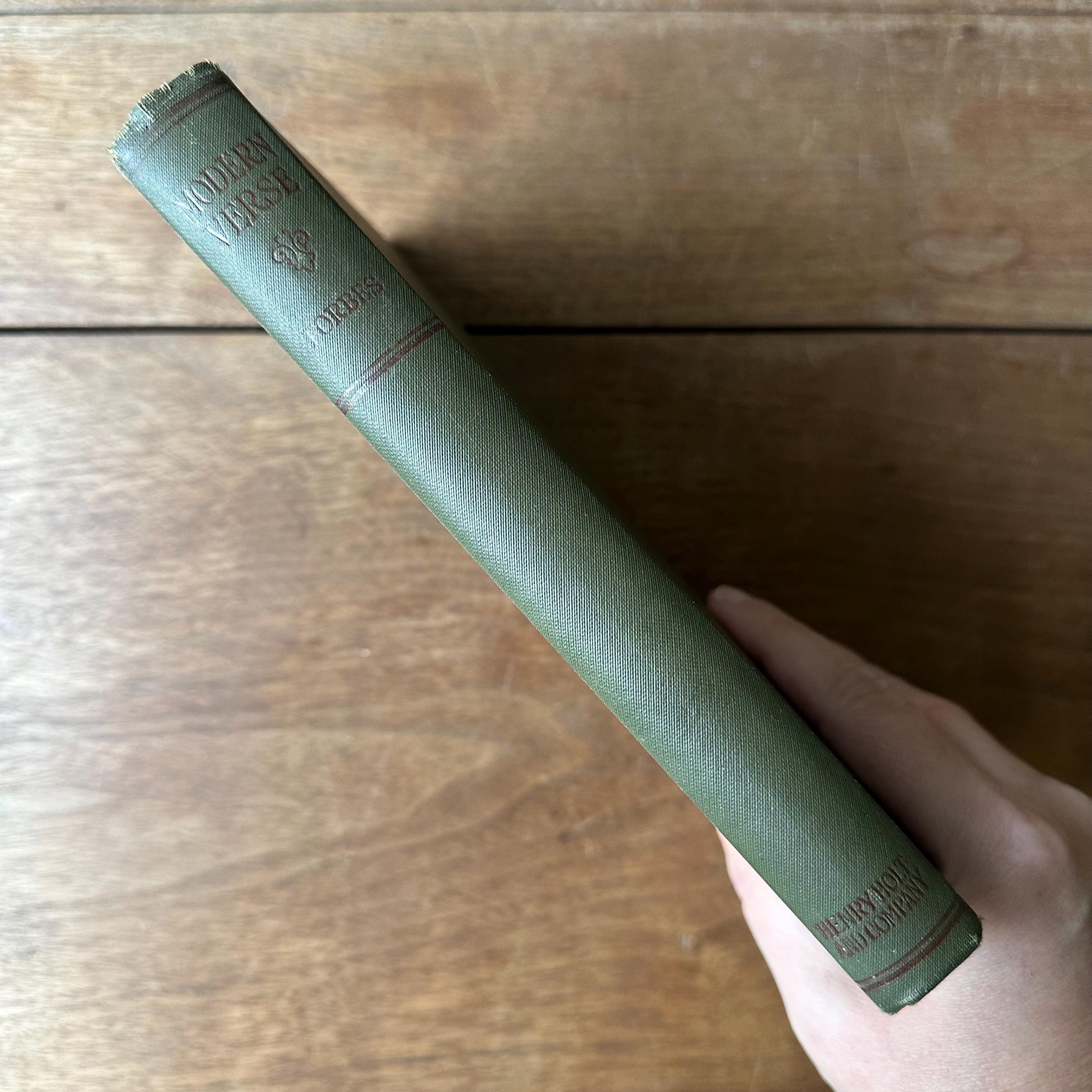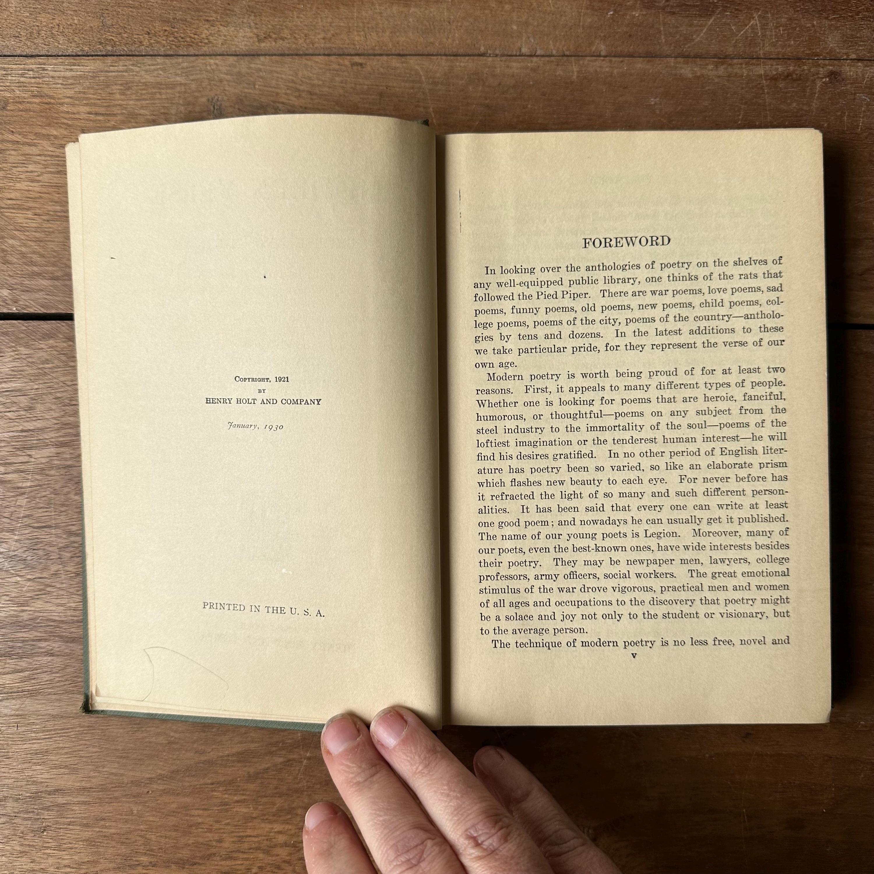 This is the 1921 edition of Modern Verse, published Henry Holt and Company. It has green covers with brown lettering and borders. Both front cover and spine have a small decorative flourish. The book has both British and American poetry and includes famous poets like Carl Sandburg, Robert Frost, Edna St. Vincent Millay, Joyce Kilmer, Sigfried Sassoon, and more. There are 281 pages. A cutout of the Prayer of St. Francis of Assisi has been tucked in the pages.