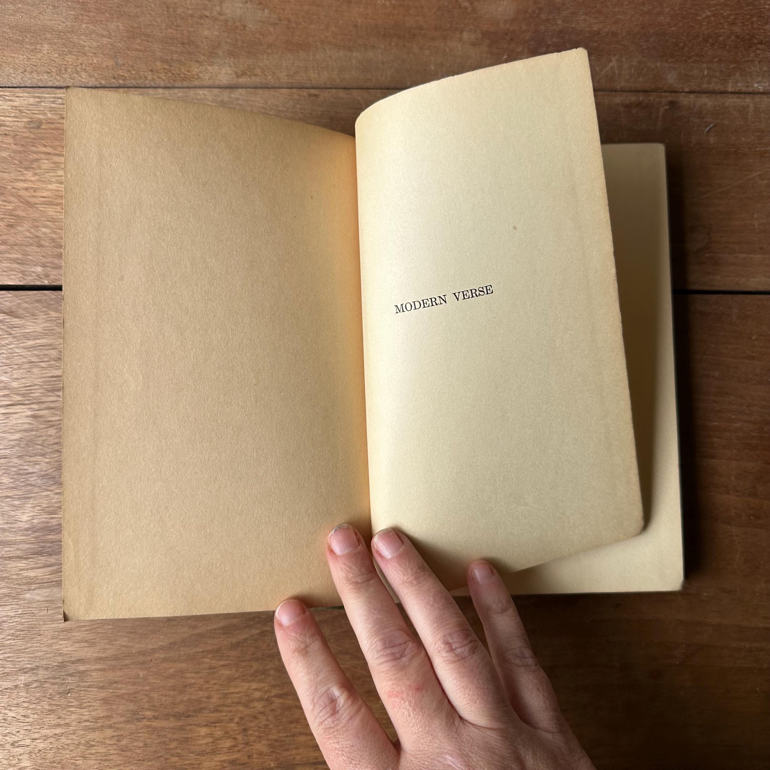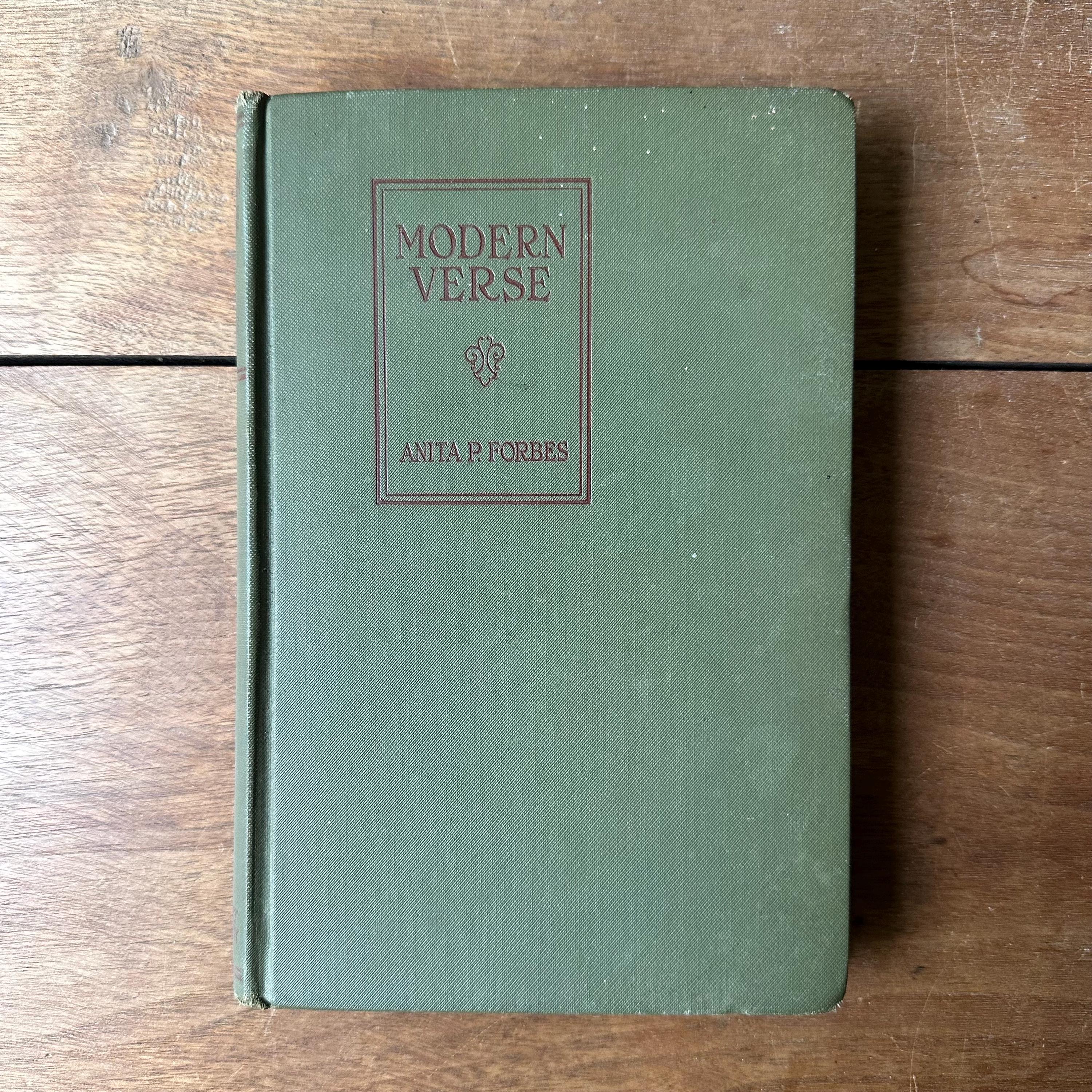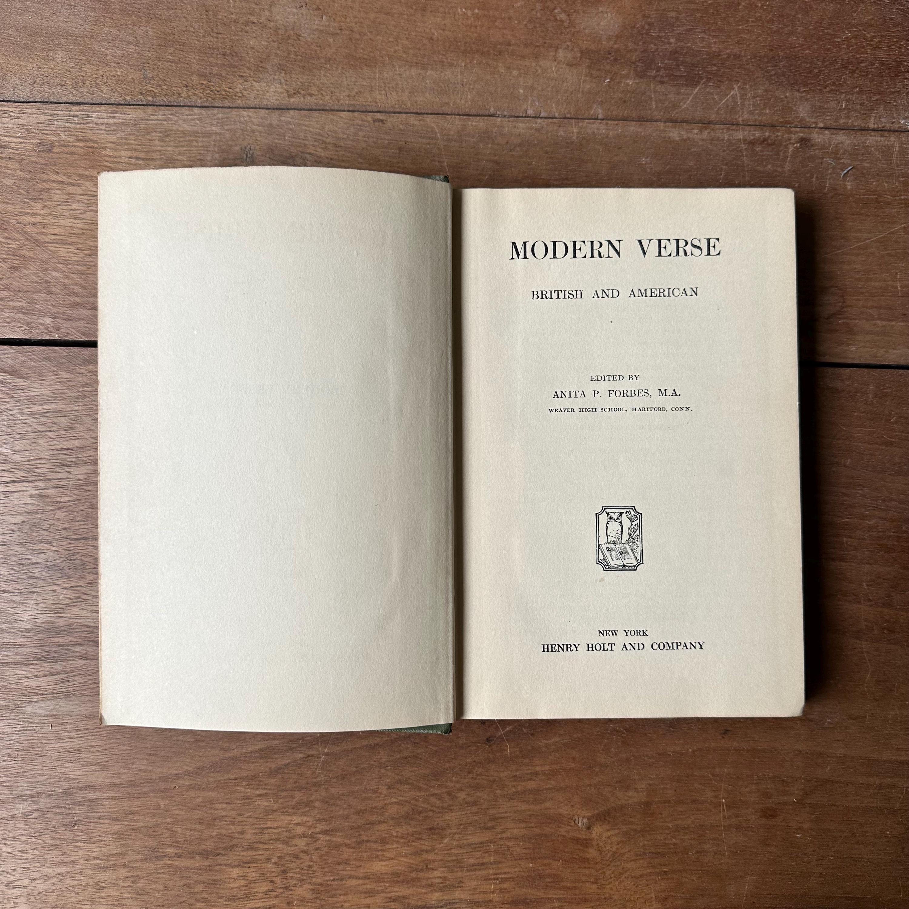 This is the 1921 edition of Modern Verse, published Henry Holt and Company. It has green covers with brown lettering and borders. Both front cover and spine have a small decorative flourish. The book has both British and American poetry and includes famous poets like Carl Sandburg, Robert Frost, Edna St. Vincent Millay, Joyce Kilmer, Sigfried Sassoon, and more. There are 281 pages. A cutout of the Prayer of St. Francis of Assisi has been tucked in the pages.