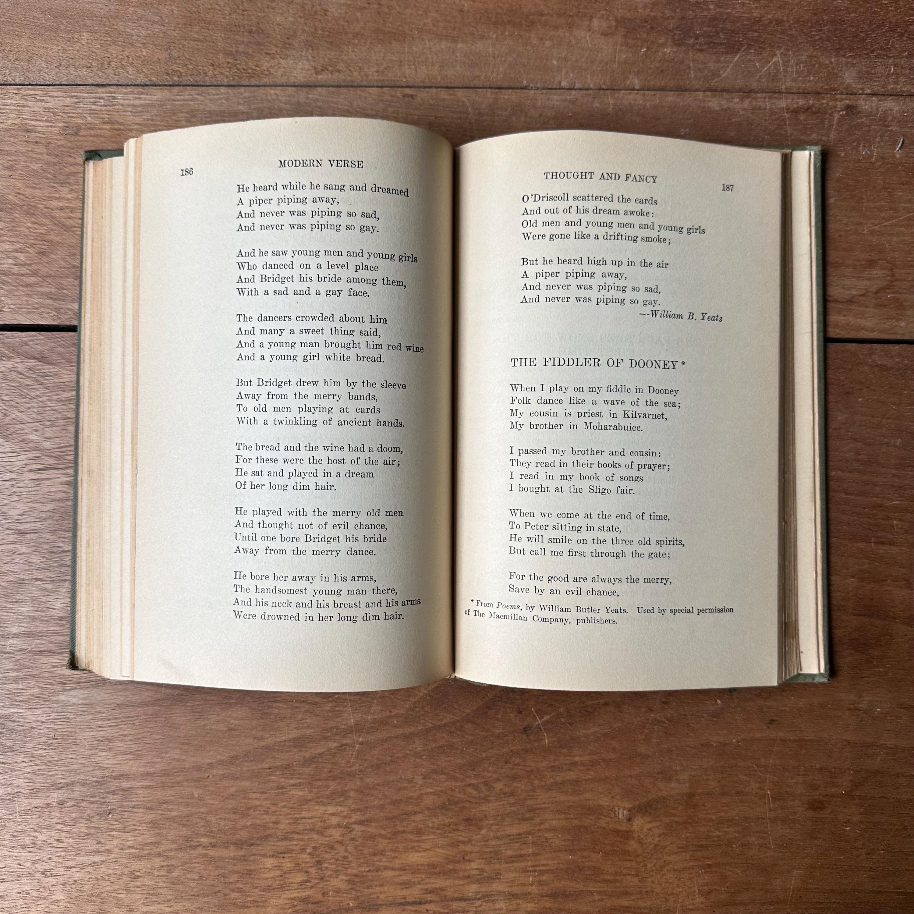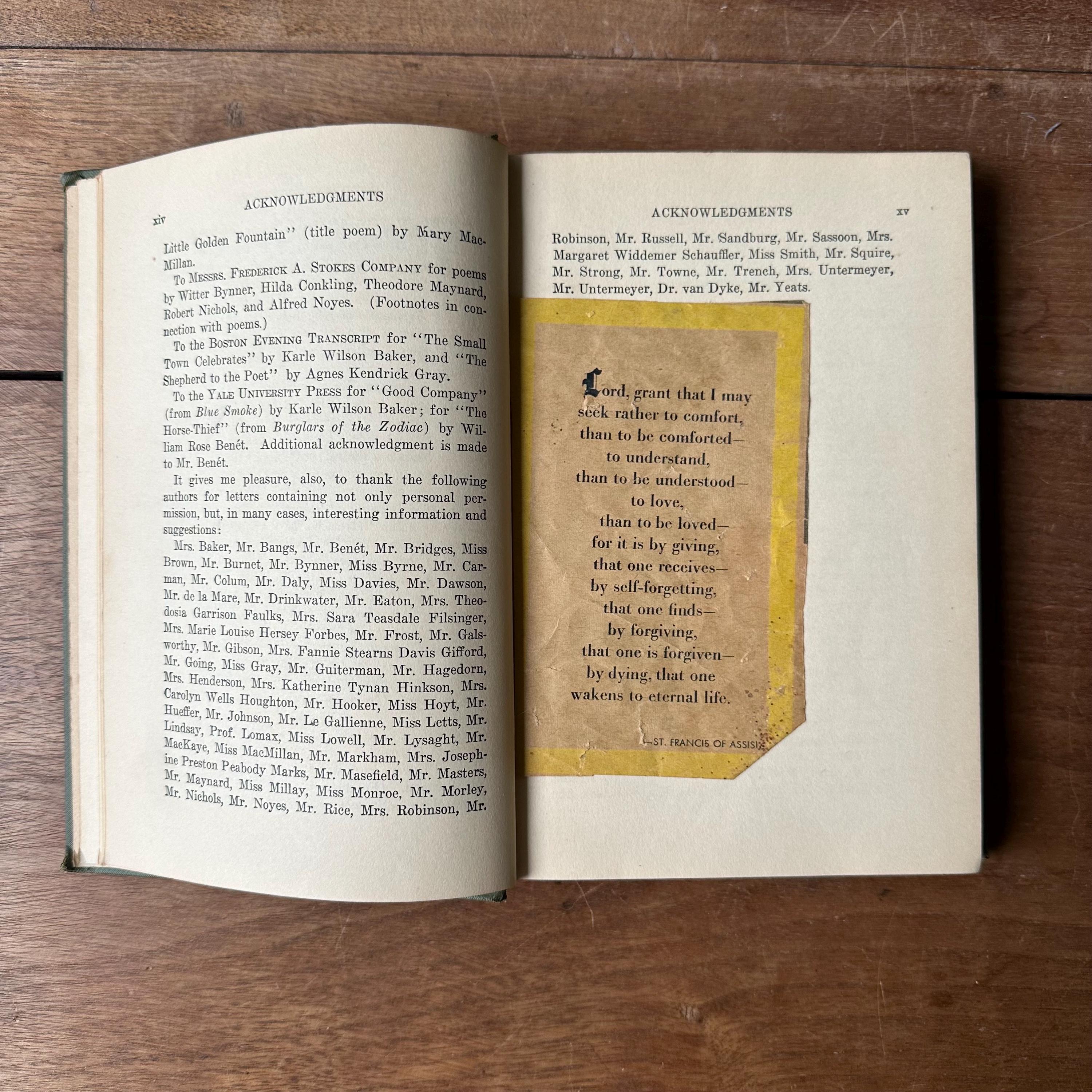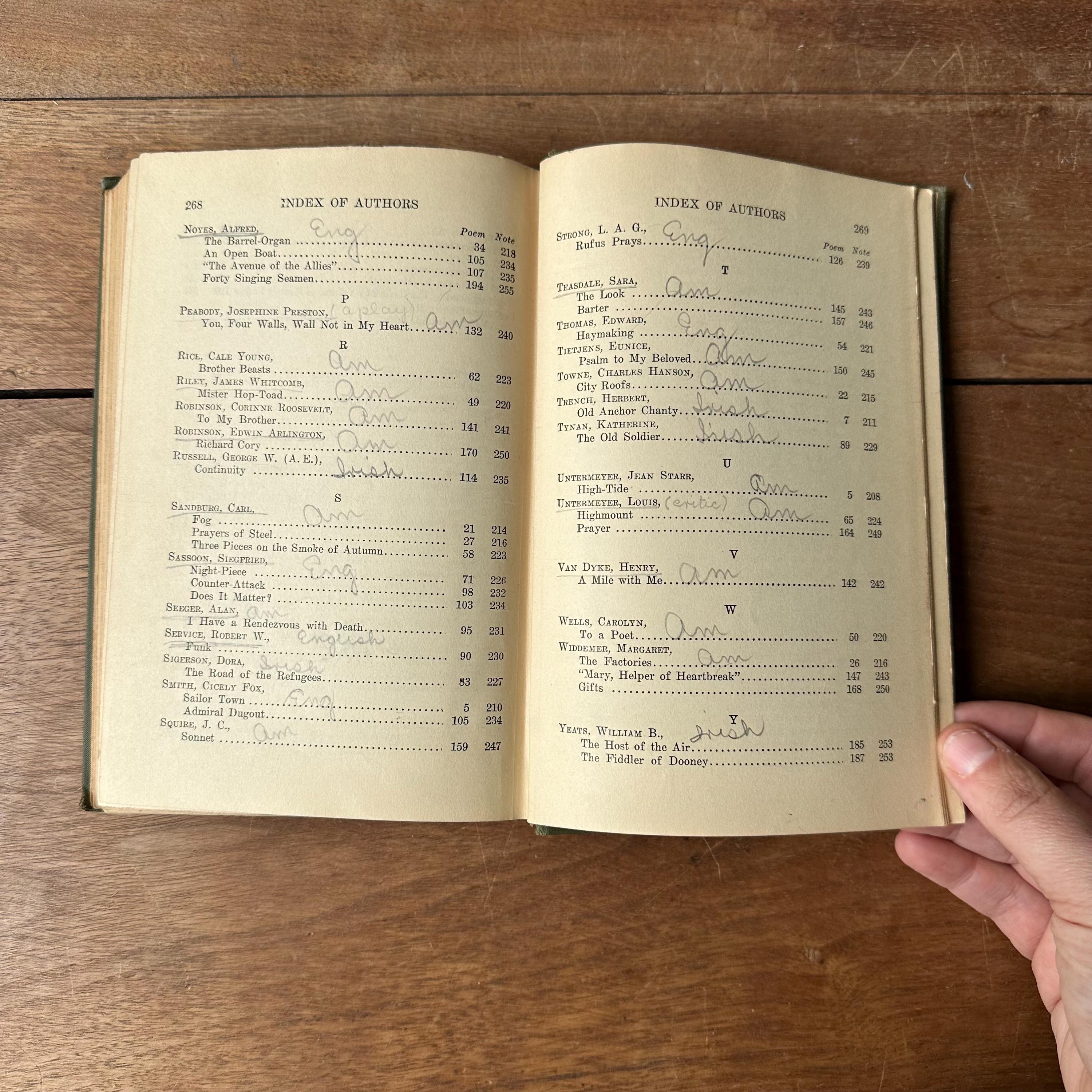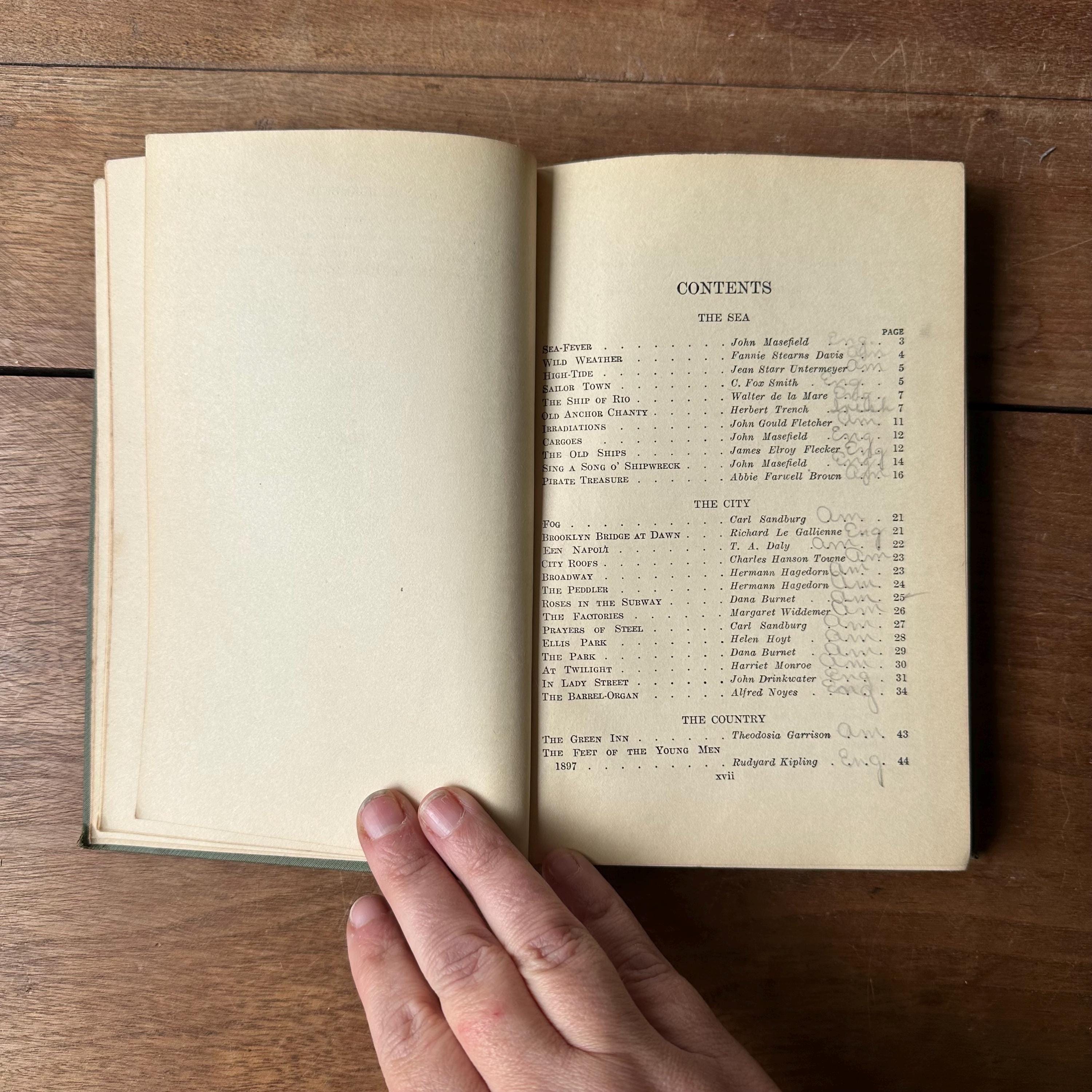 This is the 1921 edition of Modern Verse, published Henry Holt and Company. It has green covers with brown lettering and borders. Both front cover and spine have a small decorative flourish. The book has both British and American poetry and includes famous poets like Carl Sandburg, Robert Frost, Edna St. Vincent Millay, Joyce Kilmer, Sigfried Sassoon, and more. There are 281 pages. A cutout of the Prayer of St. Francis of Assisi has been tucked in the pages.