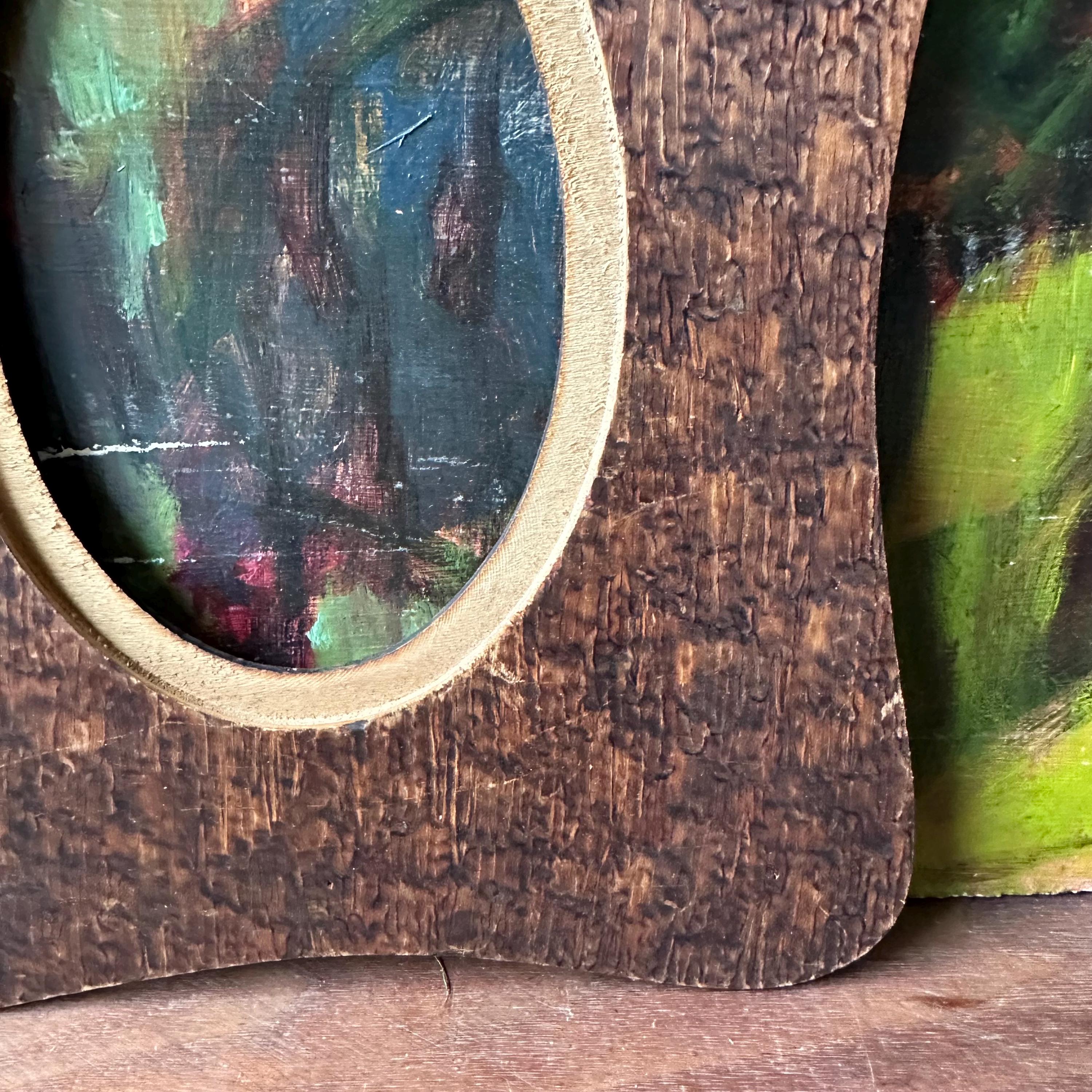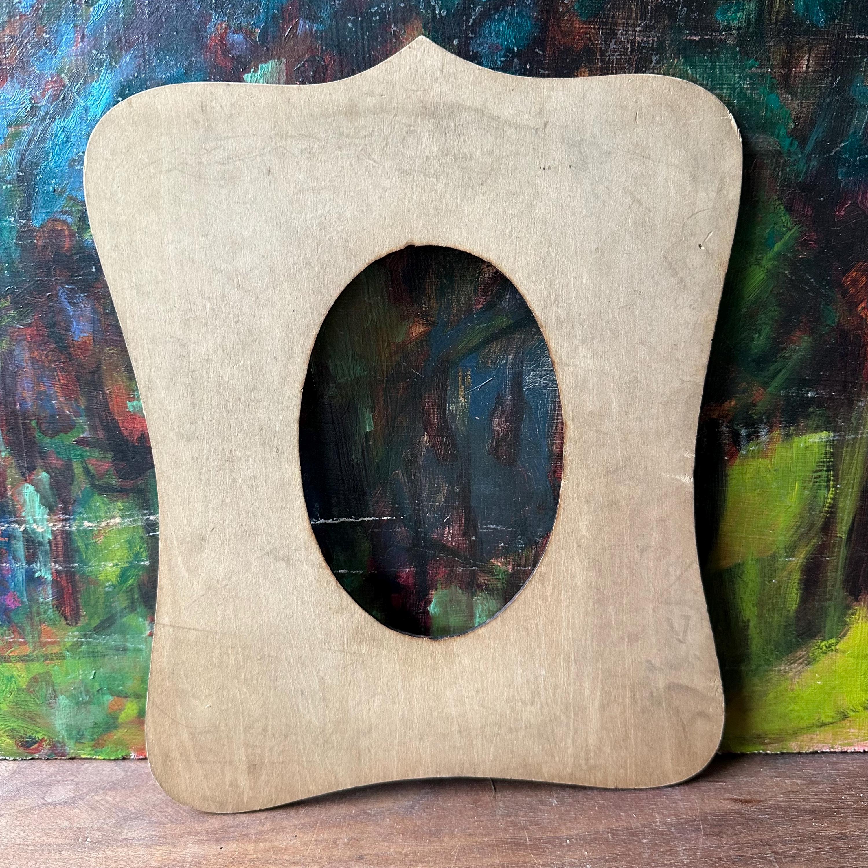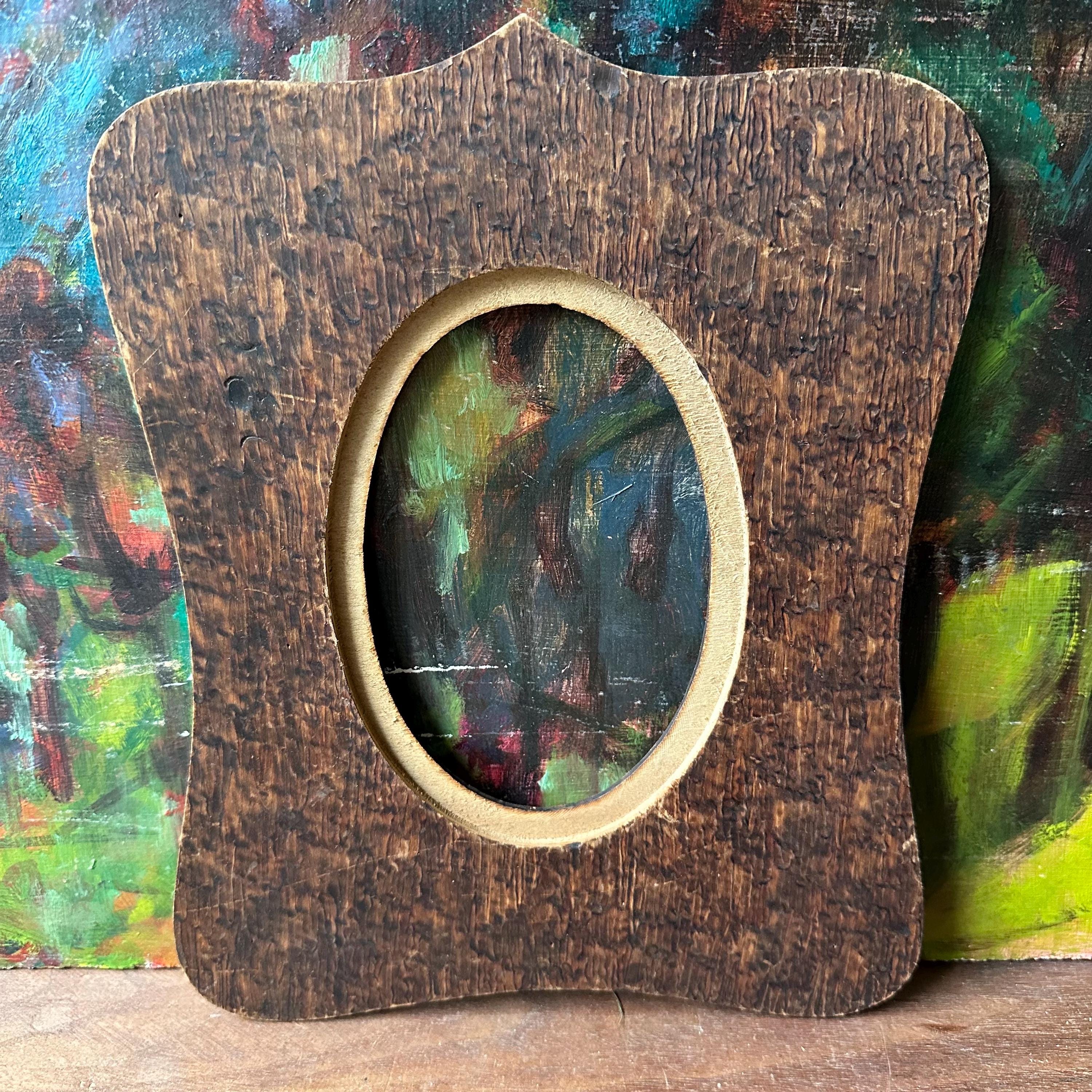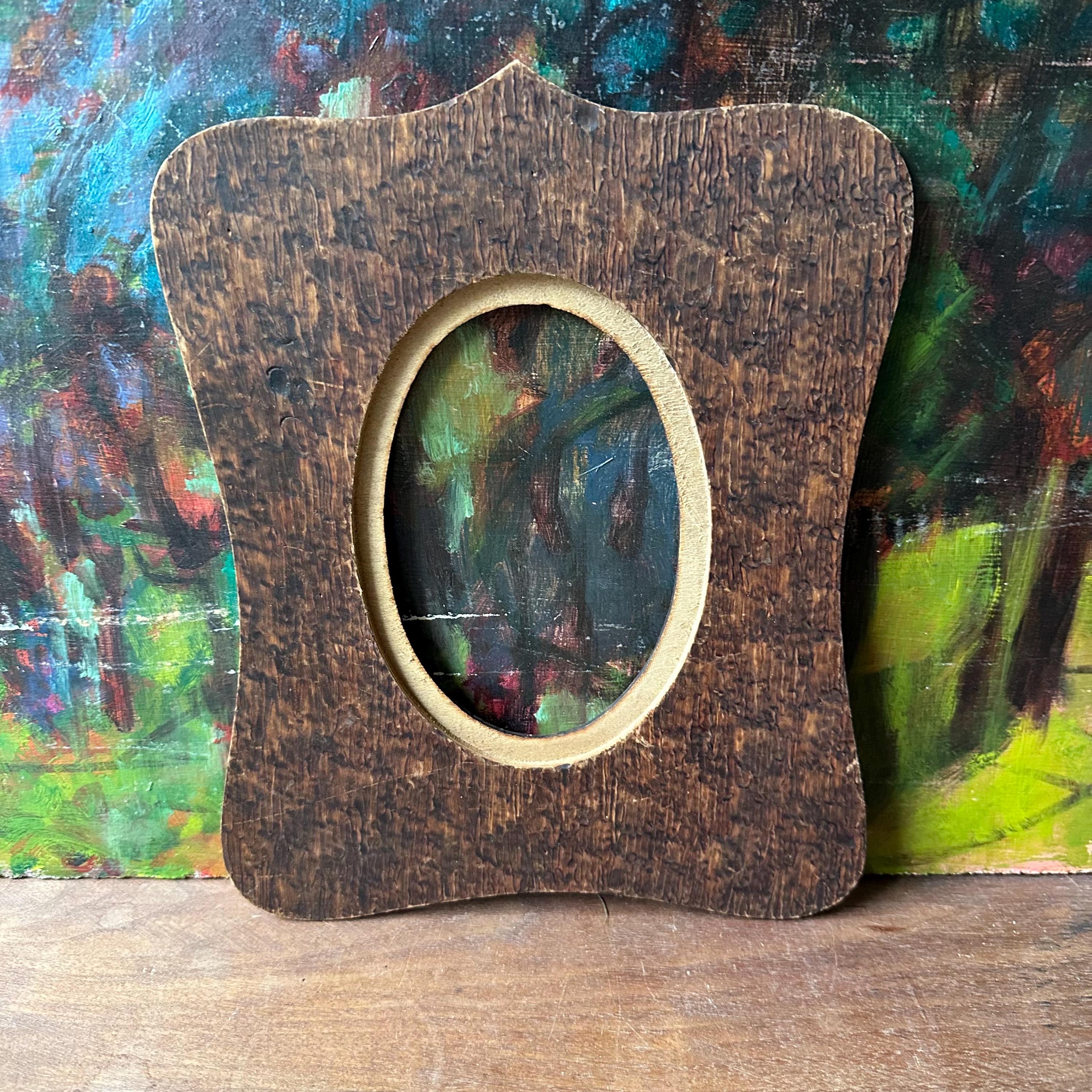 This is pyrography carved curved wood frame. The frame is curved on the bottom and top with the top coming to a center point. The frame opening is oval with a plain wood inset to support the photo. The front of the frame is burned pyrography made to look like wood grain. The back and sides are plain. There is no glass to the frame.