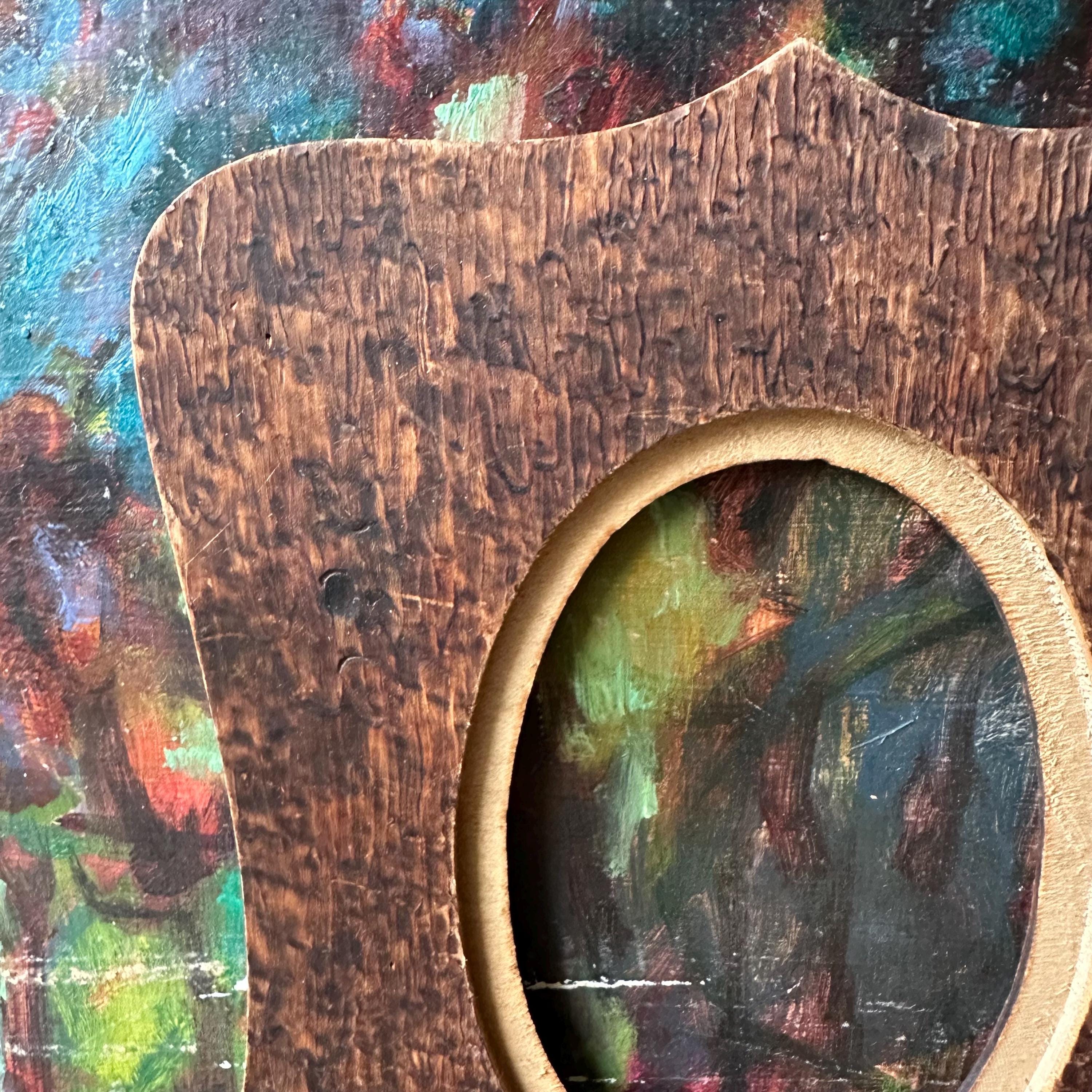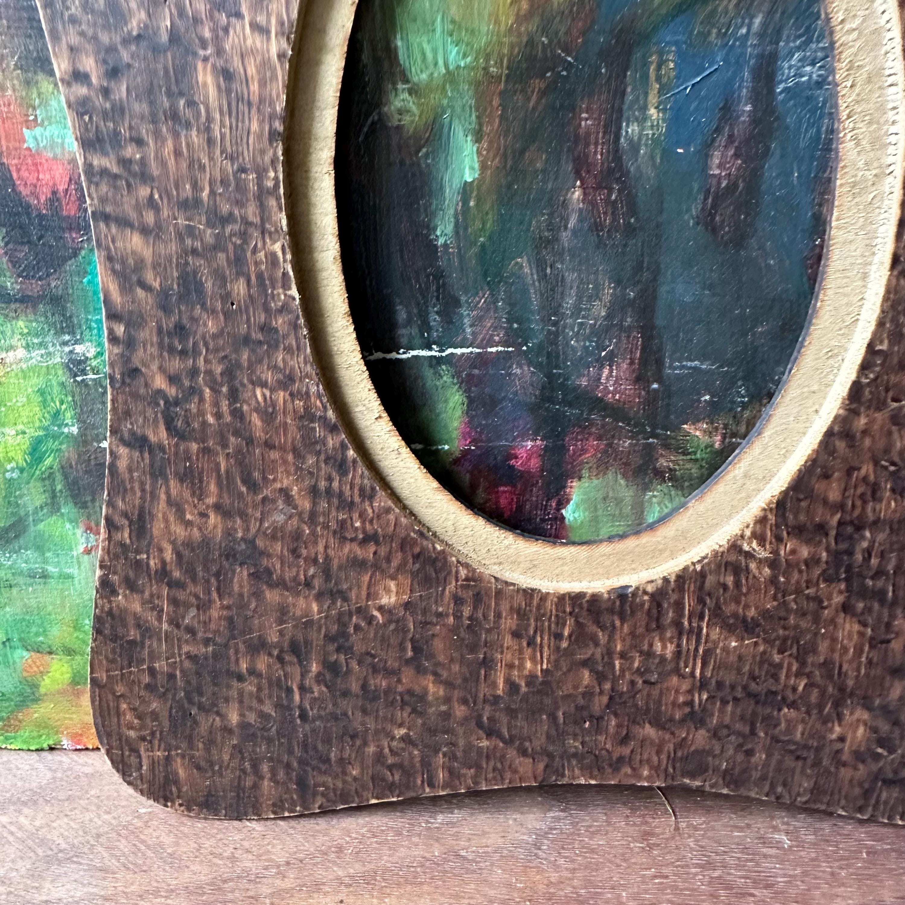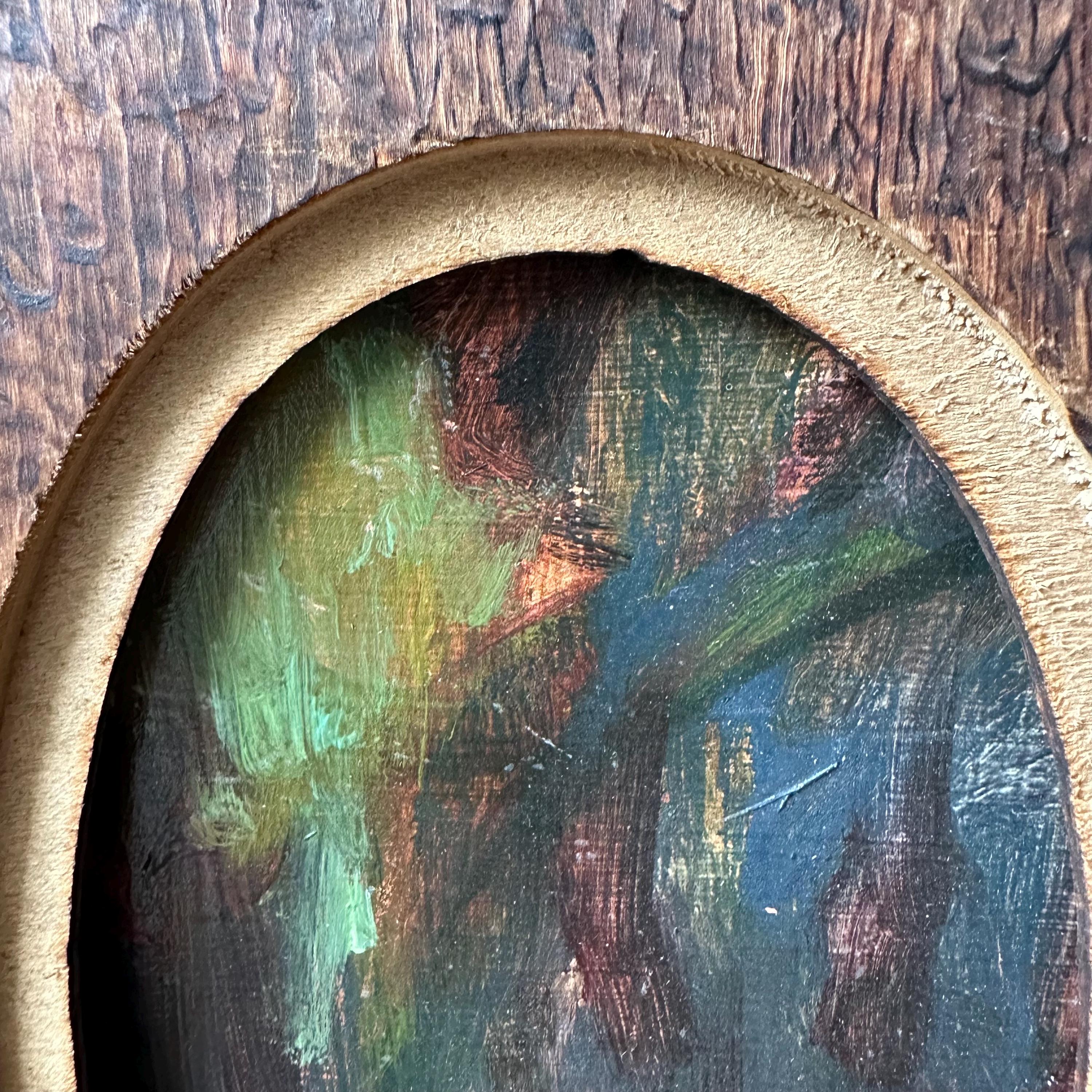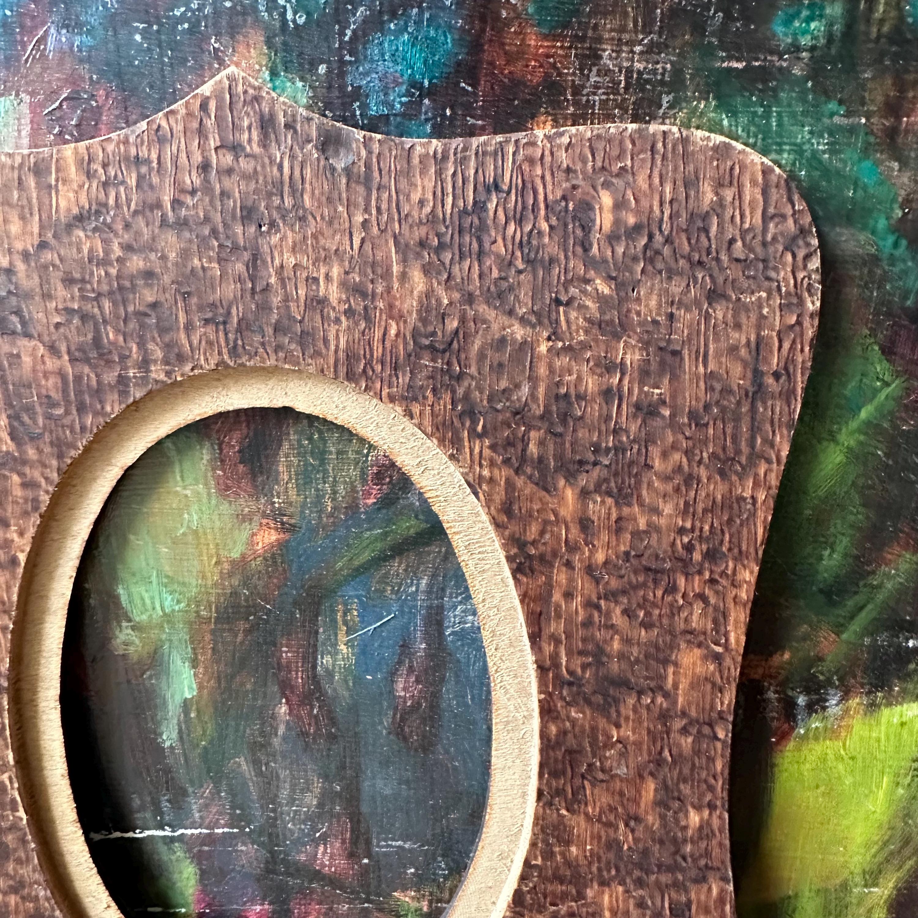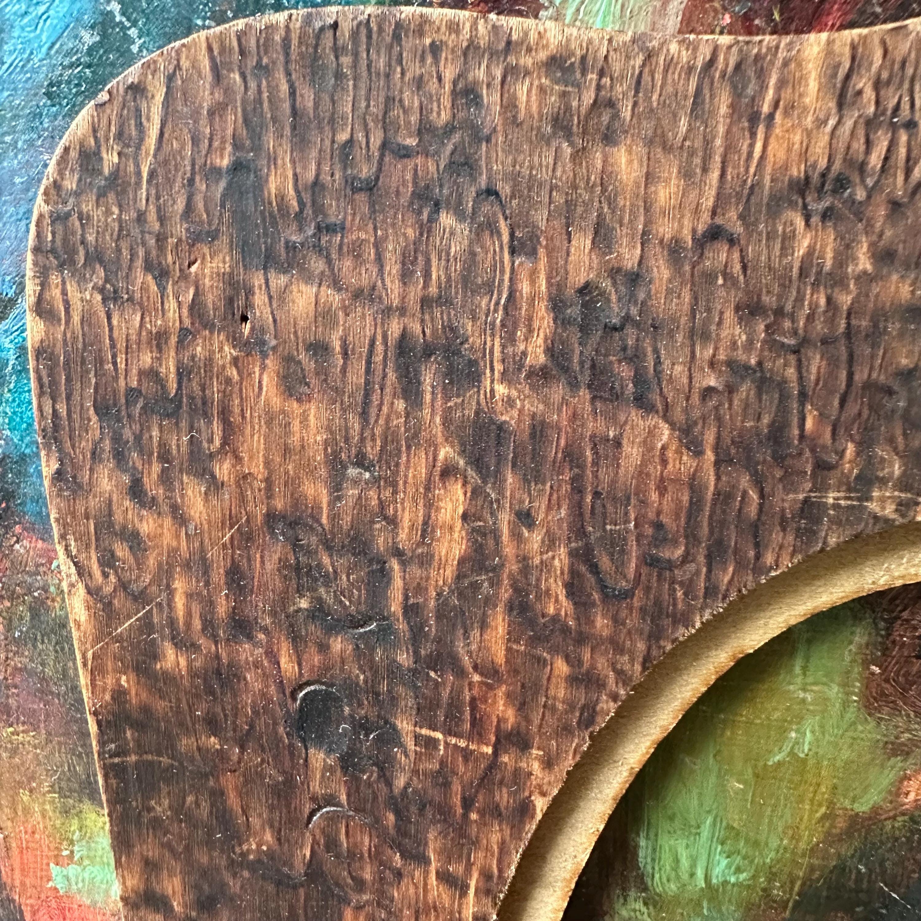 This is pyrography carved curved wood frame. The frame is curved on the bottom and top with the top coming to a center point. The frame opening is oval with a plain wood inset to support the photo. The front of the frame is burned pyrography made to look like wood grain. The back and sides are plain. There is no glass to the frame.