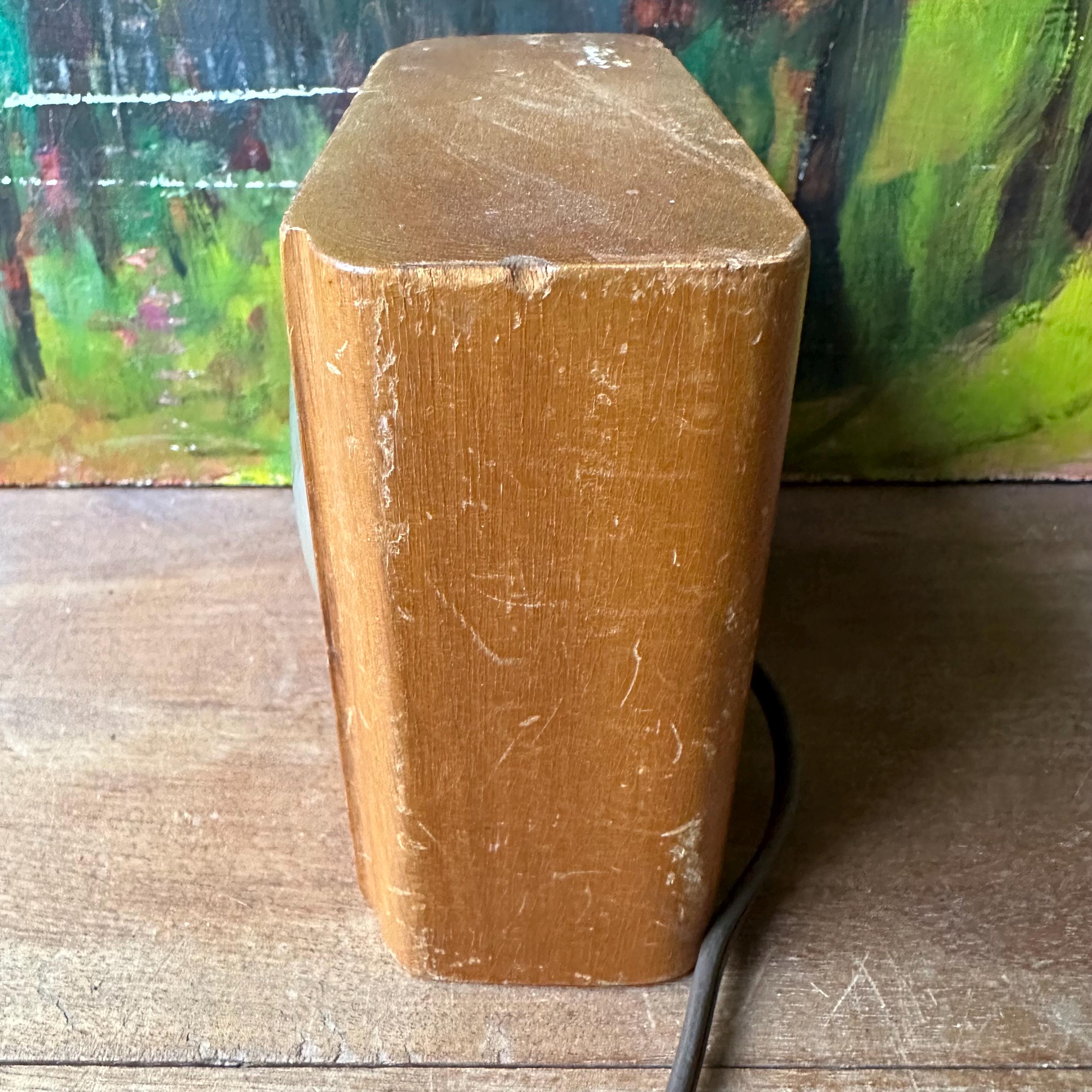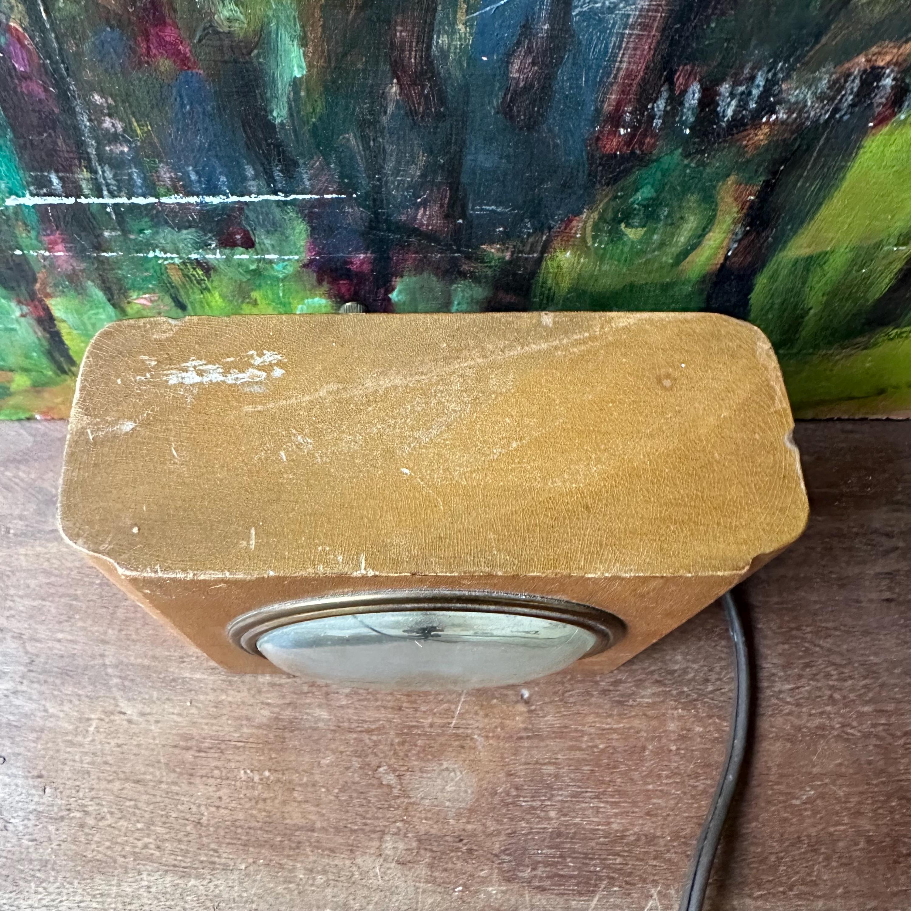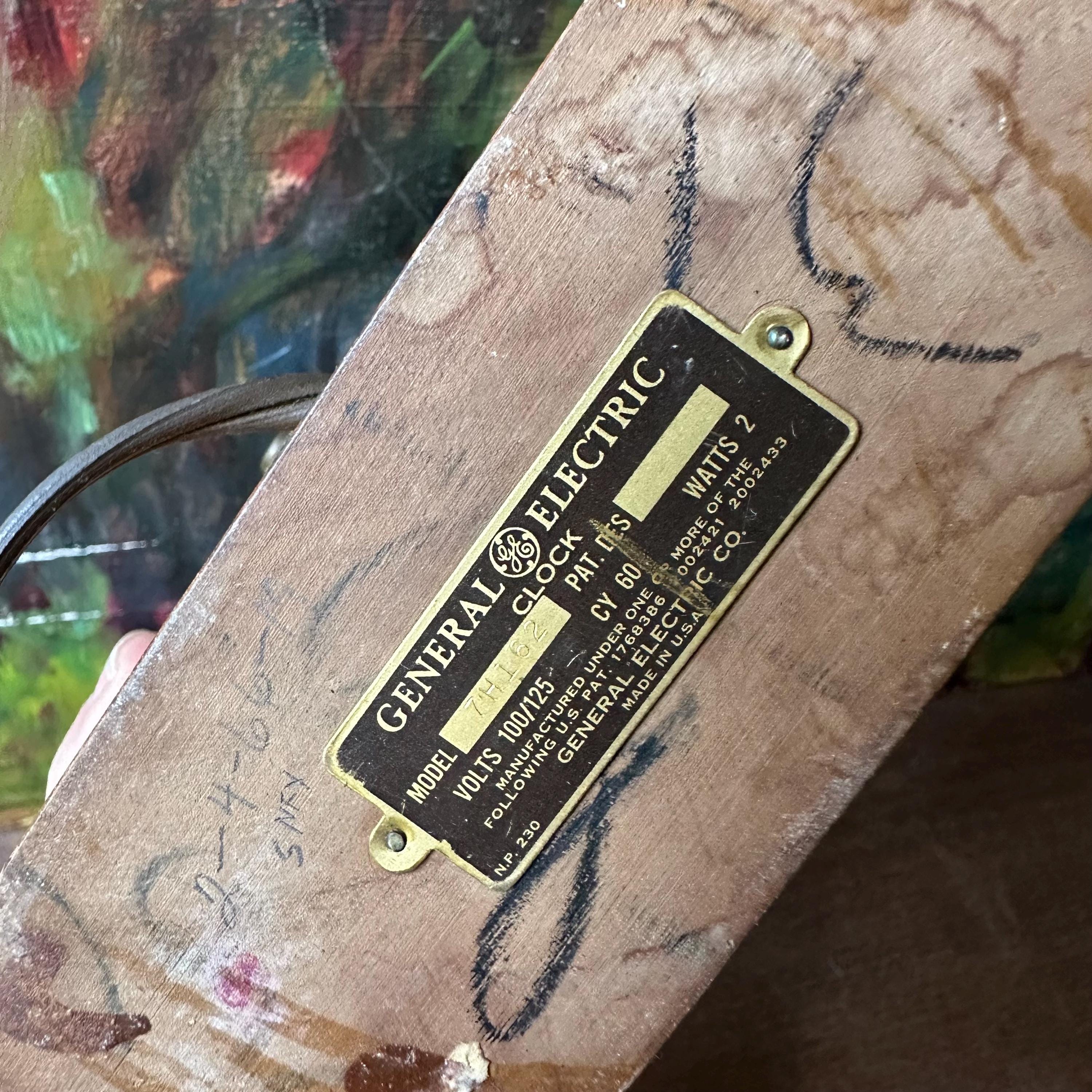 The clock is good condition for its age and use. Altho. The clock does work when plugged in, but for safety reasons, we recommend changing the plug out as this one is from the 1960s! The wood case some scratches with small chips. There is a larger area of shallow gouging to the top of the clock. The clock face glass is still clear. The clock face has some discoloration where it is starting to rust. There is writing and a date on the bottom 2-4-66-M SNFY.