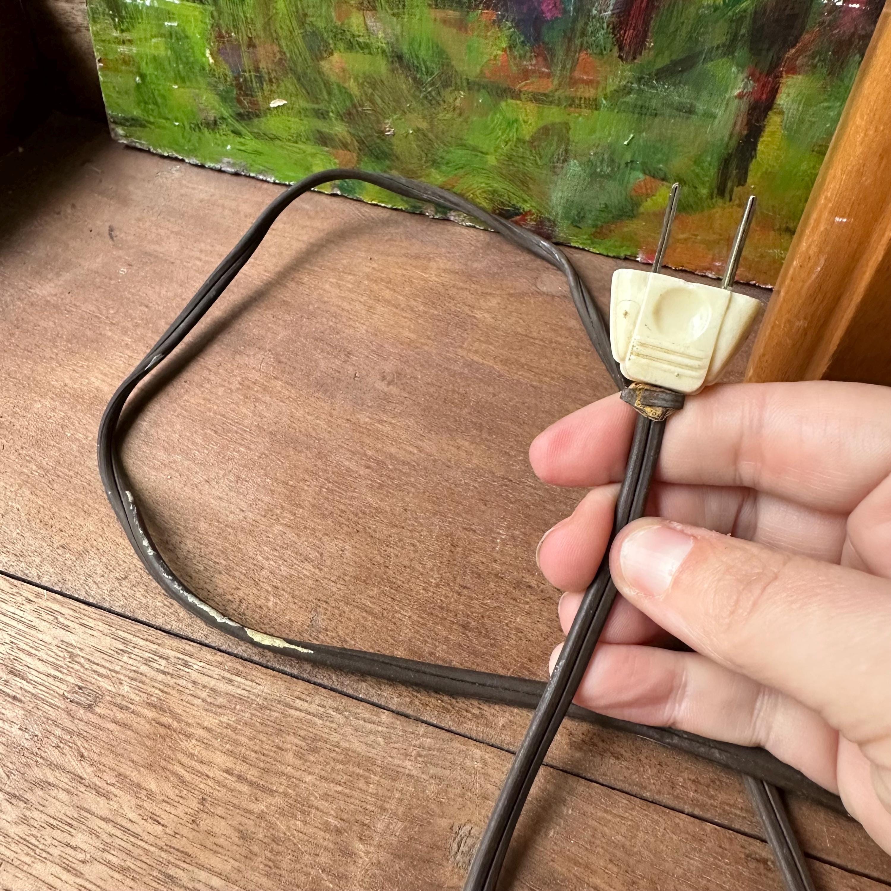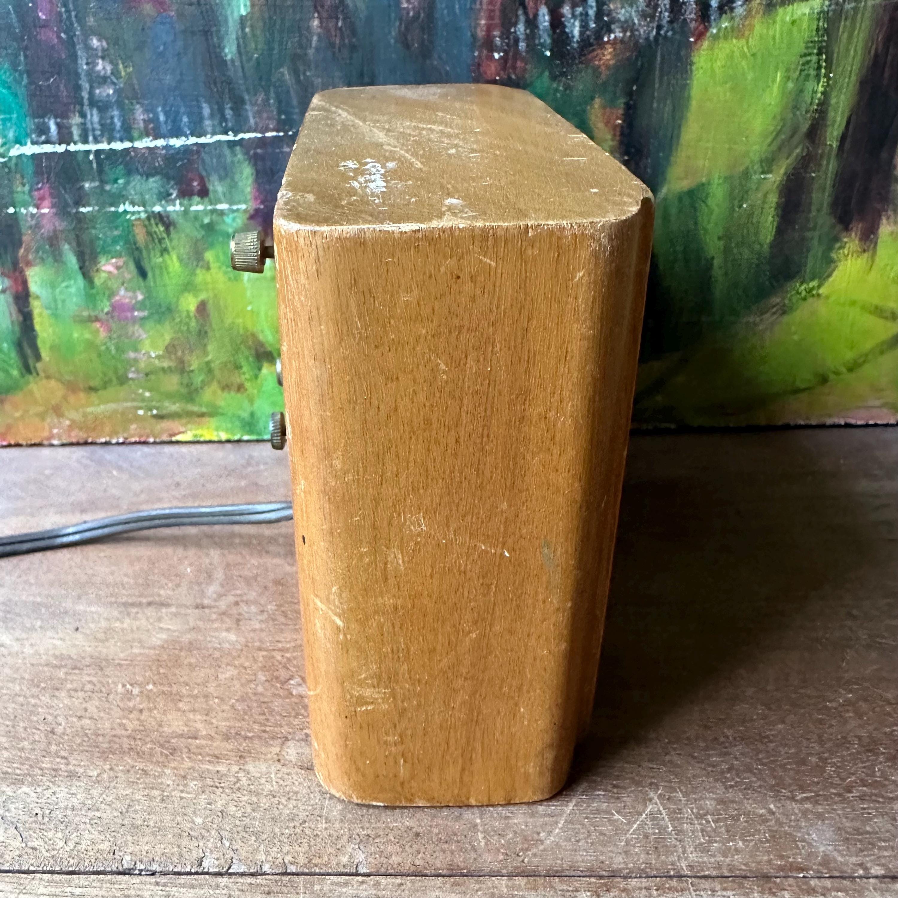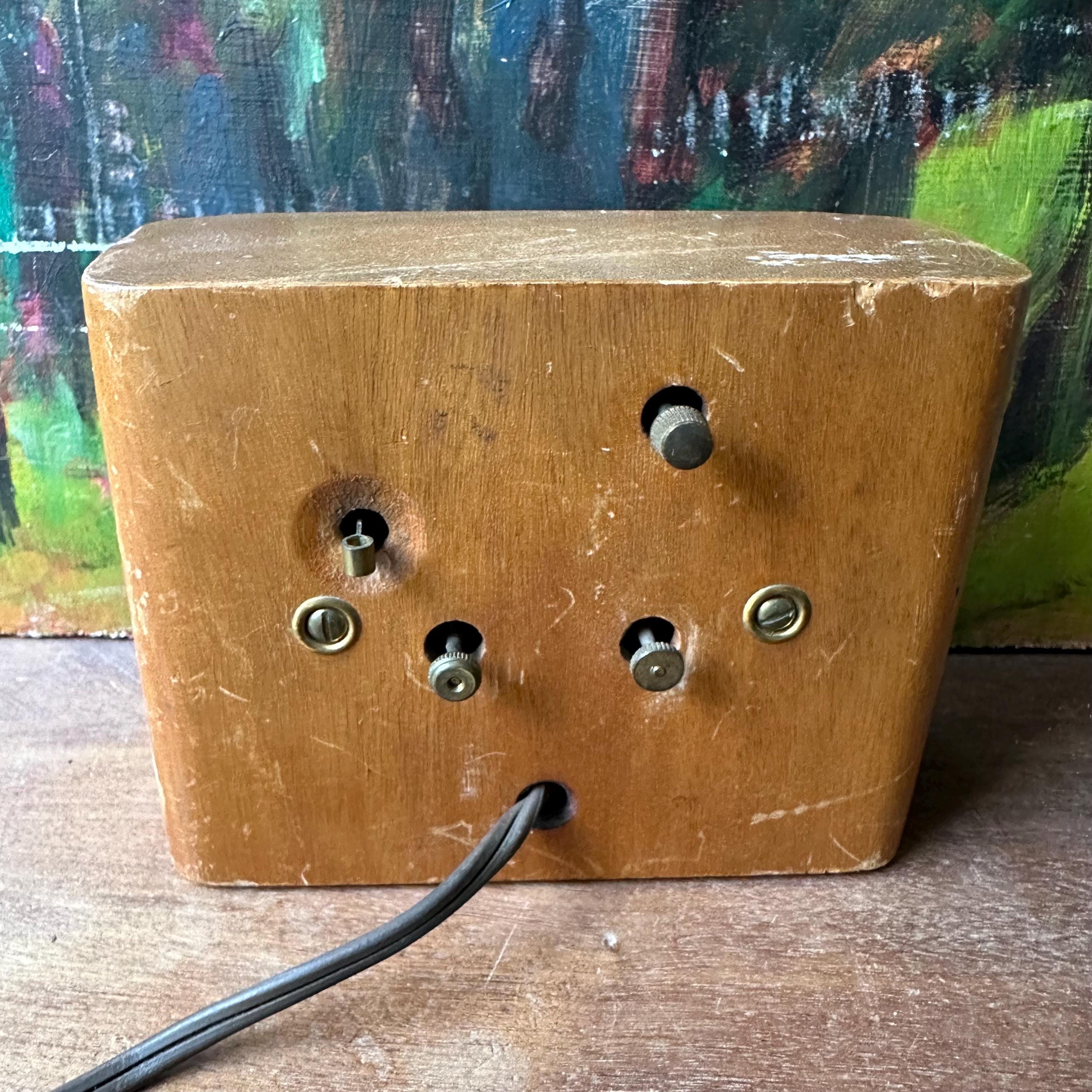 The clock is good condition for its age and use. Altho. The clock does work when plugged in, but for safety reasons, we recommend changing the plug out as this one is from the 1960s! The wood case some scratches with small chips. There is a larger area of shallow gouging to the top of the clock. The clock face glass is still clear. The clock face has some discoloration where it is starting to rust. There is writing and a date on the bottom 2-4-66-M SNFY.