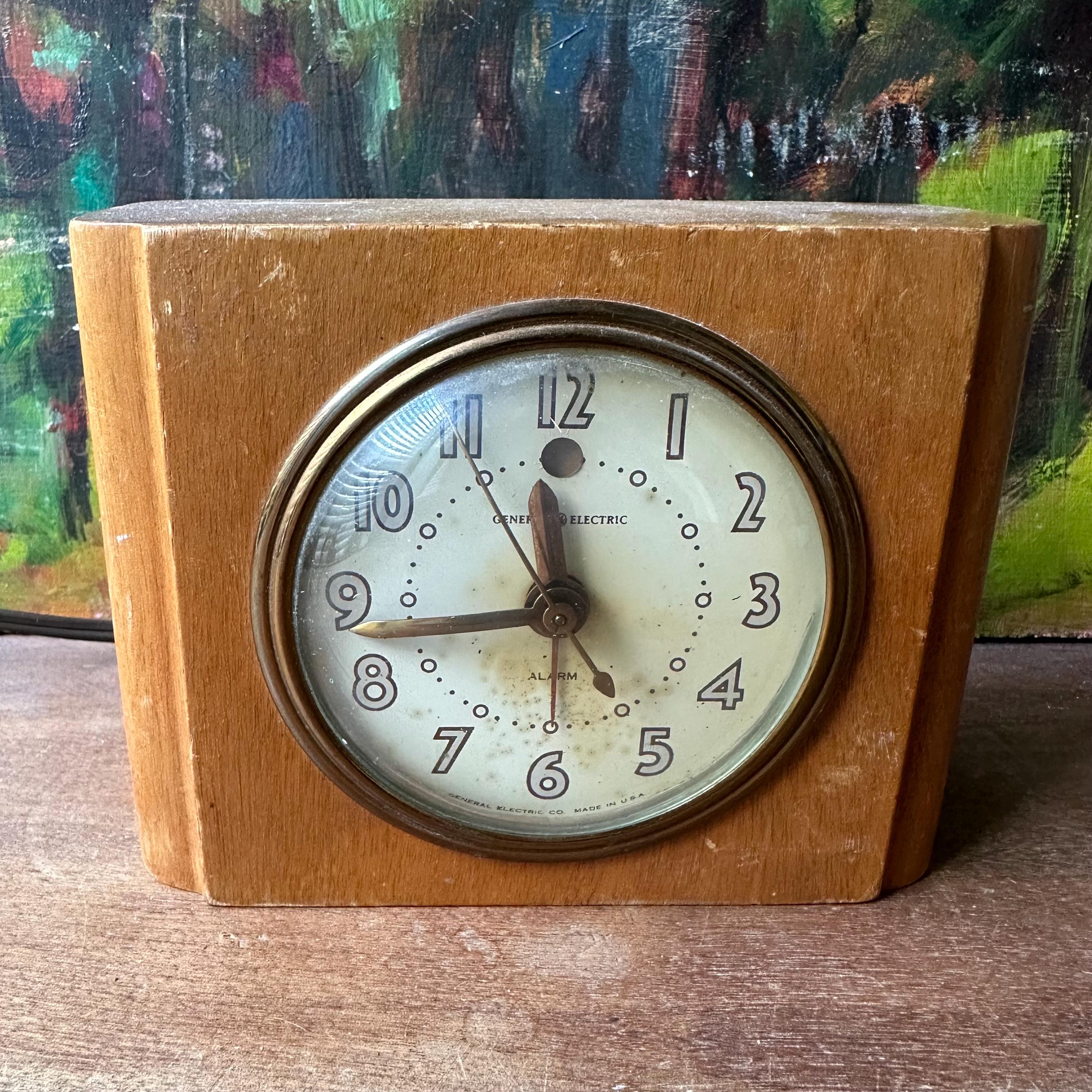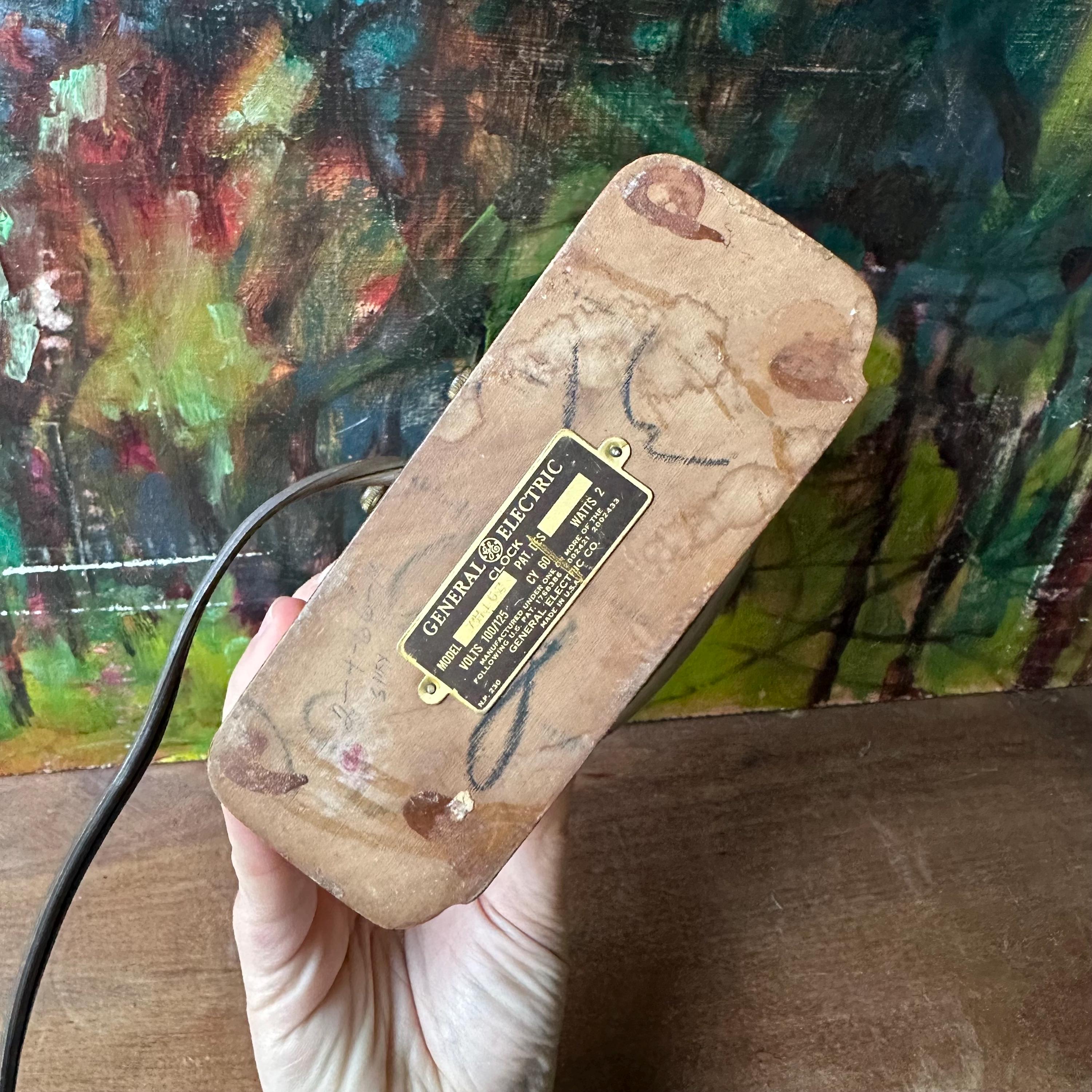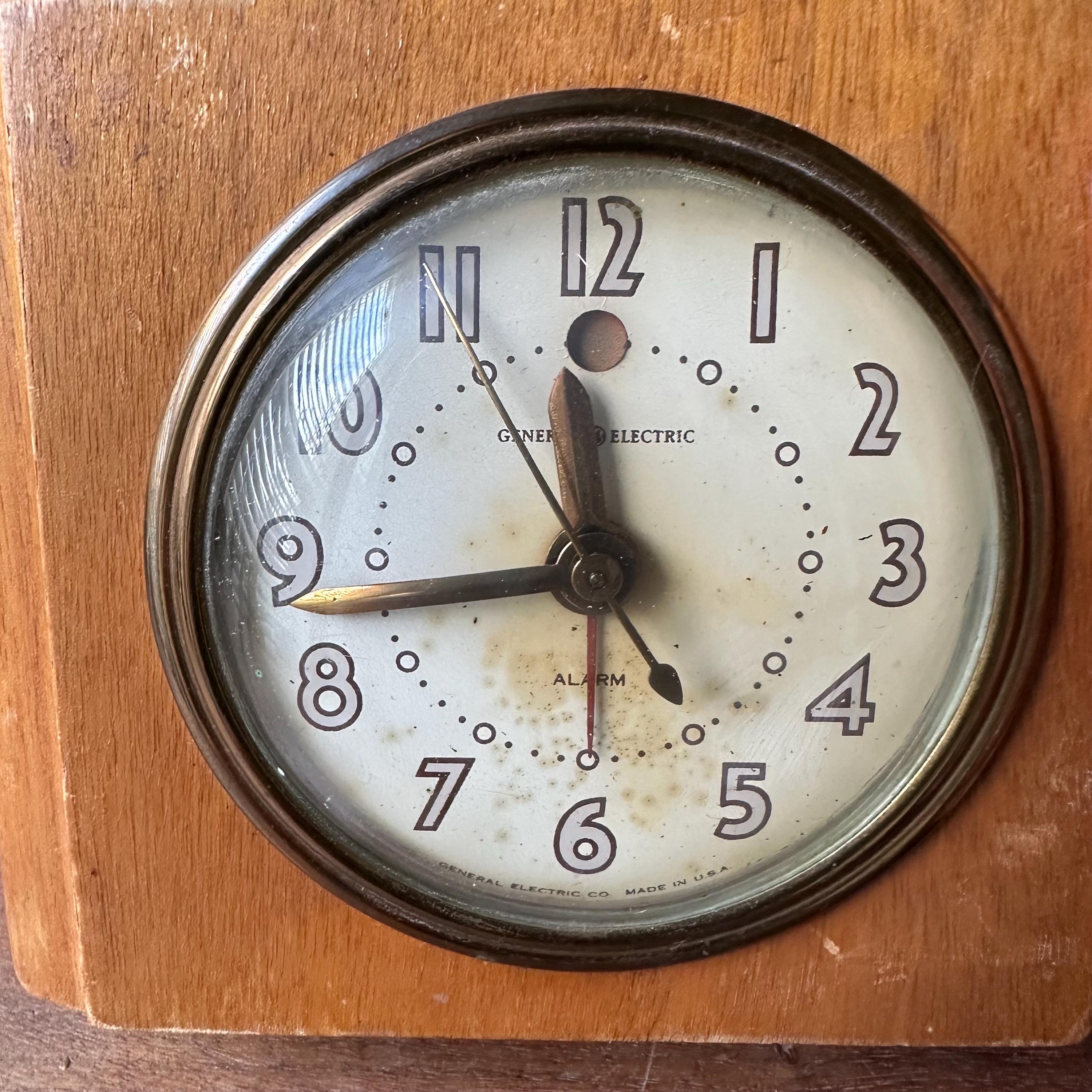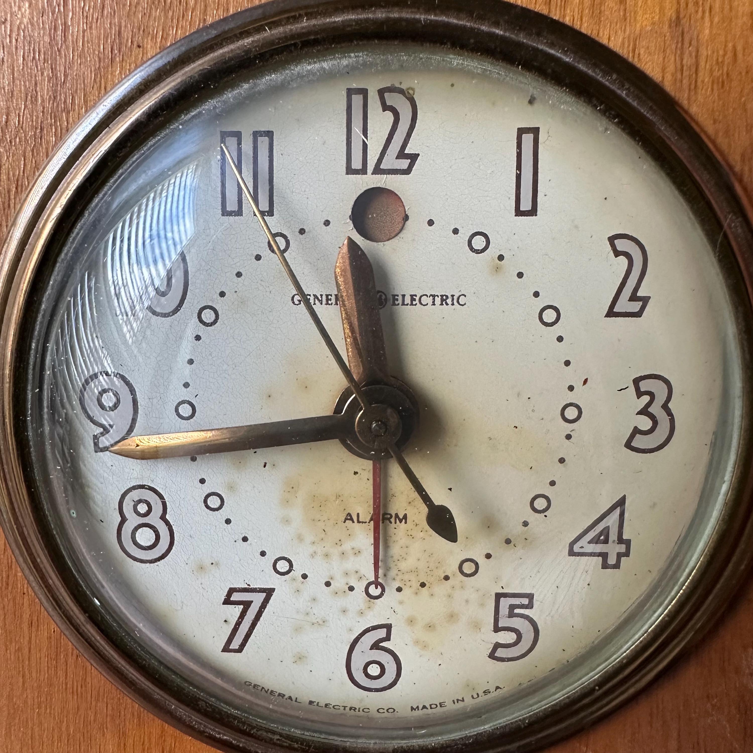 This is a General Electric electric table clock model 7H162. The clock is housed in a light brown wood case with rounded edges and a flat top. The clock face is beige with 4 brass hands with midcentury styling. The clock face is surrounded by a double brass border. The back of the clock has all of the dials. The clock still has the original plug.