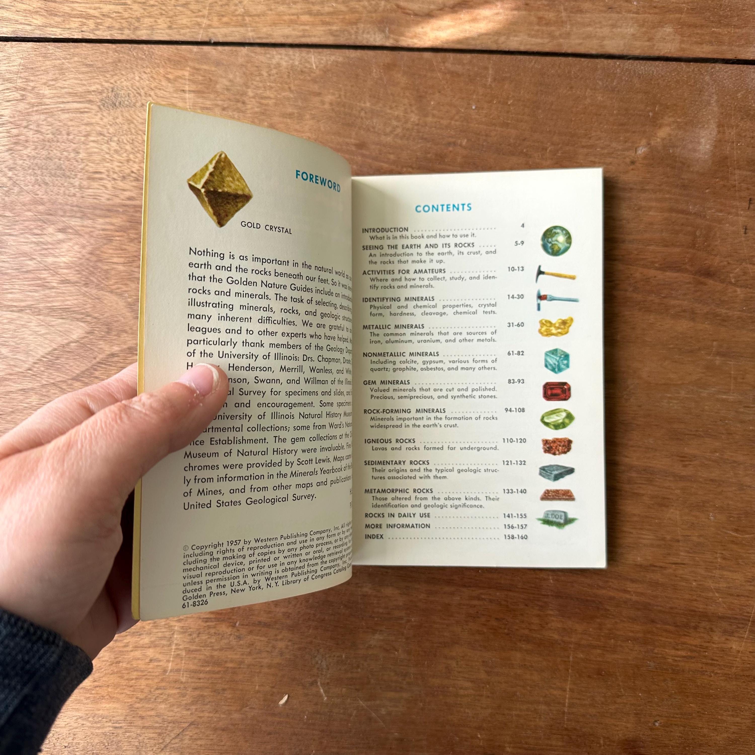 This is the 1957 edition of the Golden Nature Guide to Rocks and Minerals written Herbert S. Zim and Paul R. Shaffer. It is illustrated by Raymond Perlman. There are 160 pages with 400 full color illustrations.
