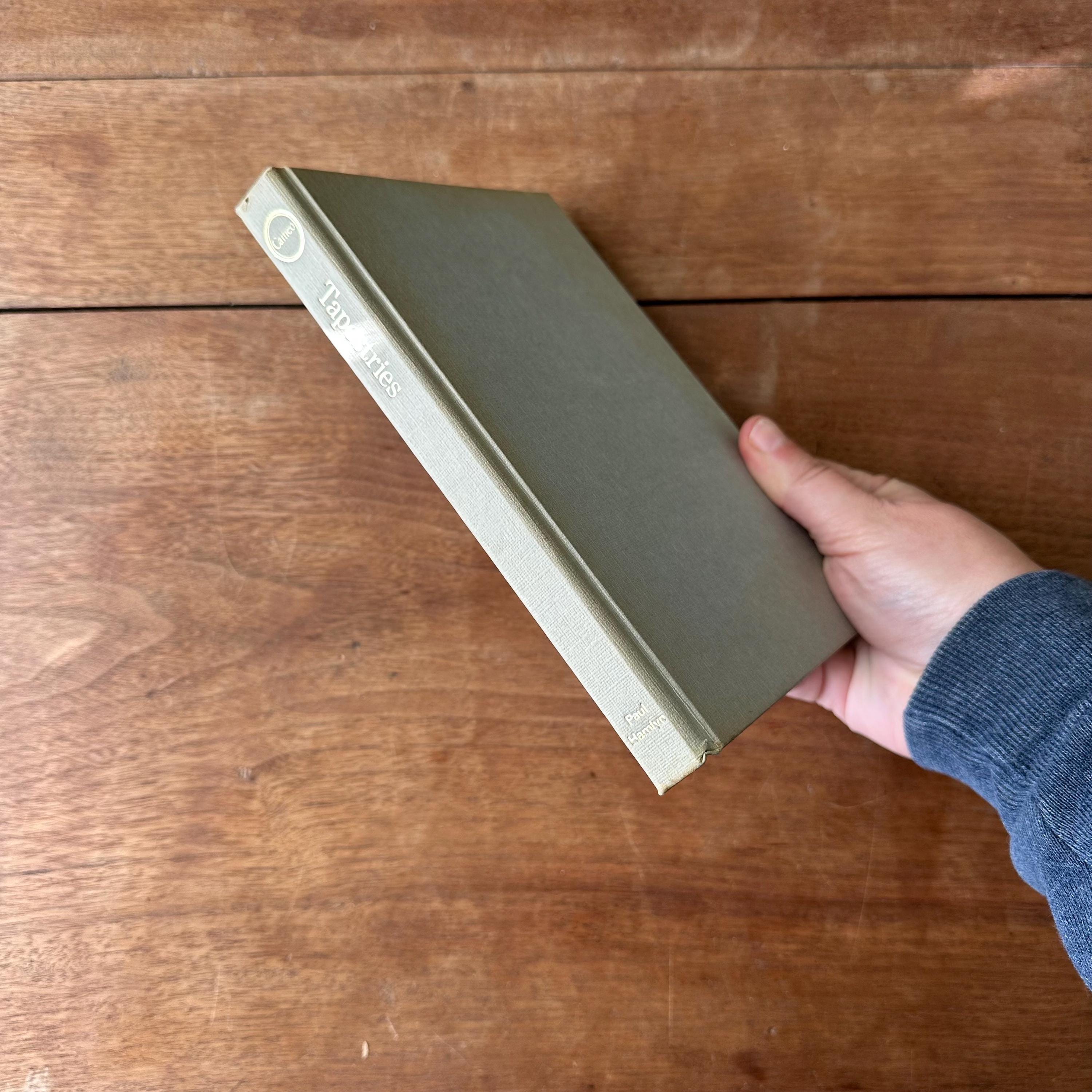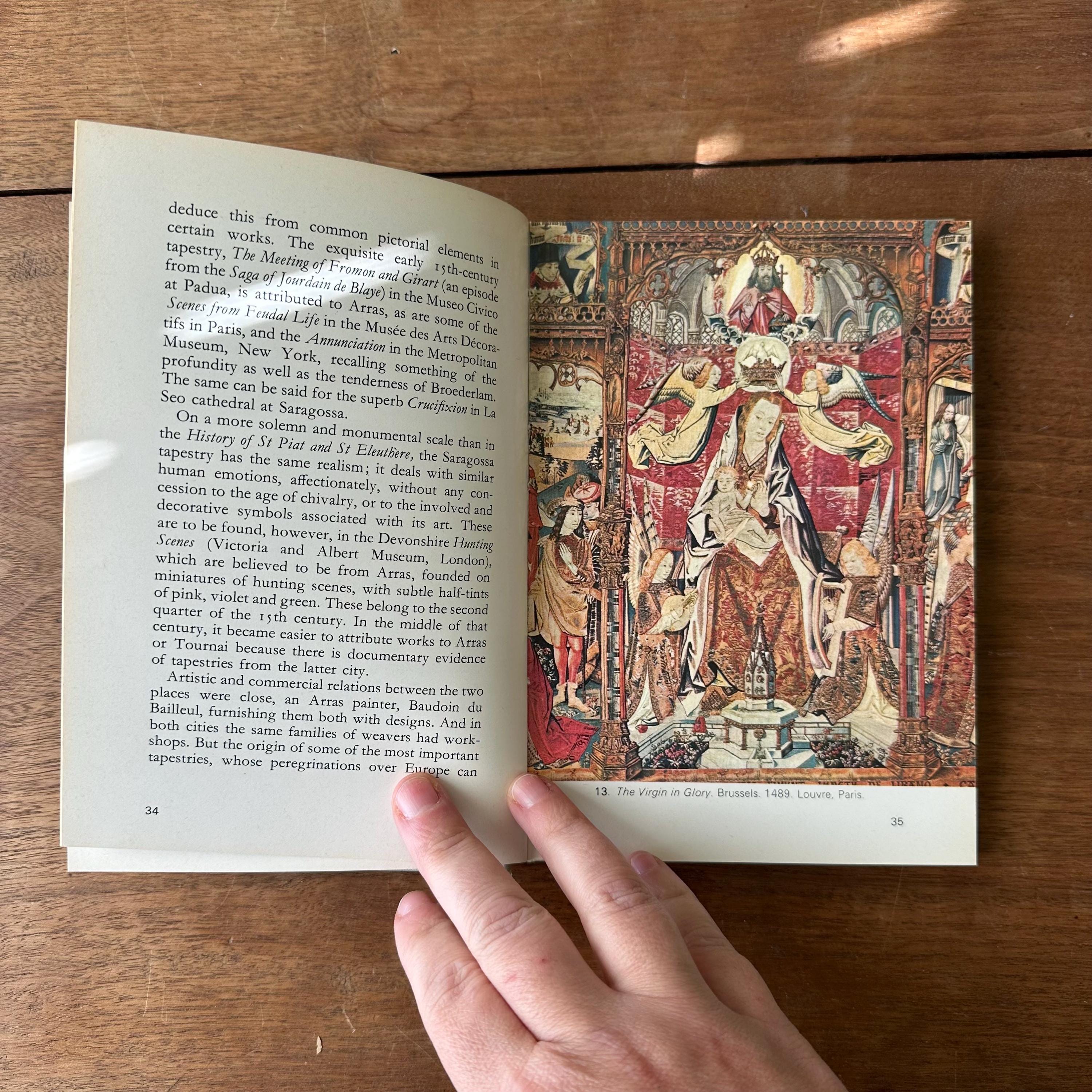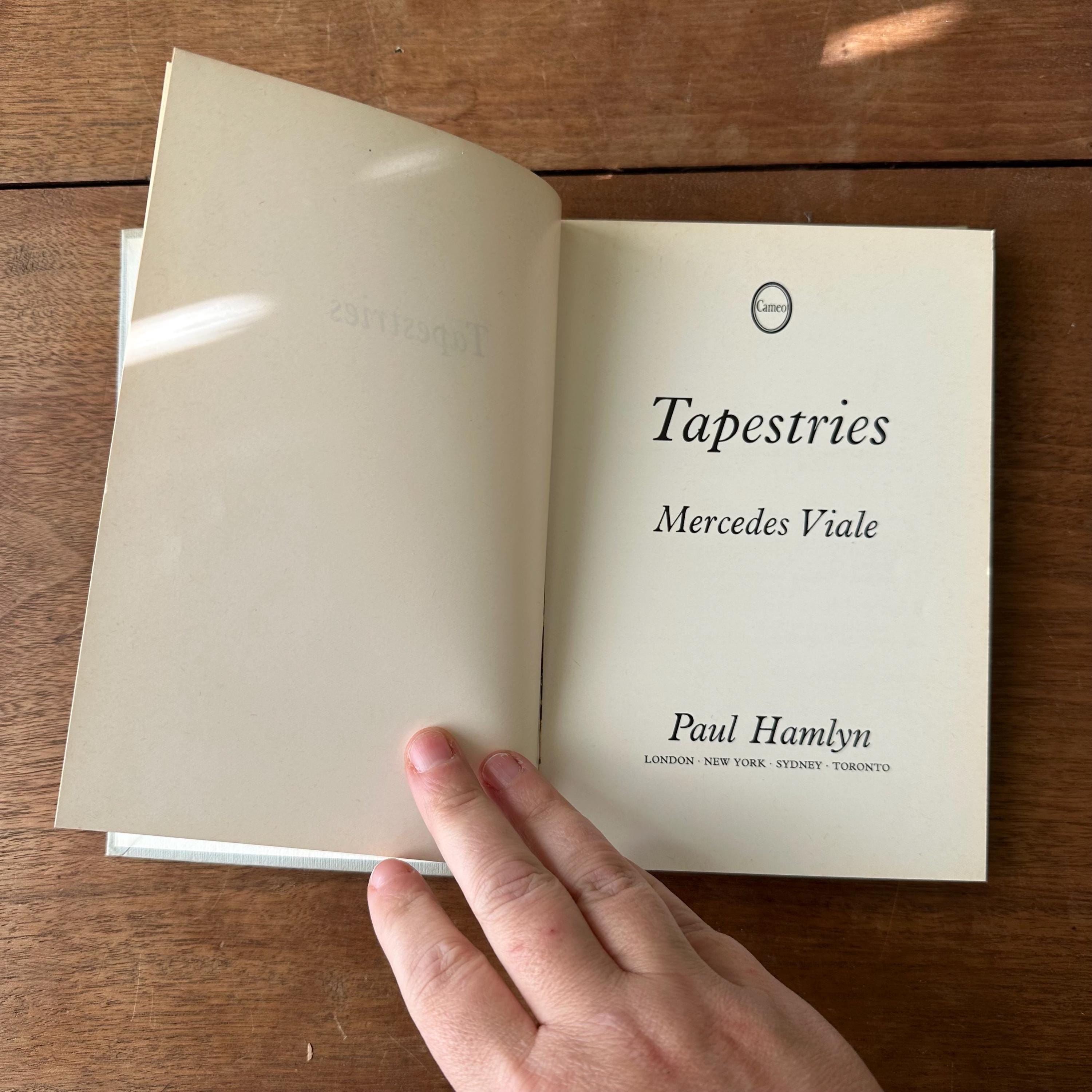 This is the 1969 Cameo edition of Tapestries by Mercedes Viale, published by Paul Hamlyn. It has light gray covers with the spine lettered in silver. The book is an art history guide to tapestries organized chronologically by country. It is illustrated with full color illustration plates of famous tapestries, like the The Unicorn and the Mirror from the Musee de Cluny. There are 159 pages with 70 illustration plates.