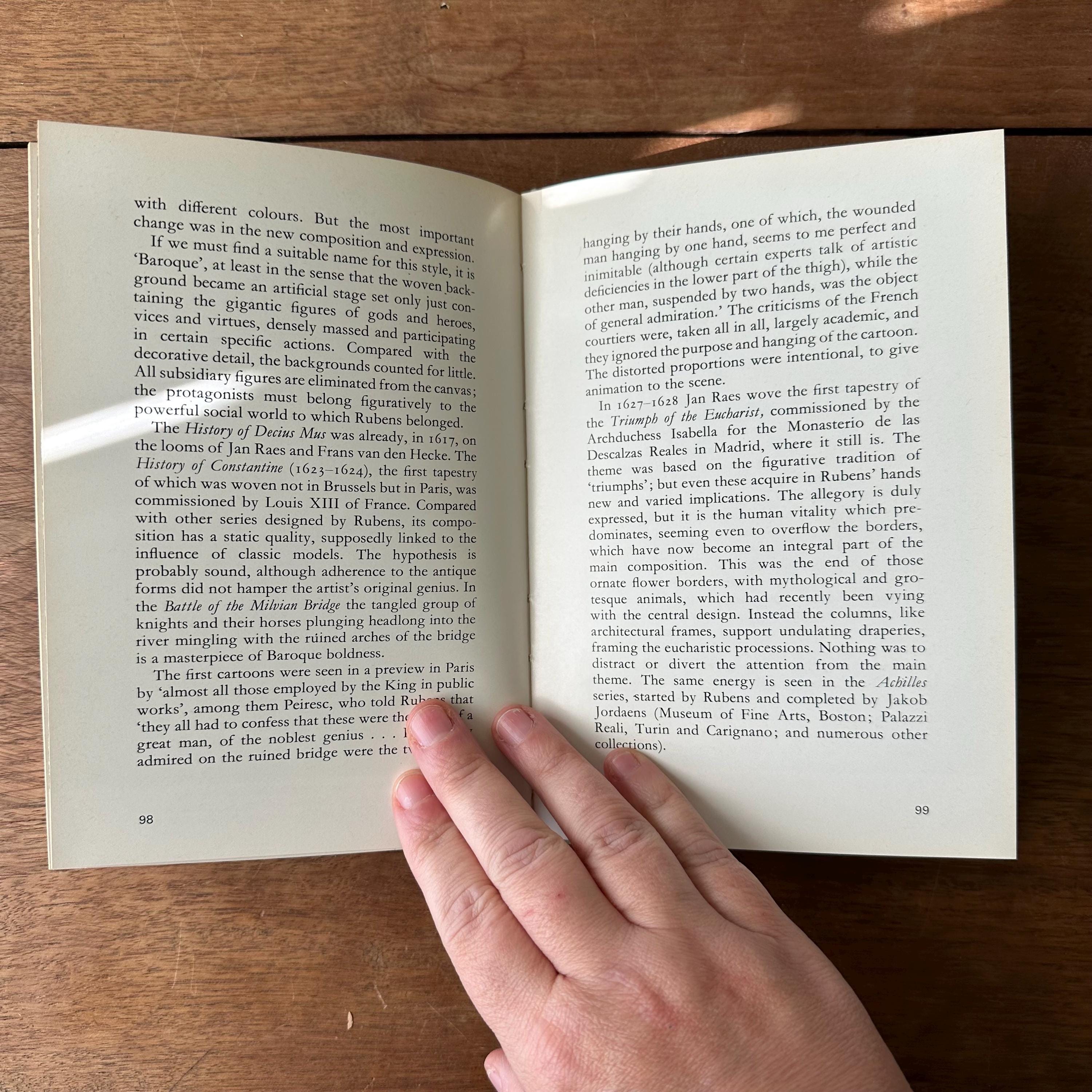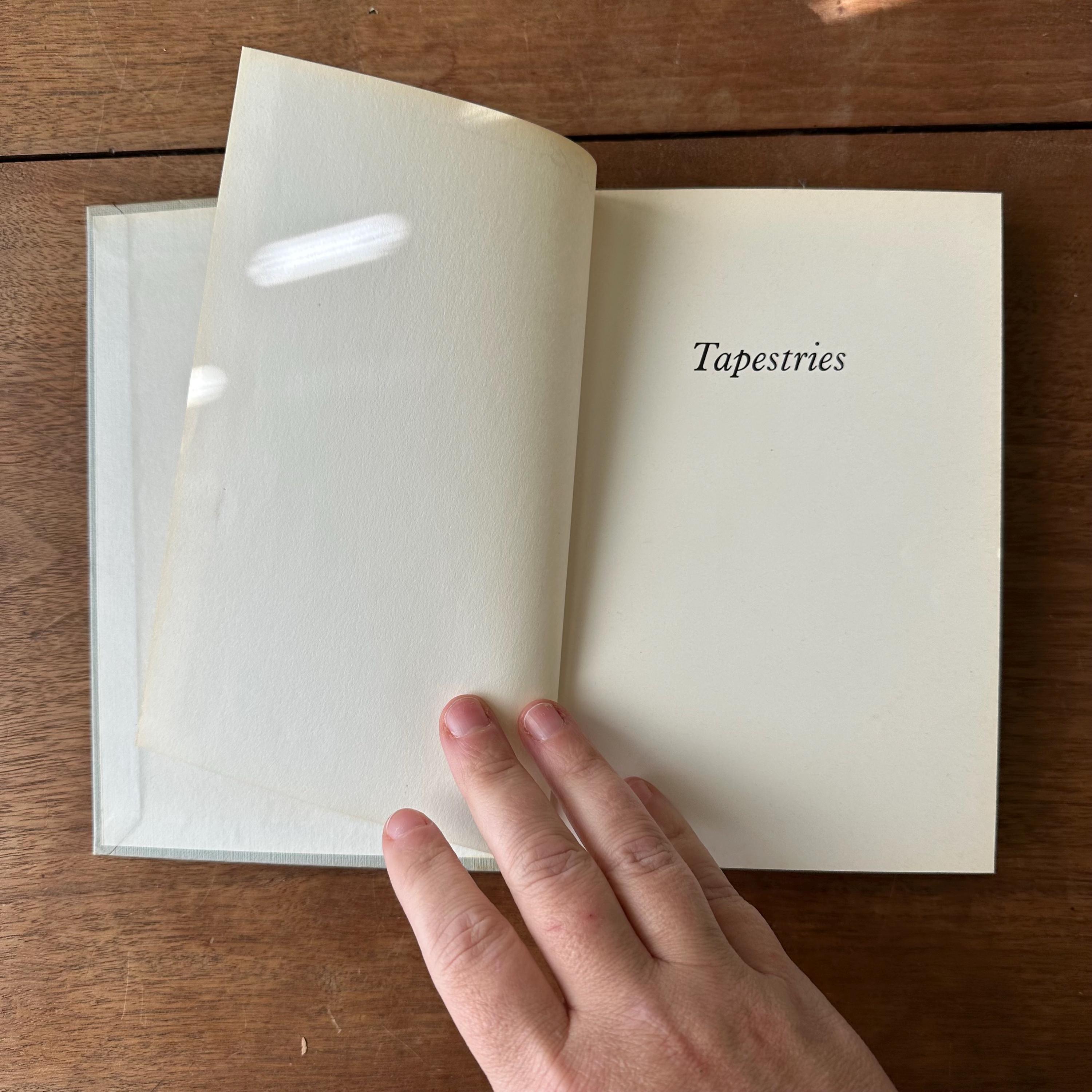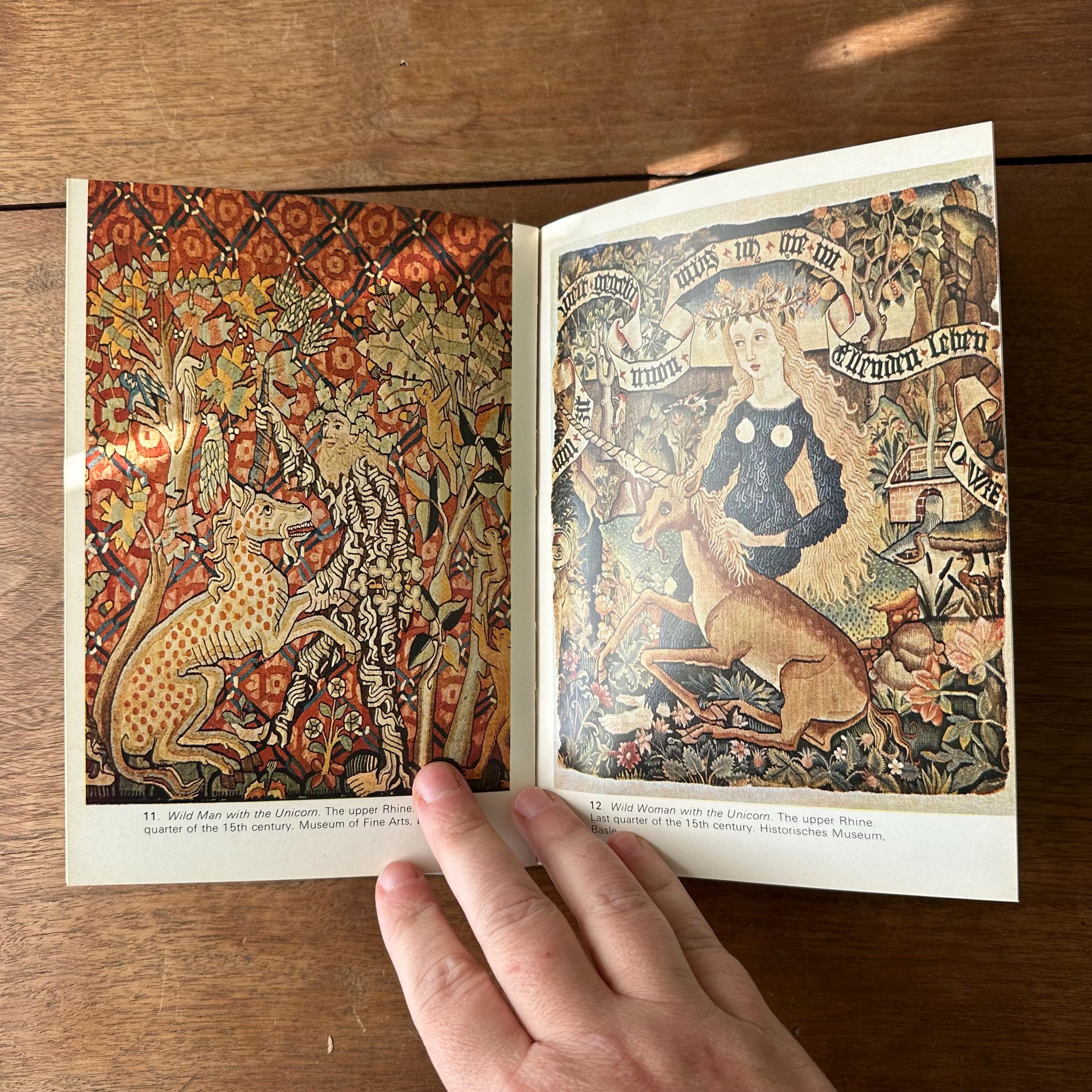 This is the 1969 Cameo edition of Tapestries by Mercedes Viale, published by Paul Hamlyn. It has light gray covers with the spine lettered in silver. The book is an art history guide to tapestries organized chronologically by country. It is illustrated with full color illustration plates of famous tapestries, like the The Unicorn and the Mirror from the Musee de Cluny. There are 159 pages with 70 illustration plates.