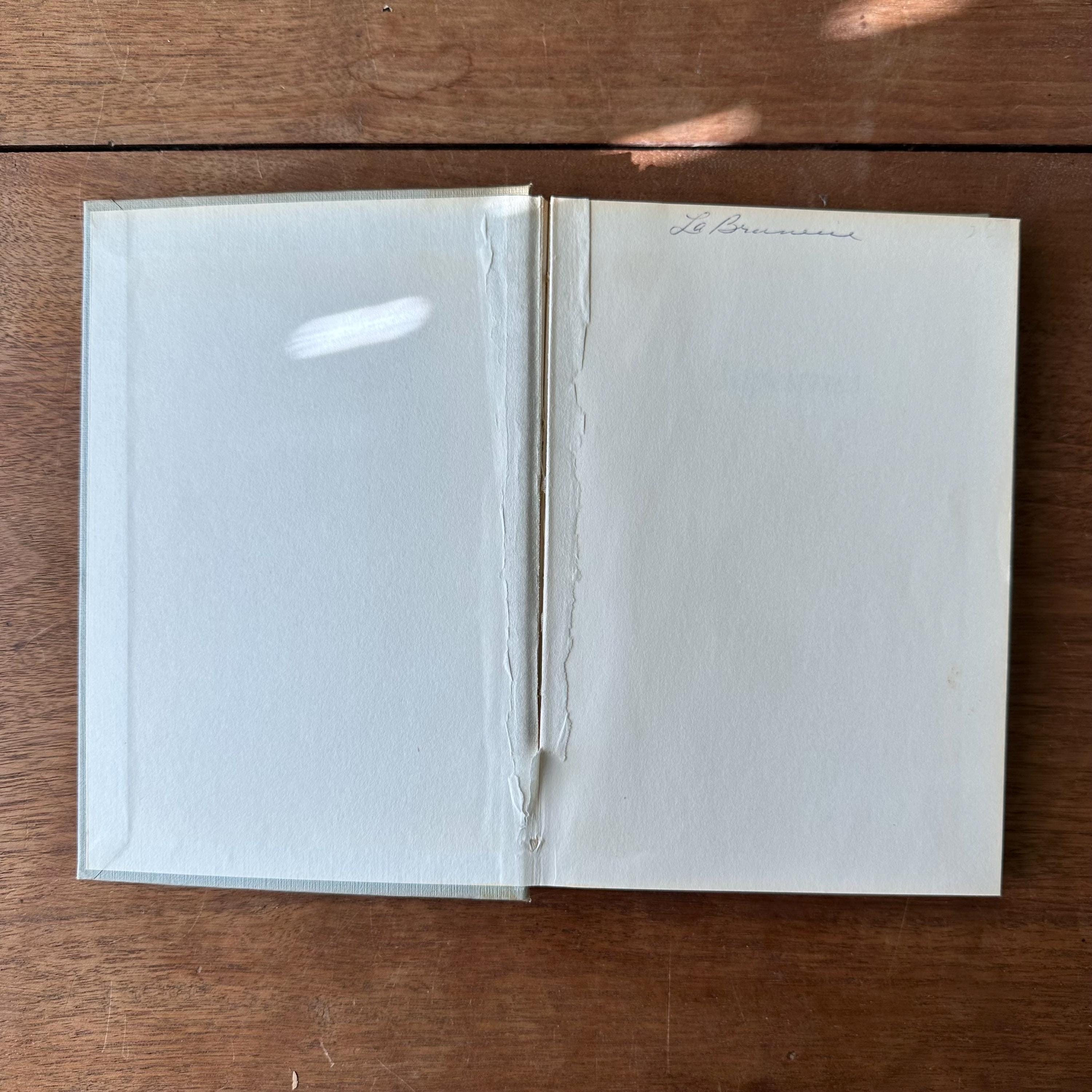 The book is in good vintage condition for its age and use. The covers have general wear with some discoloration to the edges. The front cover has detached at the spine on the inside at the front cover. It is still attached by the webbing and in the very bottom. La Brunerie (?) wrote their name in ink inside the front cover. The page are just starting to yellow. The illustrations are still bright.