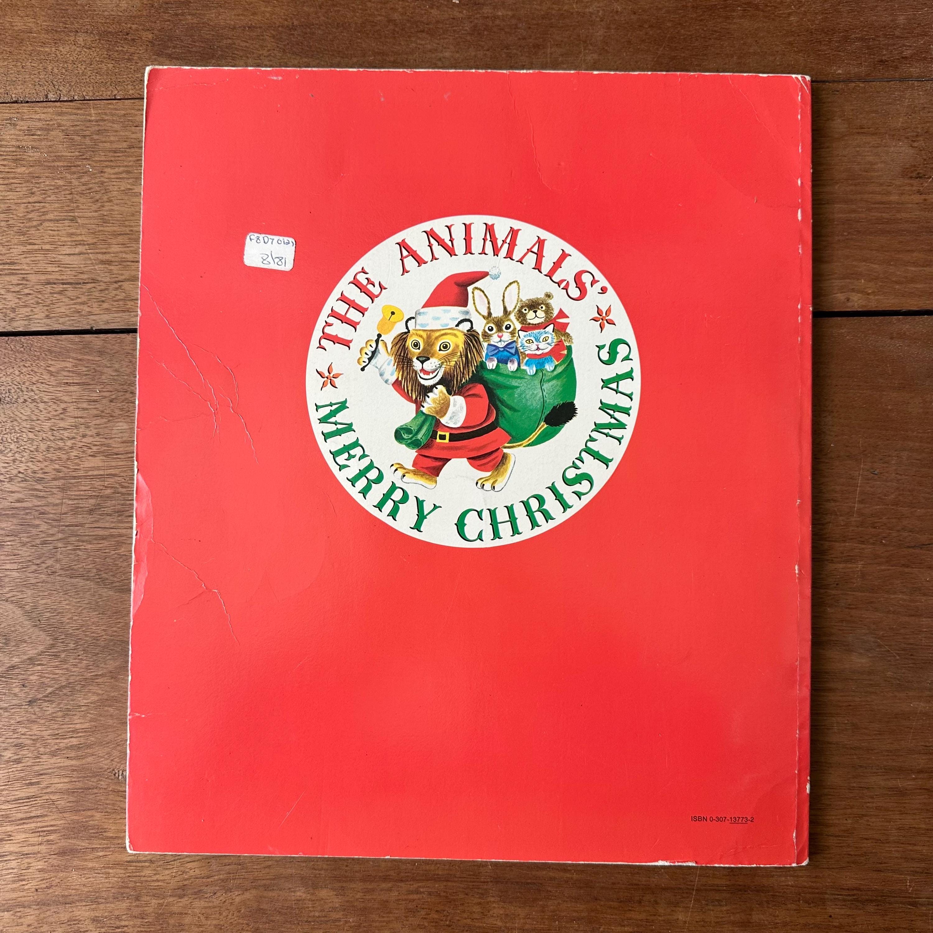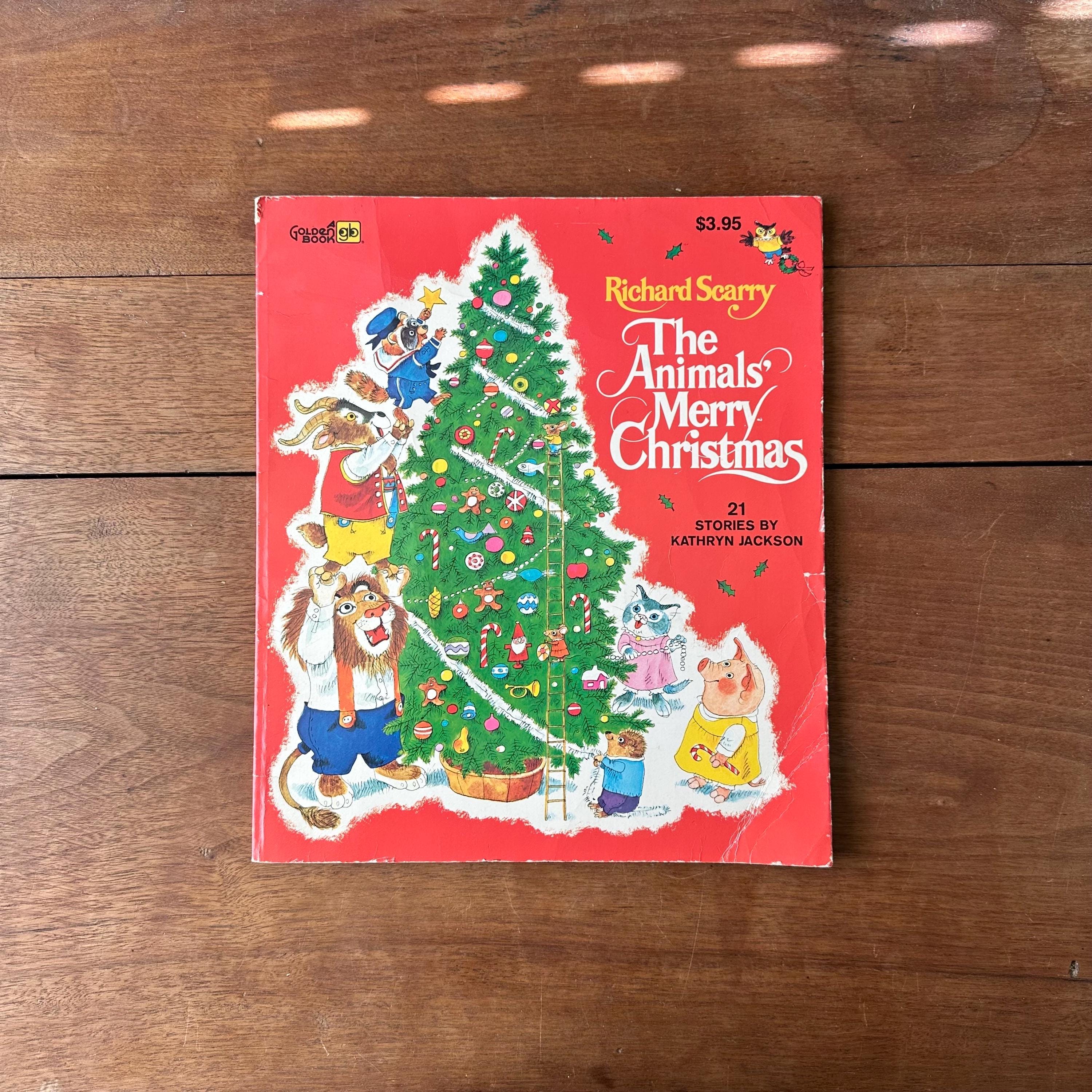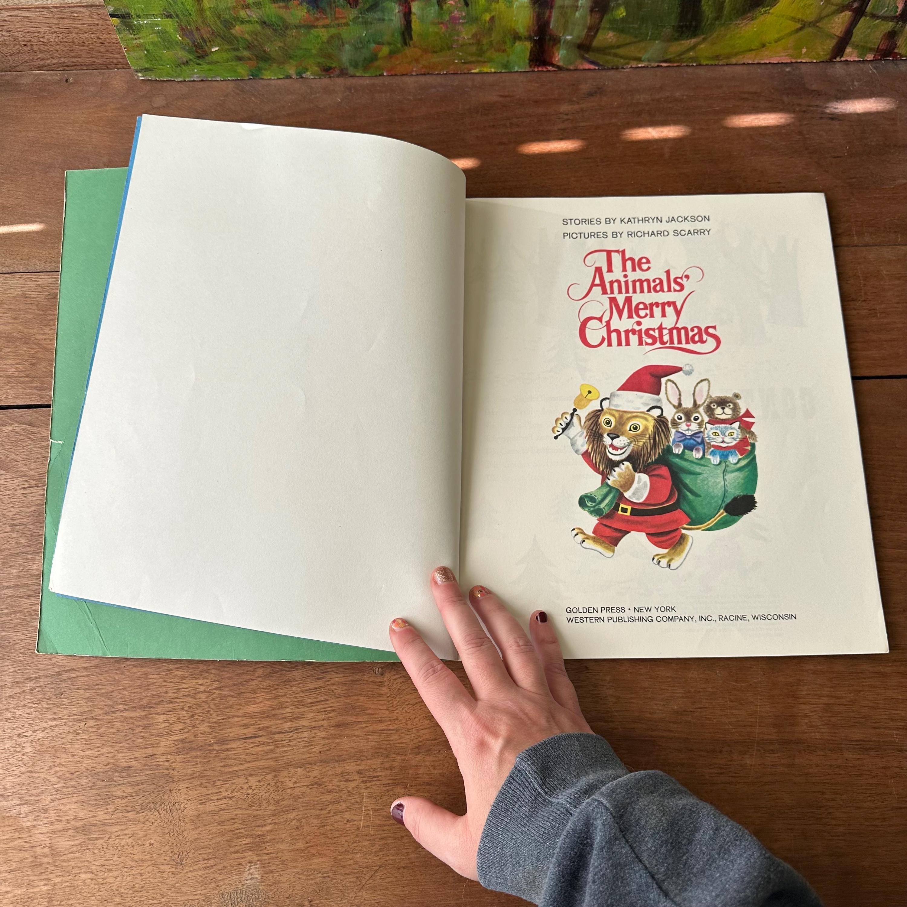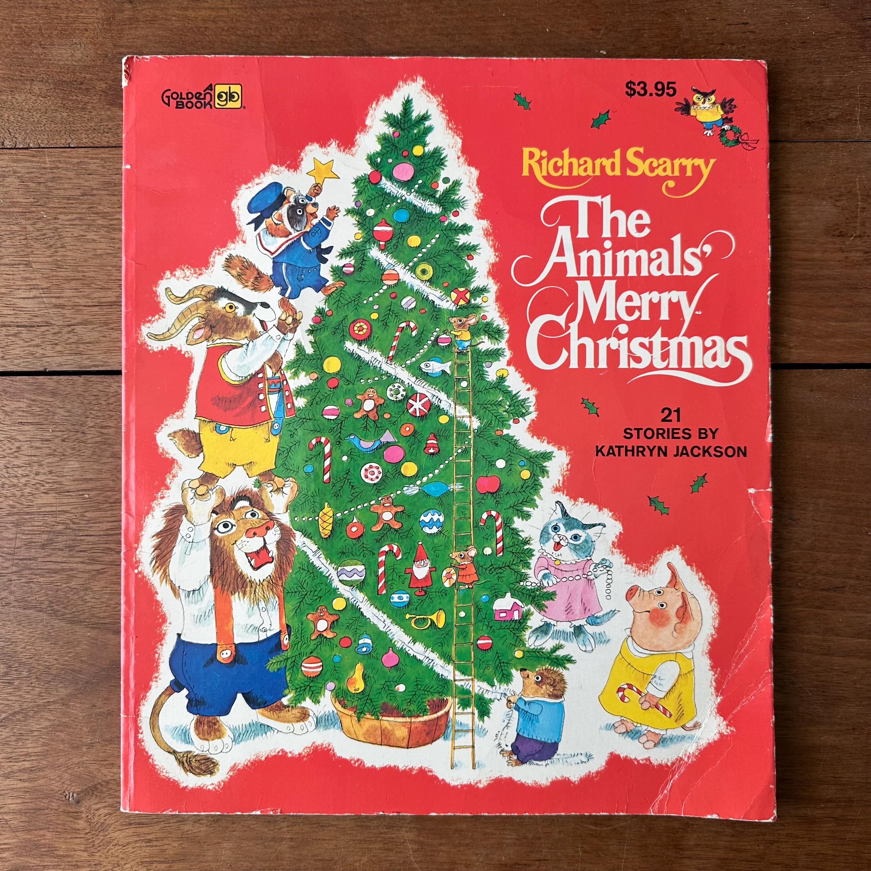 This is the 1972 Golden Book edition of The Animals' Merry Christmas with 21 stories by Kathryn Jackson and illustrated by Richard Scarry. This is the large, paperback edition with a full color cover and Richard Scarry's famous animal characters. There are two sets of endpapers, one plain green and one colorful snowflakes on a blue background. The book is fully illustrated in color and there are 68 pages.