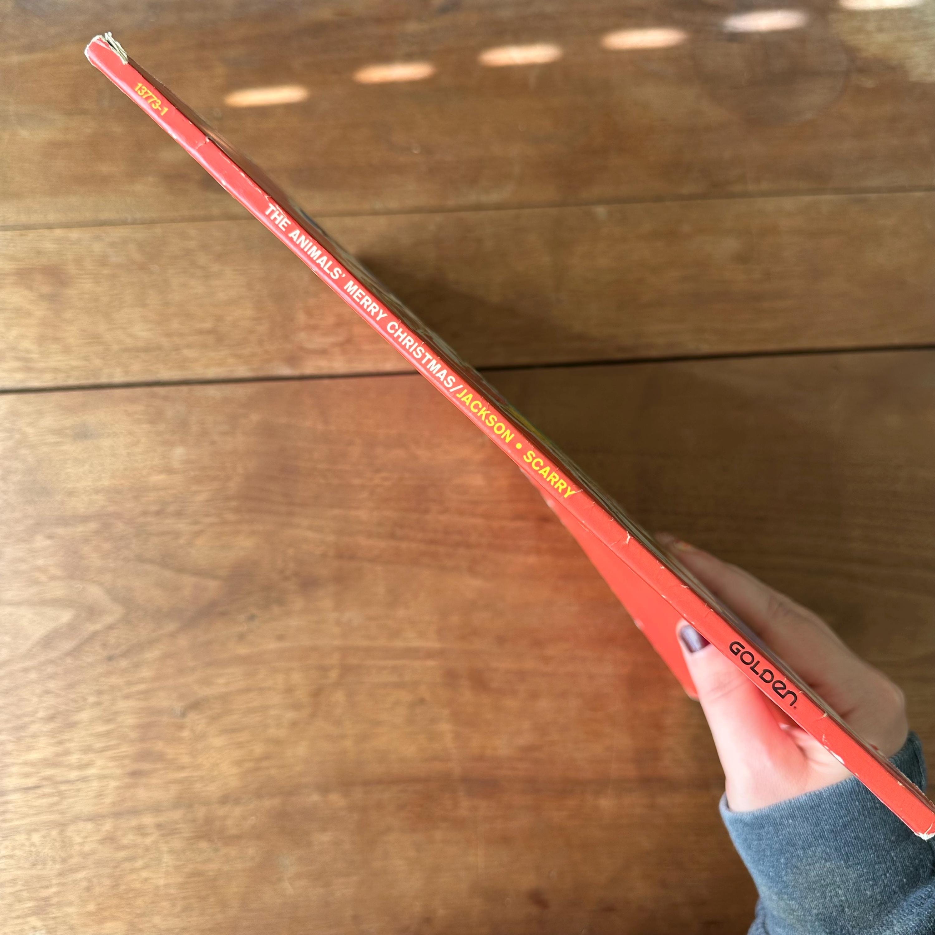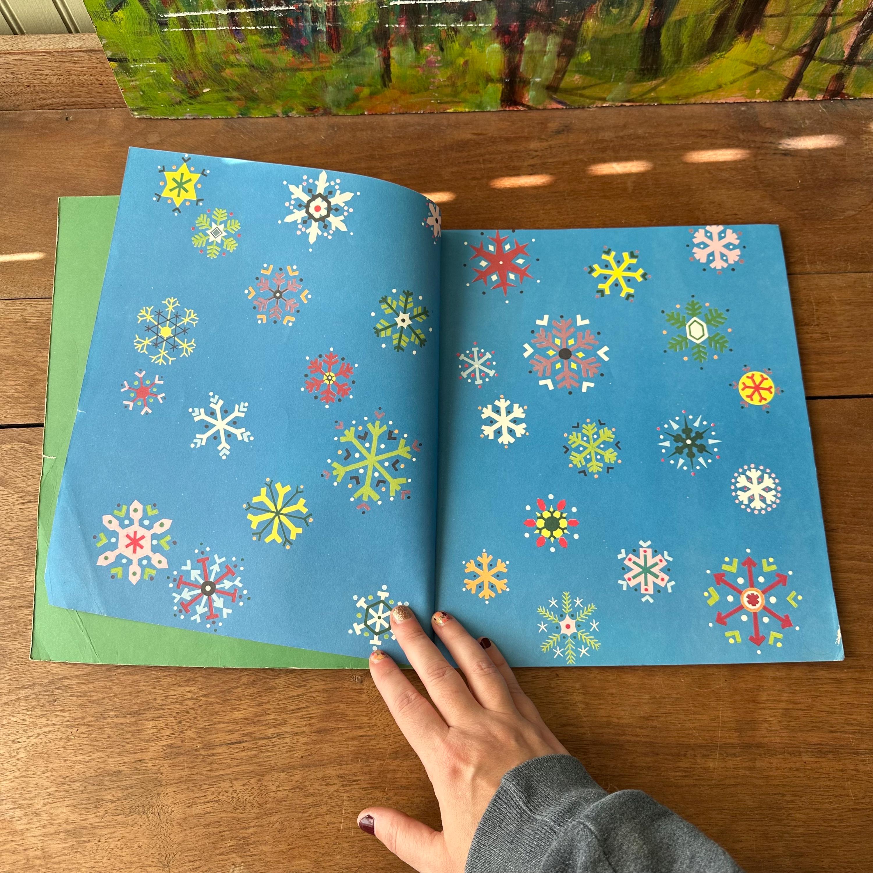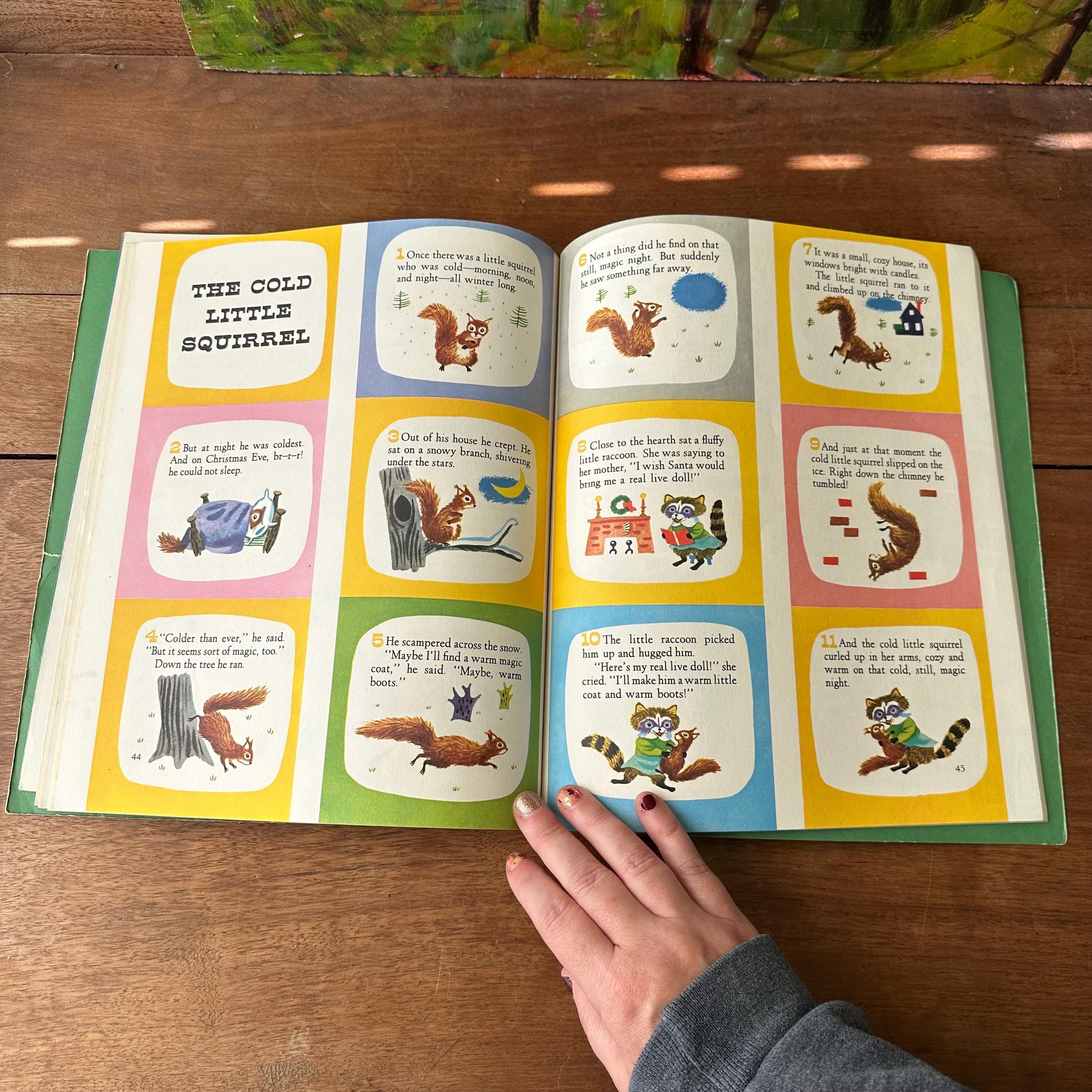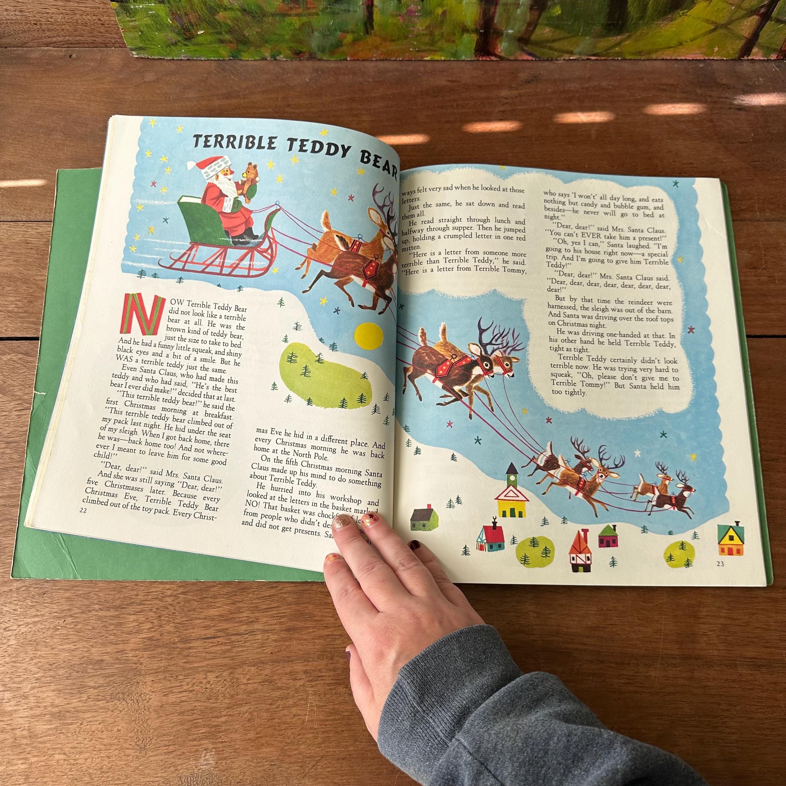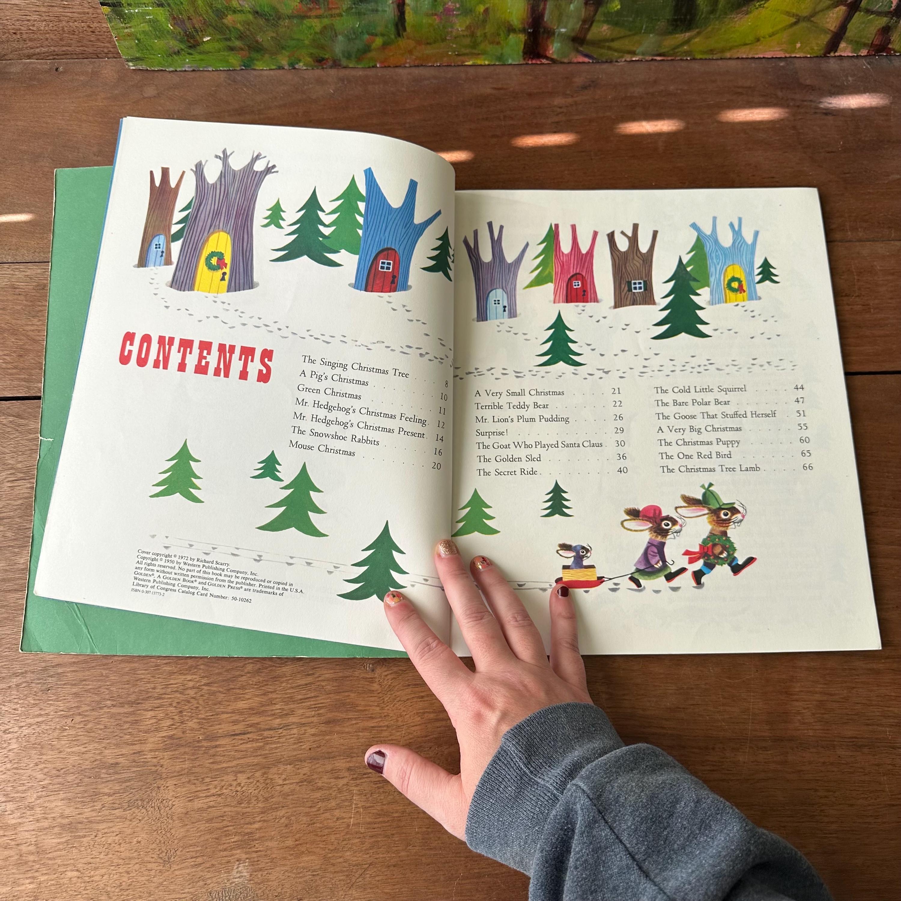 This is the 1972 Golden Book edition of The Animals' Merry Christmas with 21 stories by Kathryn Jackson and illustrated by Richard Scarry. This is the large, paperback edition with a full color cover and Richard Scarry's famous animal characters. There are two sets of endpapers, one plain green and one colorful snowflakes on a blue background. The book is fully illustrated in color and there are 68 pages.