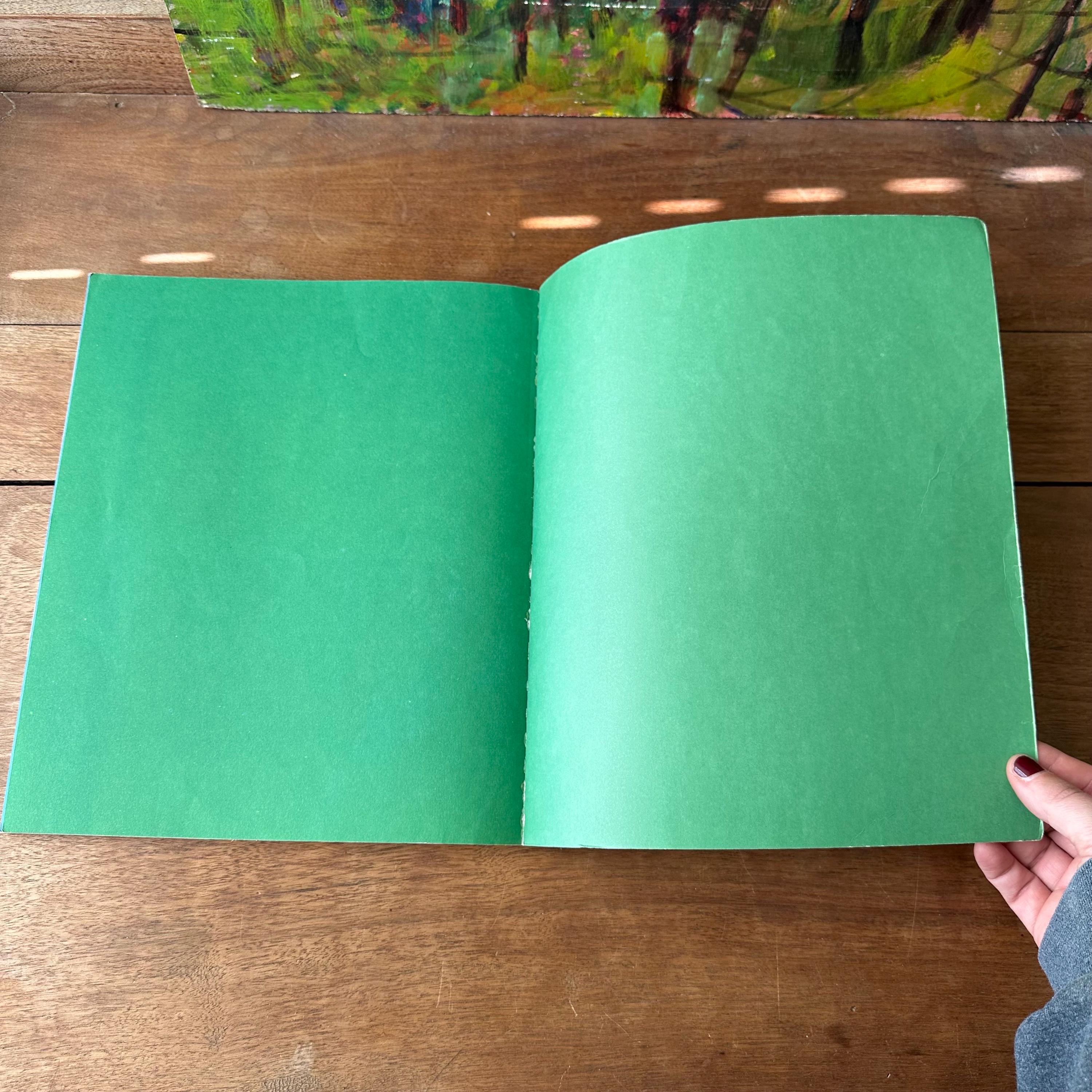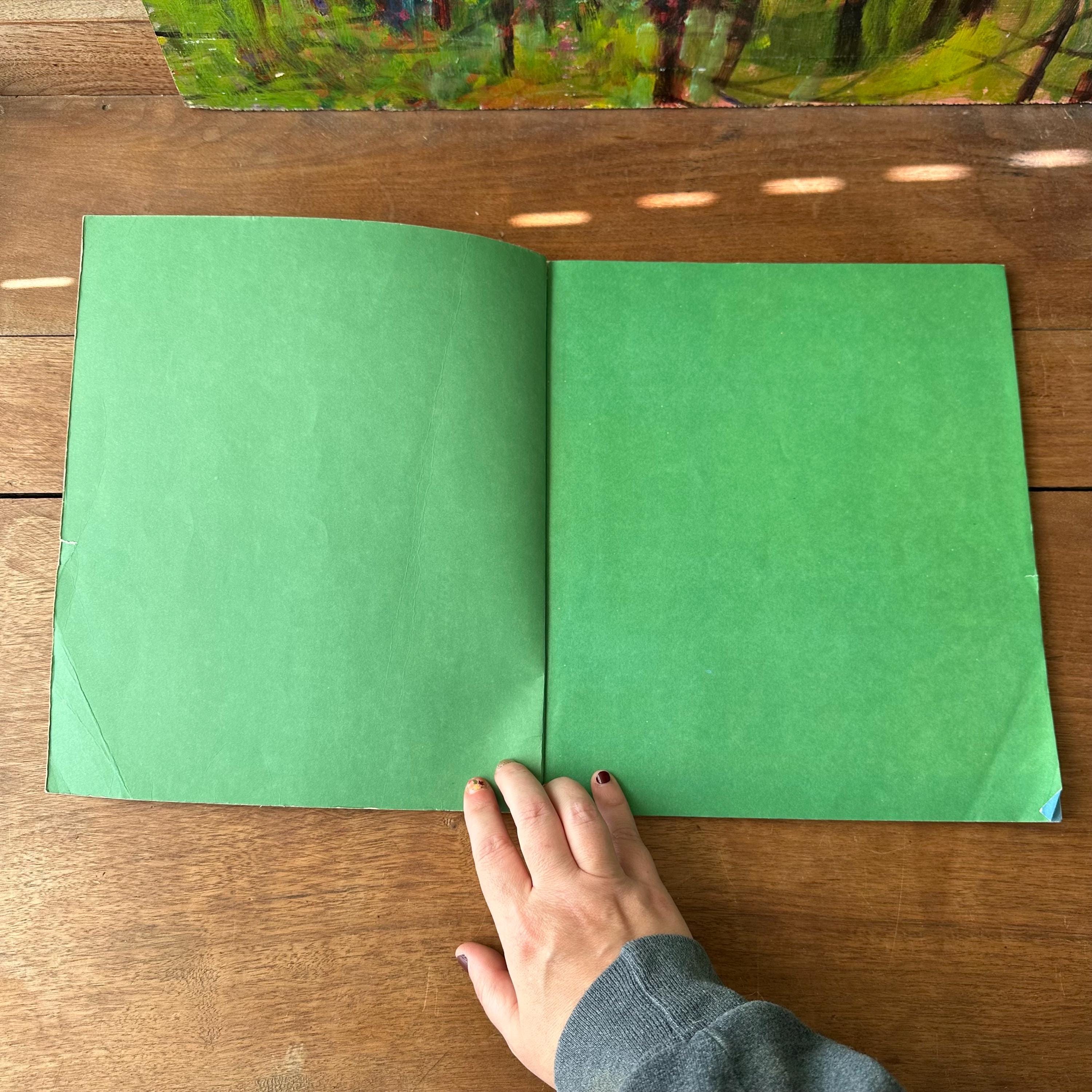 The book is in good vintage condition for its age and use. The cover has a bend to the lower right corner. The cover lays flat but the bend lines are visible. The covers are still attached at the spine at both the inside front and back covers. There is a small label sticker on the back cover with a series of numbers. The pages have minimal to no yellowing and the colors are still bright.