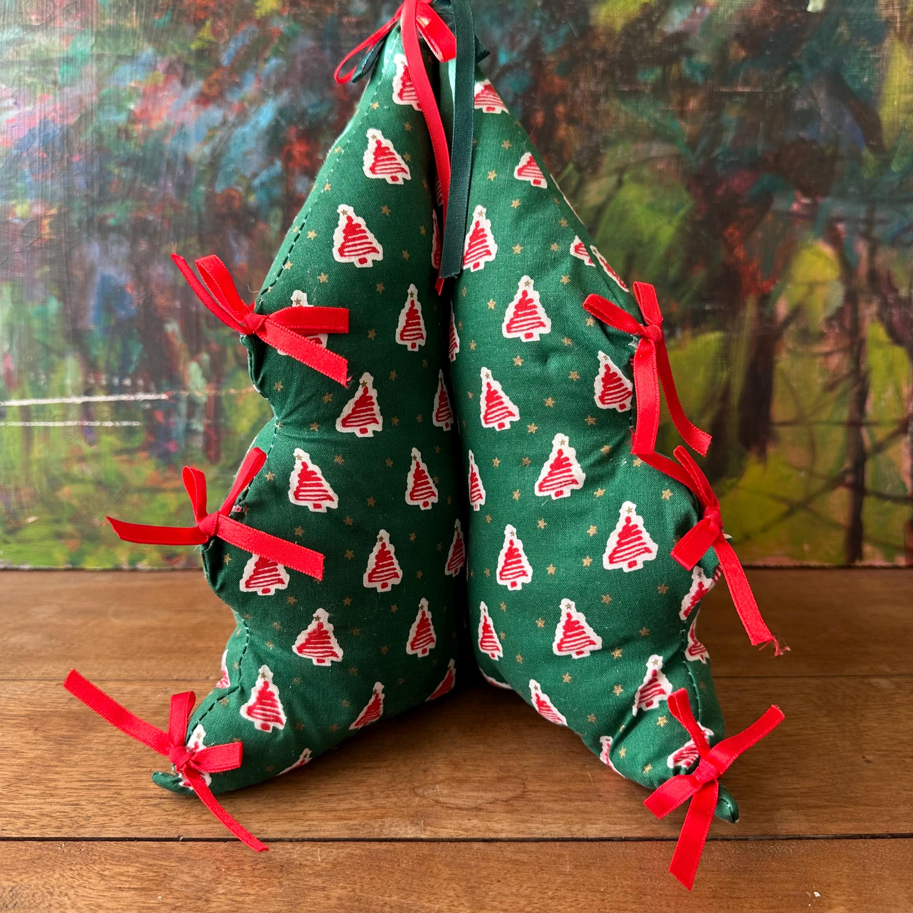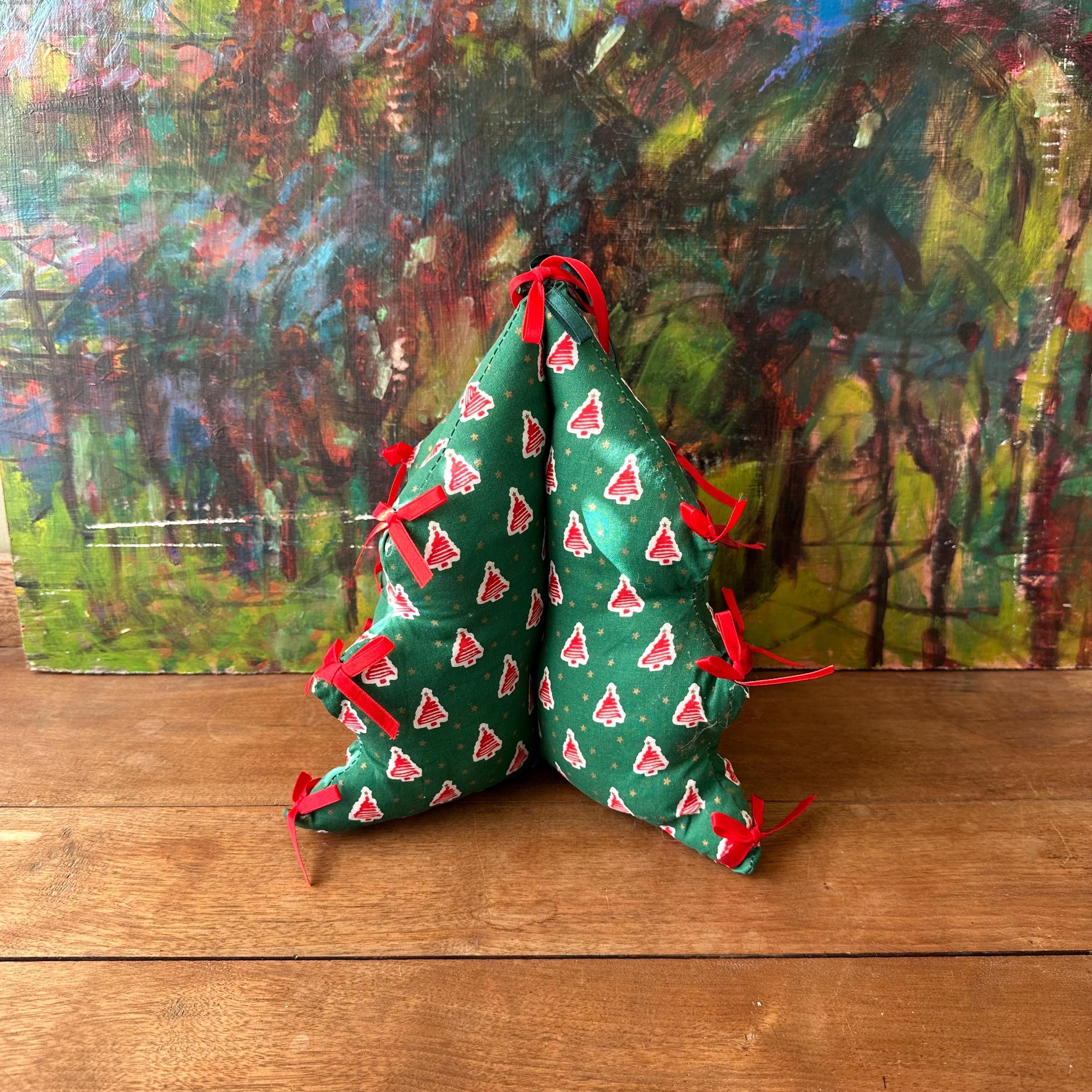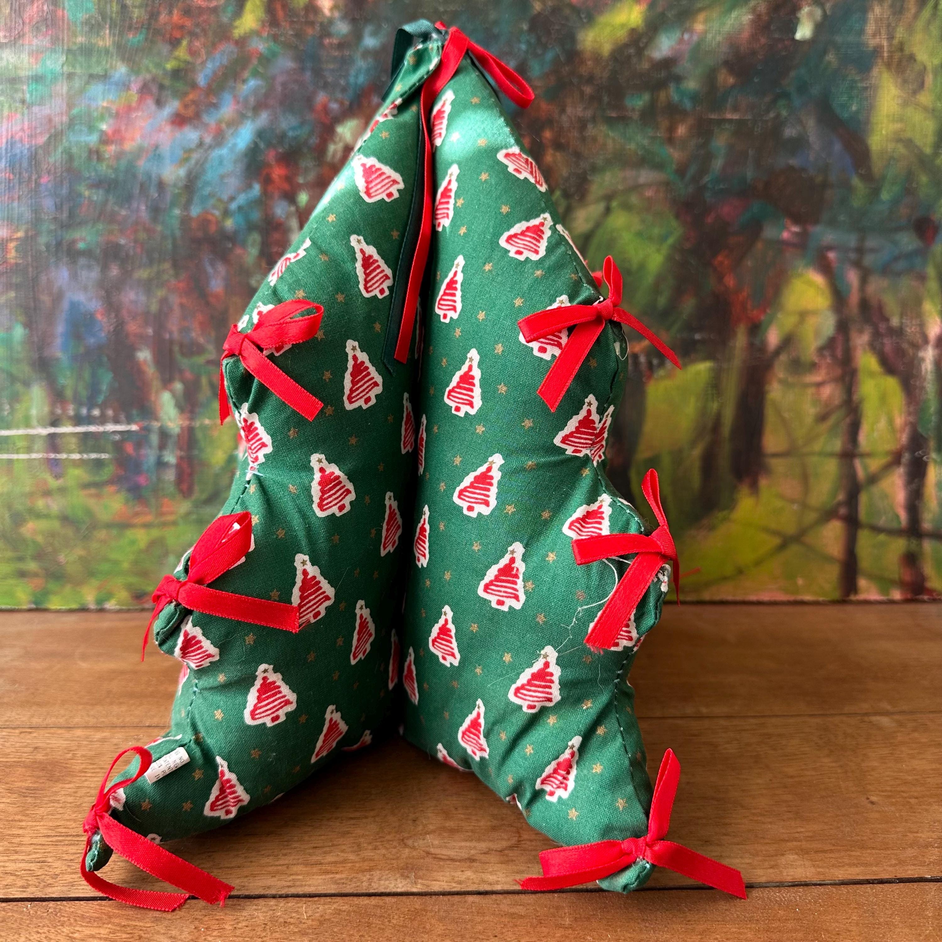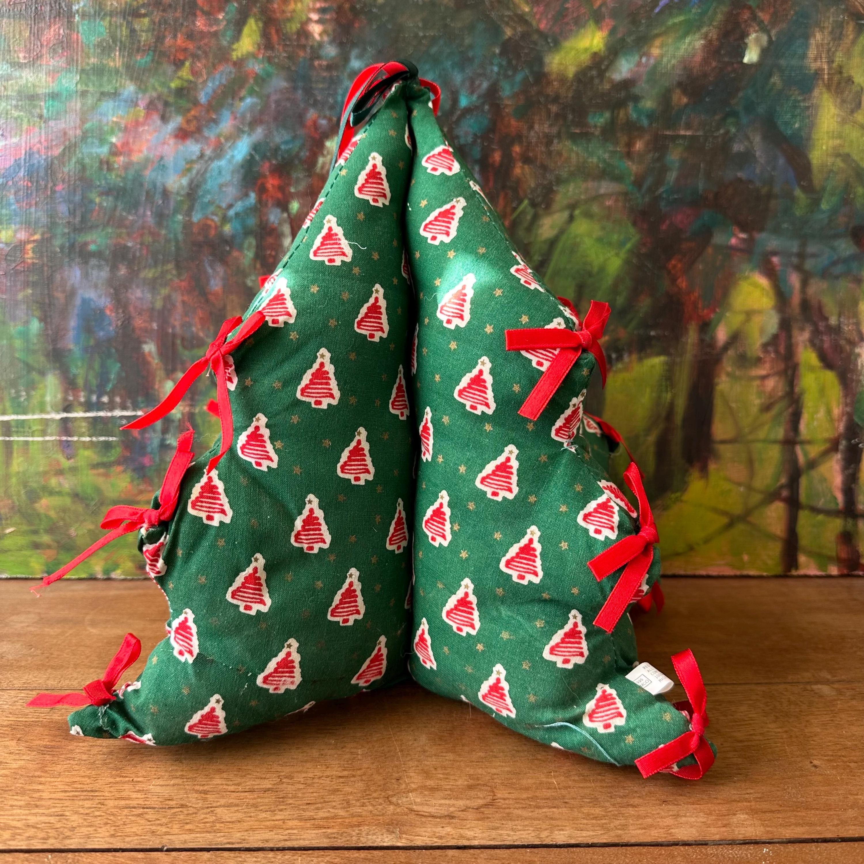This is a fabric stuffed Christmas tree from 1995. The tree is a pine green cotton fabric with red squiggle trees on a white background all-over print. There are also small gold stars all over. The tree has three points on each side with a red bow on each point. The top also has a red bow and a green bow. There are four sides to the tree.