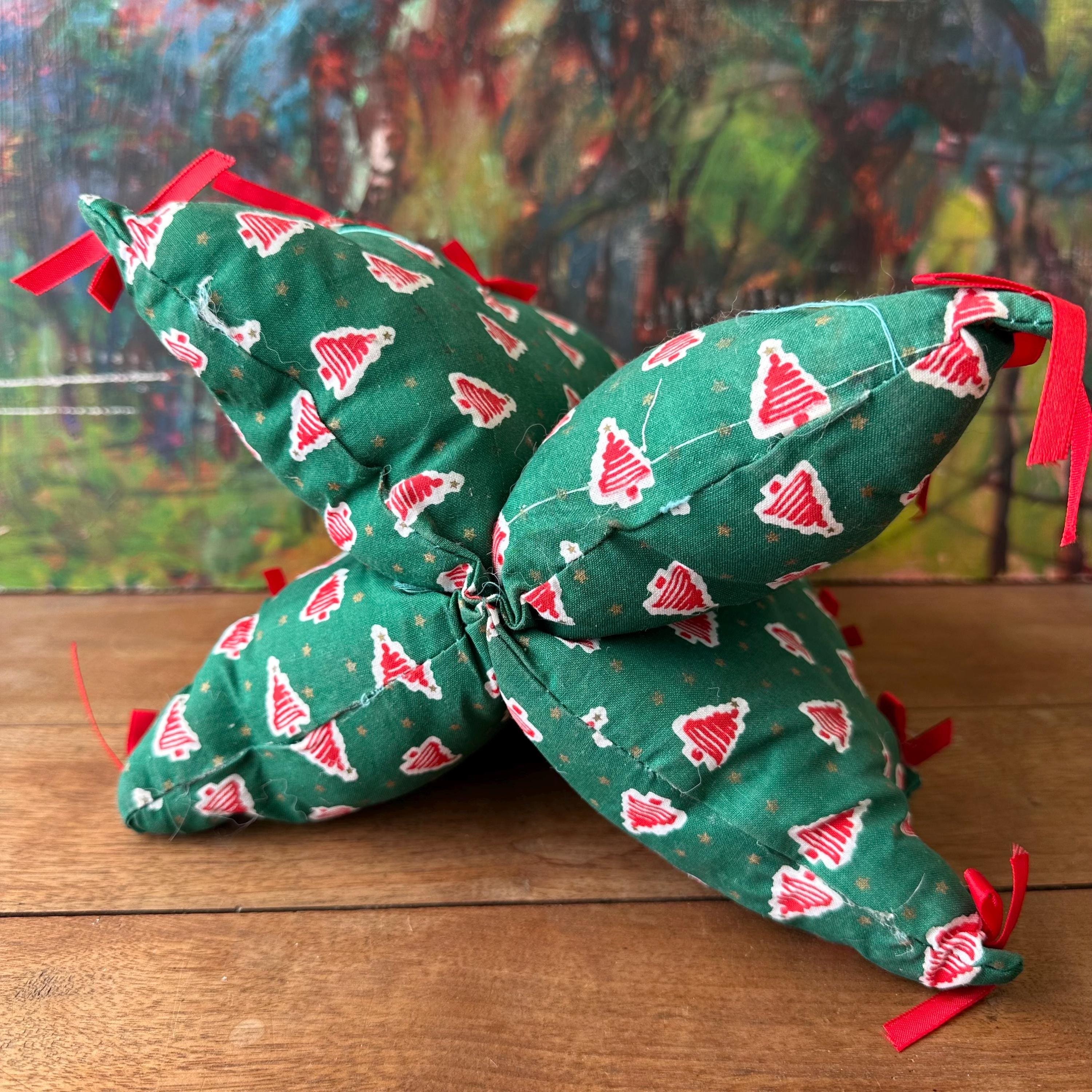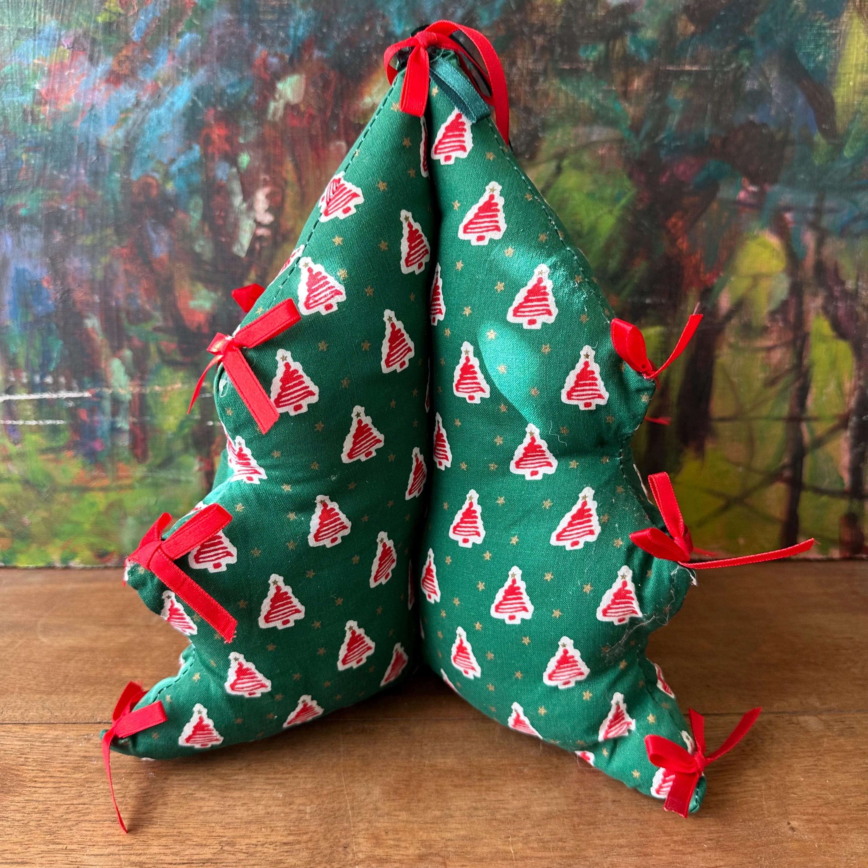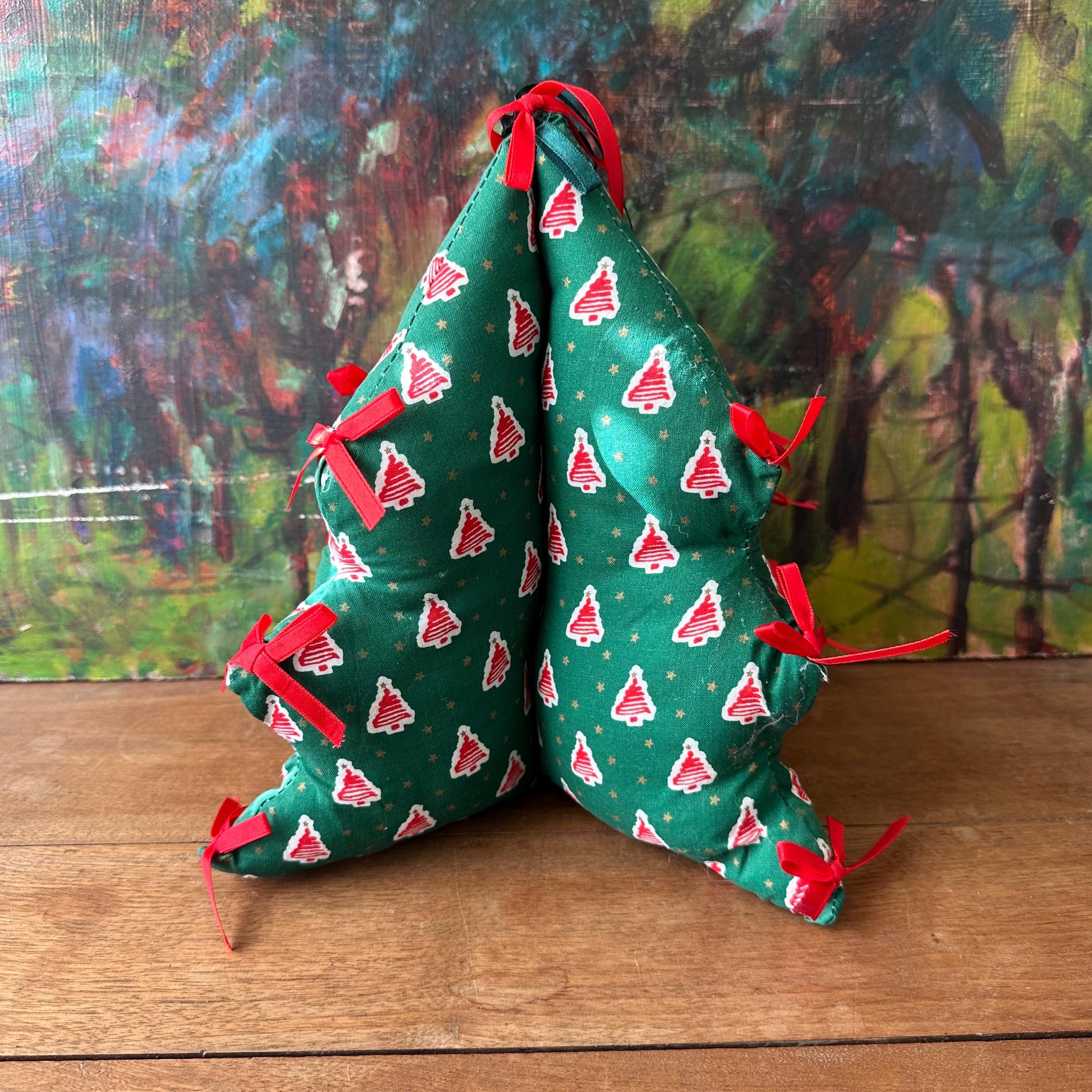 This is a fabric stuffed Christmas tree from 1995. The tree is a pine green cotton fabric with red squiggle trees on a white background all-over print. There are also small gold stars all over. The tree has three points on each side with a red bow on each point. The top also has a red bow and a green bow. There are four sides to the tree.