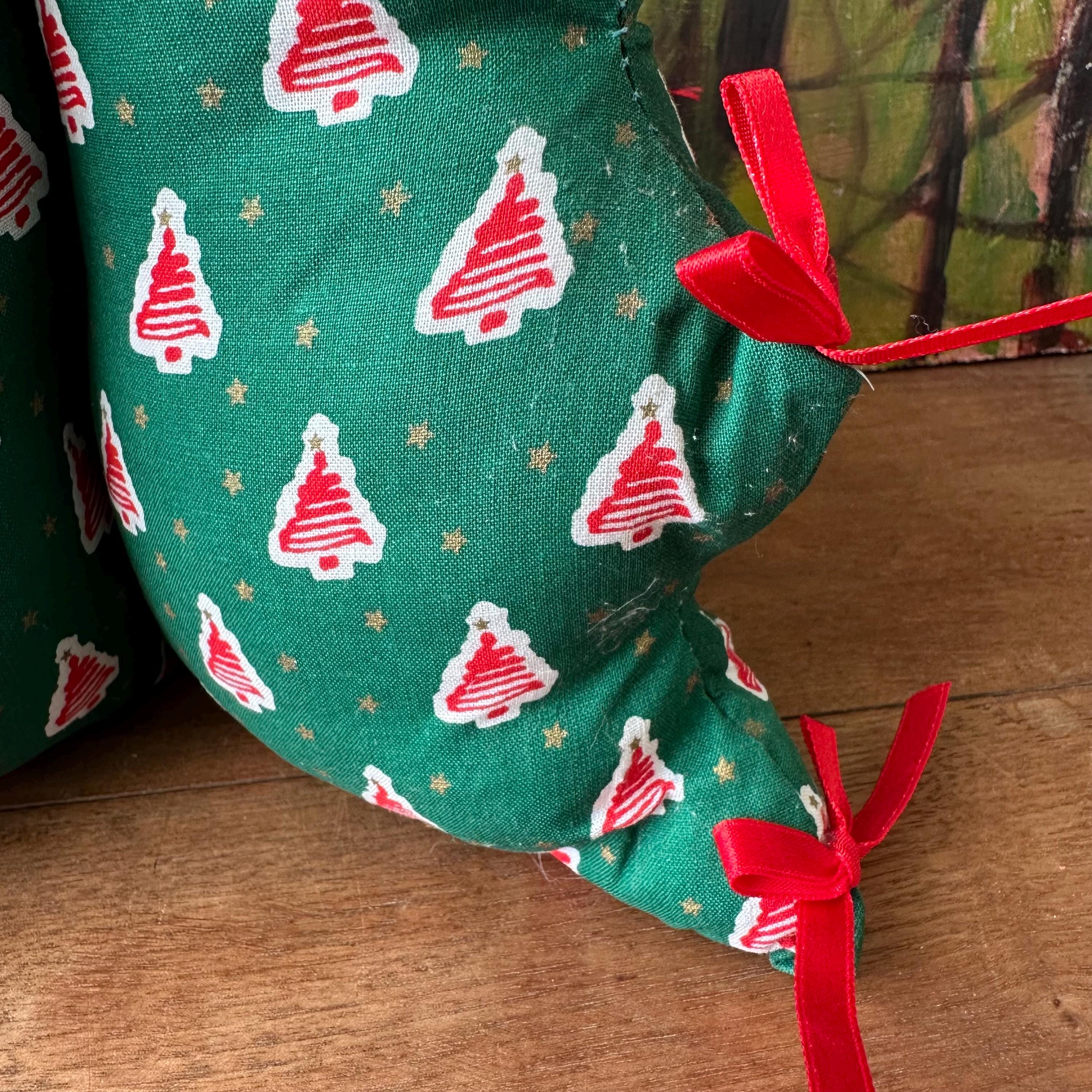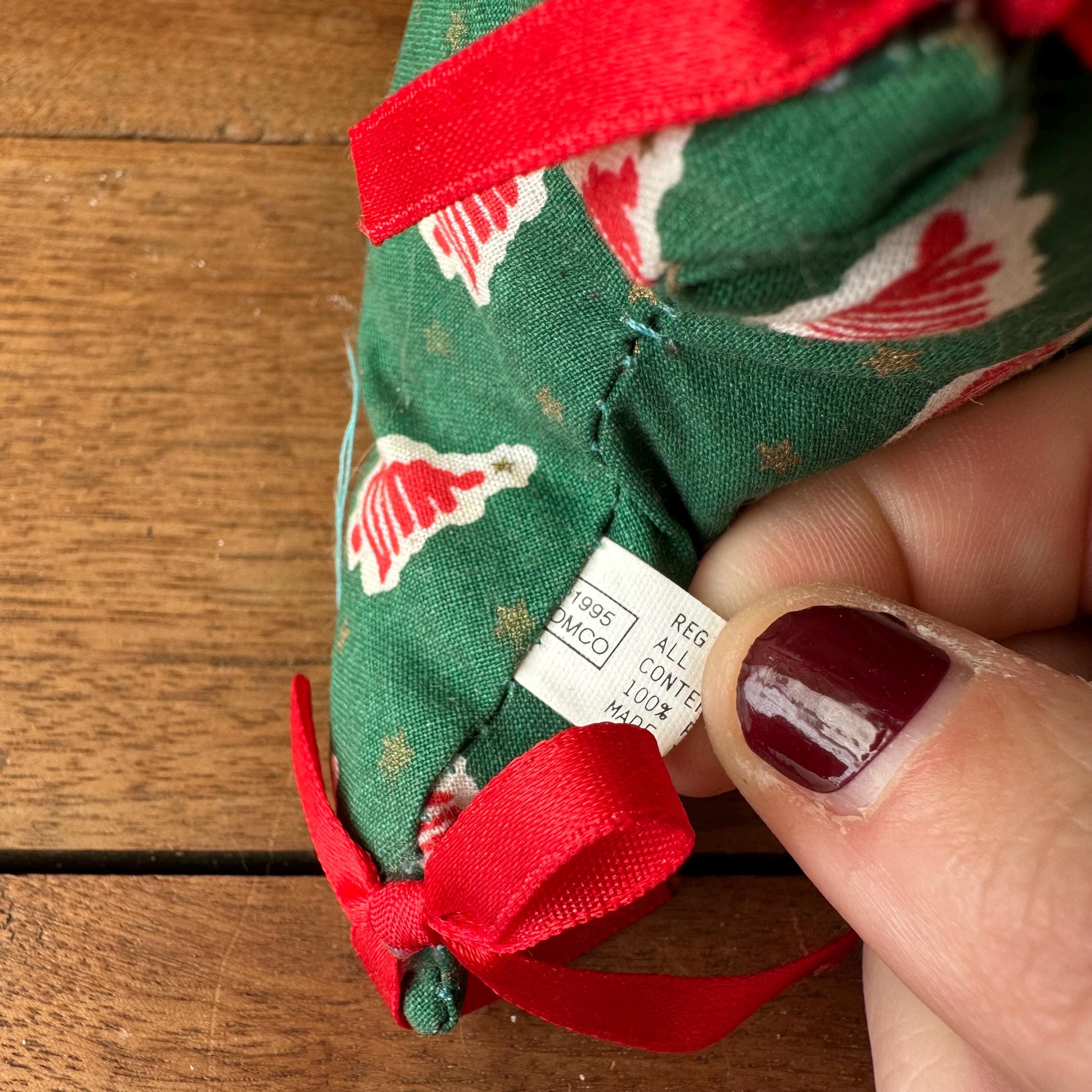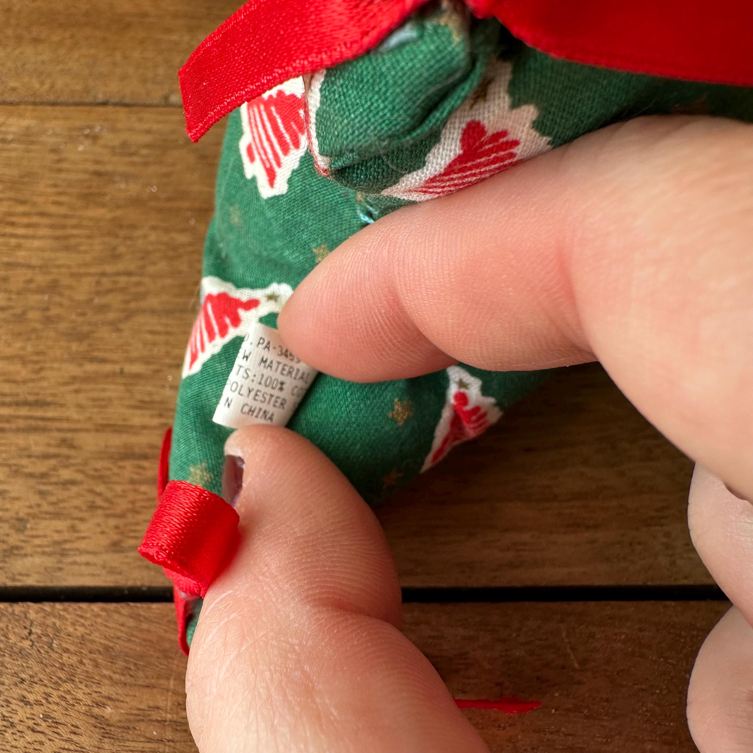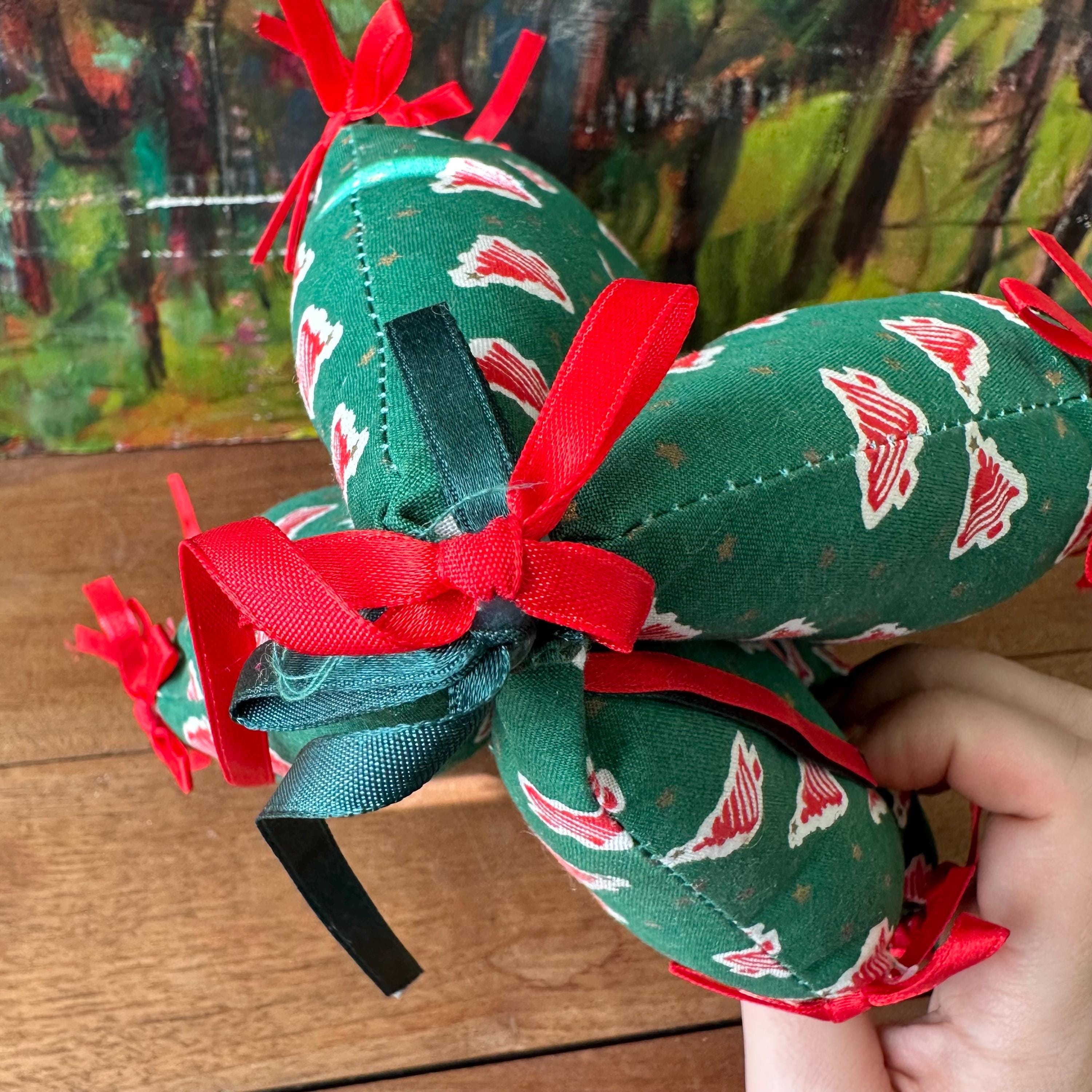 This is a fabric stuffed Christmas tree from 1995. The tree is a pine green cotton fabric with red squiggle trees on a white background all-over print. There are also small gold stars all over. The tree has three points on each side with a red bow on each point. The top also has a red bow and a green bow. There are four sides to the tree.