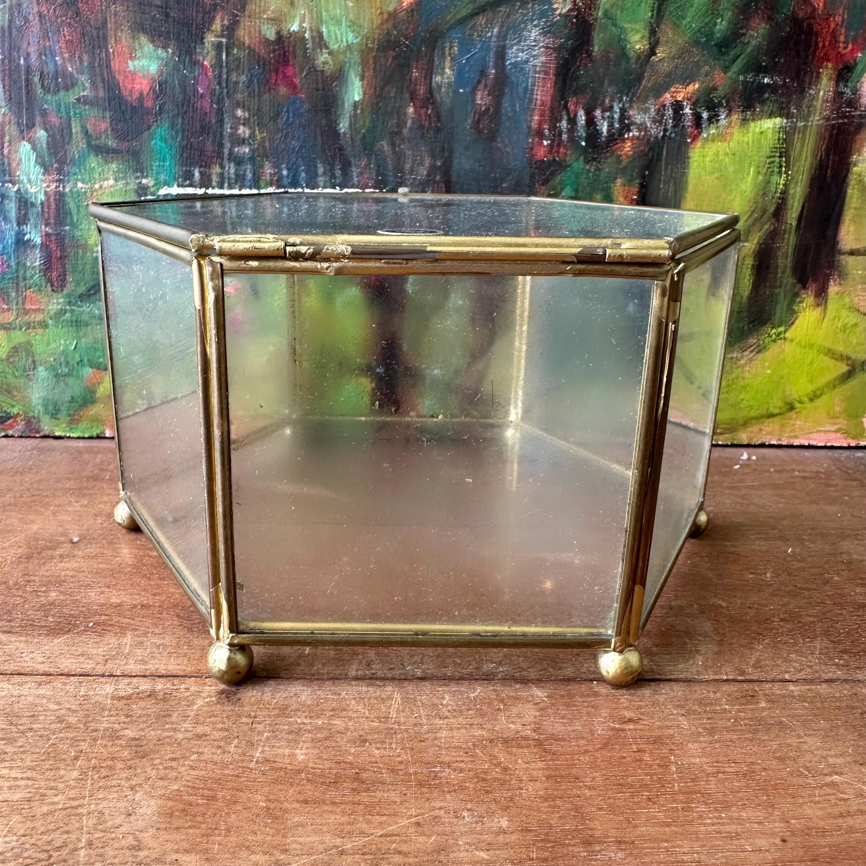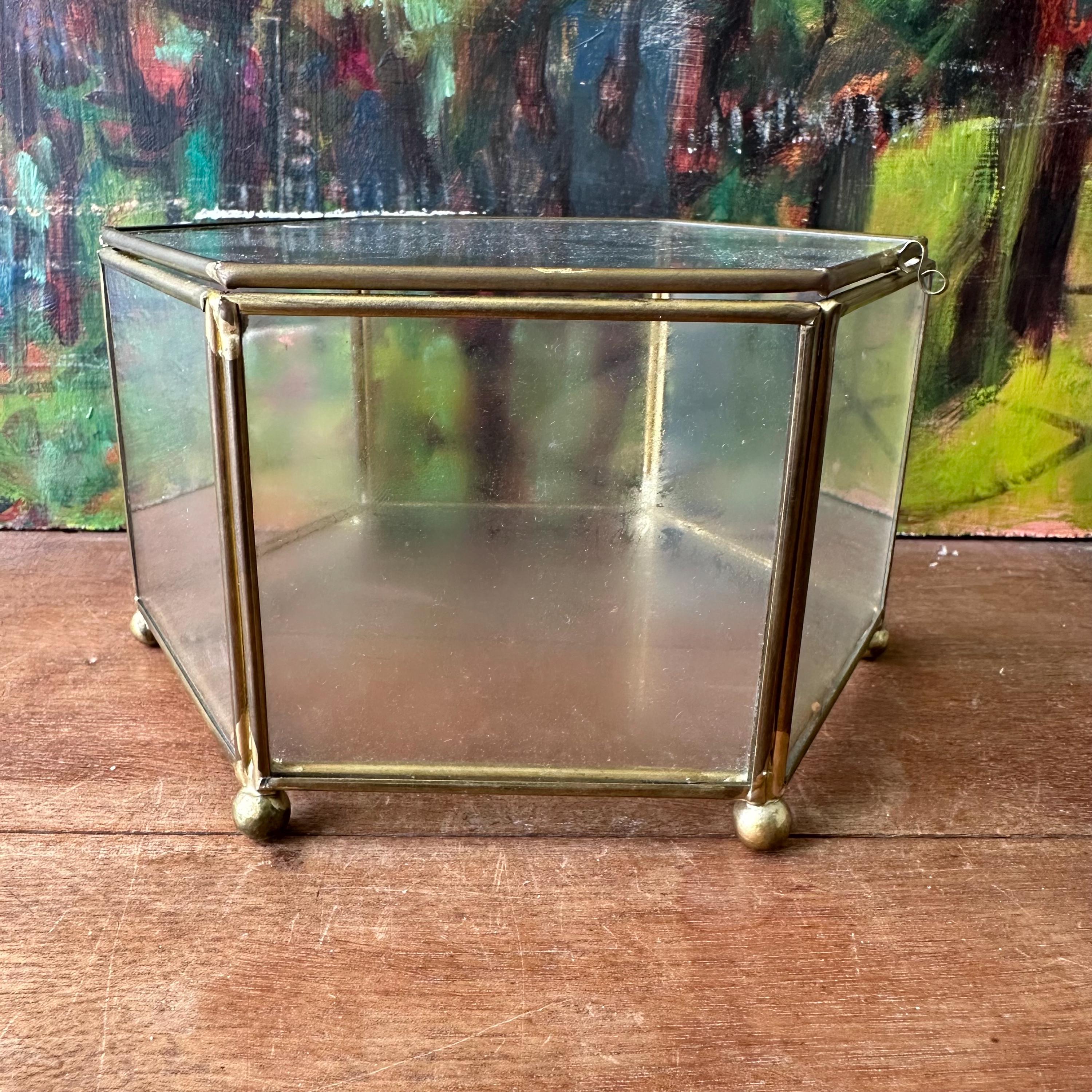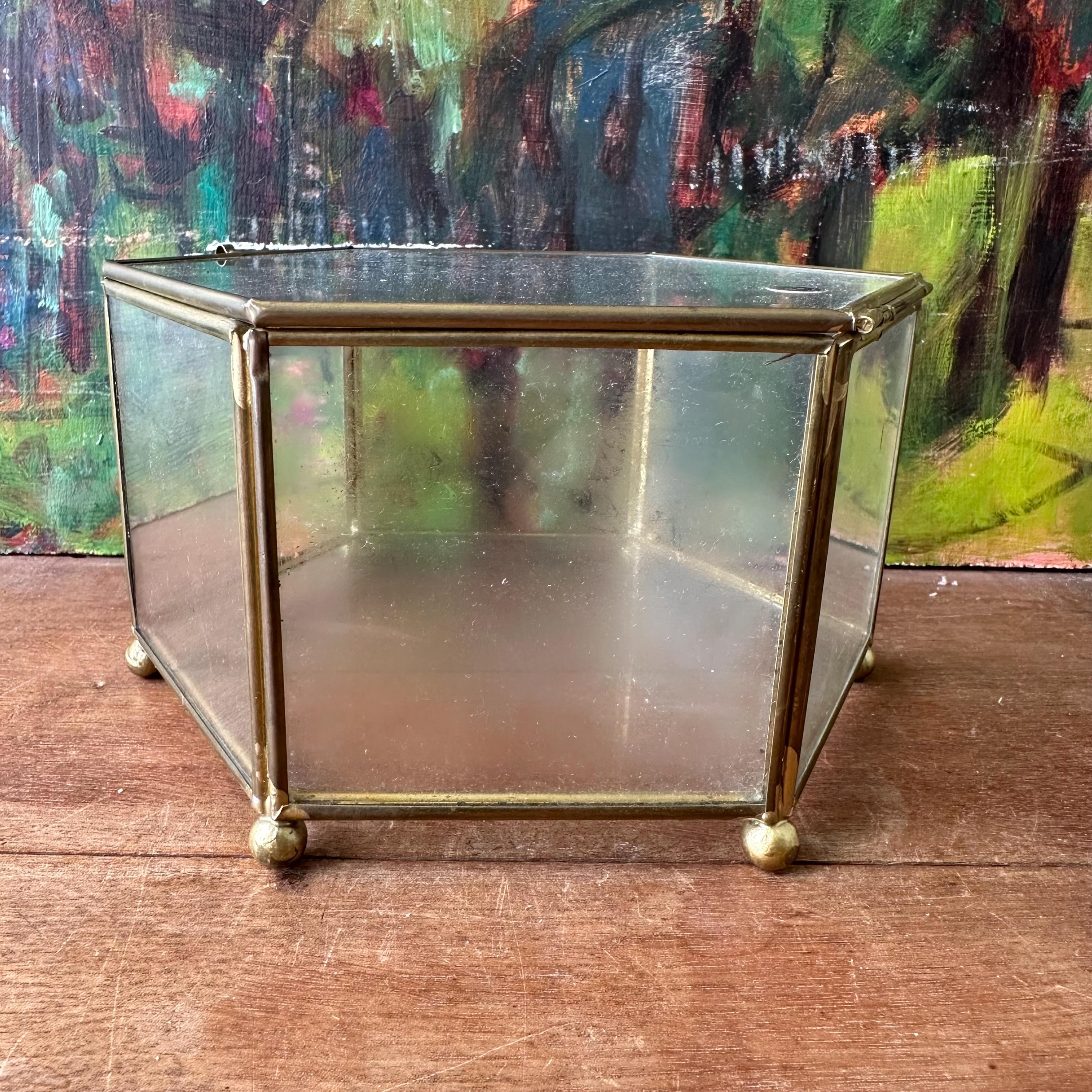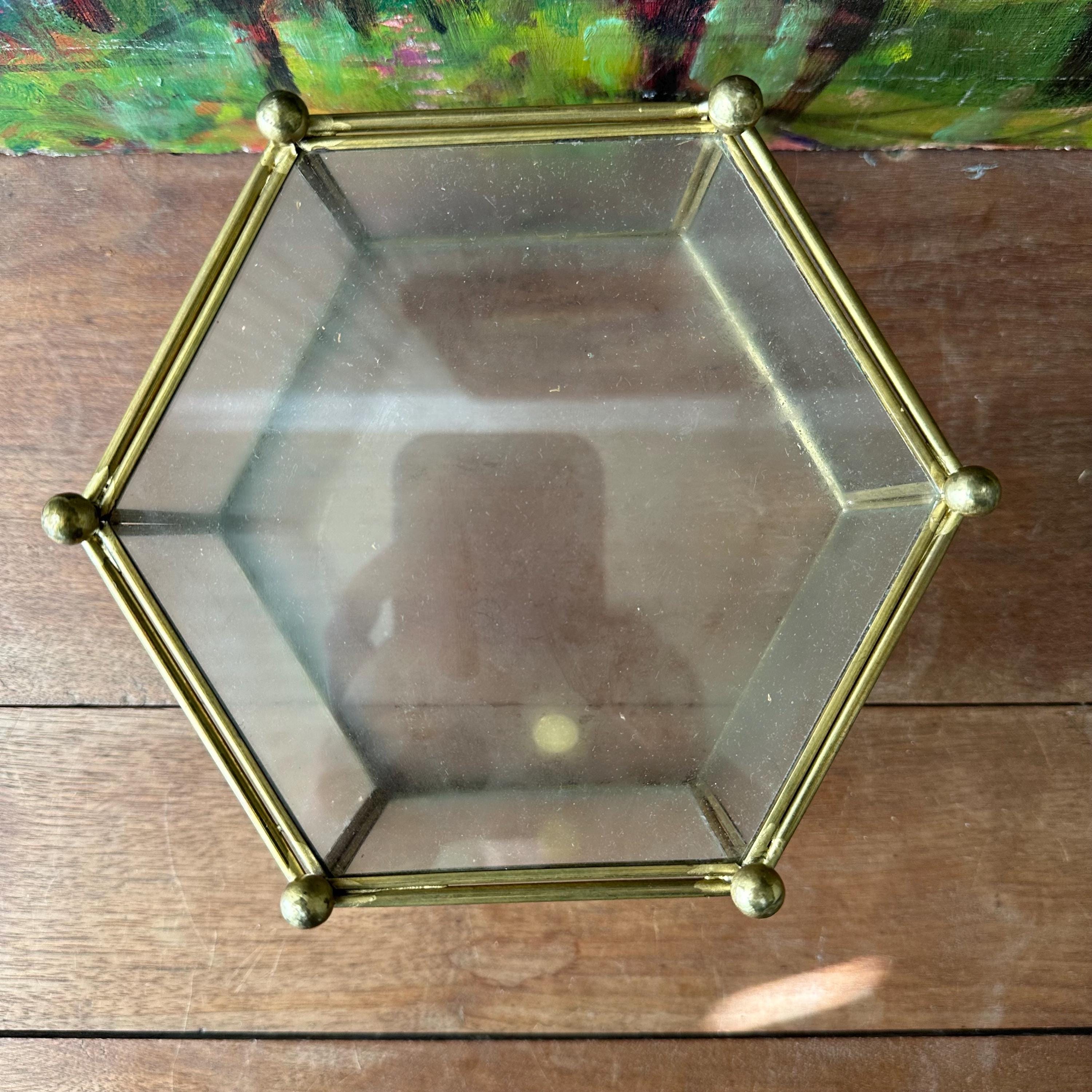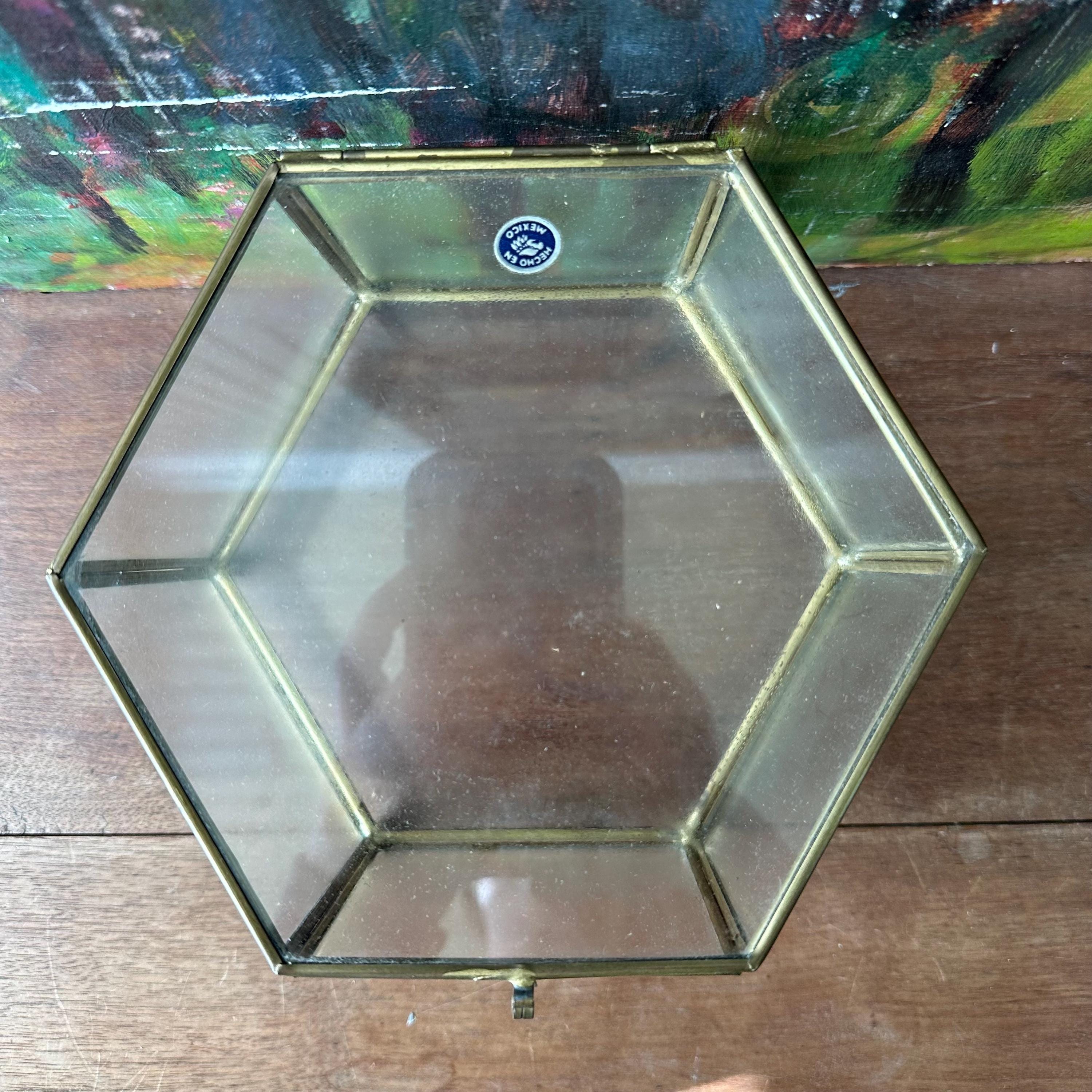 This is a hexagon-shaped glass and brass display box. The box has a hinged lid with a figure eight latch opening. The lid, bottom, and sides of the box are clear glass with edging in brass. The box has six brass ball feet. There is a Hecho en Mexico sticker on the top. This would make for a nice shadow box or display case.