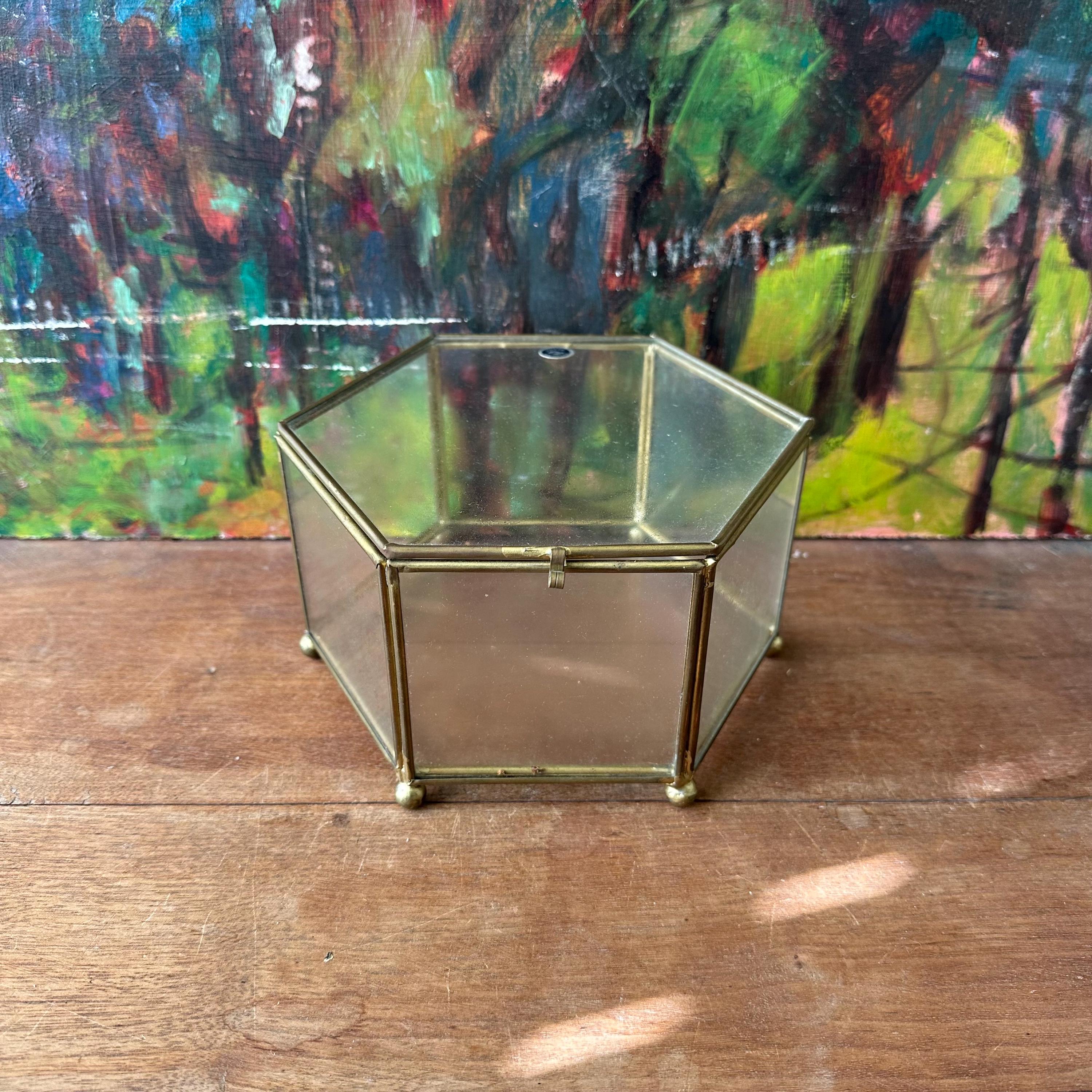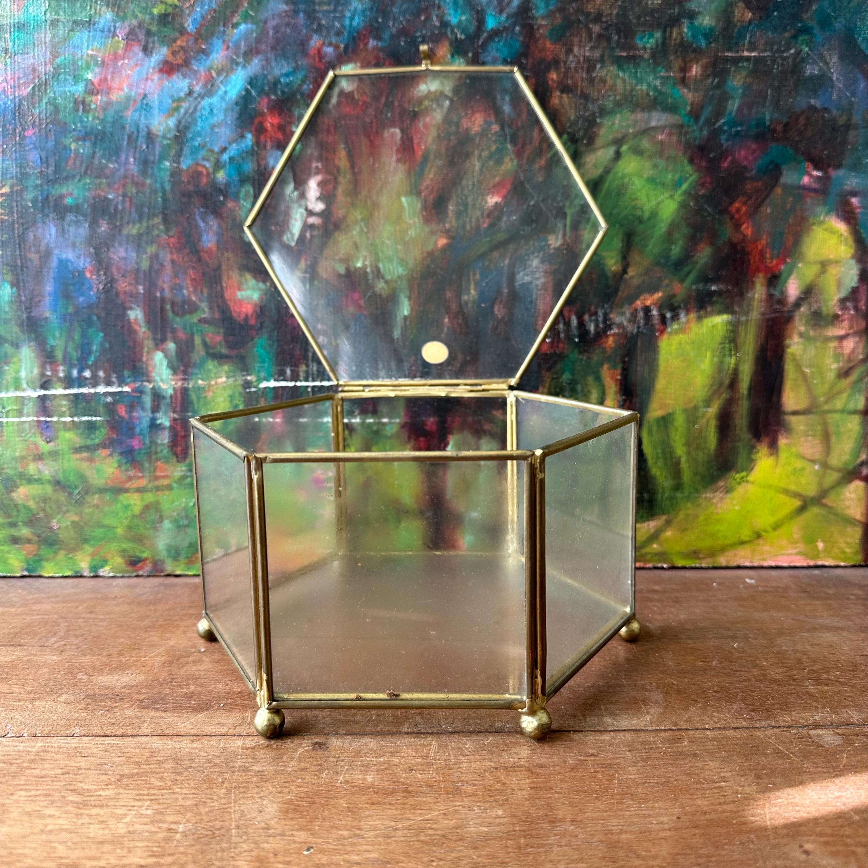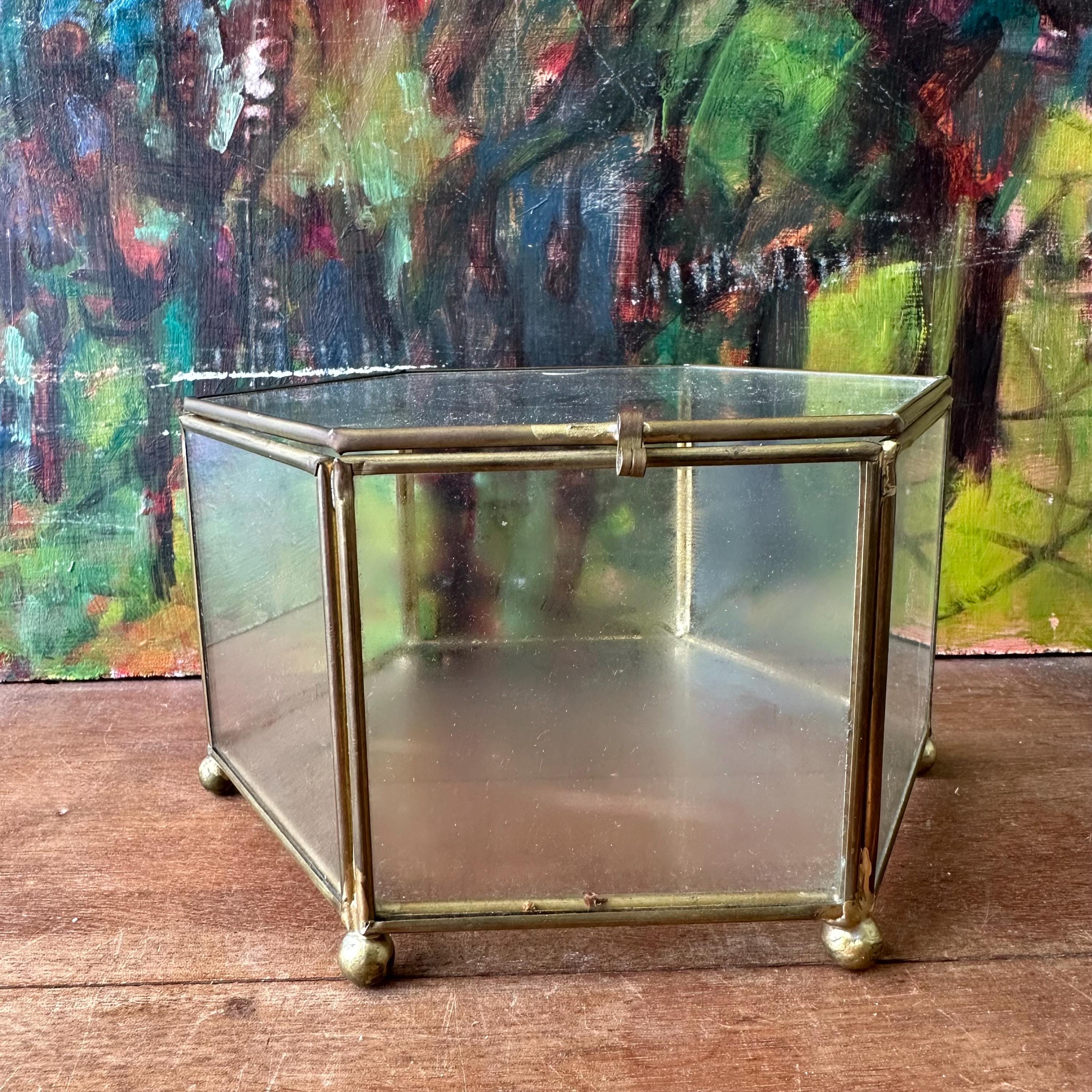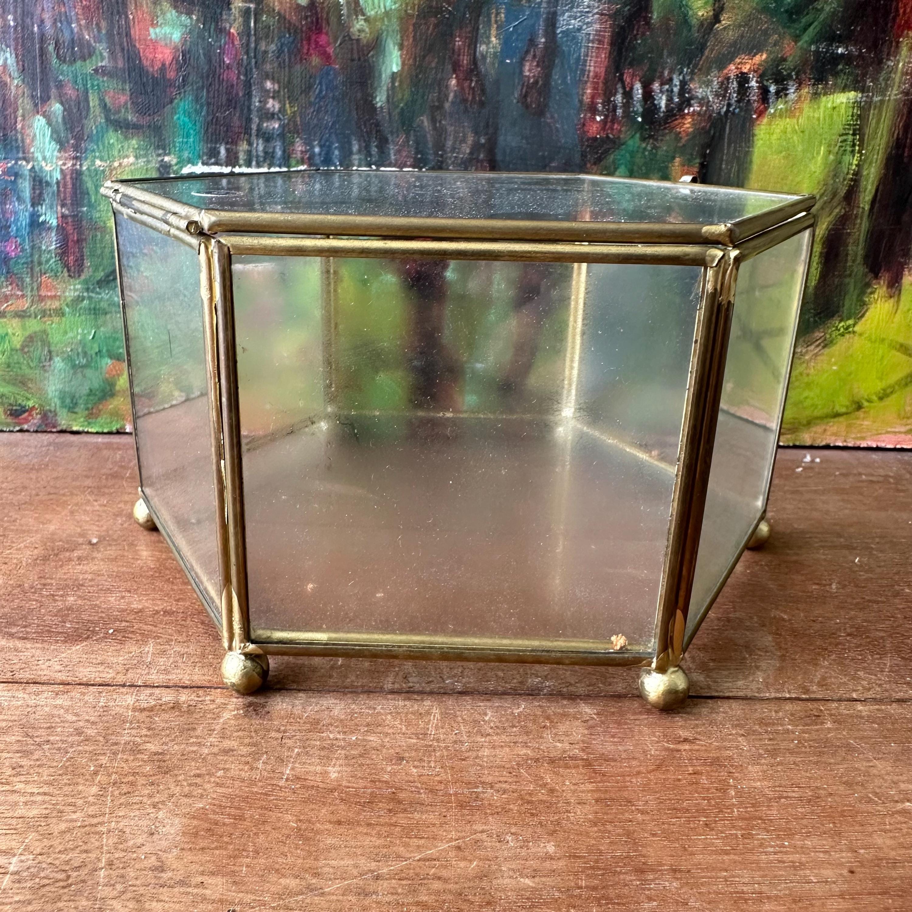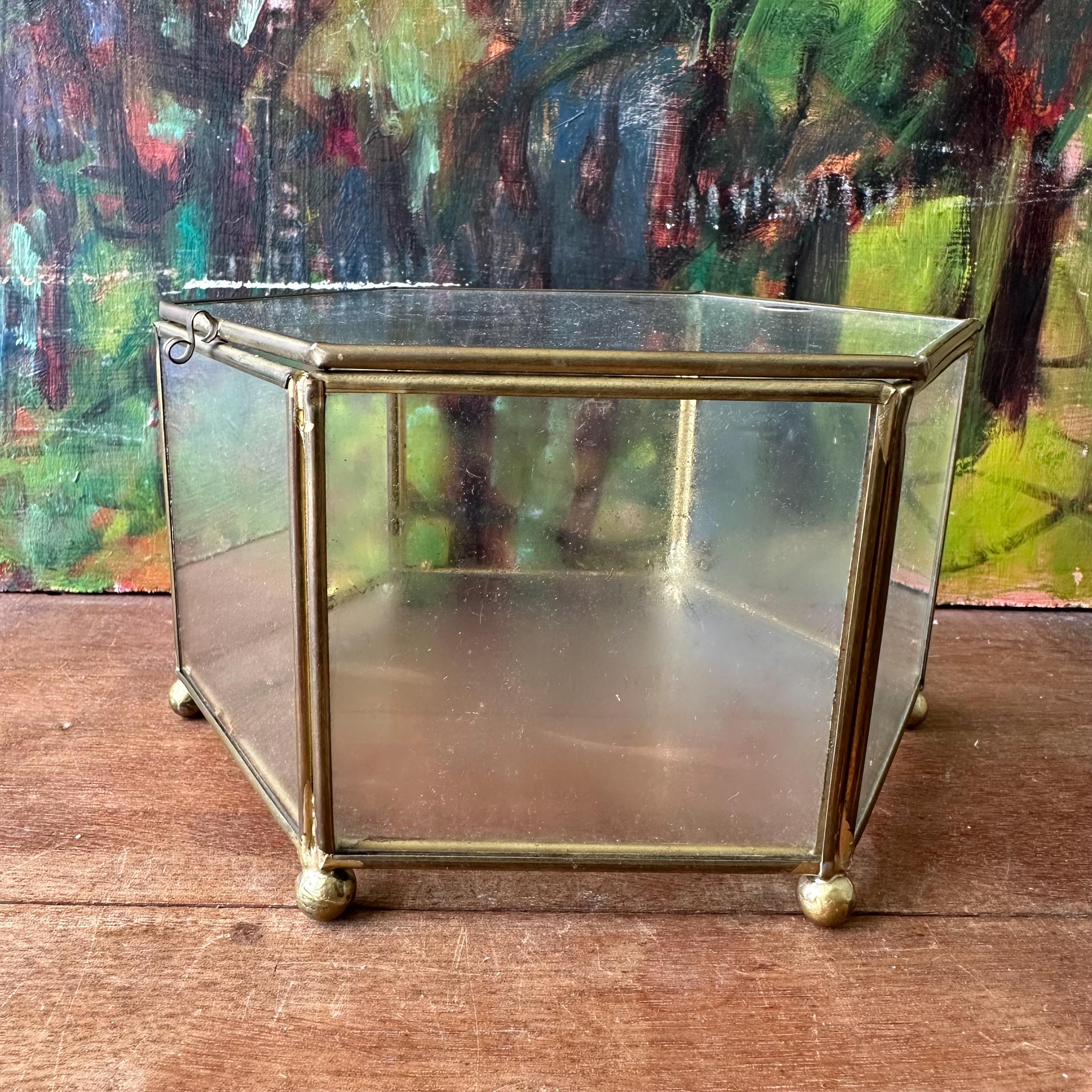 This is a hexagon-shaped glass and brass display box. The box has a hinged lid with a figure eight latch opening. The lid, bottom, and sides of the box are clear glass with edging in brass. The box has six brass ball feet. There is a Hecho en Mexico sticker on the top. This would make for a nice shadow box or display case.