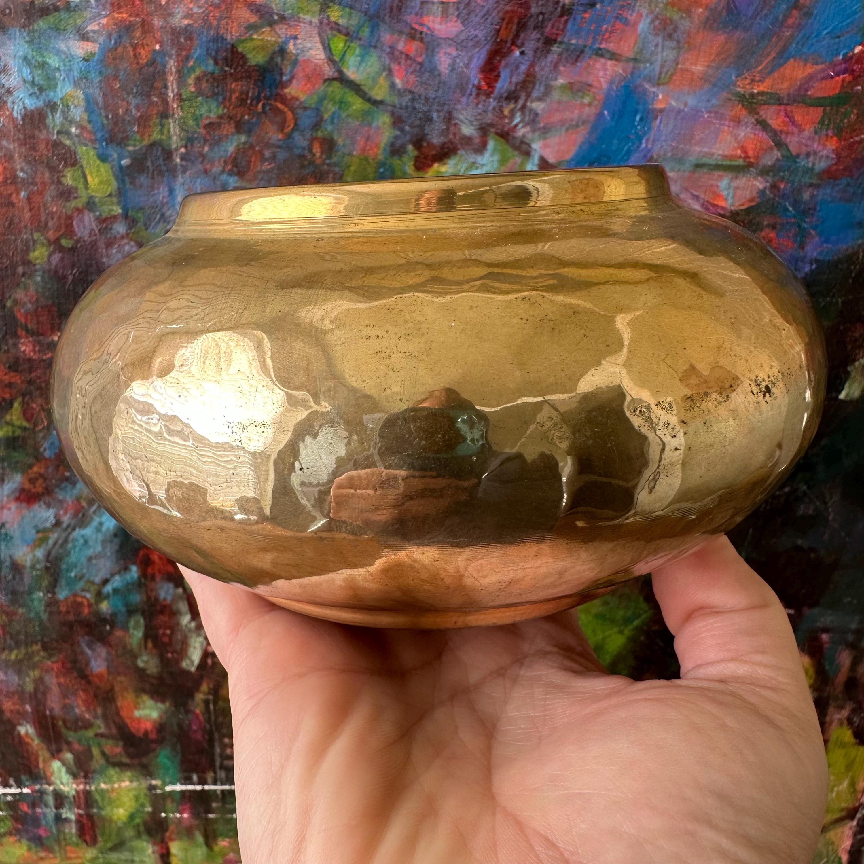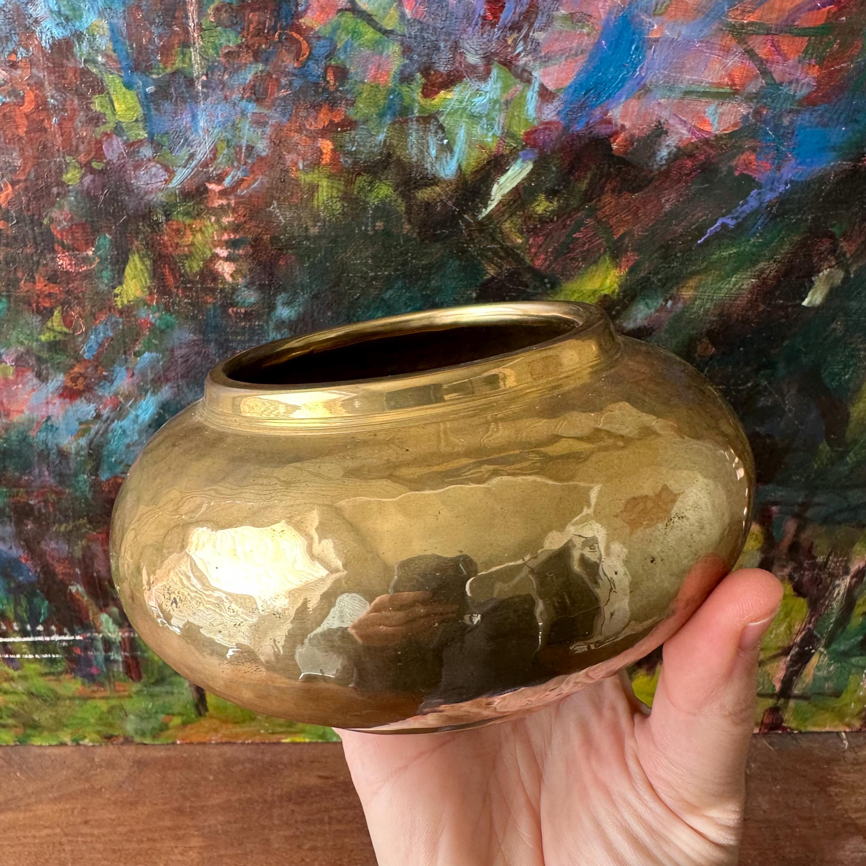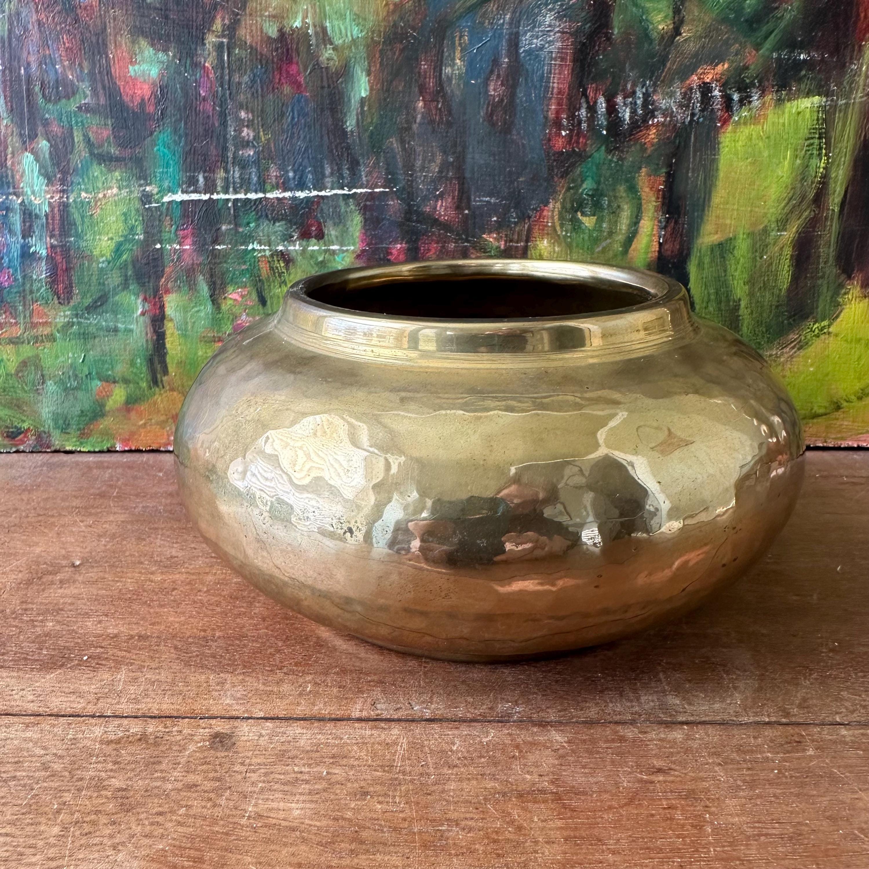 This is a low brass vase or planter with a hammered brass design that was made in India. The vase is a solid brass with an urn-style body. The vase has a rounded body with little hammer dents in a repeating pattern all over. The top of the vase tapers to a wide mouth opening. The bottom has a Made in India sticker.