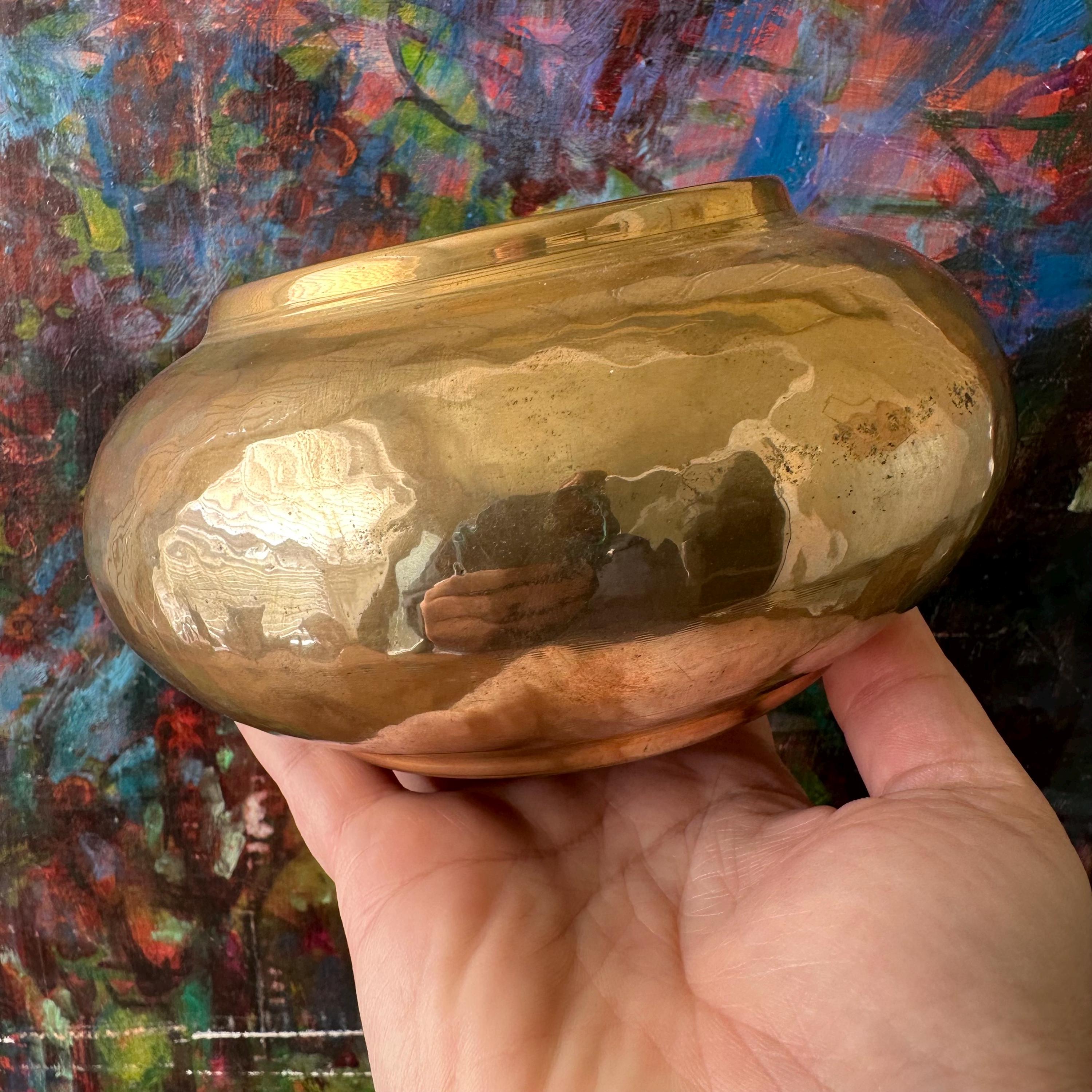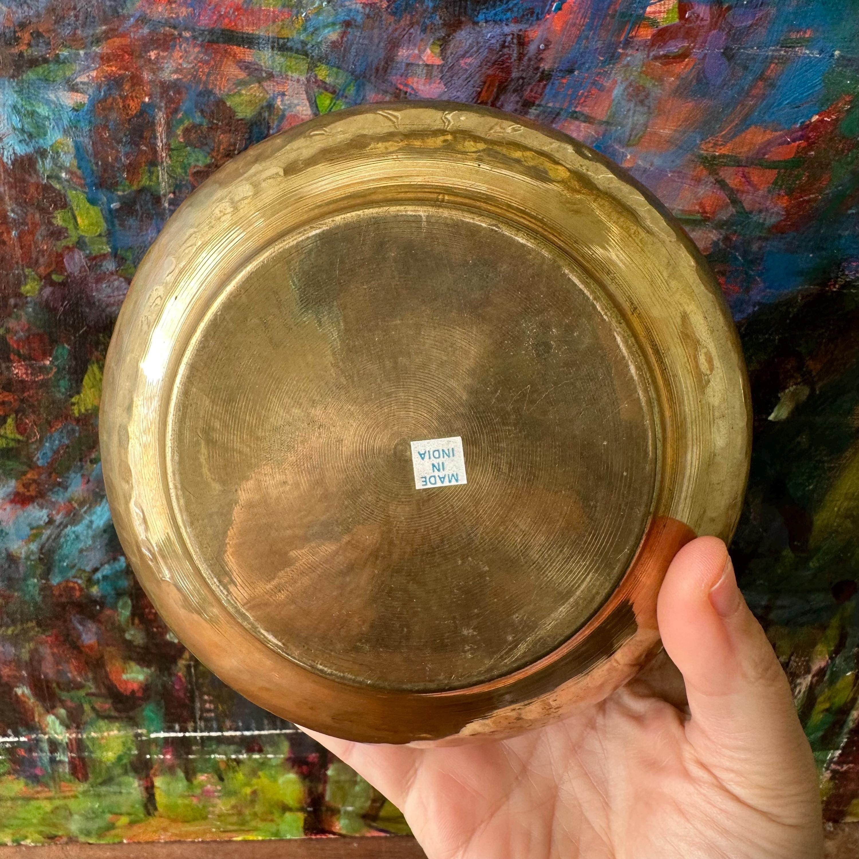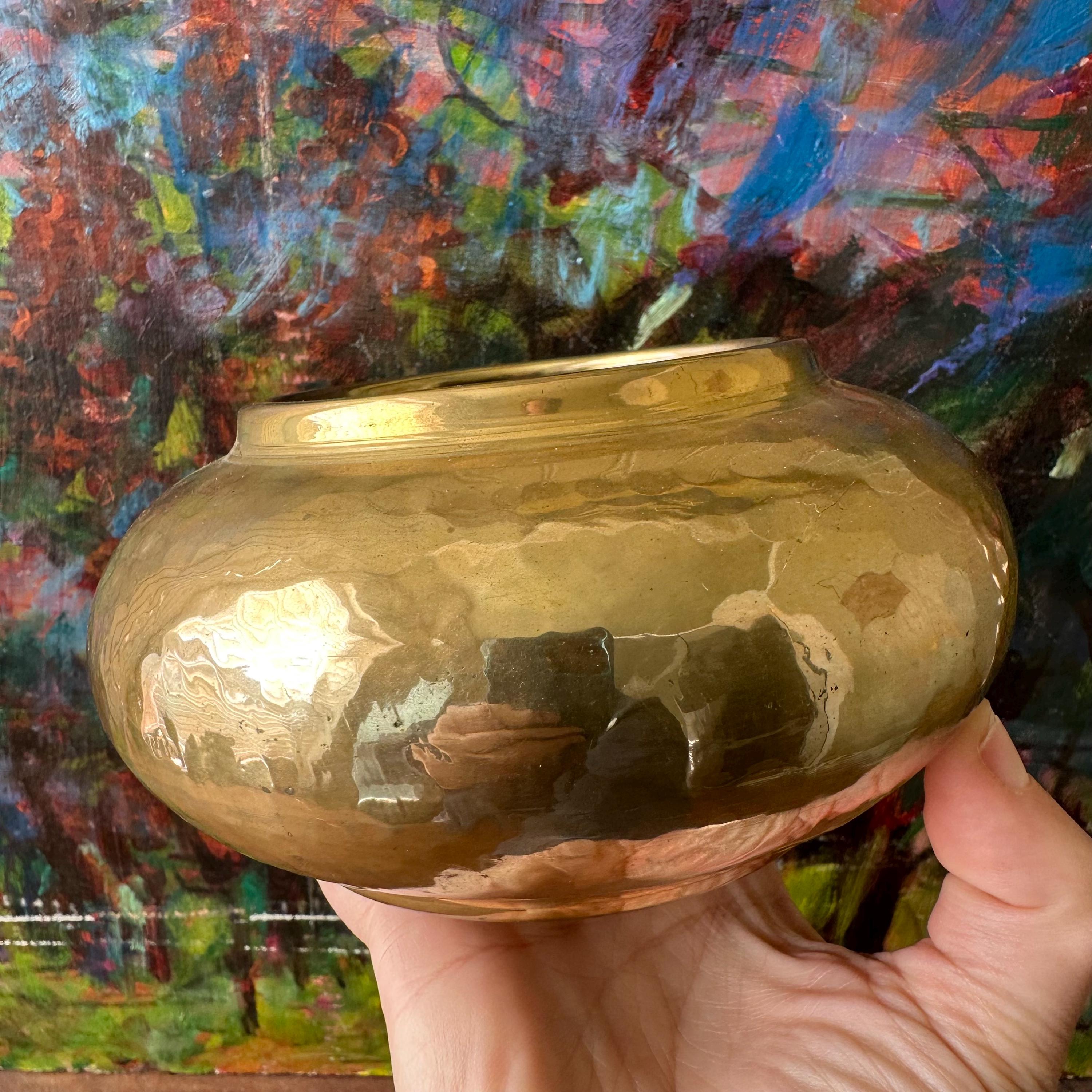 This is a low brass vase or planter with a hammered brass design that was made in India. The vase is a solid brass with an urn-style body. The vase has a rounded body with little hammer dents in a repeating pattern all over. The top of the vase tapers to a wide mouth opening. The bottom has a Made in India sticker.