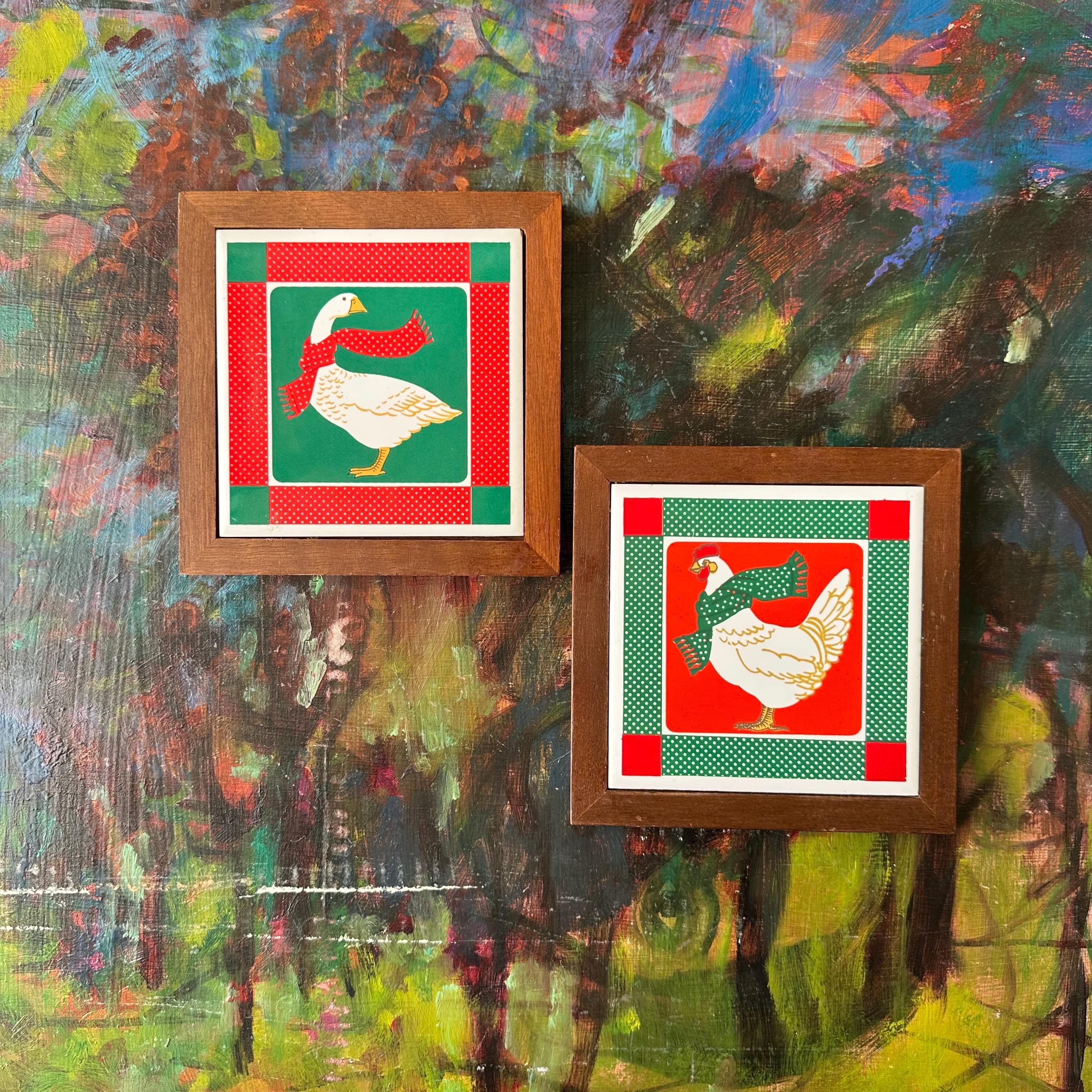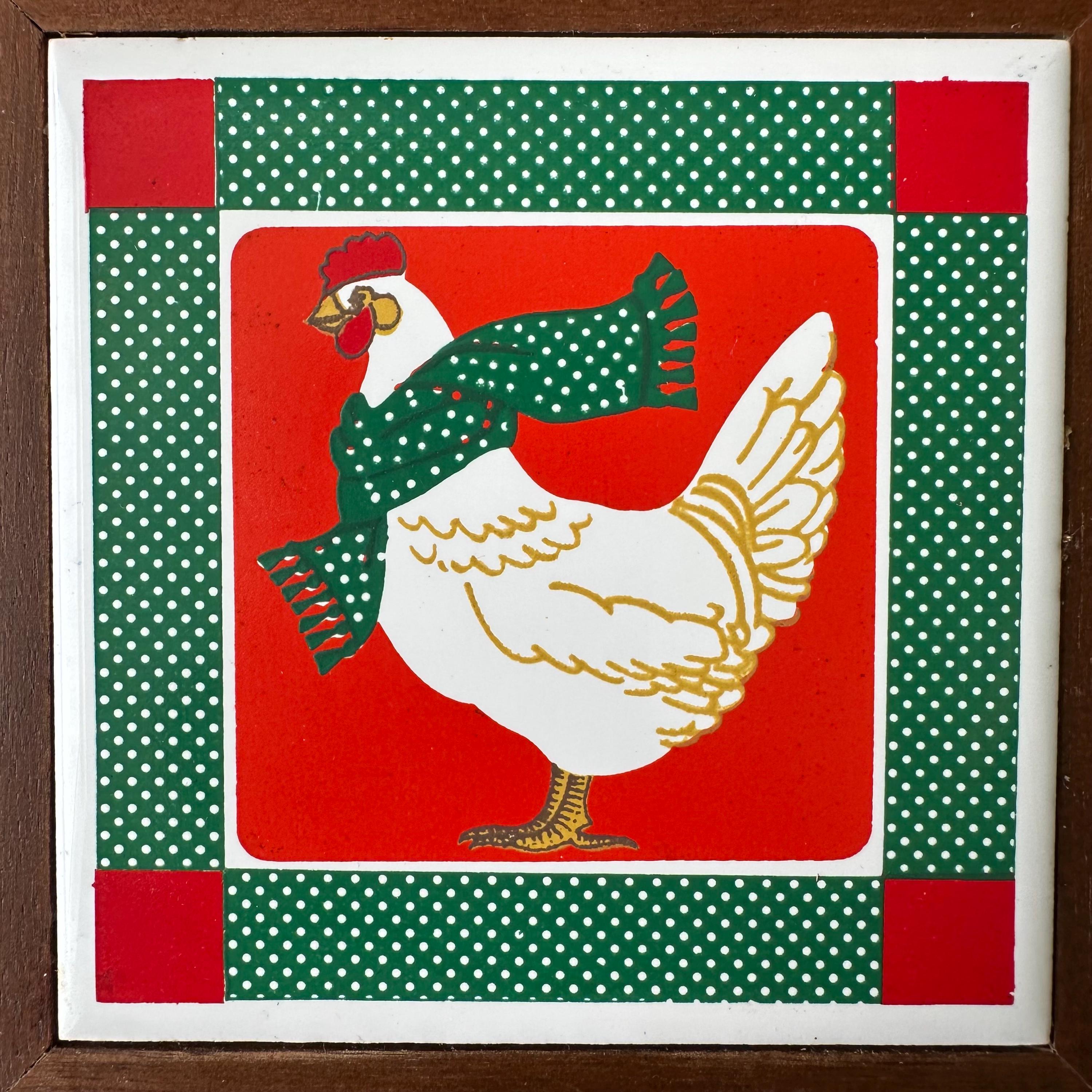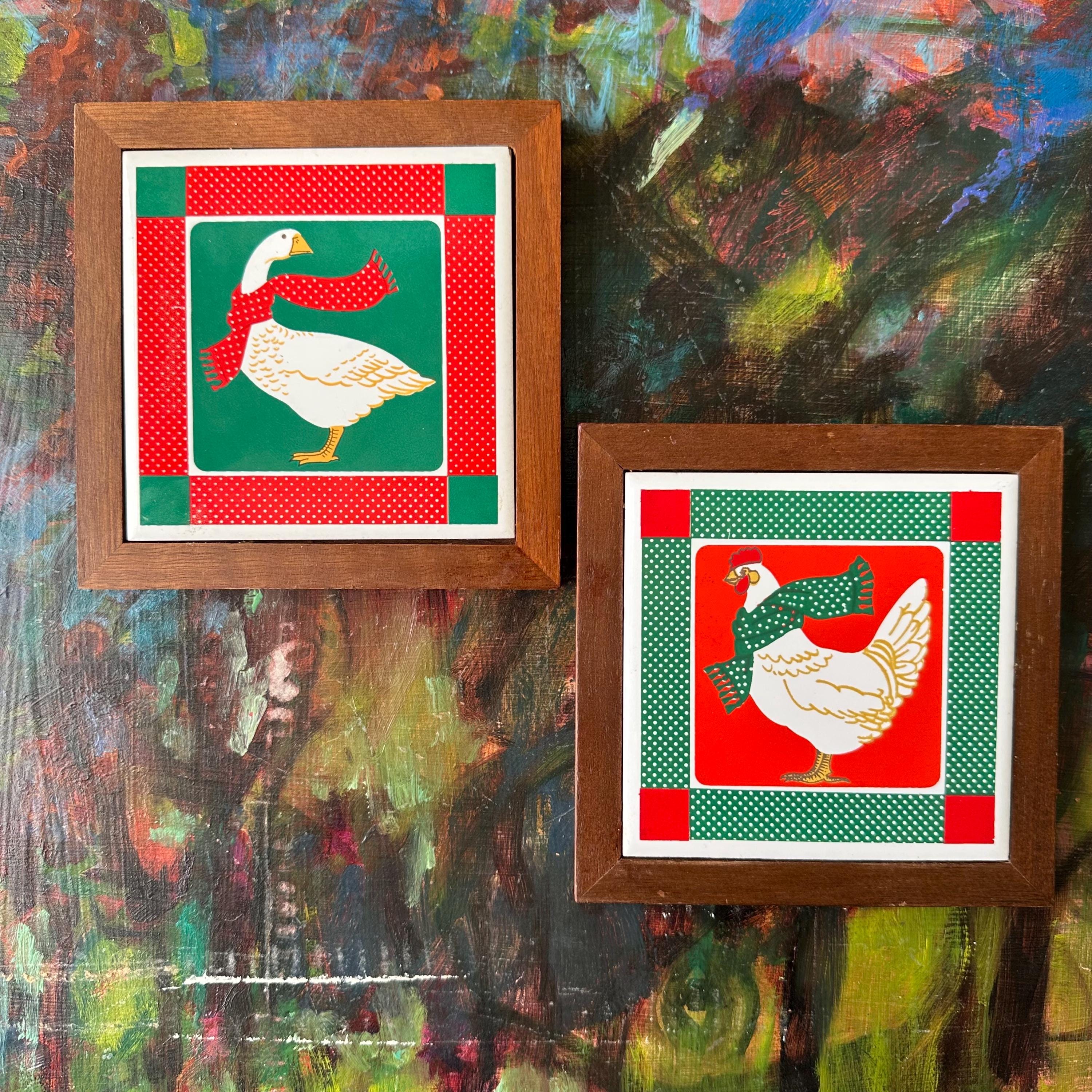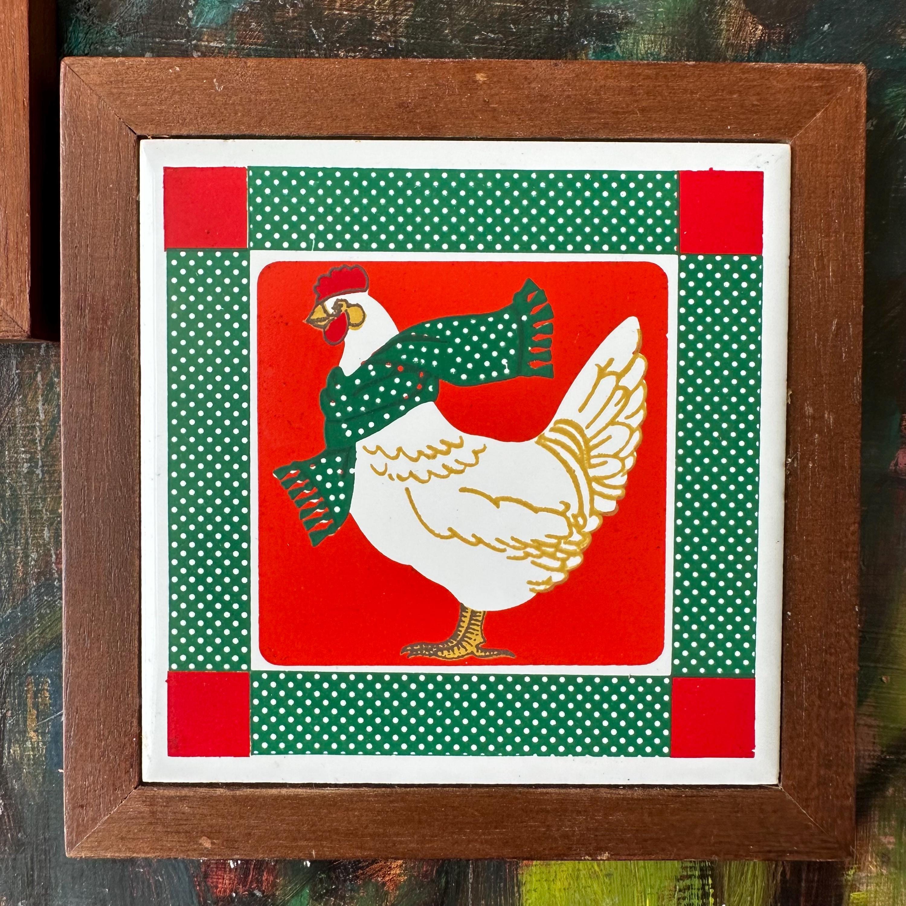 This is a set of 2 Jasco Wood Framed Trivets. The trivets are white ceramic with a quilt block style print. The side panels are green with white dots for the rooster and red with white dots for the goose. The rooster has red corners and the goose has green. The rooster is wearing a green scarf on a red background, and the goose is wearing a red scarf on a green background. The tiles are inset into wood frames. The trivet can be used as a trivet, but there is also a gold hanging hoop on the back of each to turn each into a wall hanging.