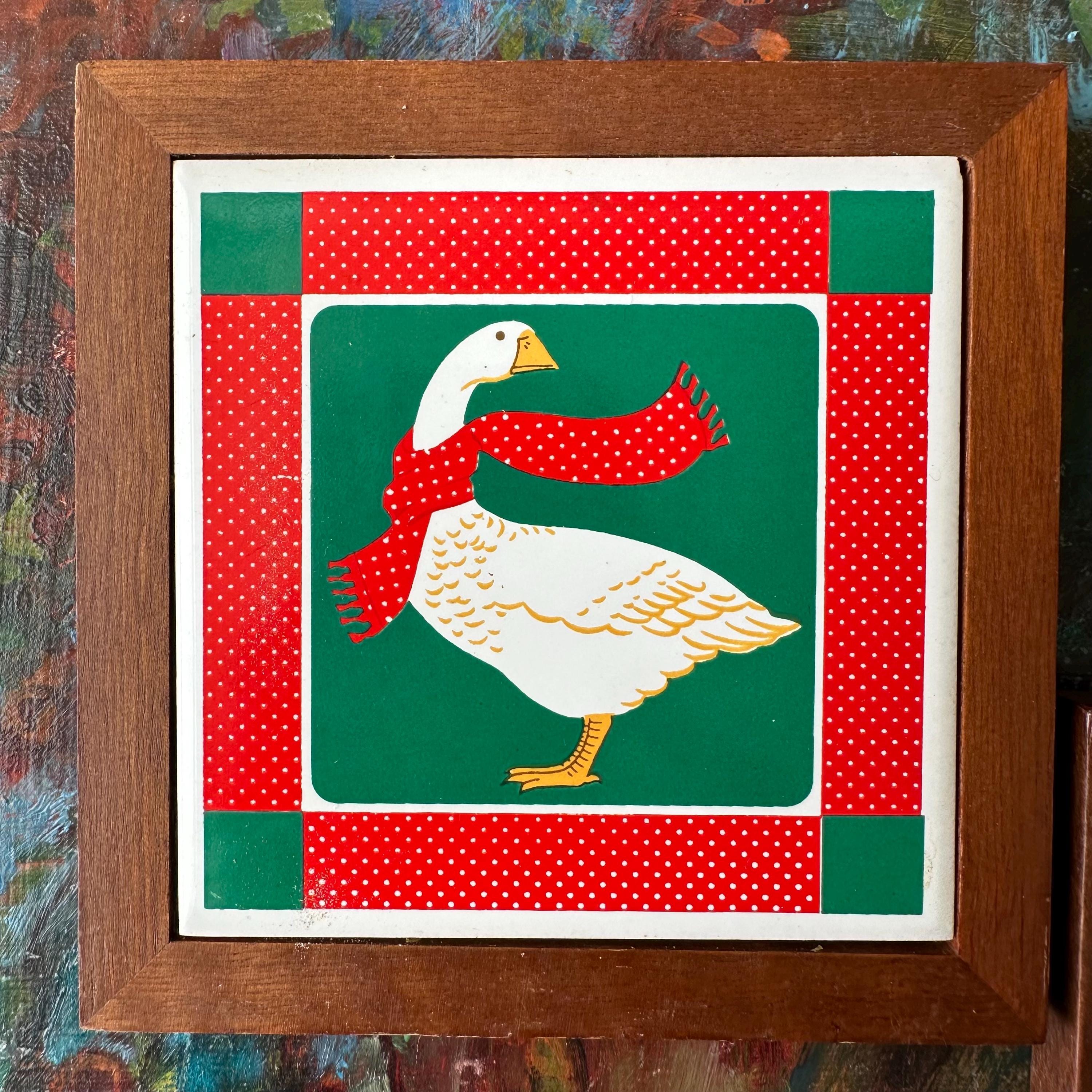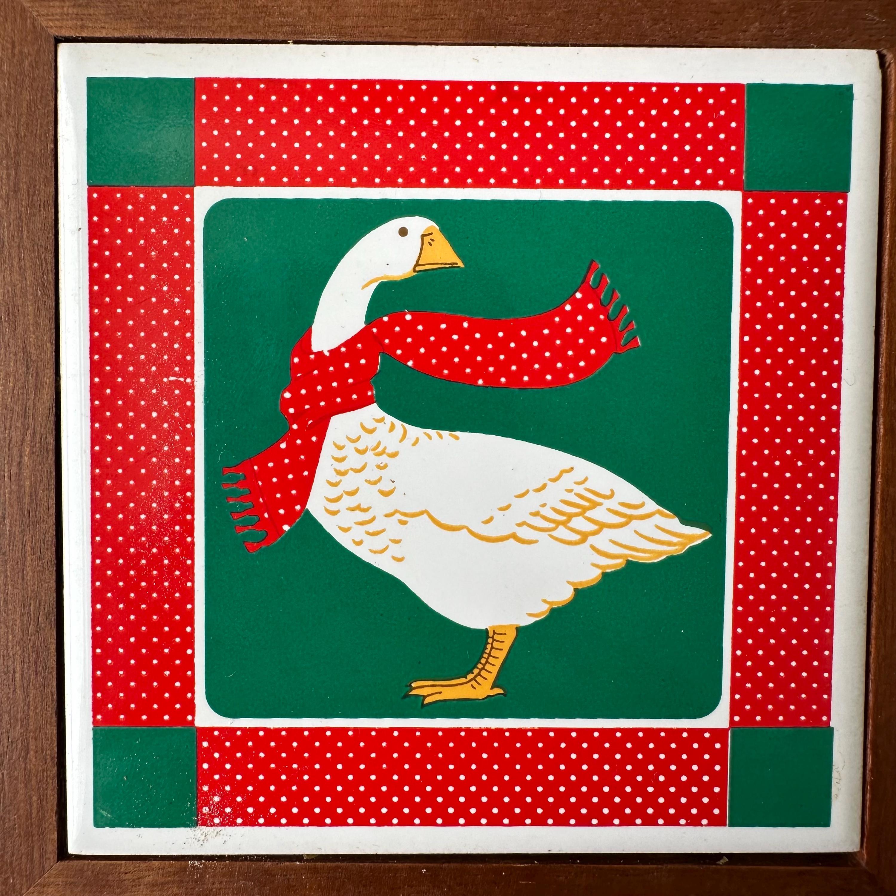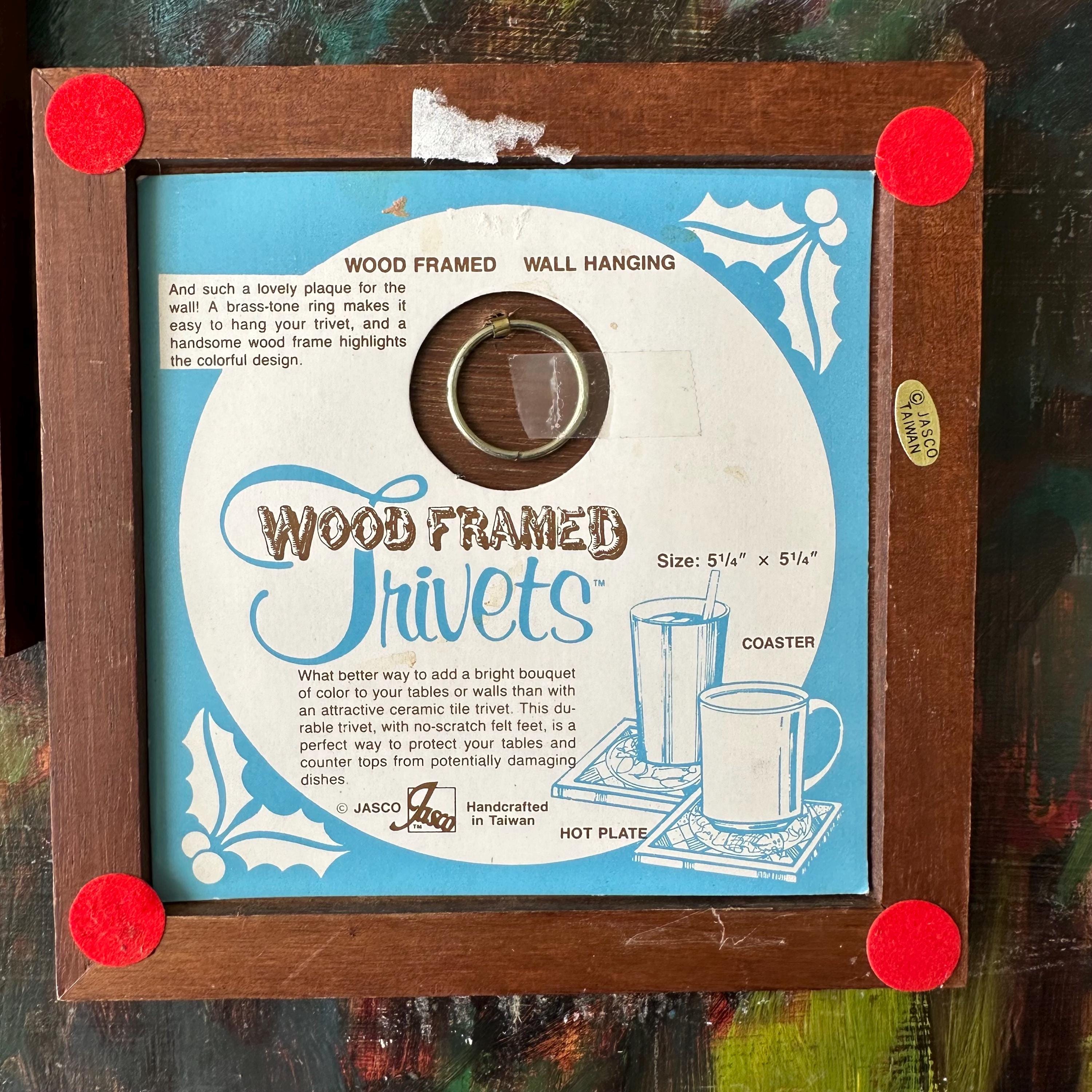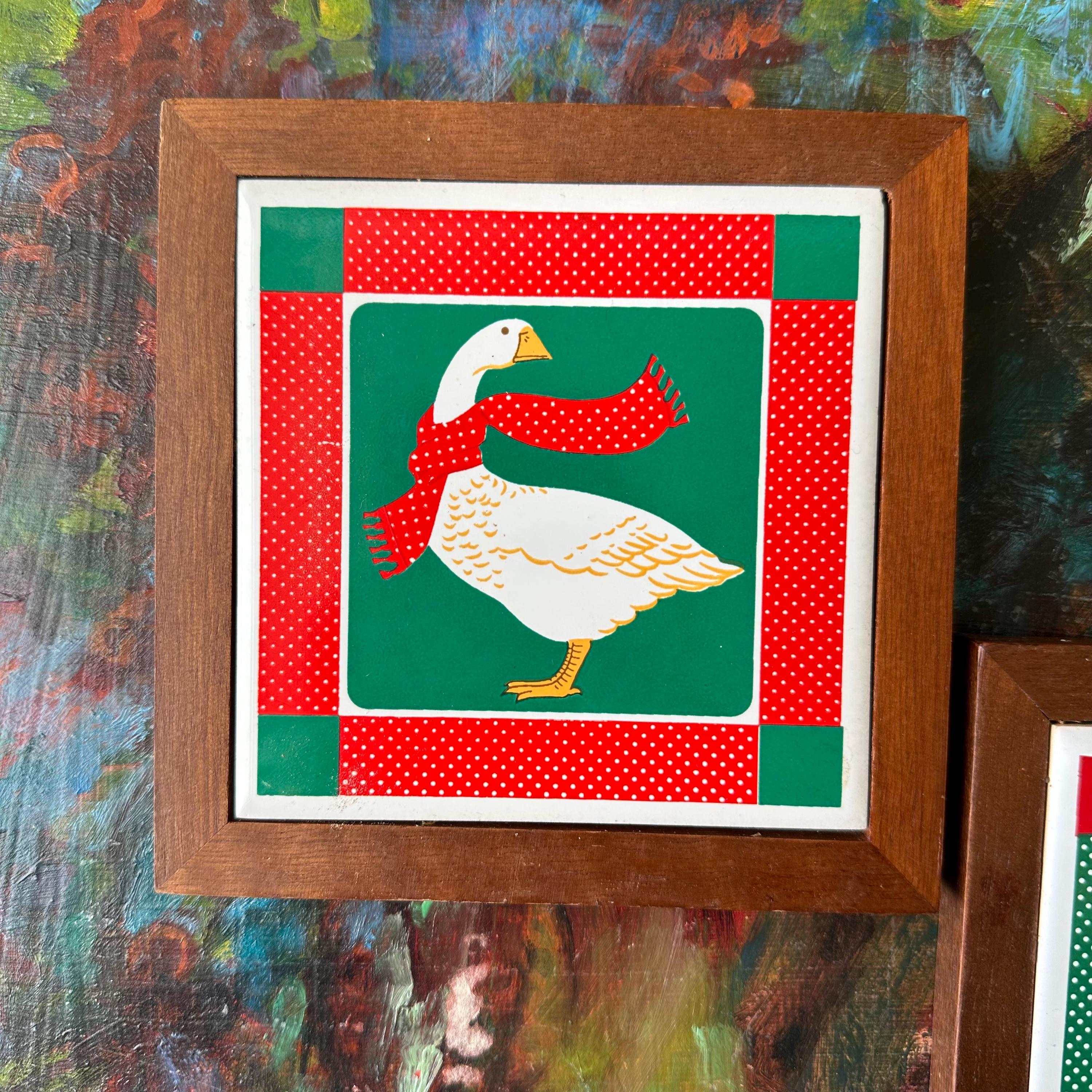 This is a set of 2 Jasco Wood Framed Trivets. The trivets are white ceramic with a quilt block style print. The side panels are green with white dots for the rooster and red with white dots for the goose. The rooster has red corners and the goose has green. The rooster is wearing a green scarf on a red background, and the goose is wearing a red scarf on a green background. The tiles are inset into wood frames. The trivet can be used as a trivet, but there is also a gold hanging hoop on the back of each to turn each into a wall hanging.
