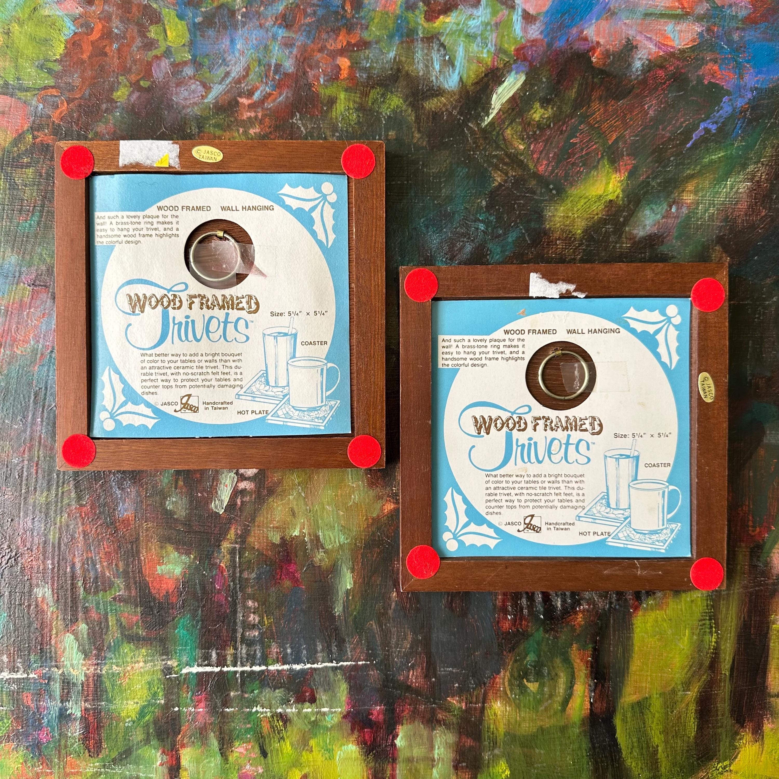 The trivets are in great vintage condition for their age and use. The tiles are bright with no missing print. The goose has a very tiny chip to the tile in the top right corner. The wood is in good condition with some minor discoloration. The hoops have been taped down.