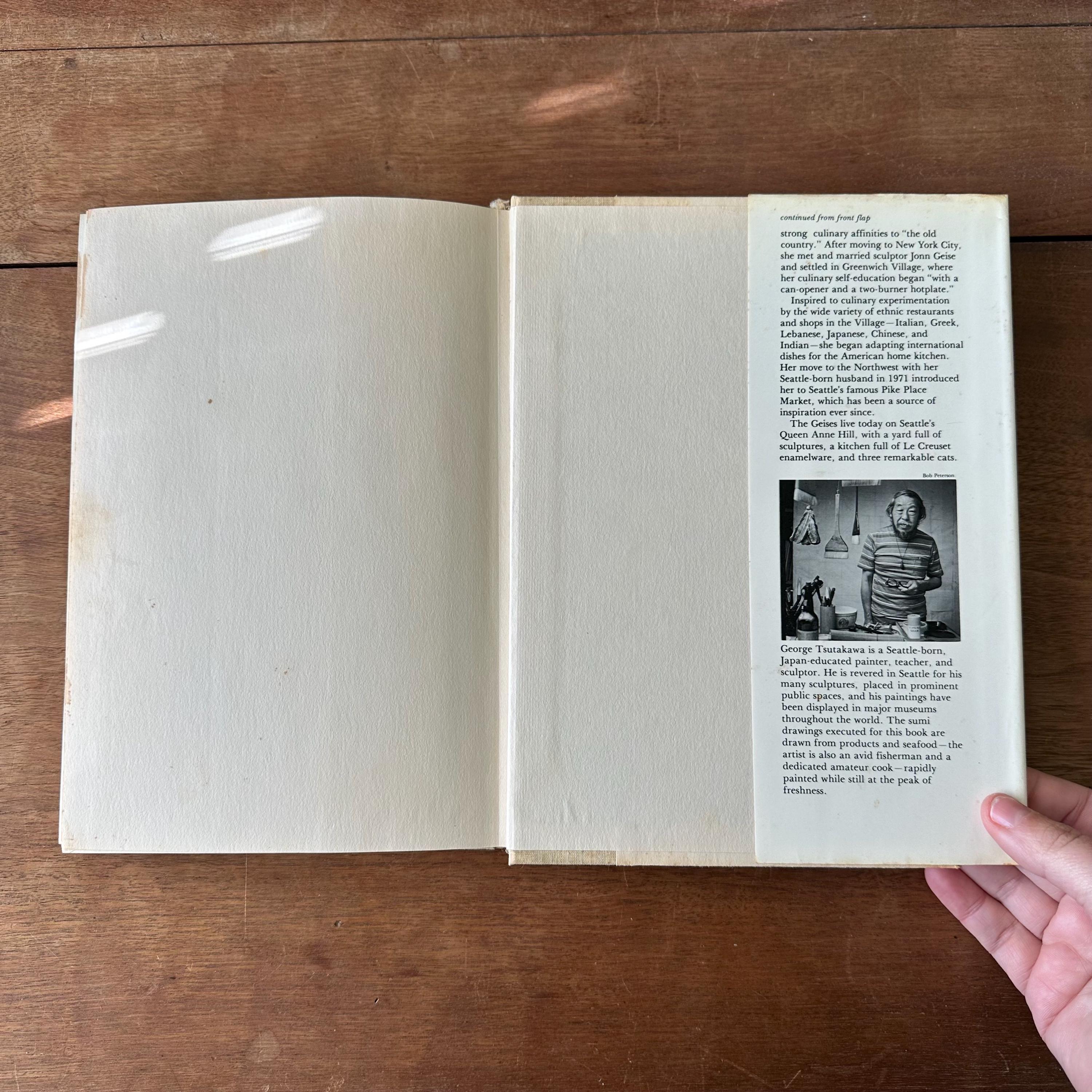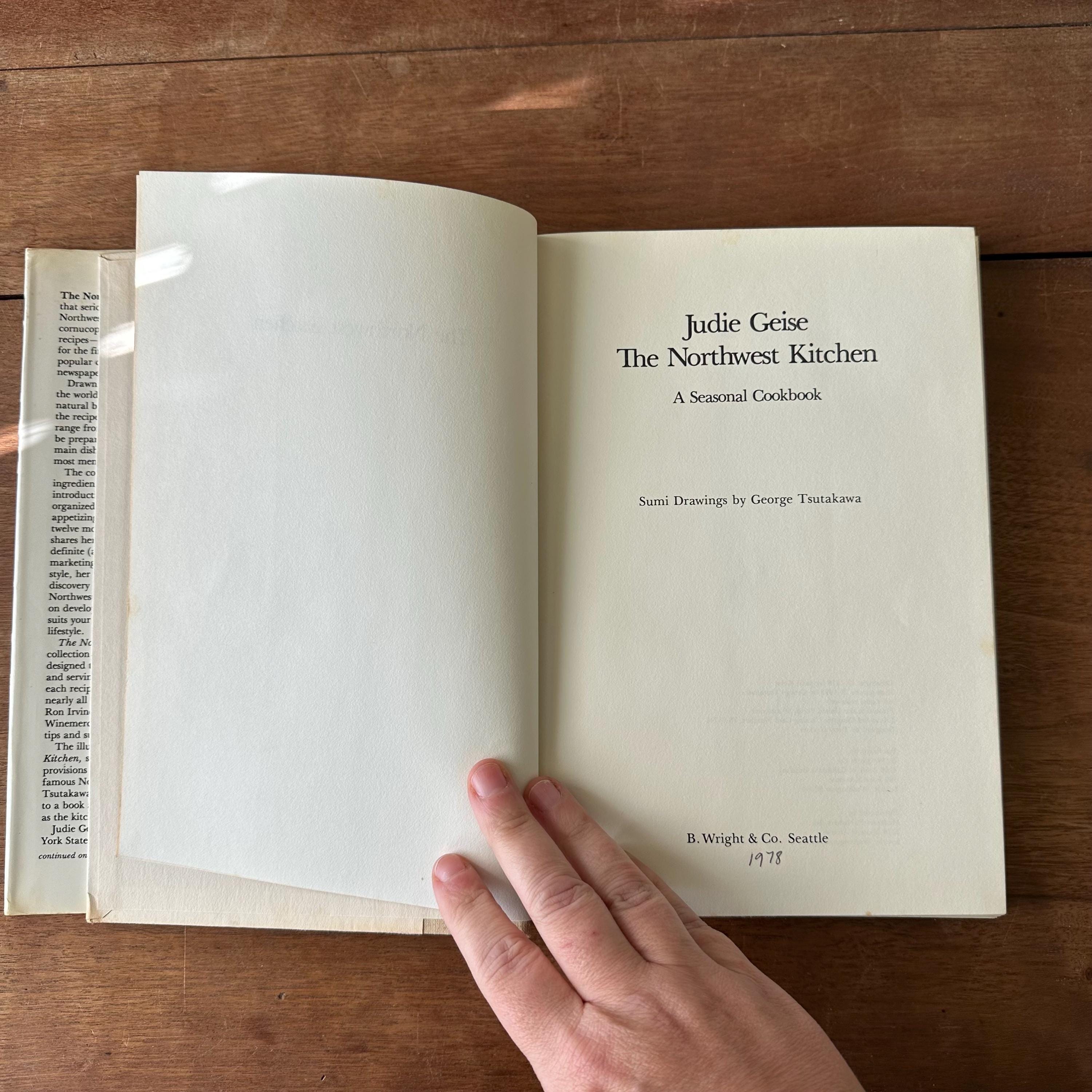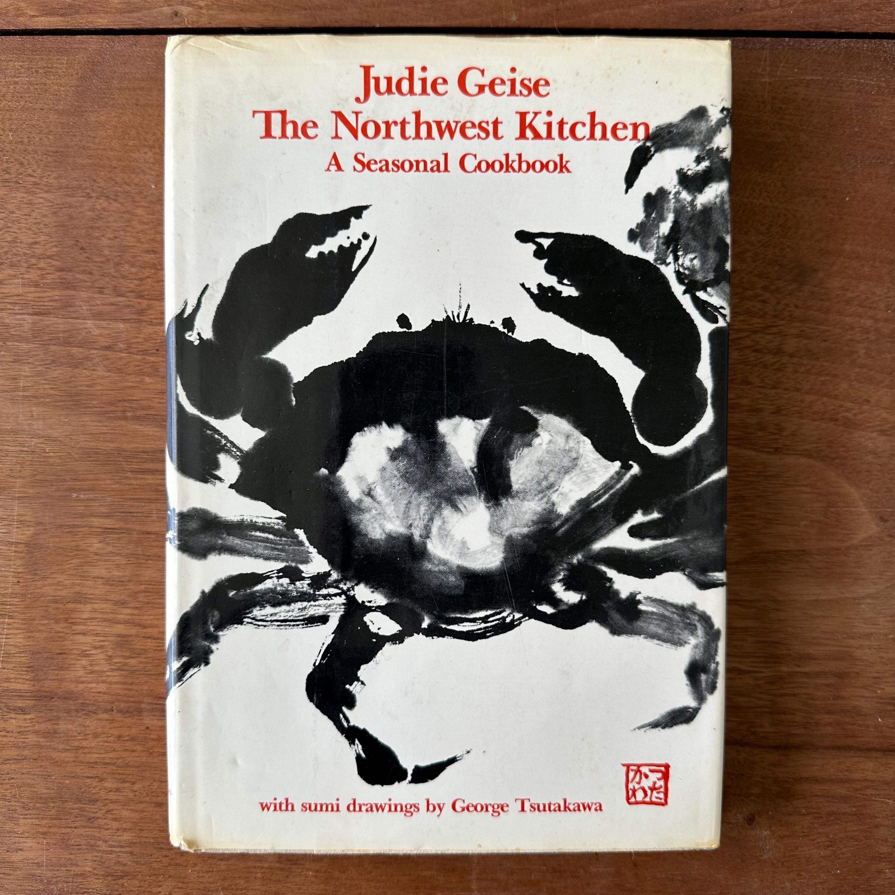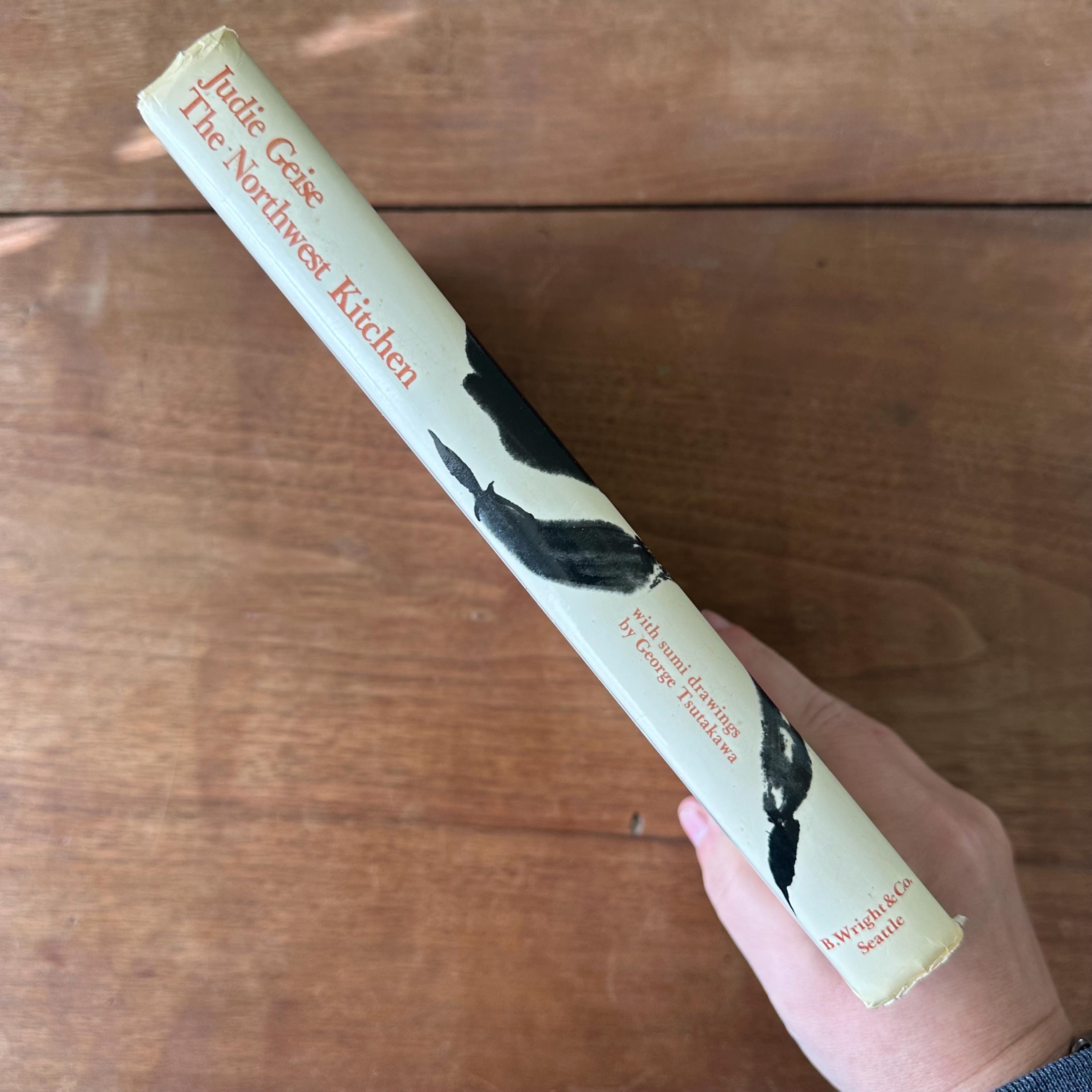 This is the 1978 edition The Northwest Kitchen: A Seasonal Cookbook by Julie Geise with Sumi drawings by George Tsutakawa, published by B. Wright & Co. The cookbook has the original dust jacket with the gorgeous Sumi drawing of a crab in black. It is lettered in red. The book covers underneath are cream colored with a beige linen spine lettered in gold. The cookbook has 264 pages.