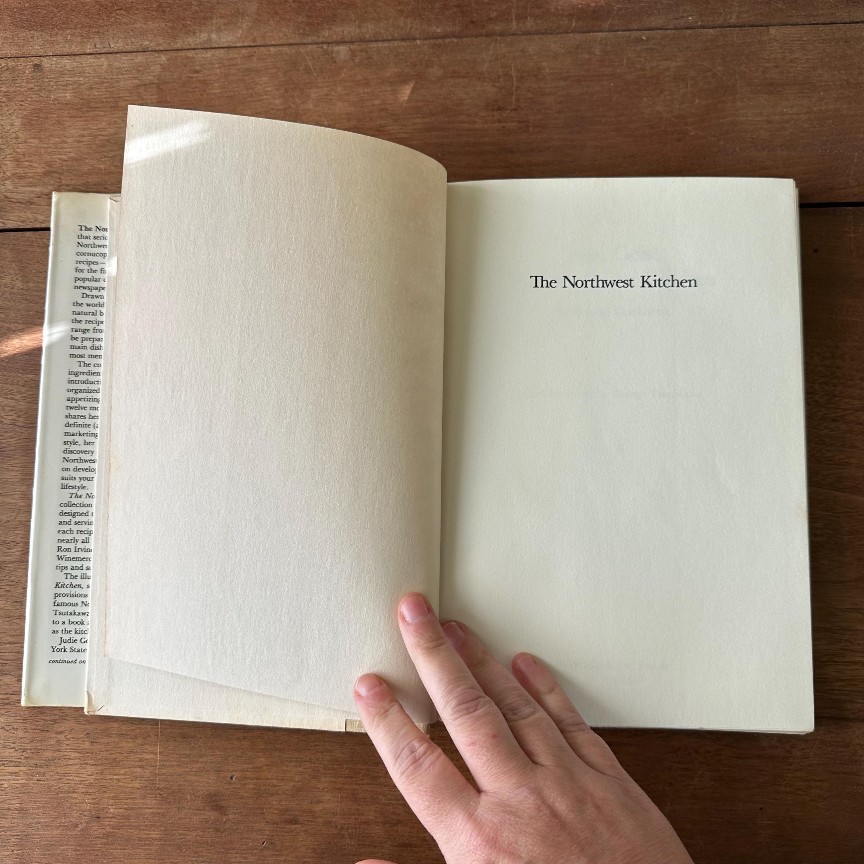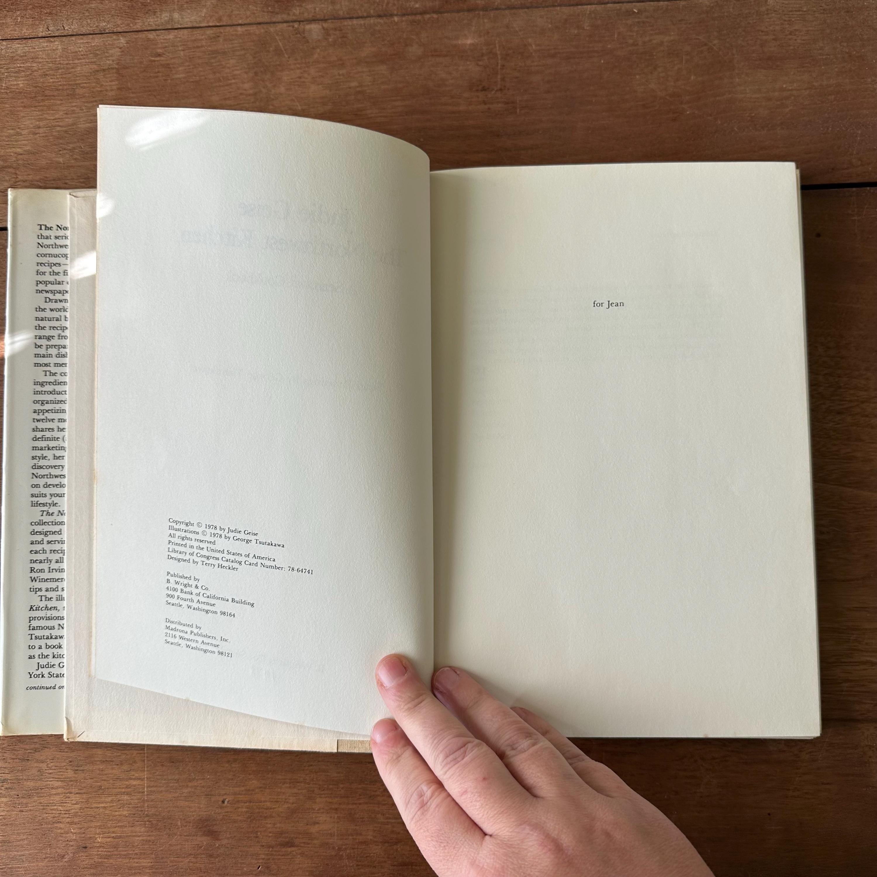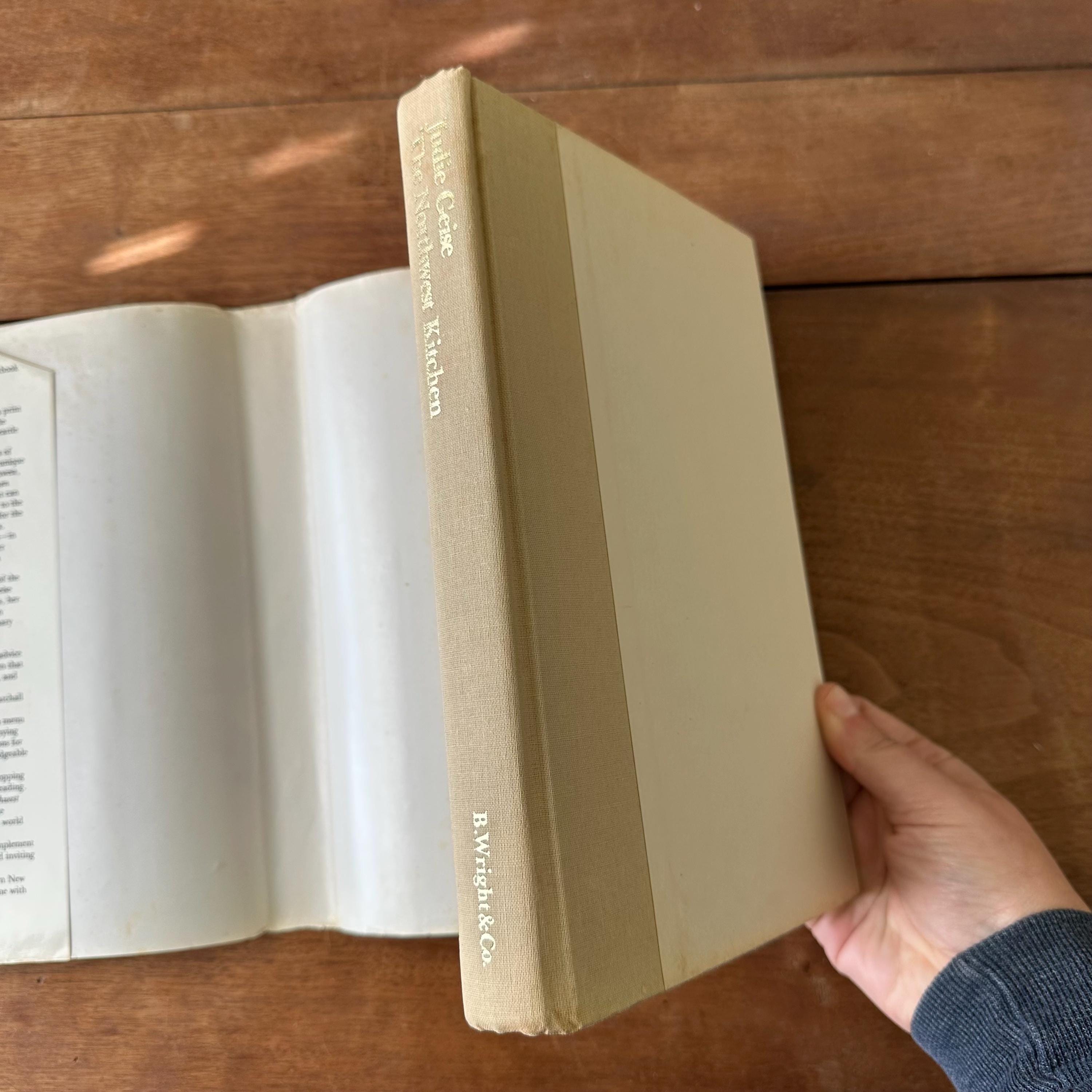 This is the 1978 edition The Northwest Kitchen: A Seasonal Cookbook by Julie Geise with Sumi drawings by George Tsutakawa, published by B. Wright & Co. The cookbook has the original dust jacket with the gorgeous Sumi drawing of a crab in black. It is lettered in red. The book covers underneath are cream colored with a beige linen spine lettered in gold. The cookbook has 264 pages.