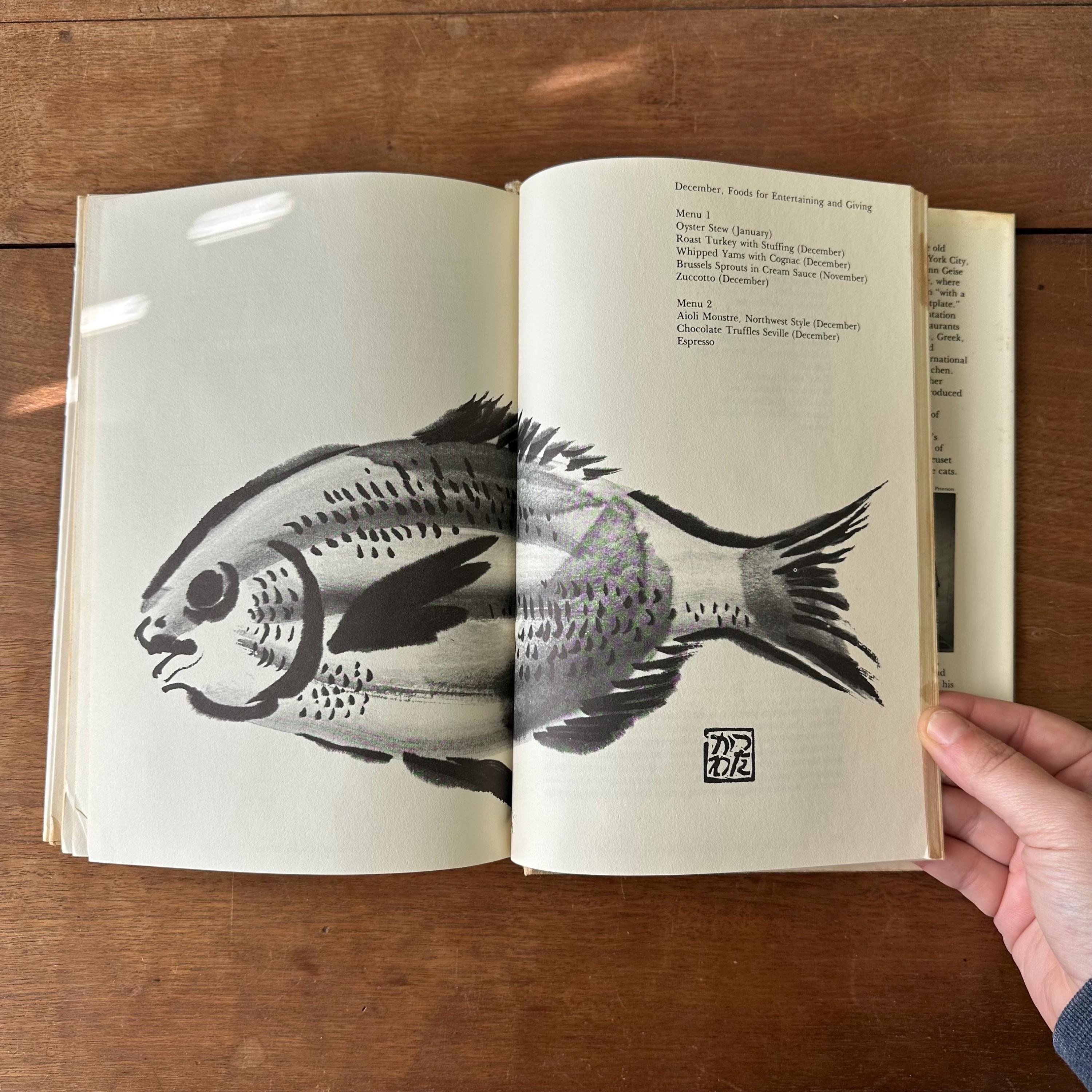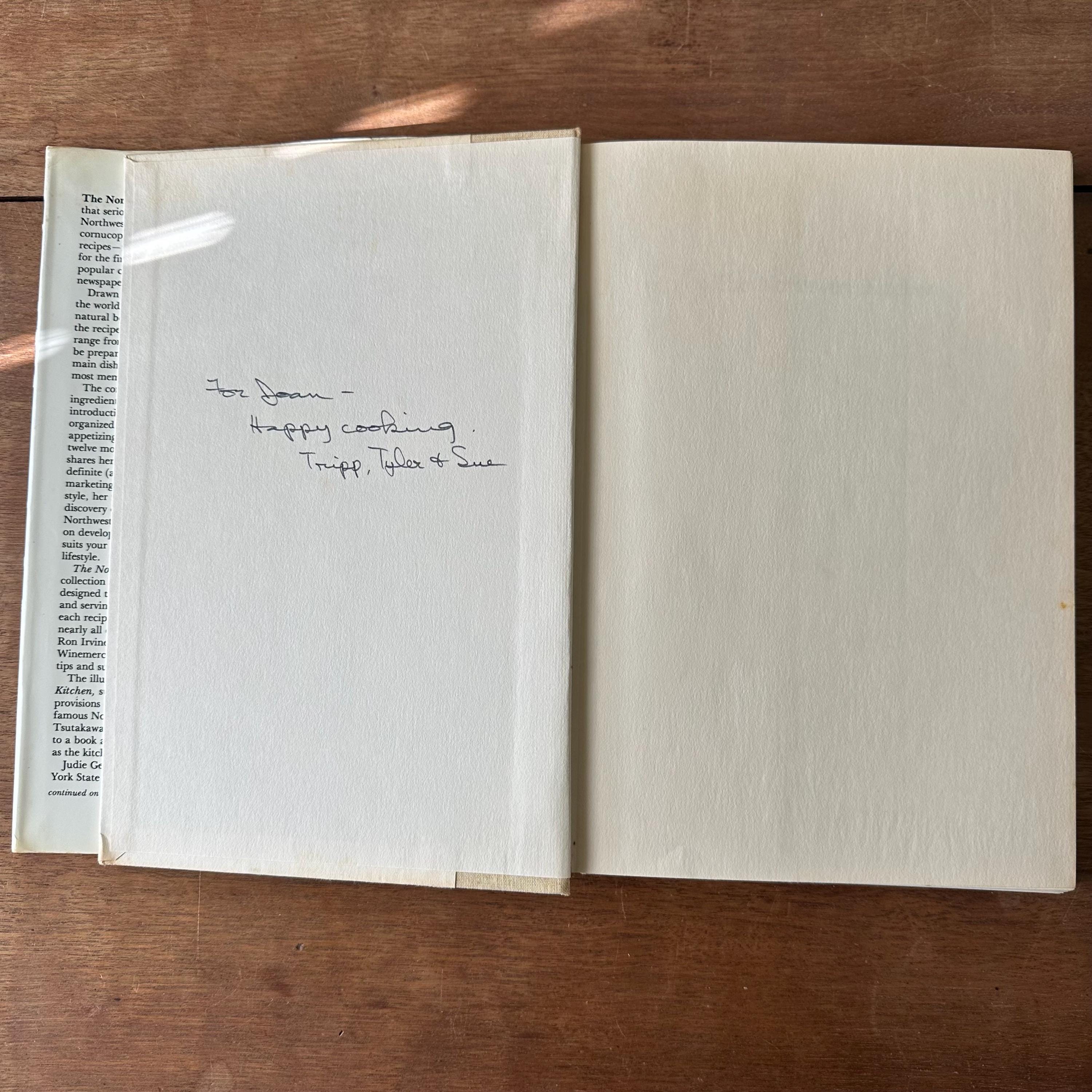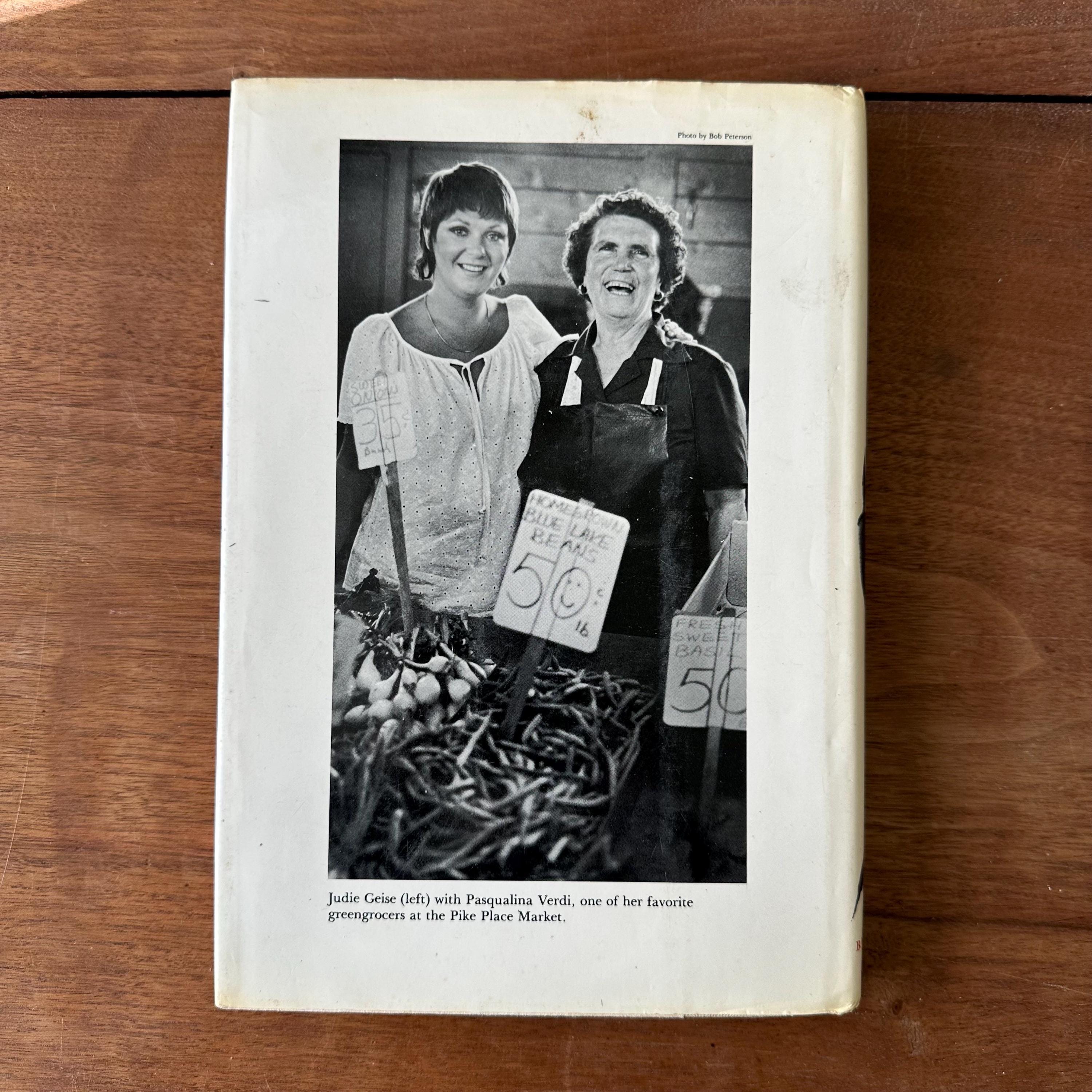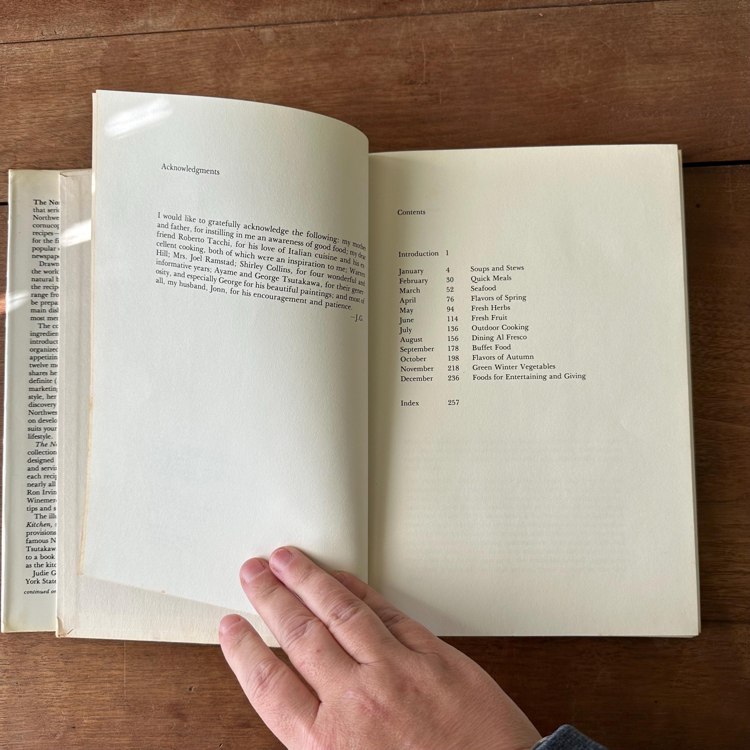 This is the 1978 edition The Northwest Kitchen: A Seasonal Cookbook by Julie Geise with Sumi drawings by George Tsutakawa, published by B. Wright & Co. The cookbook has the original dust jacket with the gorgeous Sumi drawing of a crab in black. It is lettered in red. The book covers underneath are cream colored with a beige linen spine lettered in gold. The cookbook has 264 pages.
