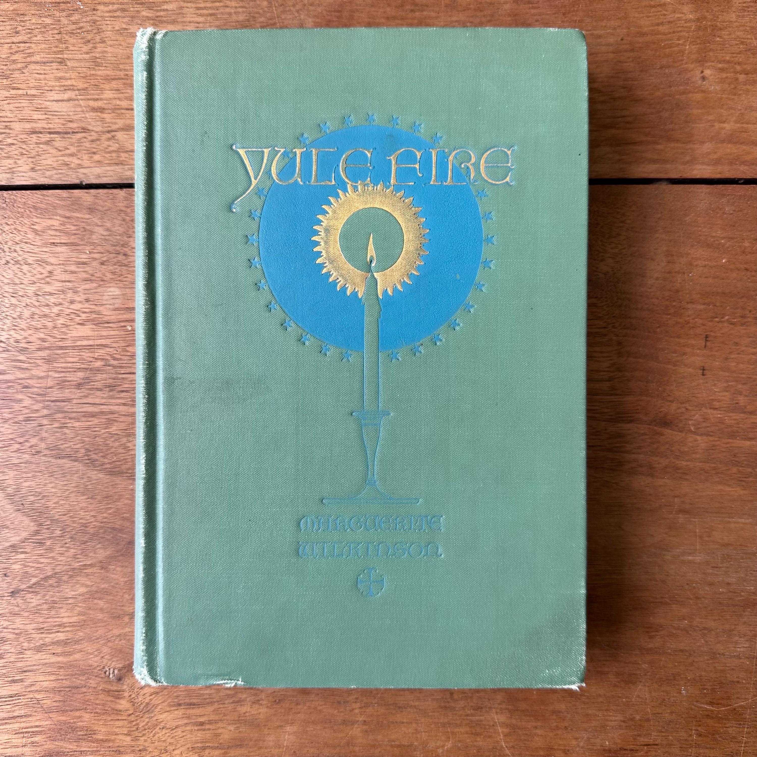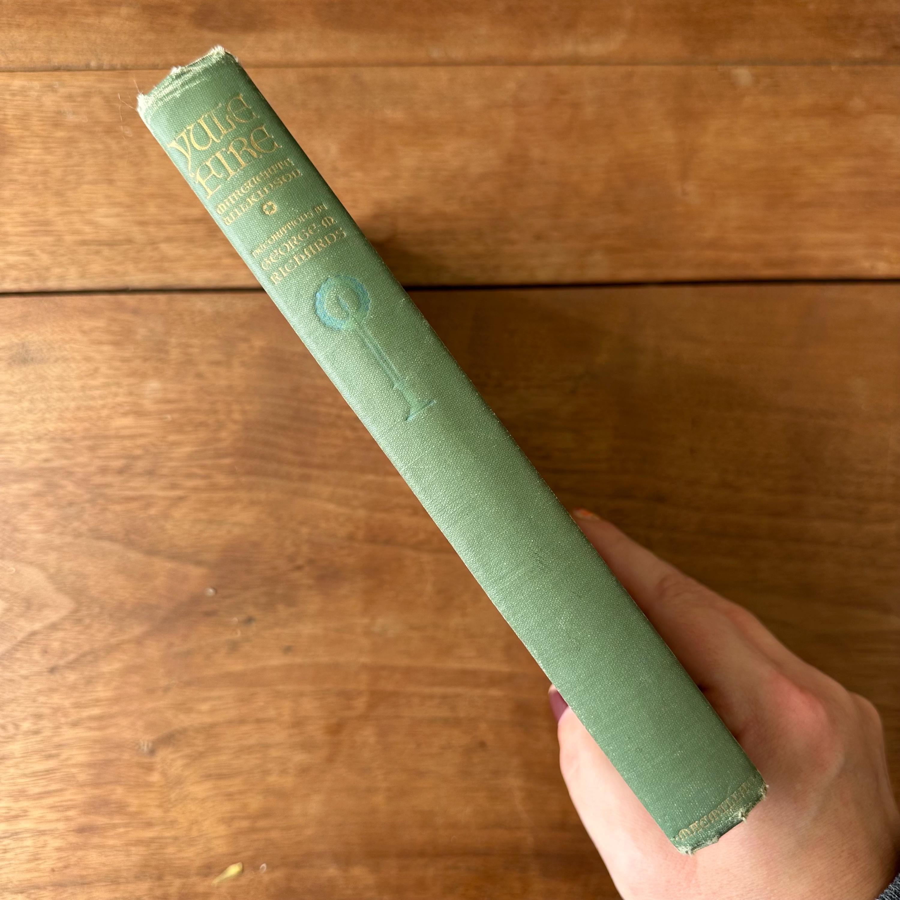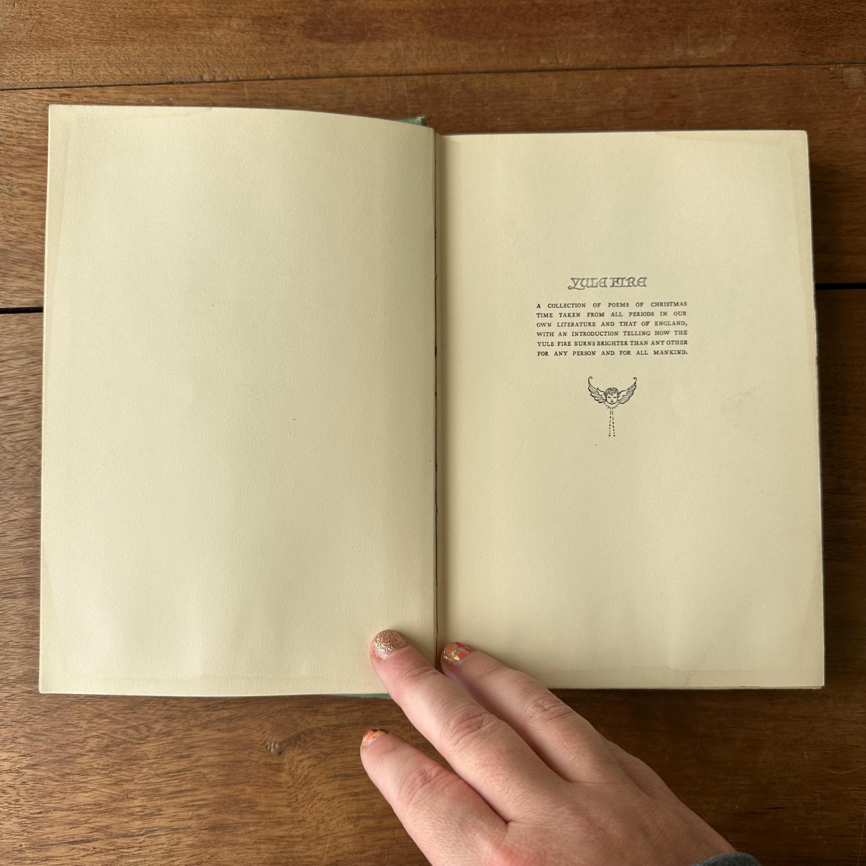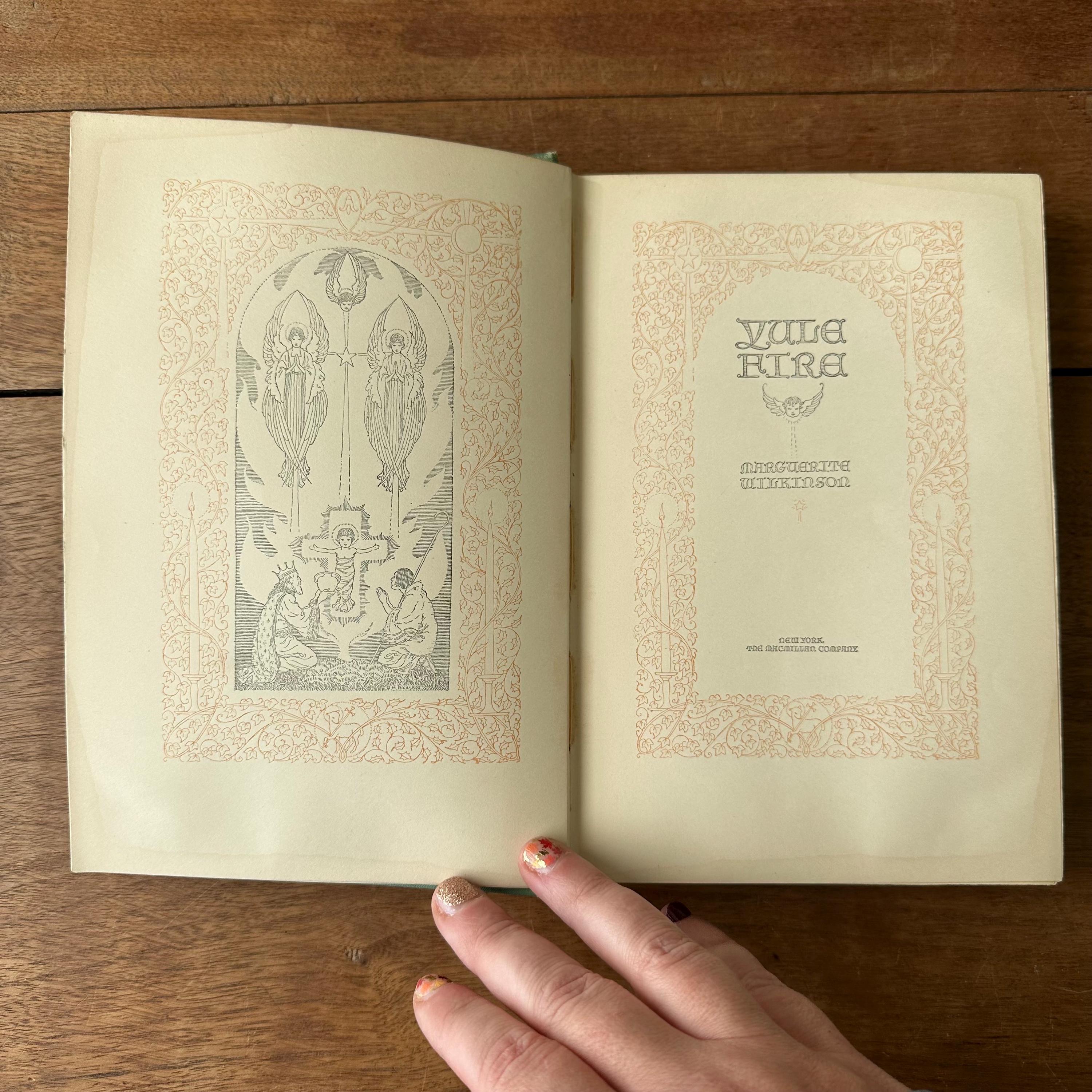 This is the 1926 reprinted edition of Yule Fire by Marguerite Wilkinson, published by The MacMillan Company. Yule Fire is a collection of Christmas poems with lovely black line illustrations throughout. The cover is light green with an illustration of a lit candle on the cover with details and lettering in gold. The spine is also lettered in gold with a candle decoration. The end papers are illustrated with red line drawings of the Christmas star, the wise men, and shepherds. There are 201 pages.