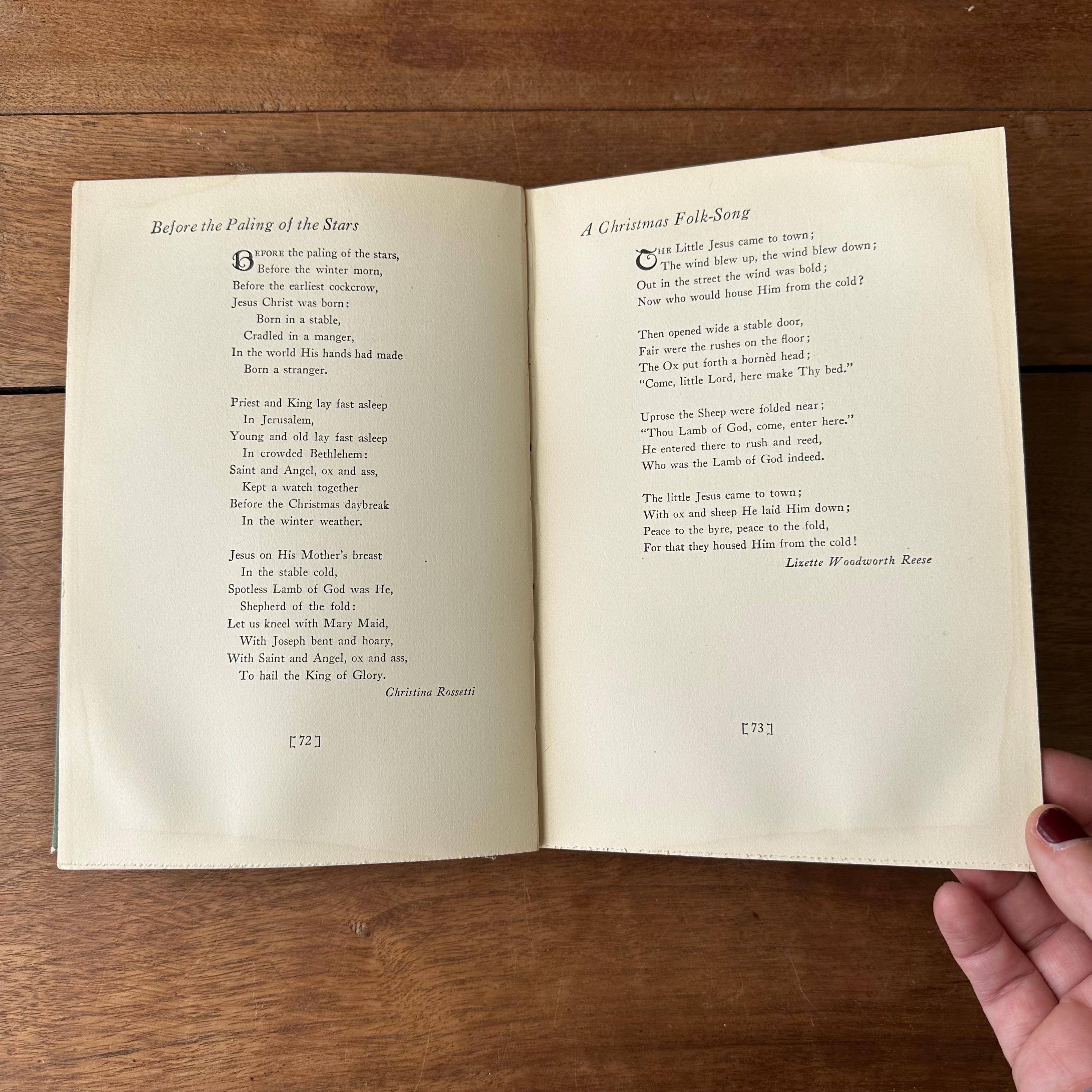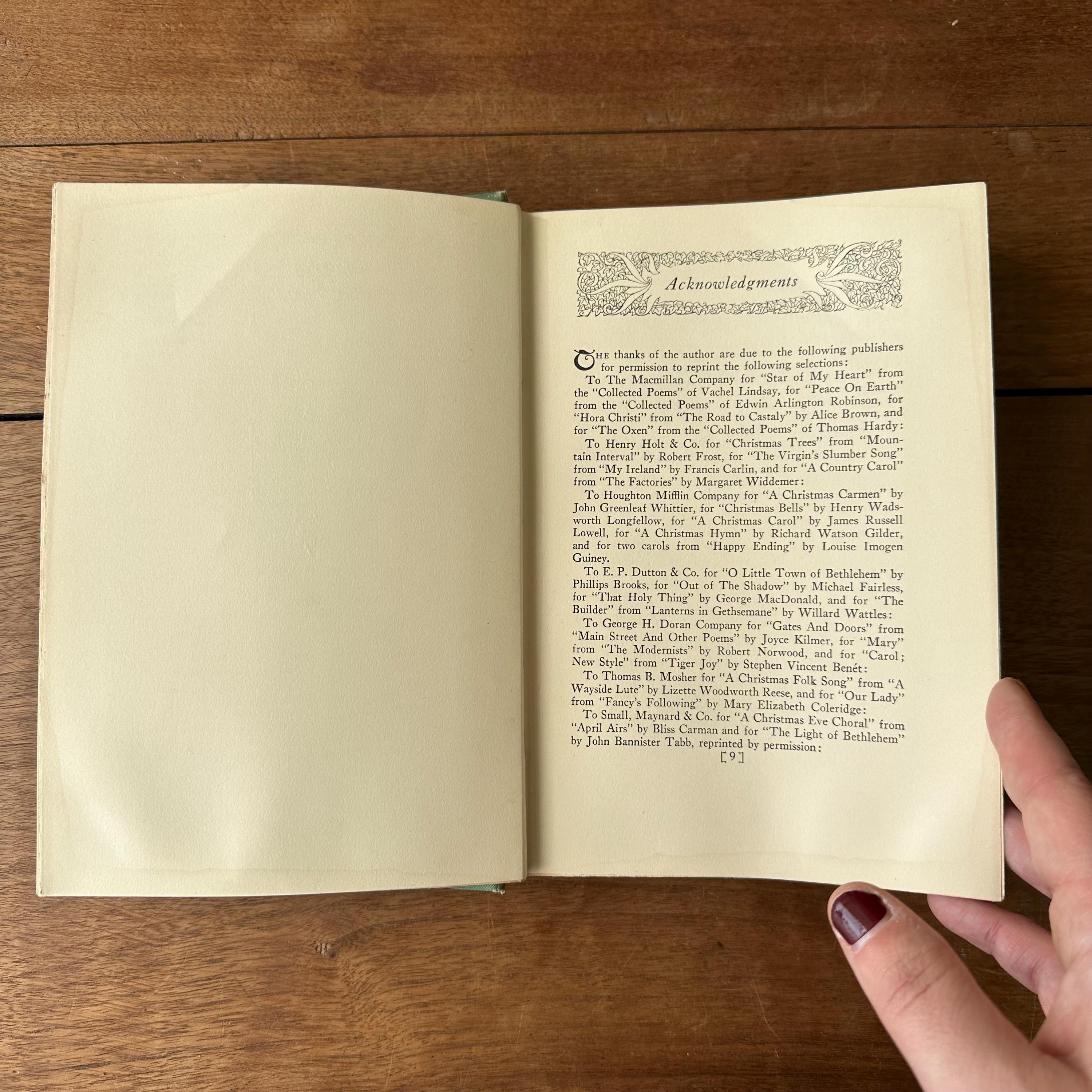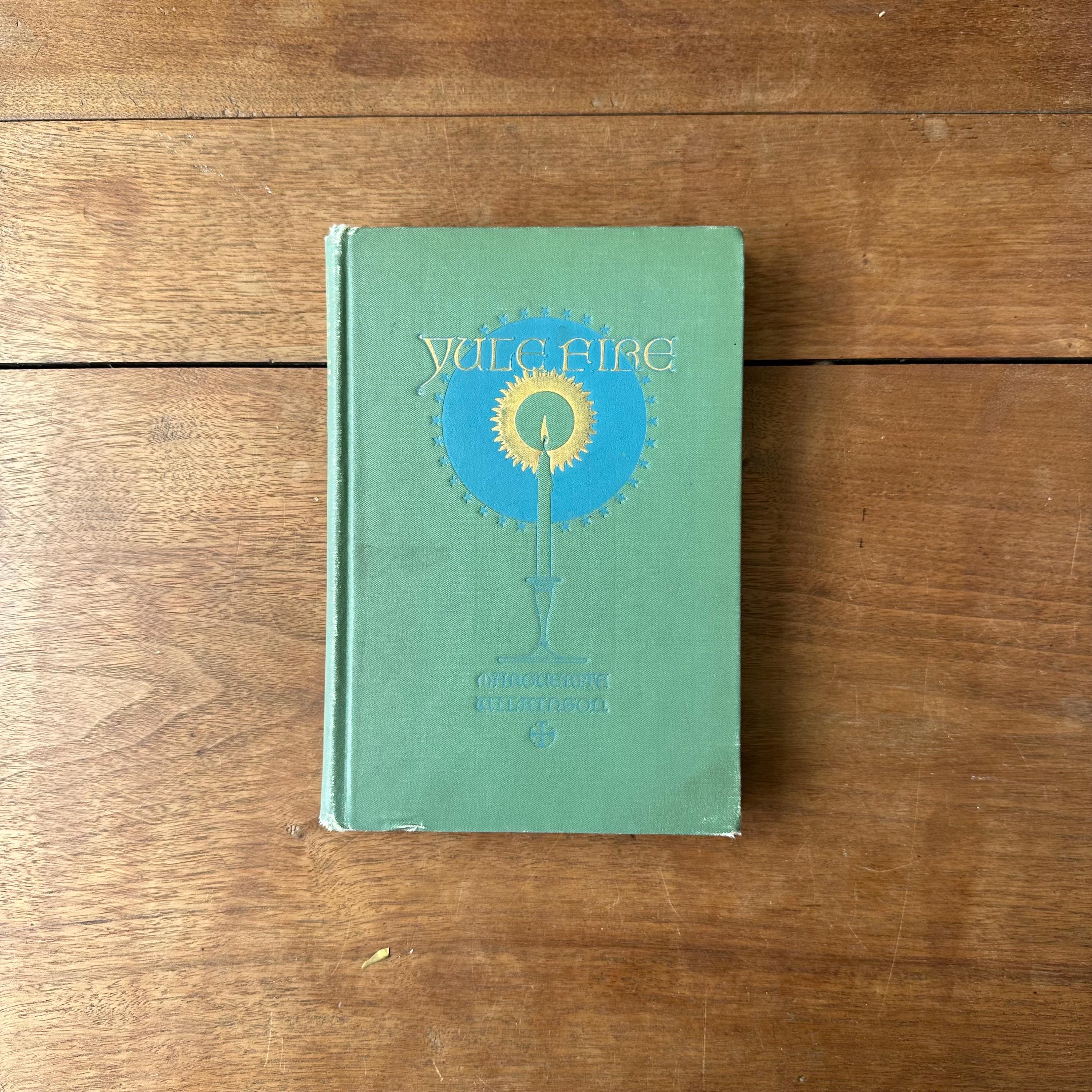 This is the 1926 reprinted edition of Yule Fire by Marguerite Wilkinson, published by The MacMillan Company. Yule Fire is a collection of Christmas poems with lovely black line illustrations throughout. The cover is light green with an illustration of a lit candle on the cover with details and lettering in gold. The spine is also lettered in gold with a candle decoration. The end papers are illustrated with red line drawings of the Christmas star, the wise men, and shepherds. There are 201 pages.