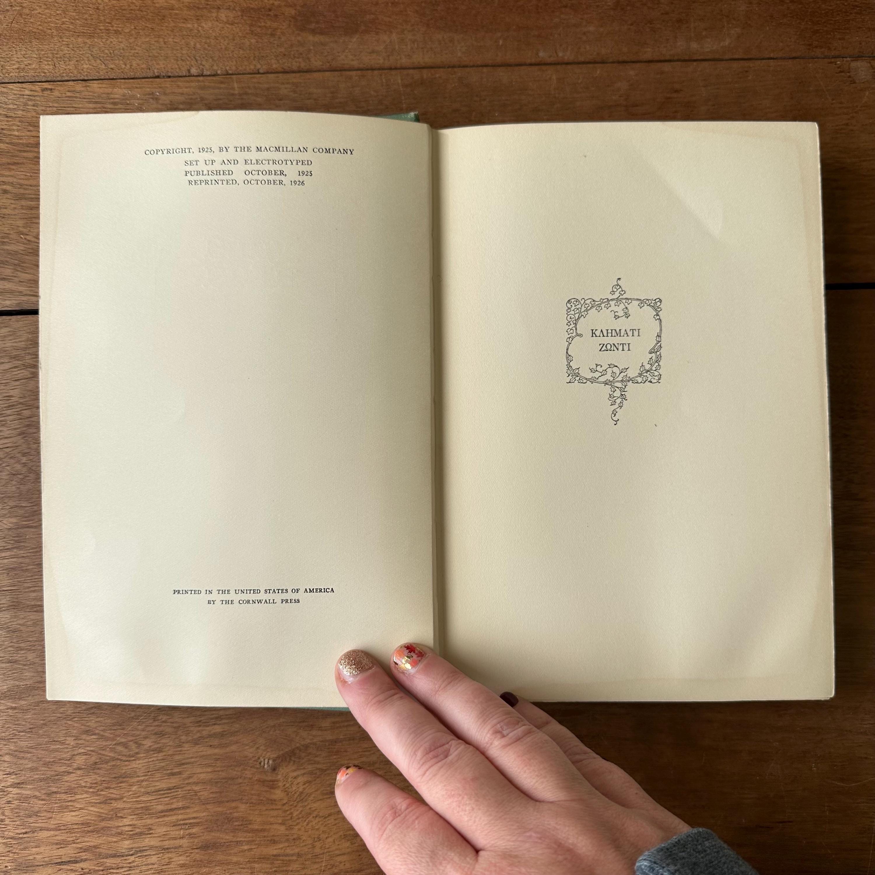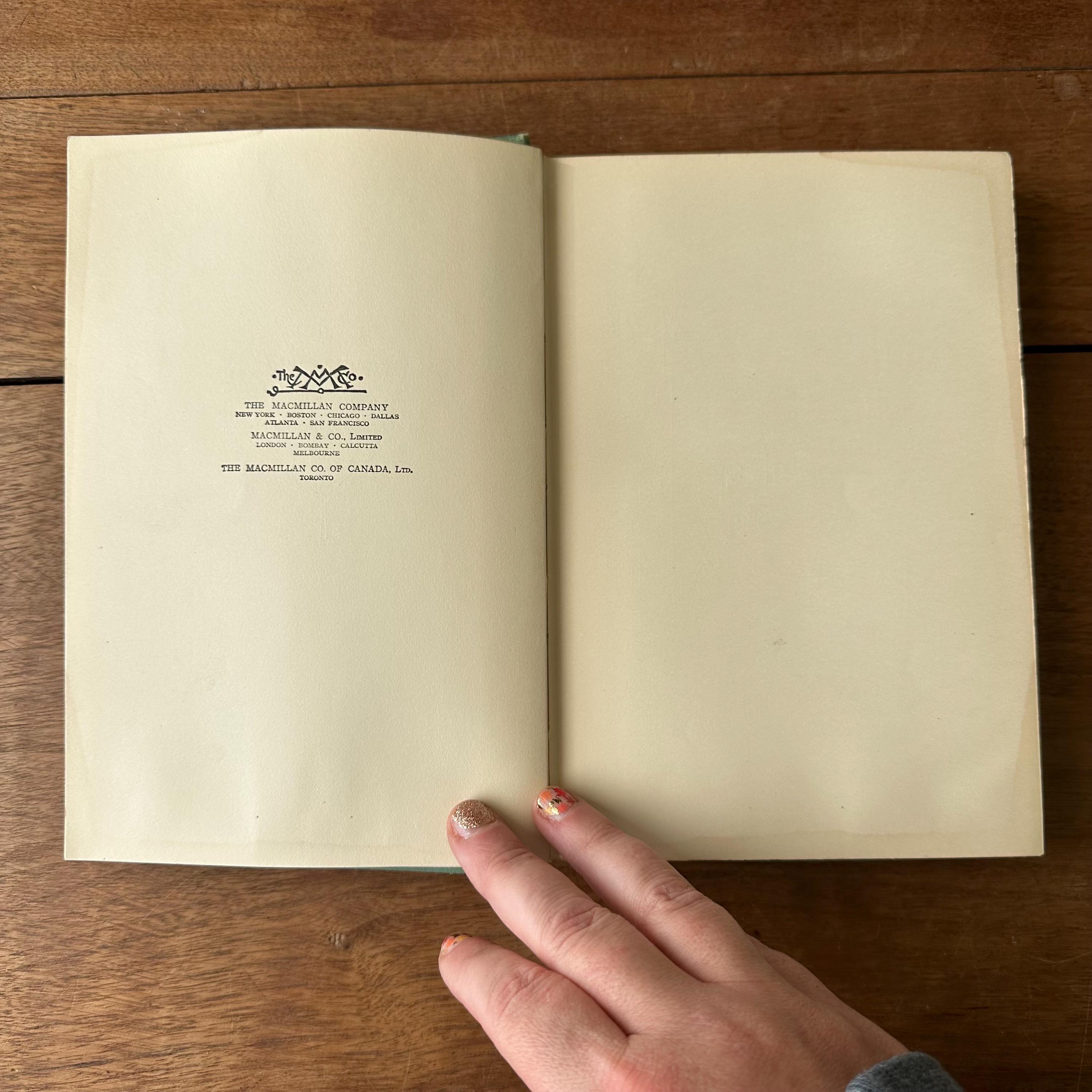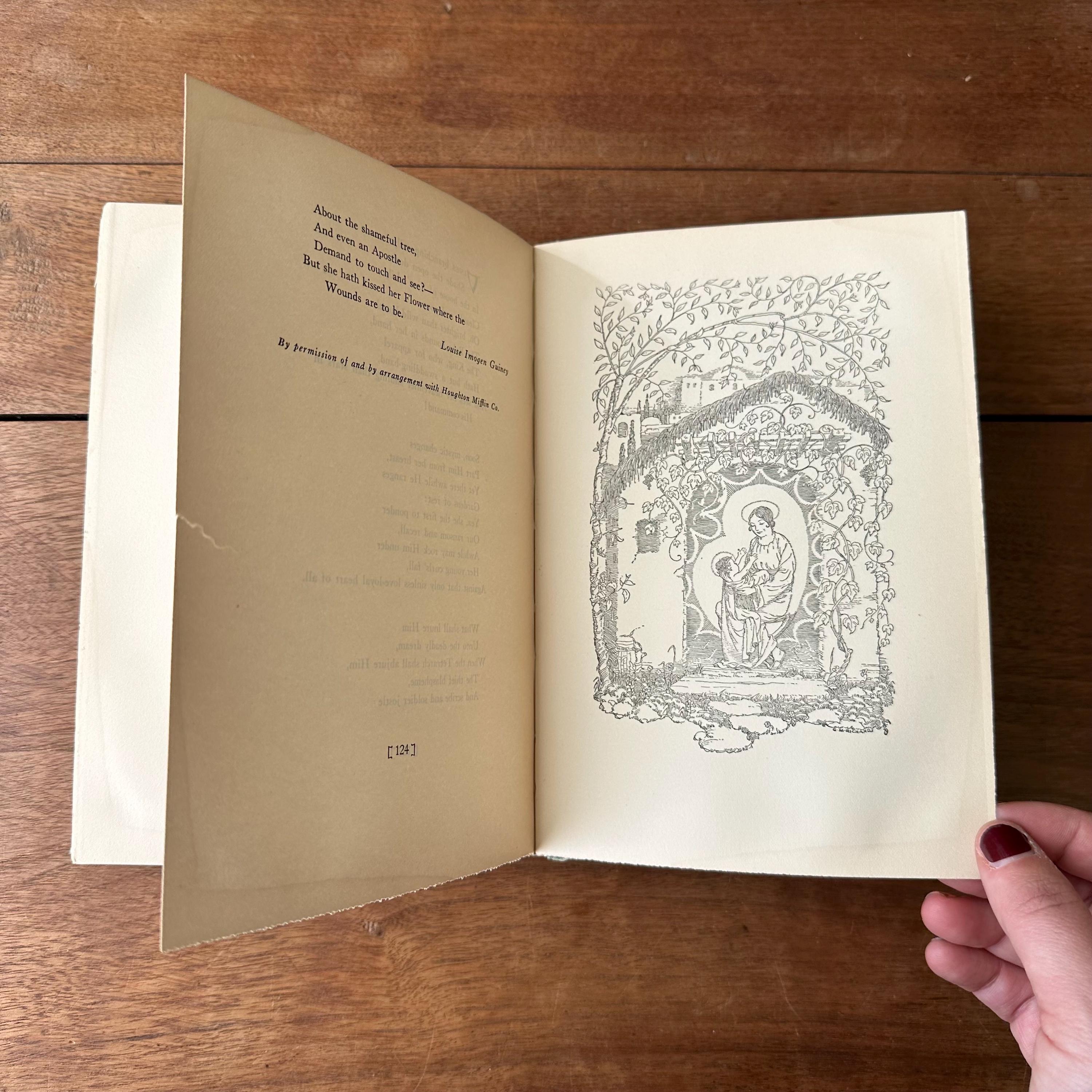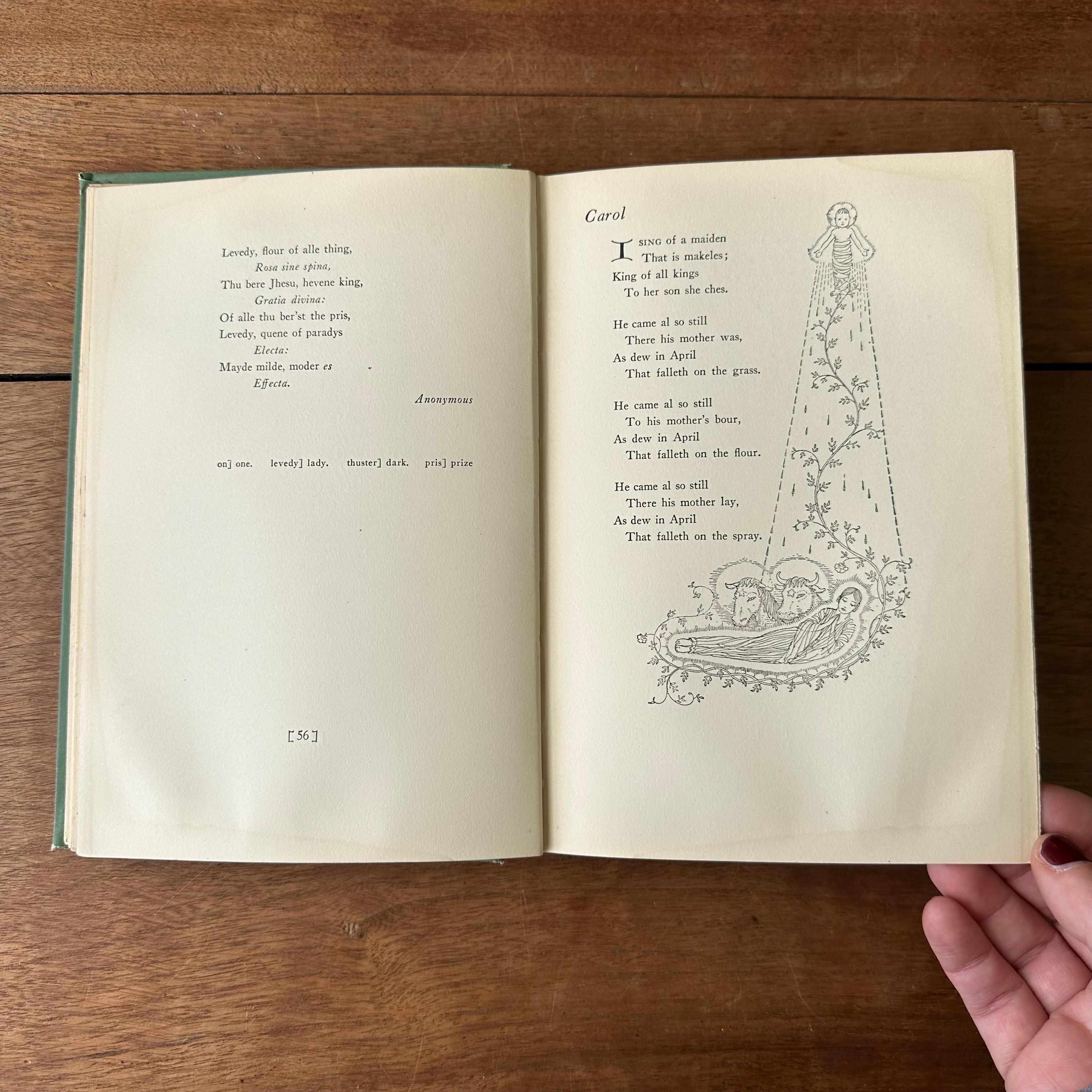This is the 1926 reprinted edition of Yule Fire by Marguerite Wilkinson, published by The MacMillan Company. Yule Fire is a collection of Christmas poems with lovely black line illustrations throughout. The cover is light green with an illustration of a lit candle on the cover with details and lettering in gold. The spine is also lettered in gold with a candle decoration. The end papers are illustrated with red line drawings of the Christmas star, the wise men, and shepherds. There are 201 pages.