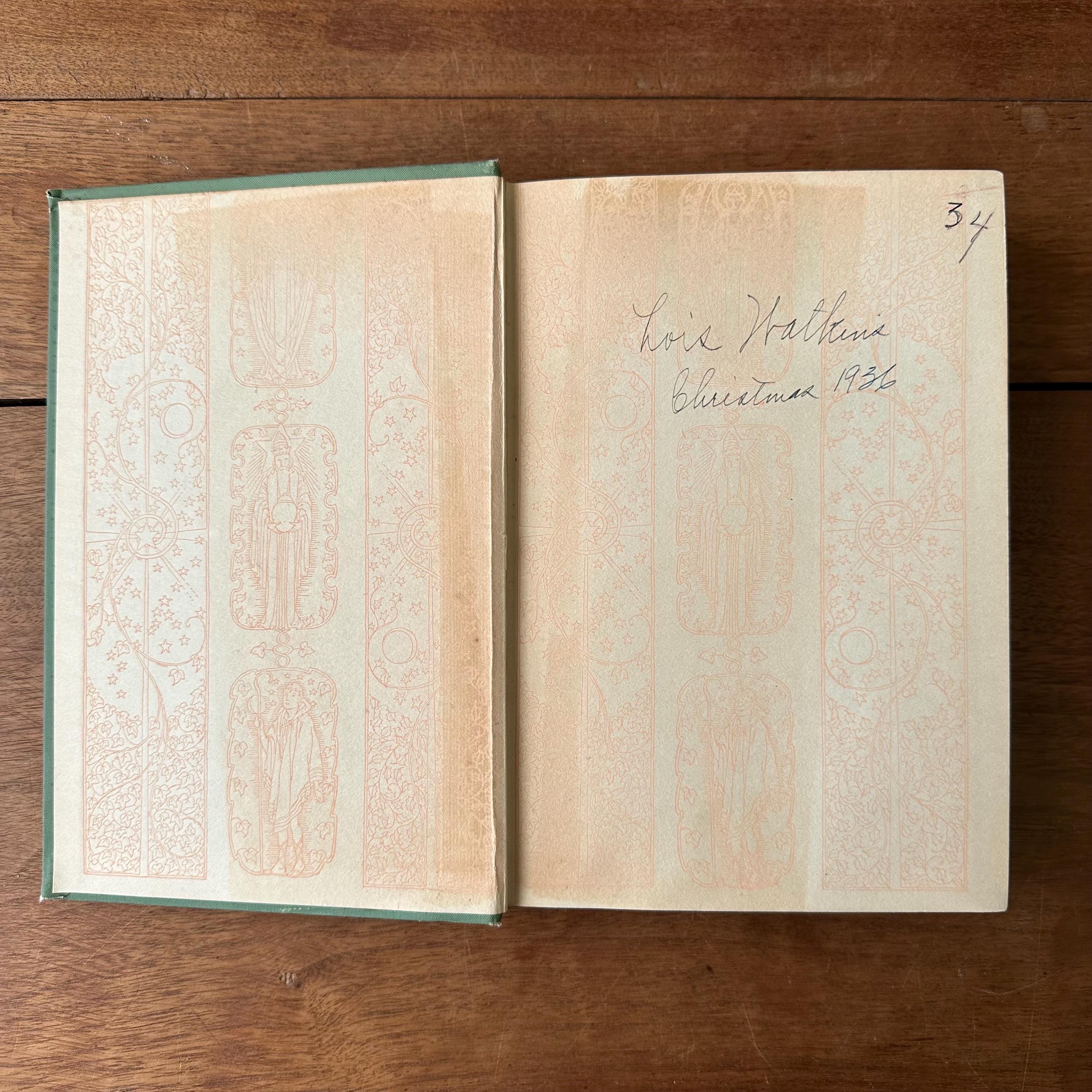 The book is in good vintage condition for its age and use. The cover has general wear with some fraying to the edges and corners. The candle illustration on the spine has faded, and the gold lettering on the spine and cover is beginning to fade. Lois Watkins wrote her name and Christmas 1936 inside the front cover in ink. She also wrote 34. The spines are still attached. The pages are yellowed.