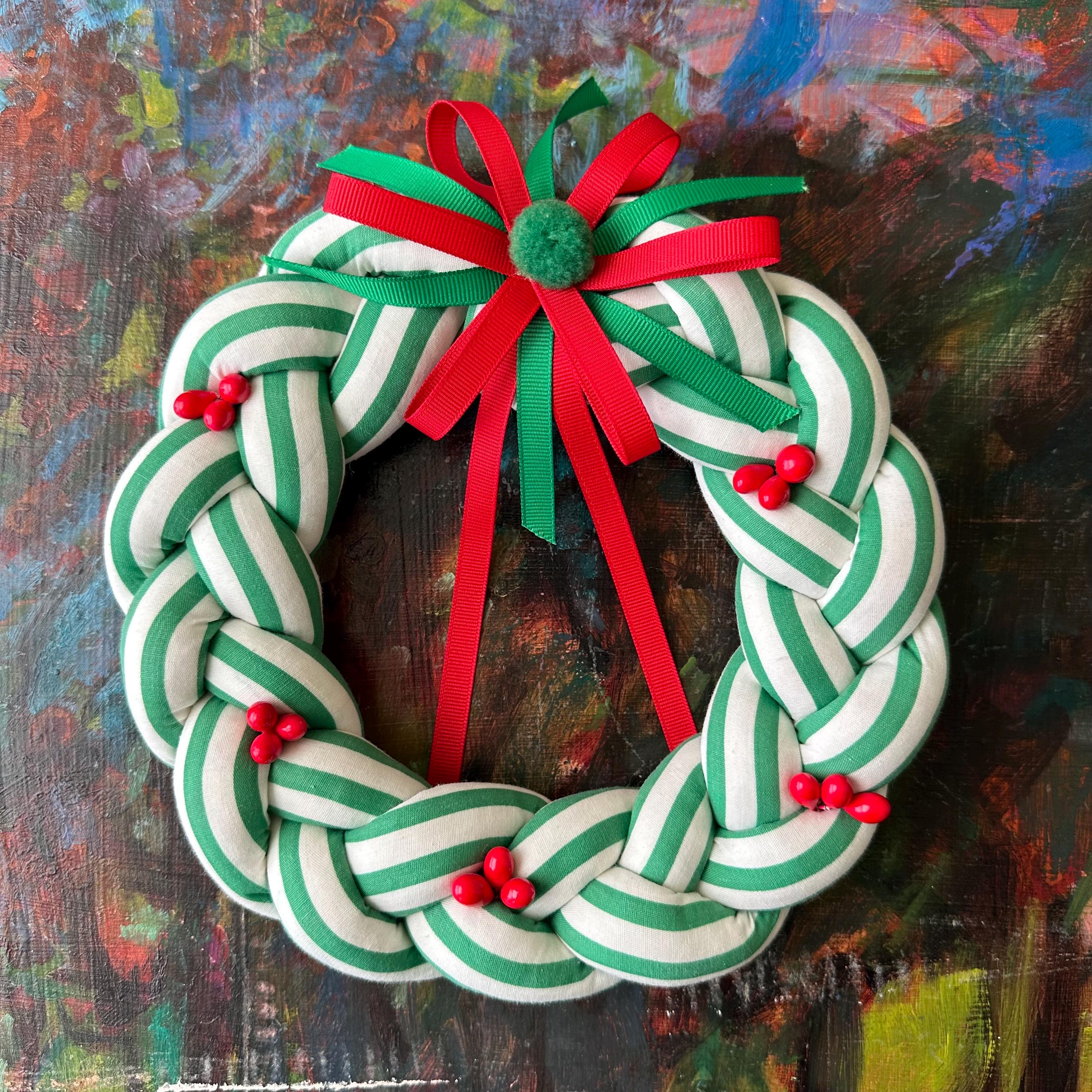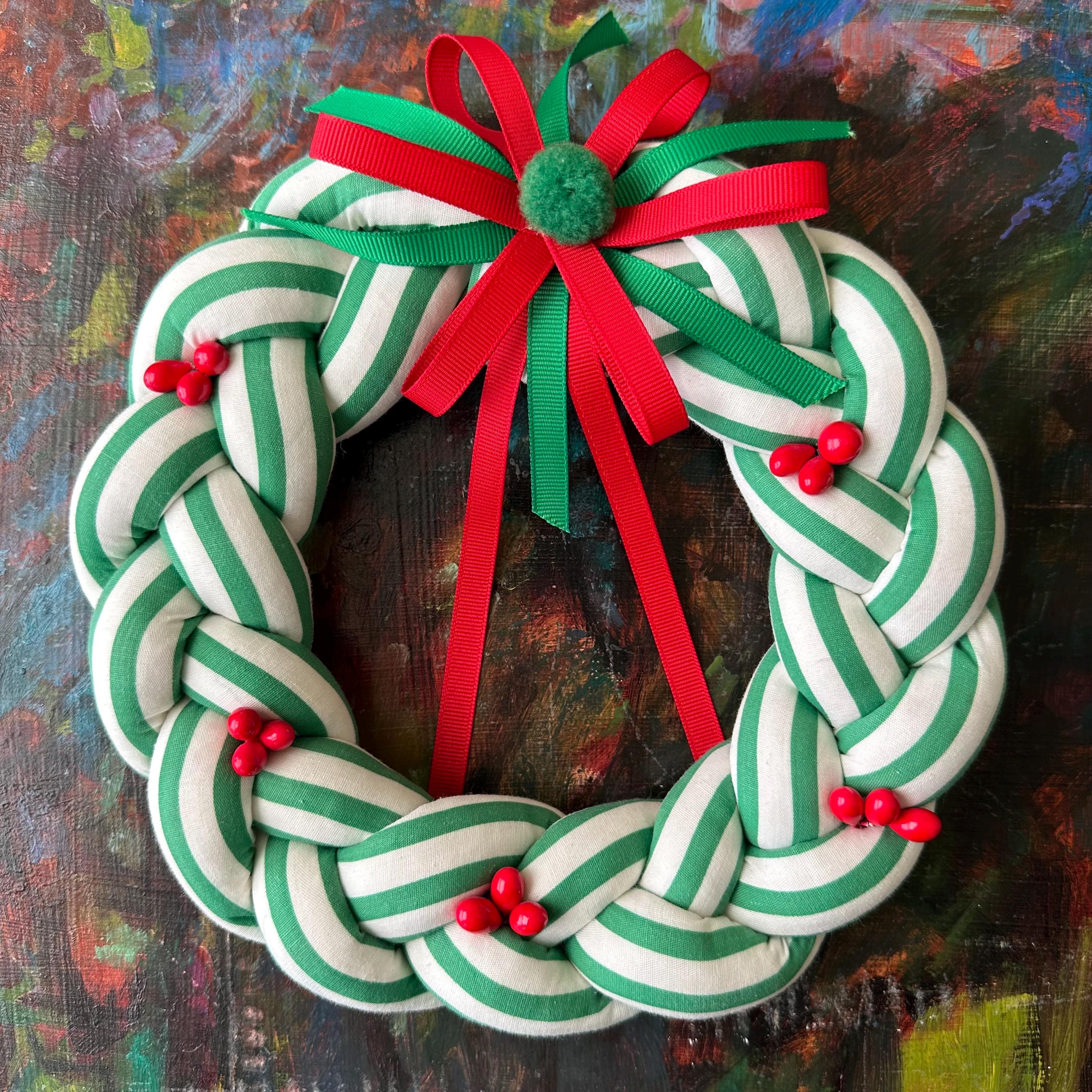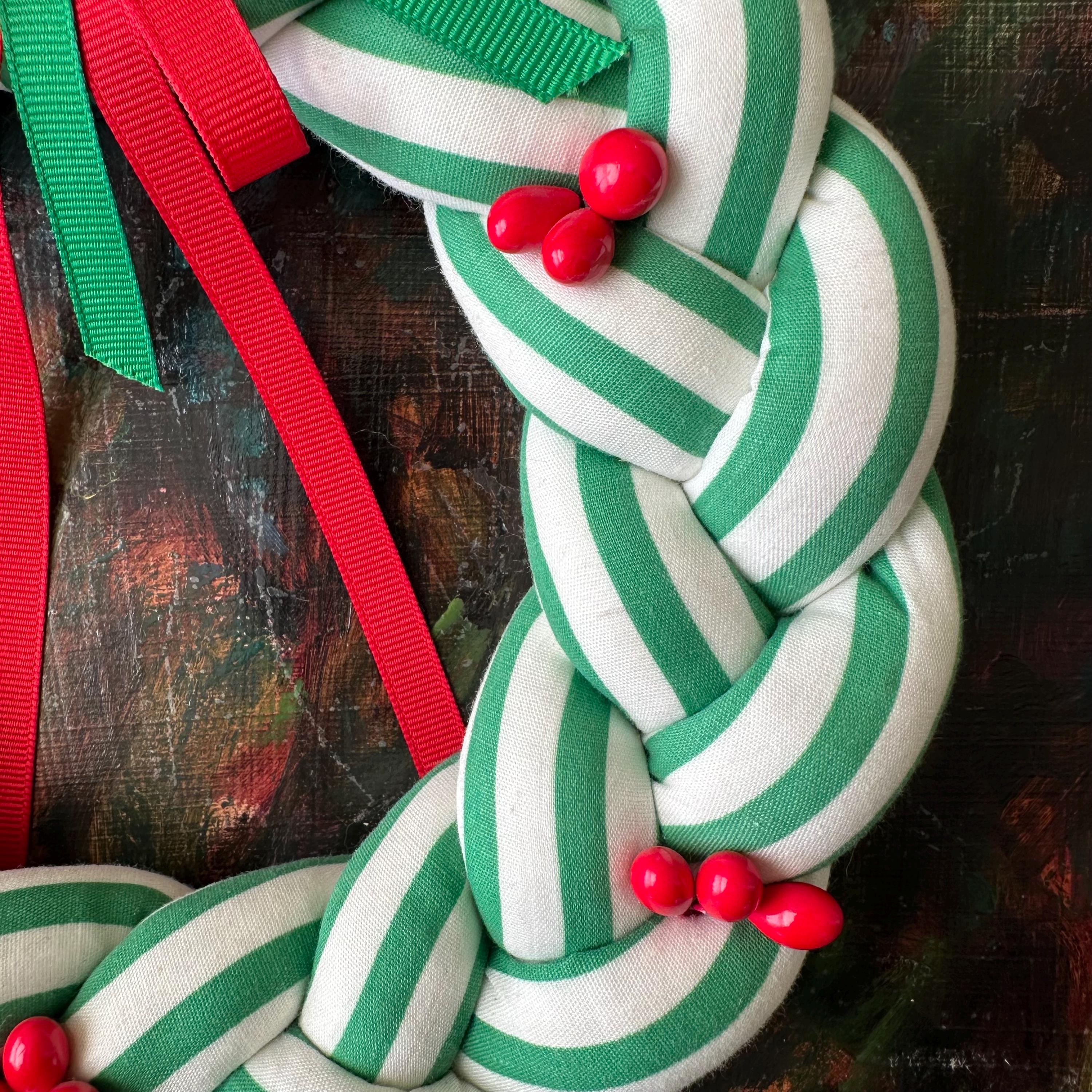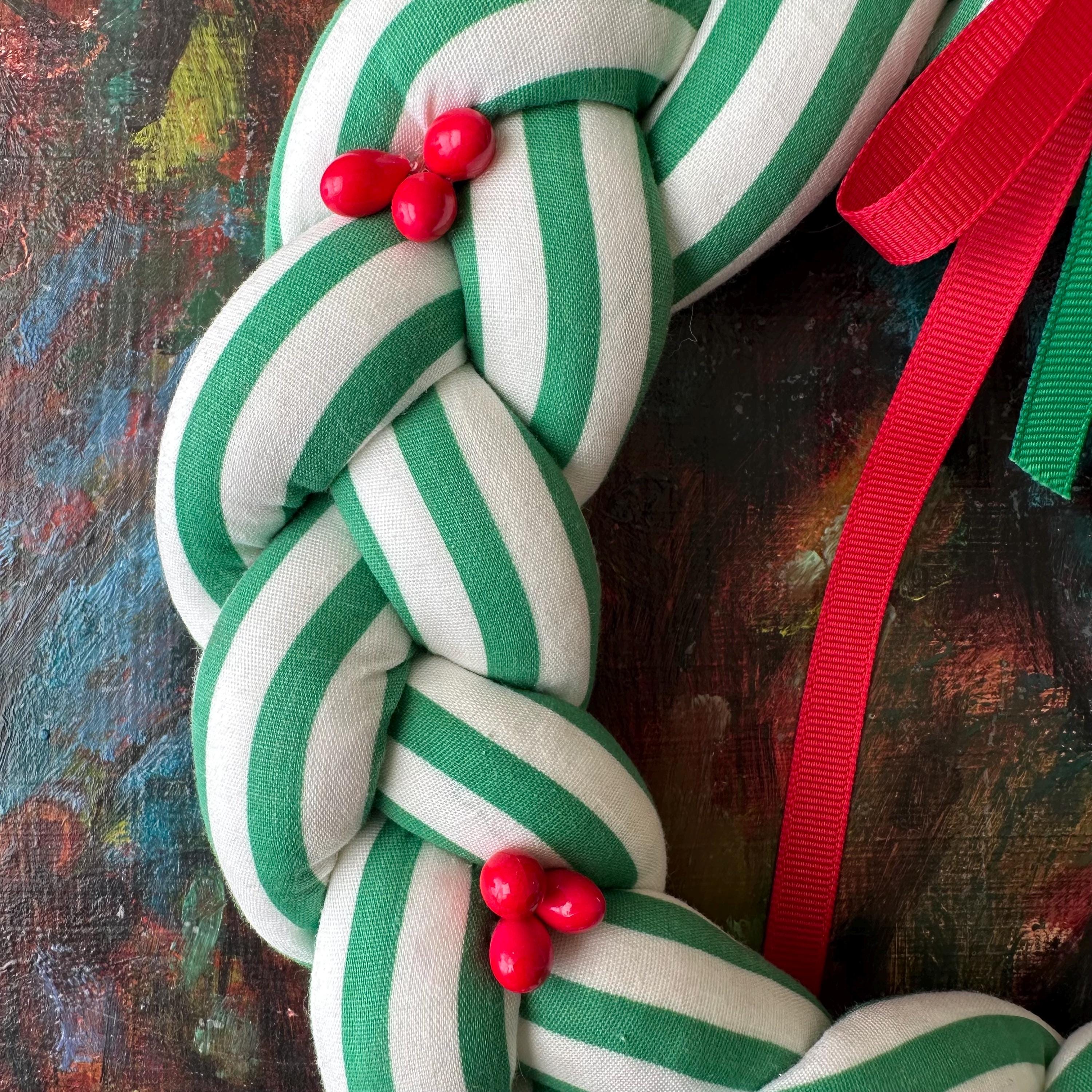 This is a braided stuffed fabric wreath in red, green, and white. The body of the wreath is green and white fabric that has been braided and stuffed to form the wreath. The wreath has 5 red painted foam holly berry bunches tucked into the braid. The top has a green and red ribbon bow with a green fuzzy pom pom in the center. The back has a green thread loop to hang the wreath.