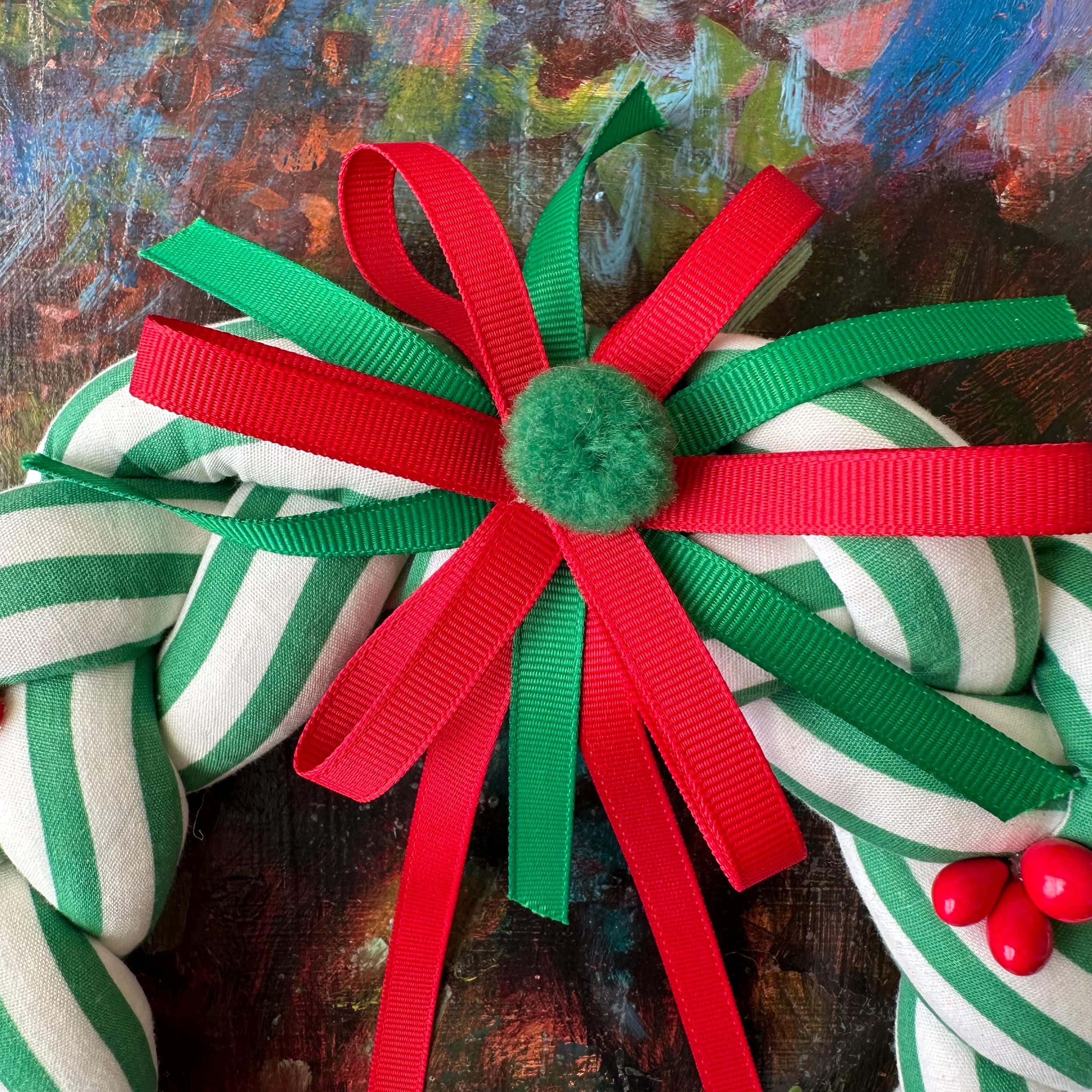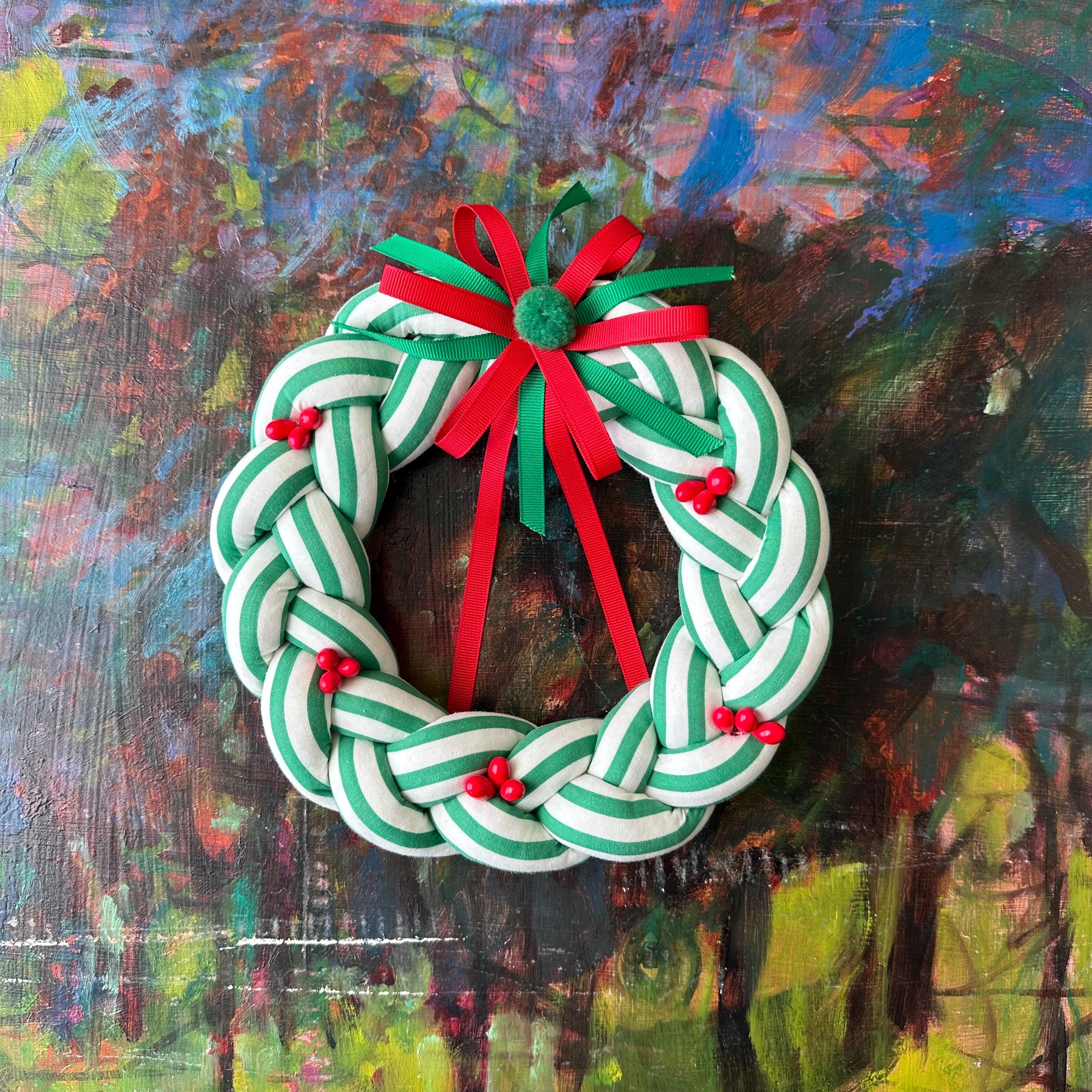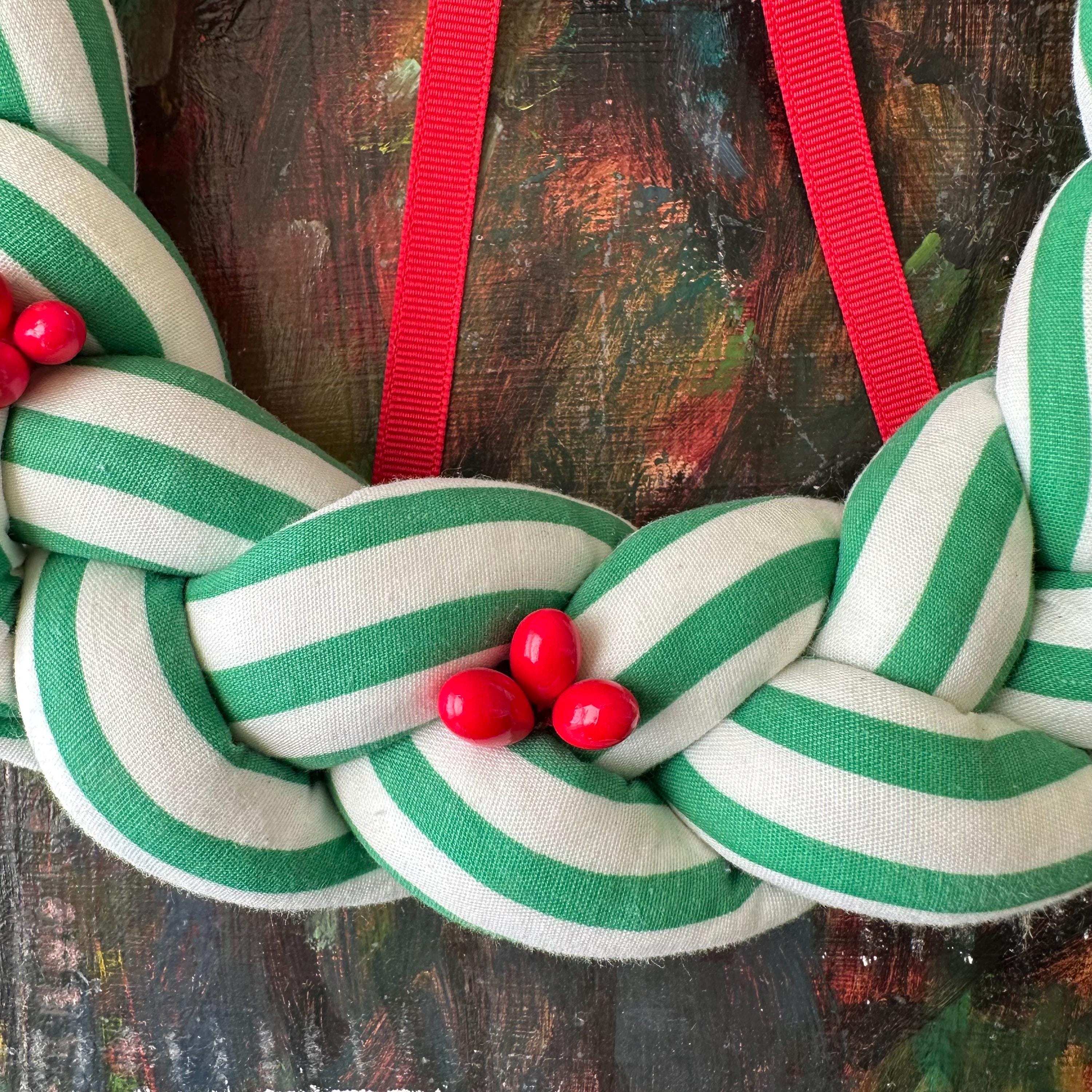 This is a braided stuffed fabric wreath in red, green, and white. The body of the wreath is green and white fabric that has been braided and stuffed to form the wreath. The wreath has 5 red painted foam holly berry bunches tucked into the braid. The top has a green and red ribbon bow with a green fuzzy pom pom in the center. The back has a green thread loop to hang the wreath.