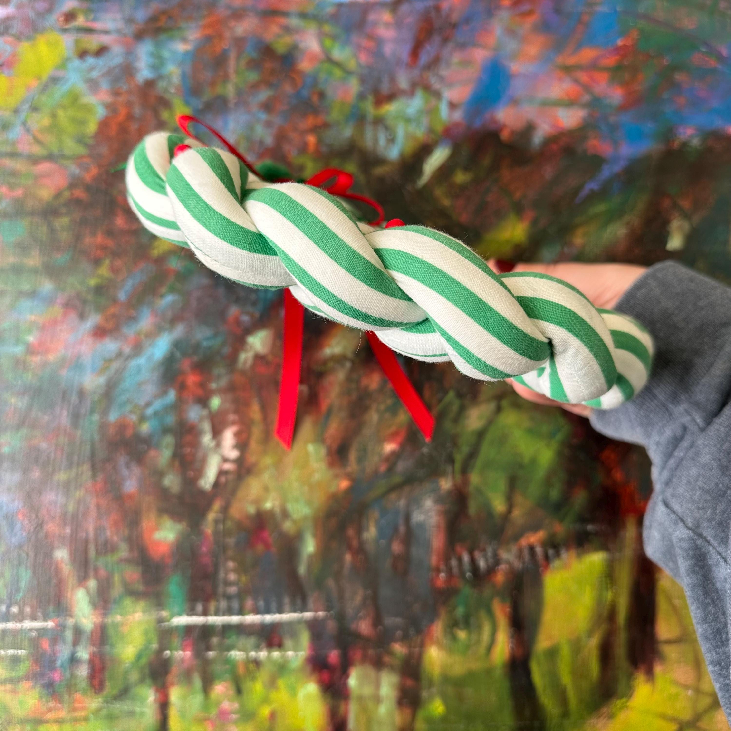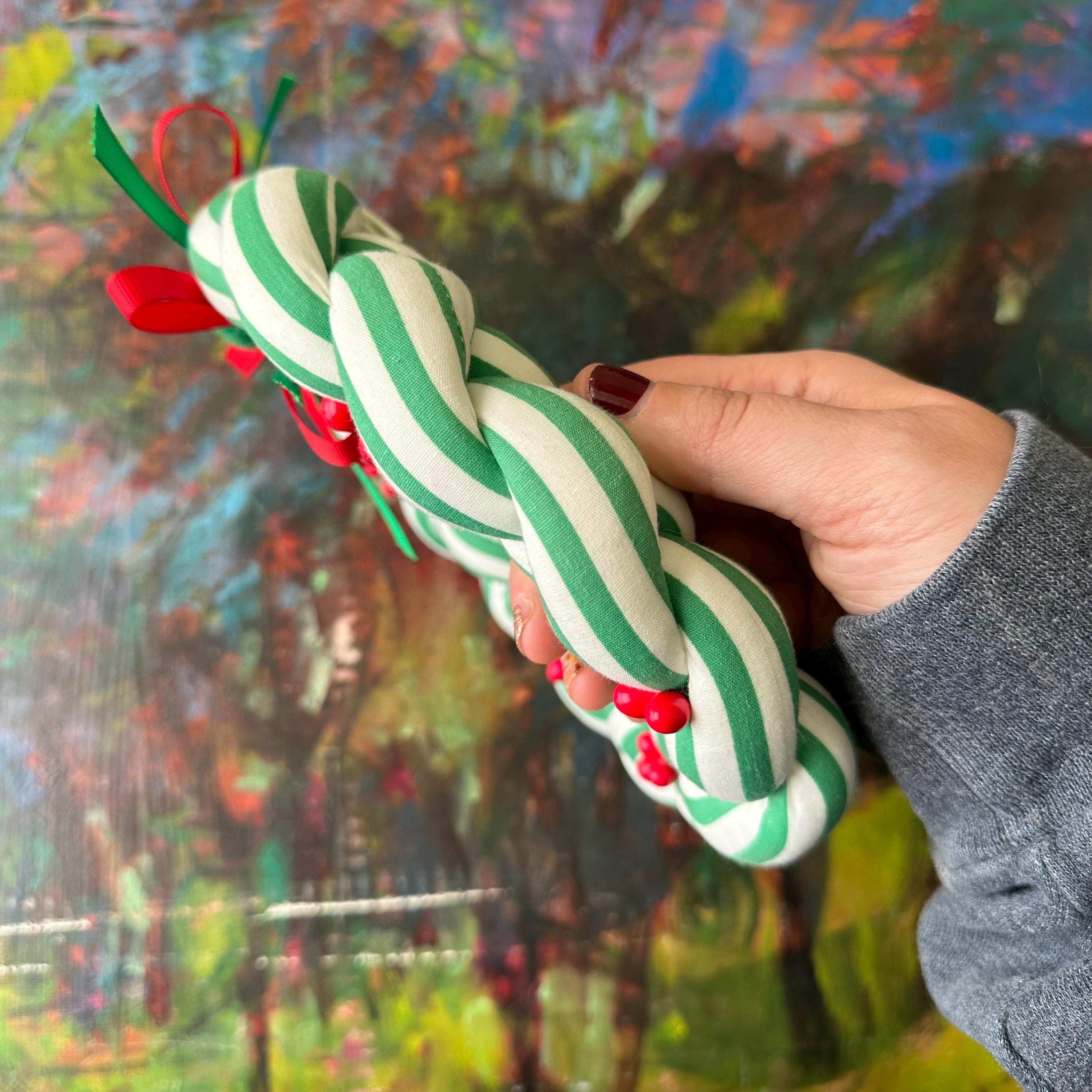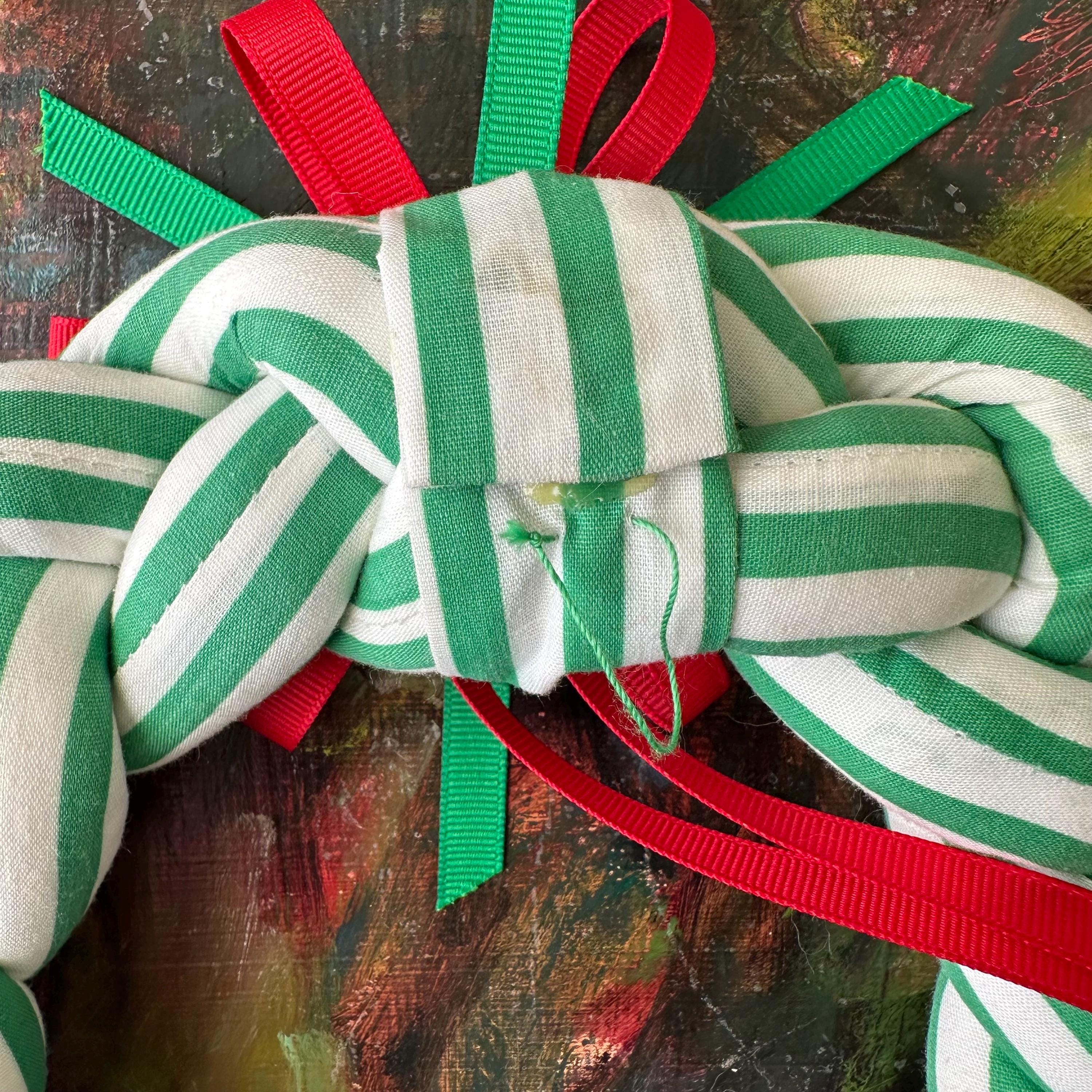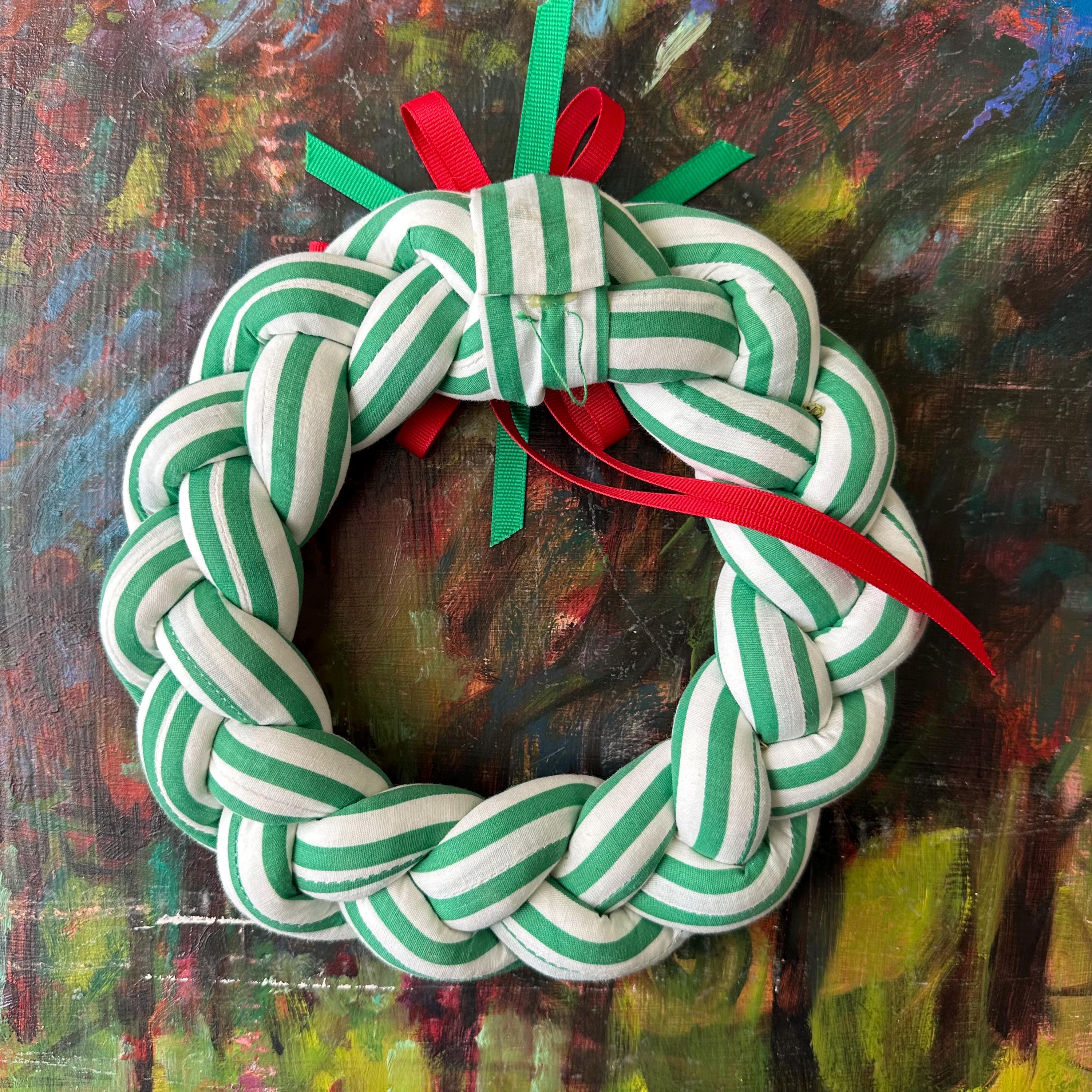 This is a braided stuffed fabric wreath in red, green, and white. The body of the wreath is green and white fabric that has been braided and stuffed to form the wreath. The wreath has 5 red painted foam holly berry bunches tucked into the braid. The top has a green and red ribbon bow with a green fuzzy pom pom in the center. The back has a green thread loop to hang the wreath.