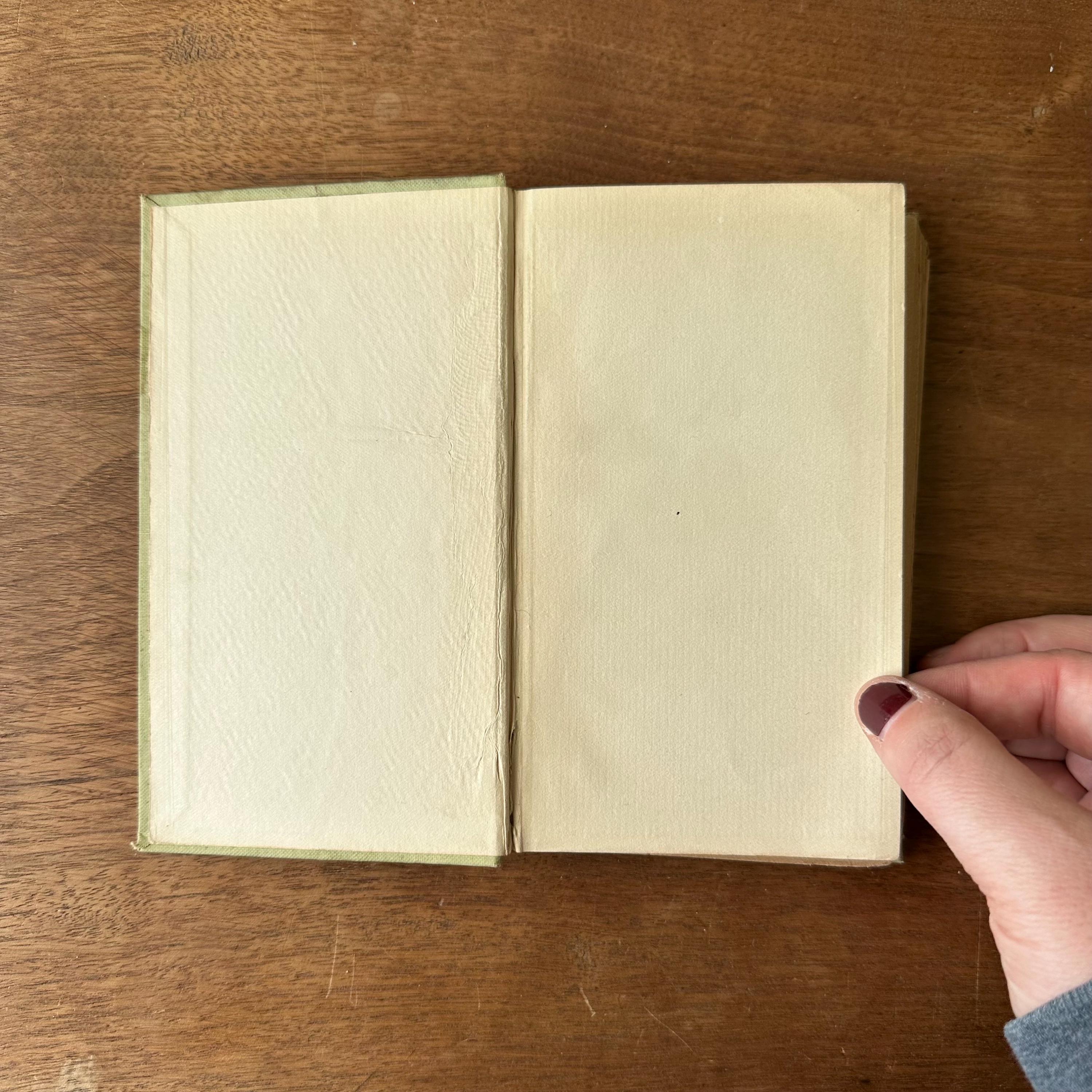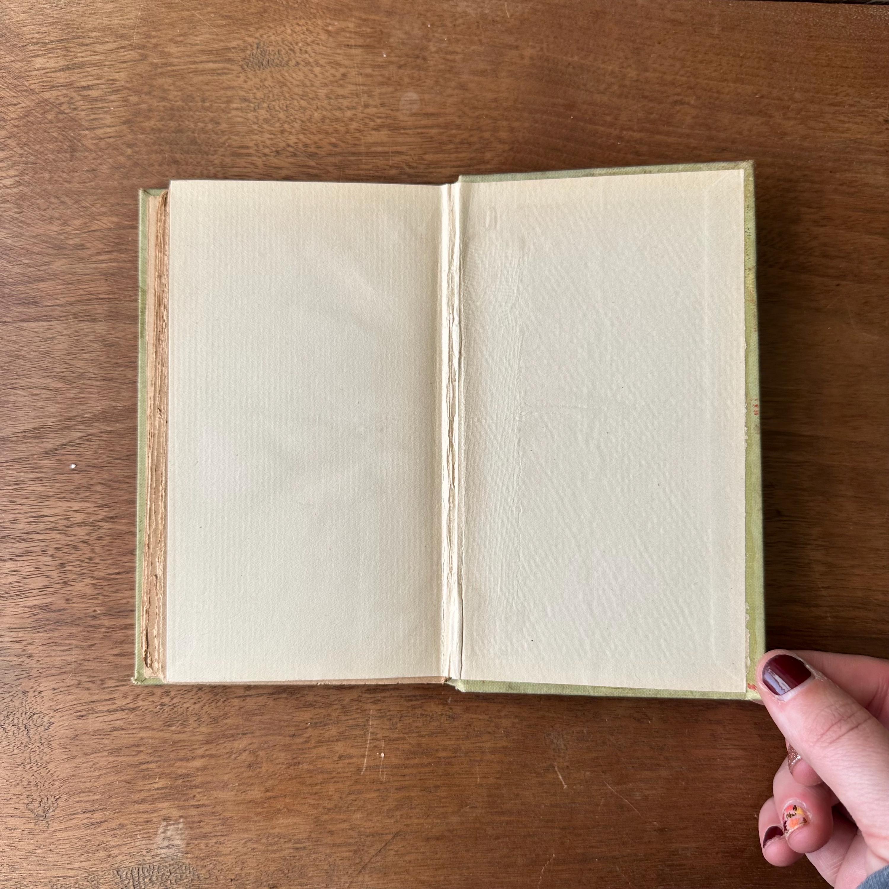 The book is in fragile condition for its age and use. The covers have wear and staining. The front cover has detached fully at the title page. The back cover is still attached. The pages are still sewn together but they are wobbly in their stitches. The pages are very yellowed almost light brown.