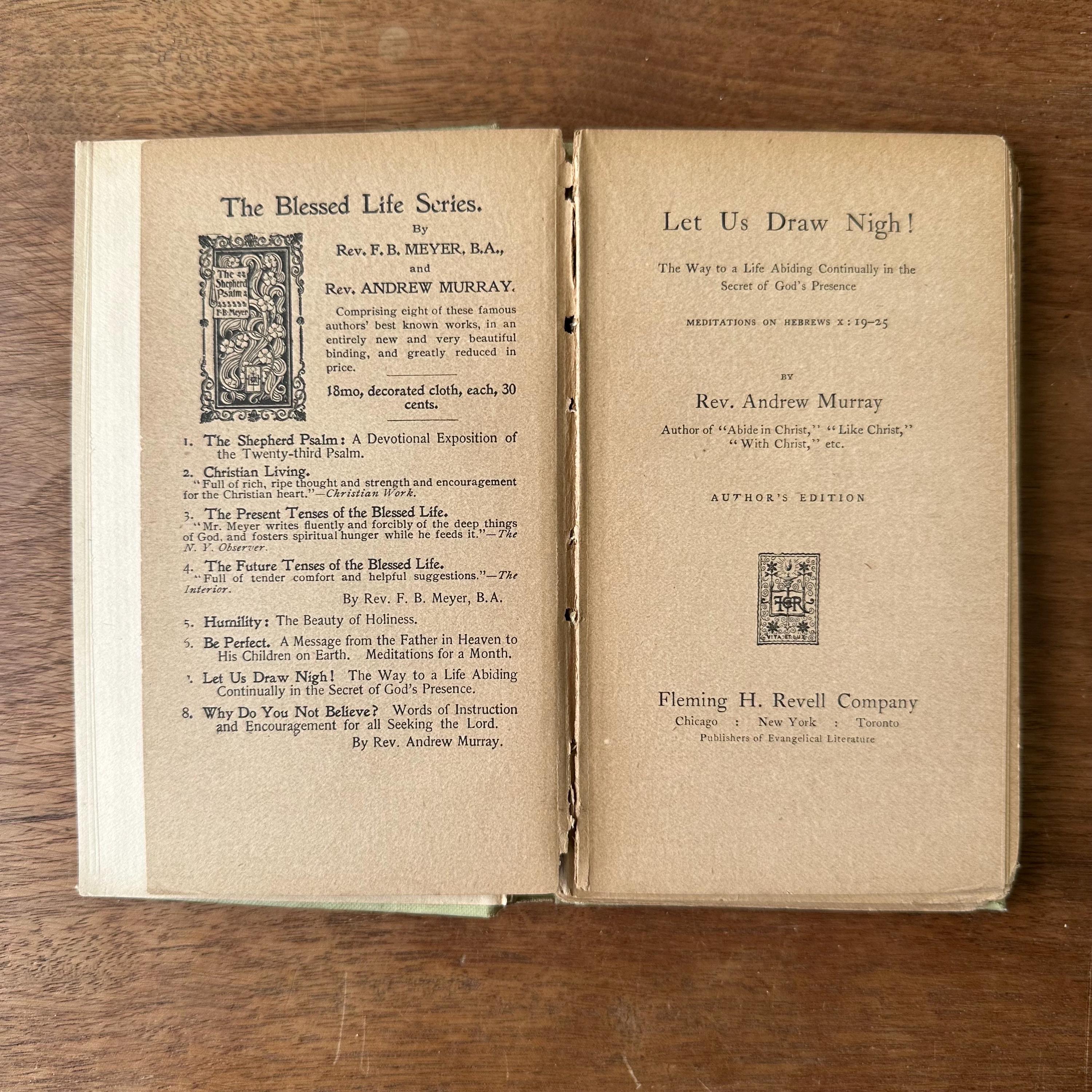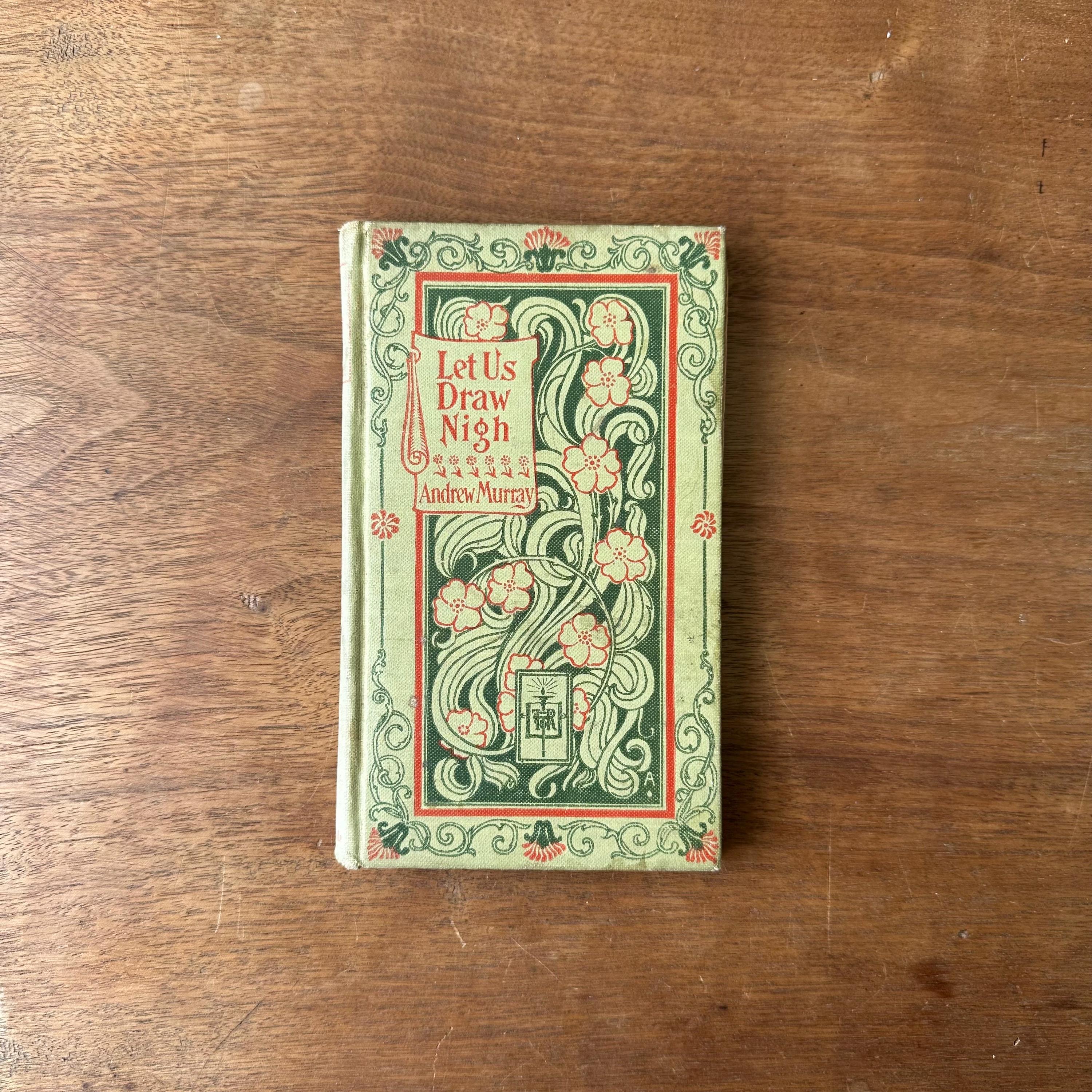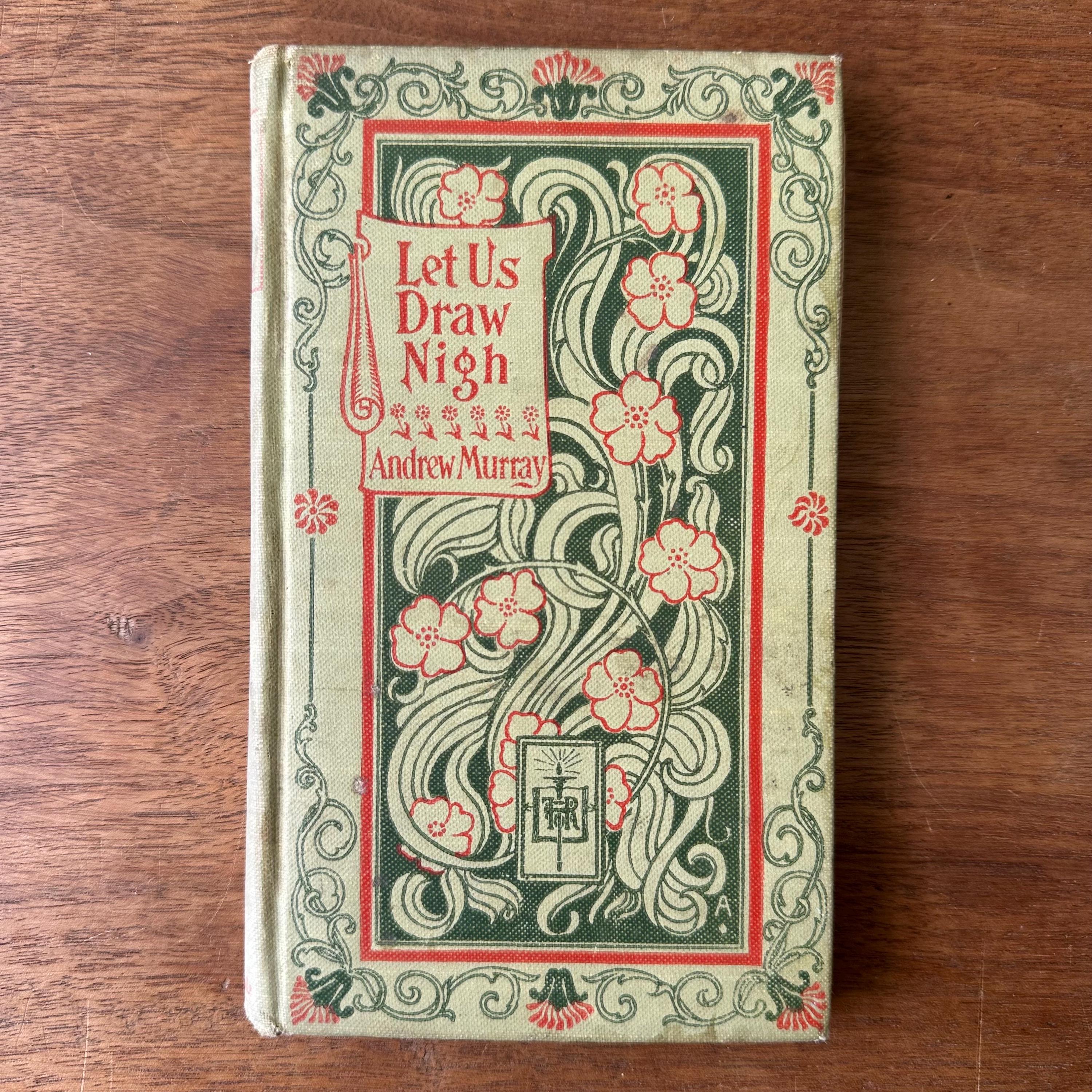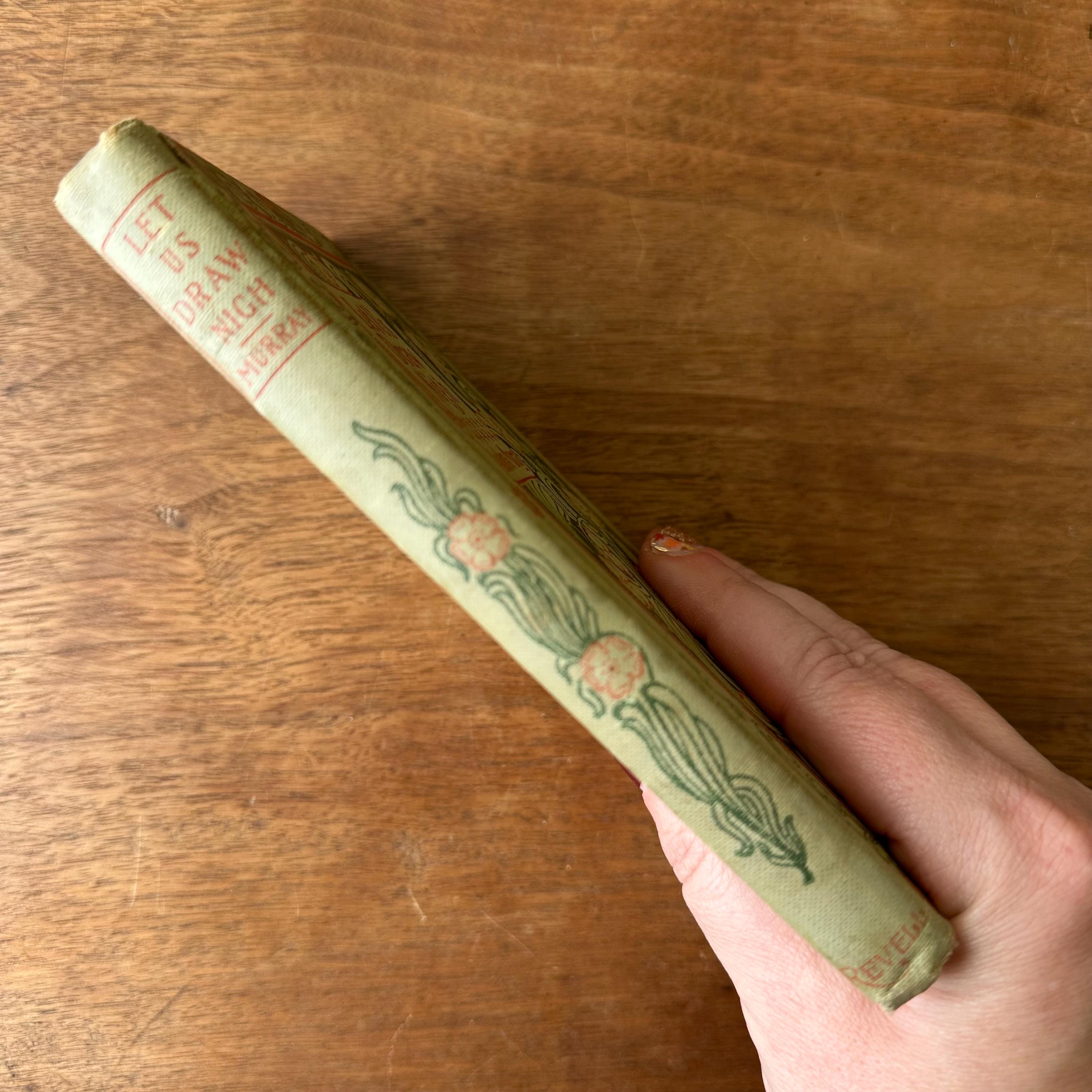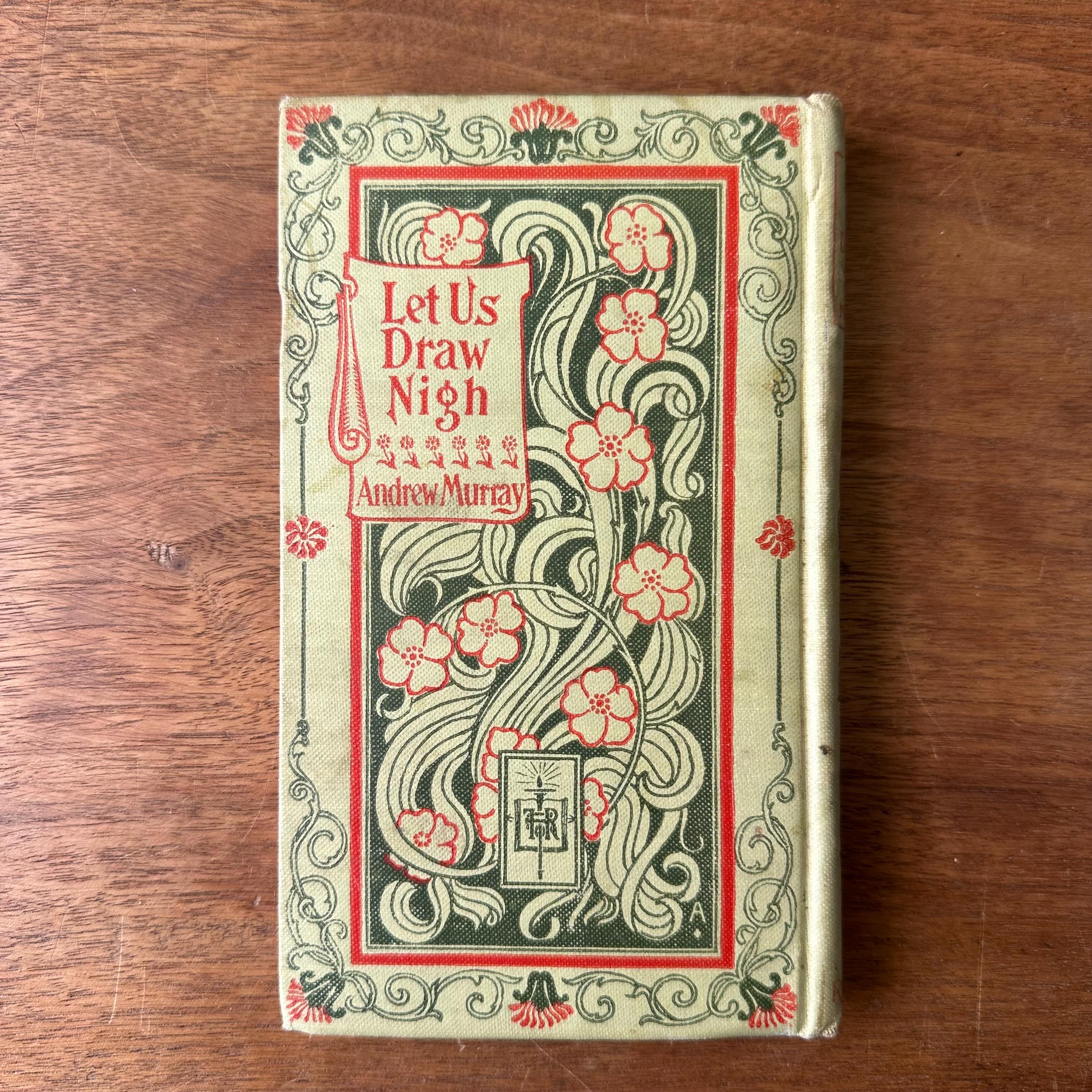 This is an undated, probably antique Author's Edition of Let Us Draw Nigh! by the Reverend Andrew Murray, published by the Fleming H. Revell Company. The book is a collection of Murray's meditations on Hebrews X: 19-25. Hebrews Chapter 10, Verse 19-25 is a call to support and love others as they do good deeds. The book has light green covers. The covers and spine are fully illustrated with flowers and vines in dark green and red. The book is miniature sized with 94 pages.