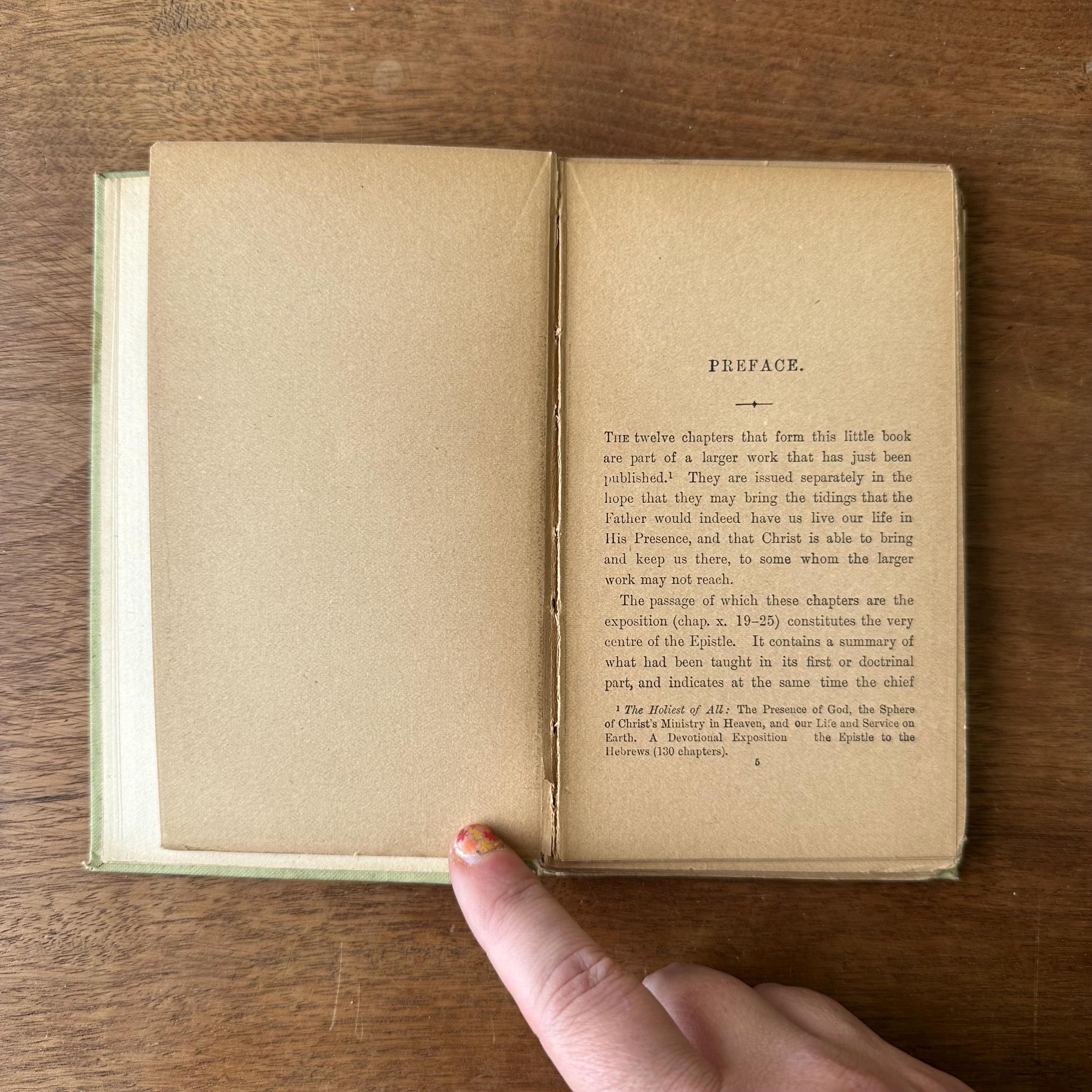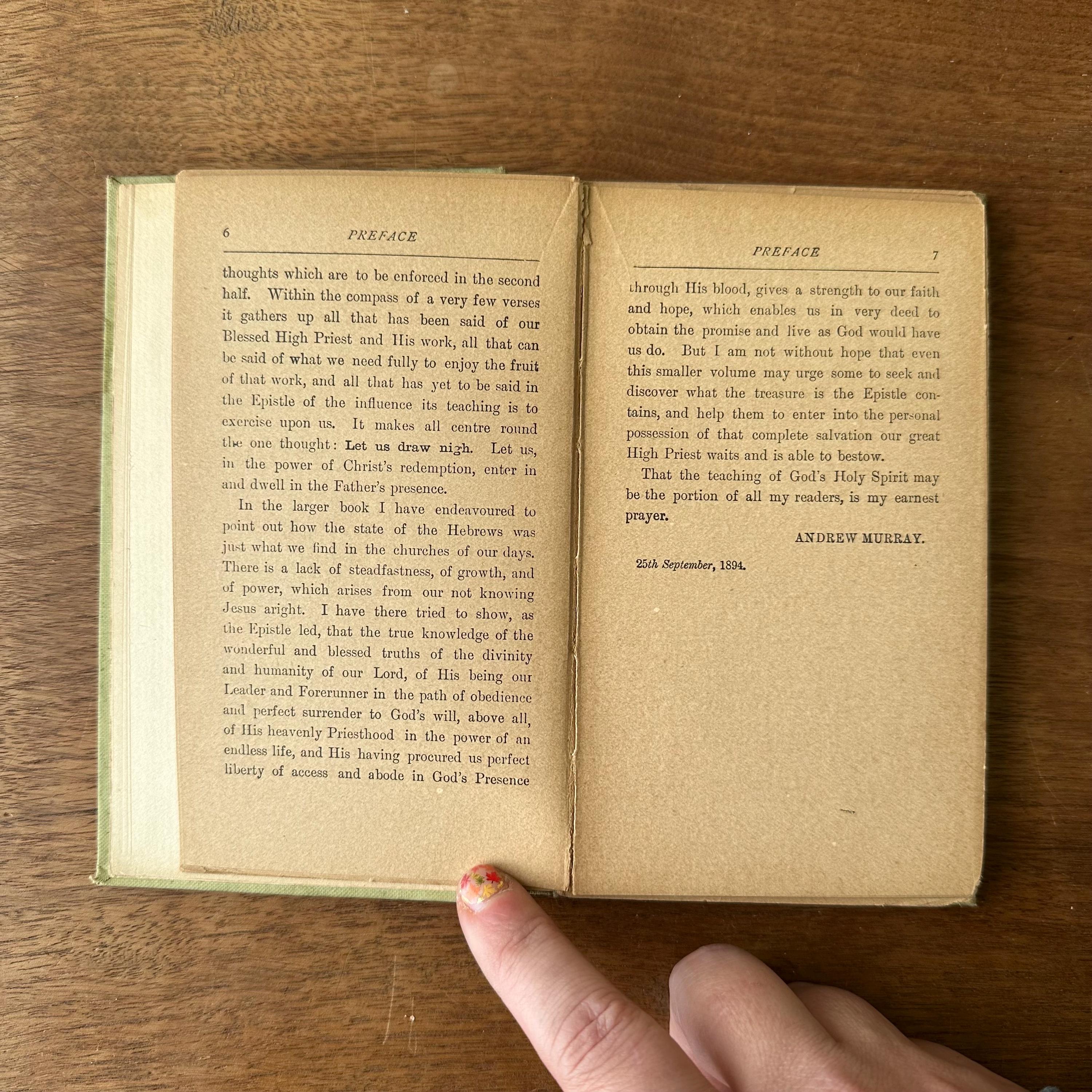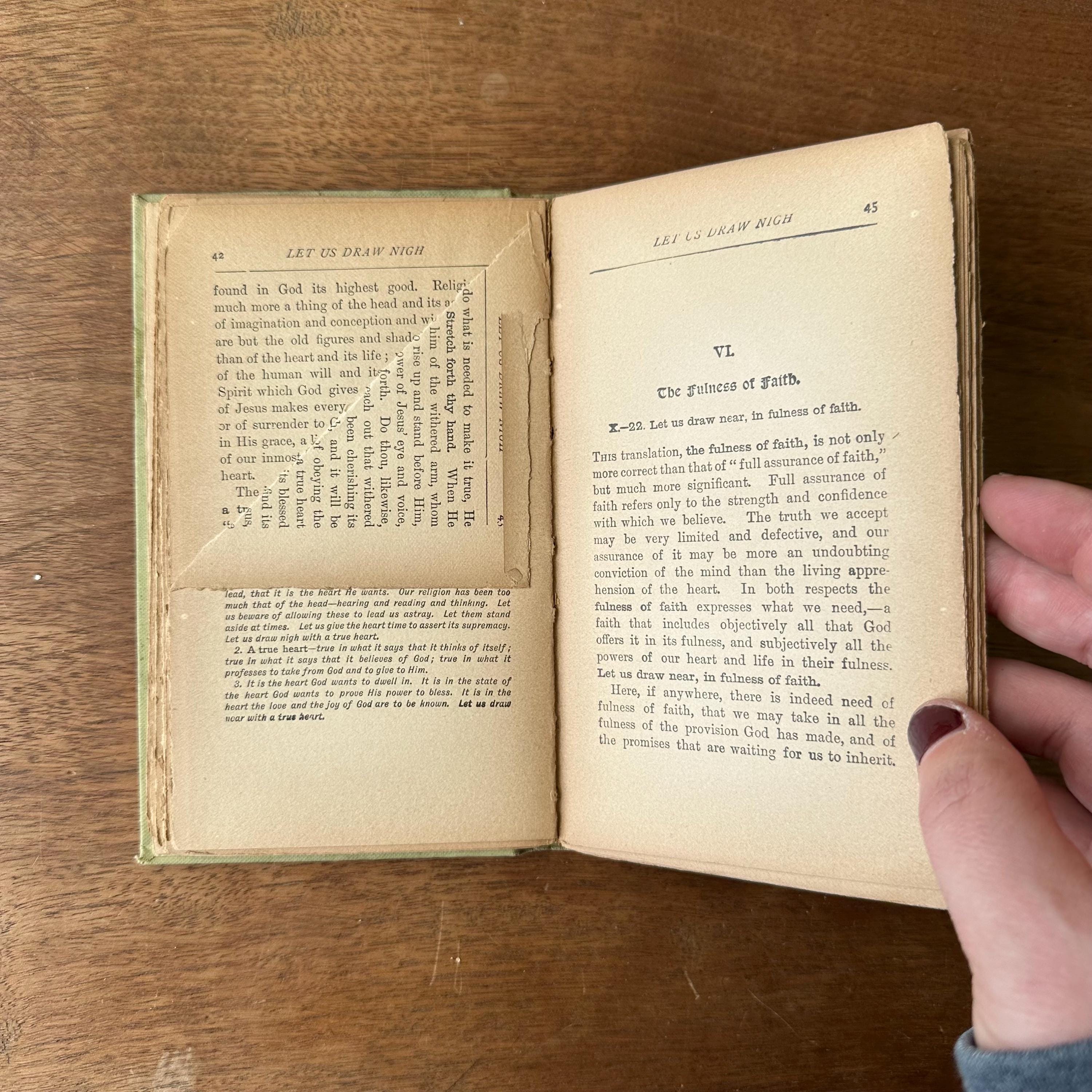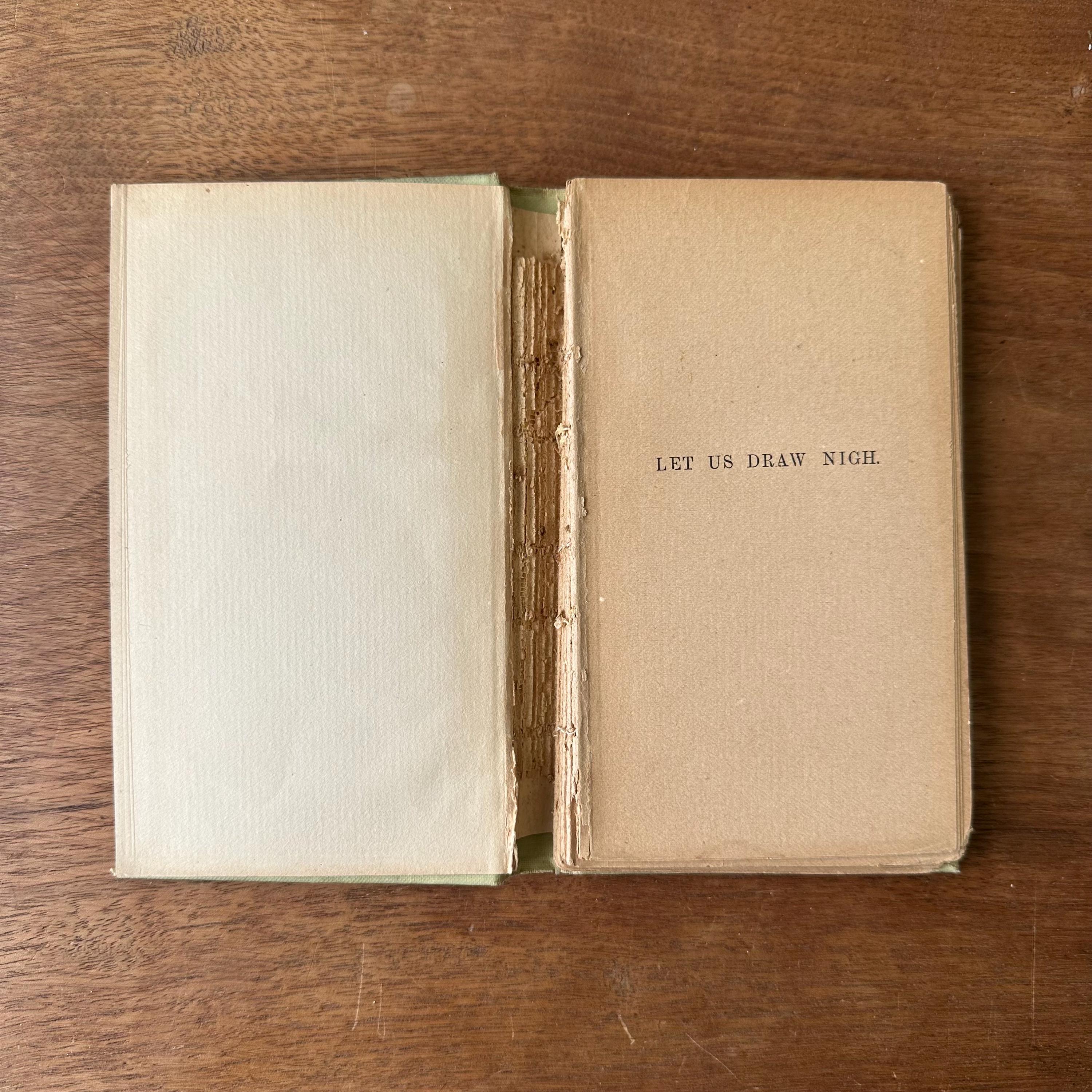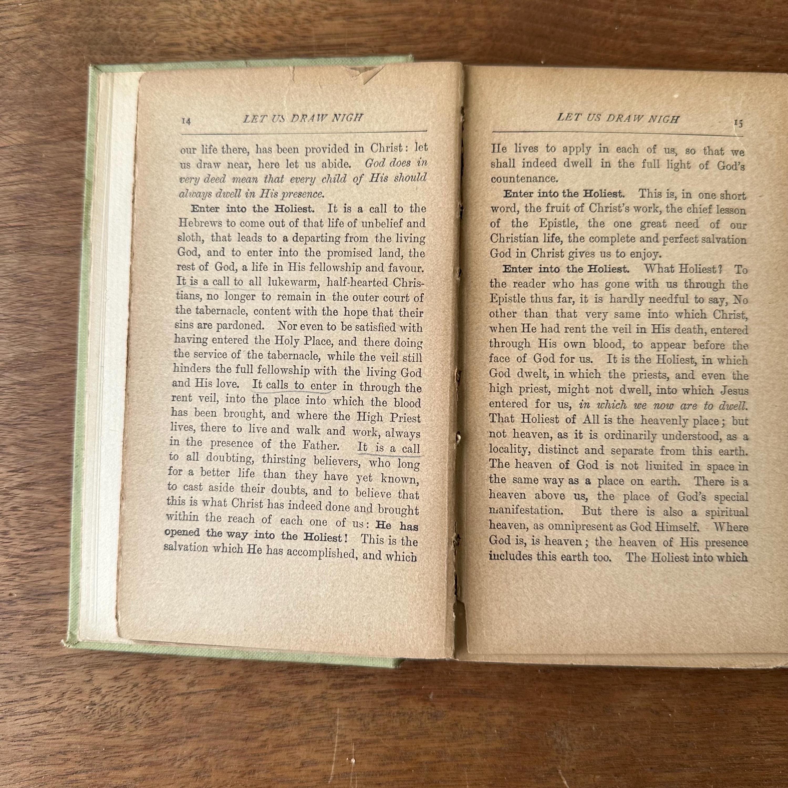 This is an undated, probably antique Author's Edition of Let Us Draw Nigh! by the Reverend Andrew Murray, published by the Fleming H. Revell Company. The book is a collection of Murray's meditations on Hebrews X: 19-25. Hebrews Chapter 10, Verse 19-25 is a call to support and love others as they do good deeds. The book has light green covers. The covers and spine are fully illustrated with flowers and vines in dark green and red. The book is miniature sized with 94 pages.