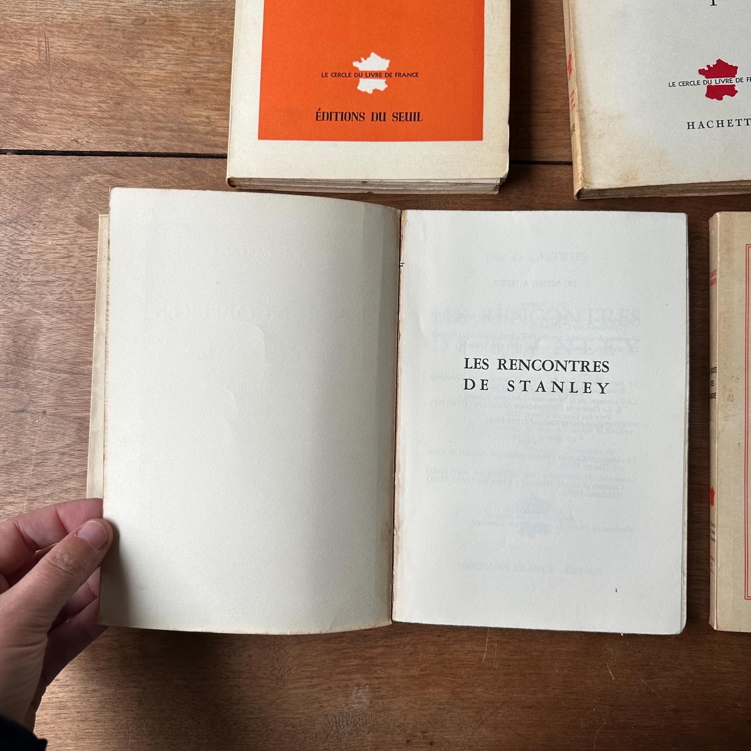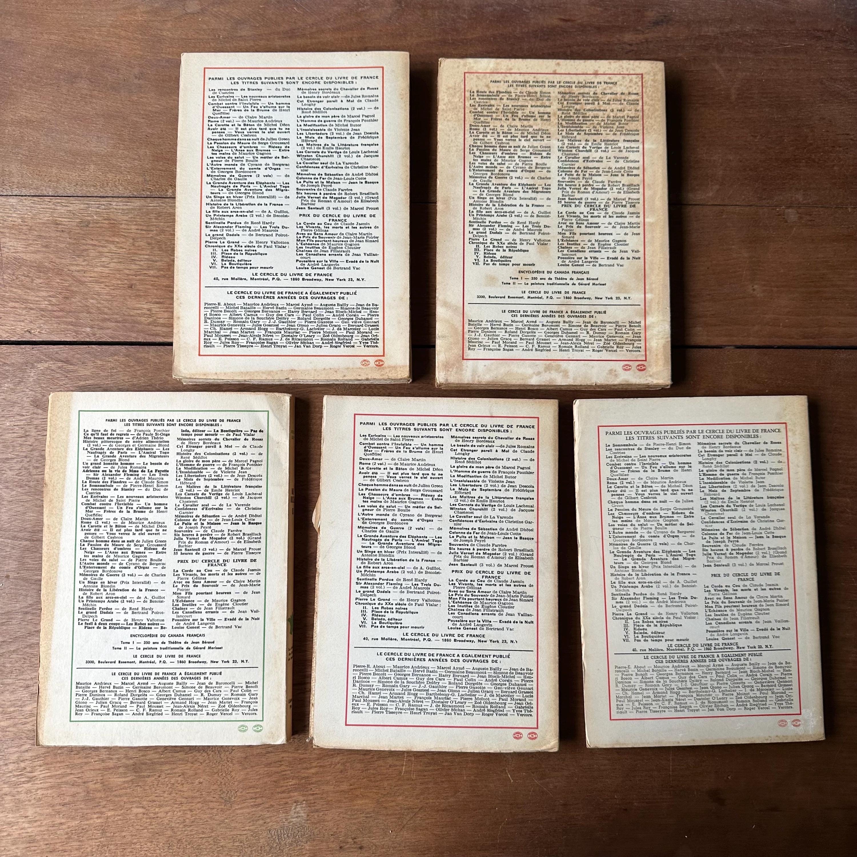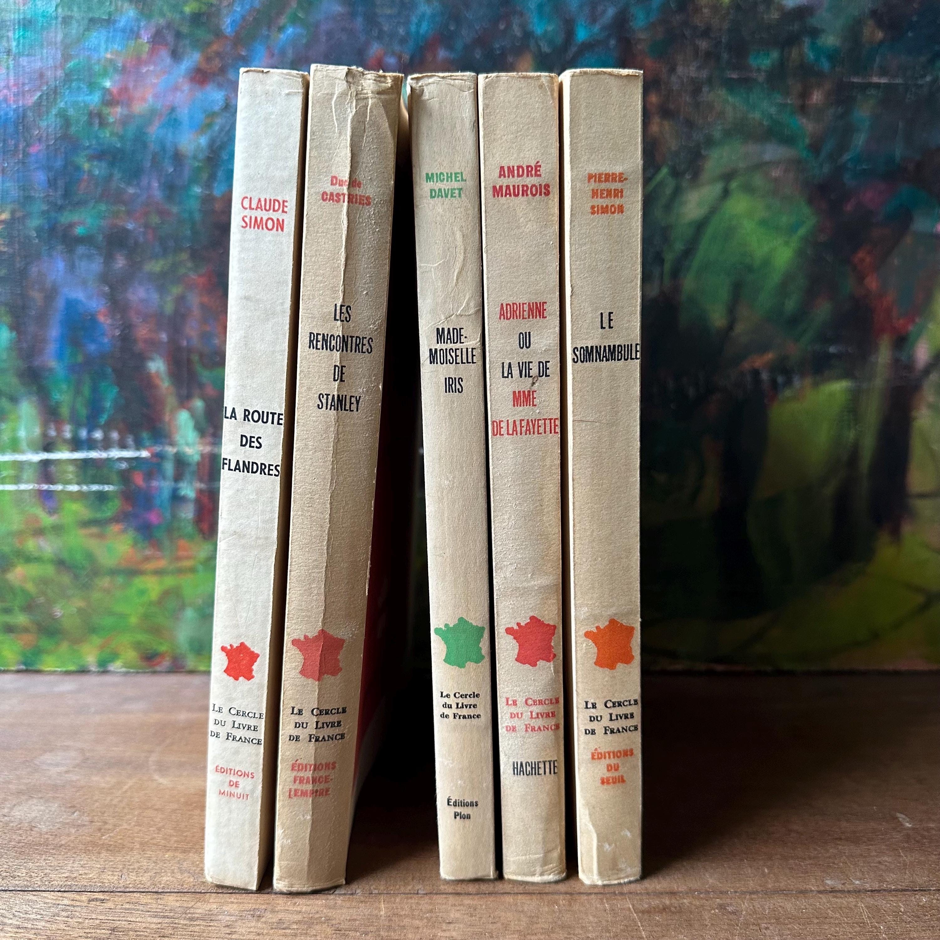 This is a set of 5 1960s era Le Cercle du Livre de France French paperbacks. The set includes La Route des Flandres by Claude Simon, Les Rencontres de Stanley by Duc de Castries, Adrienne ou la vie de Mme de la Fayette by Andre Maurois, Le Somnambule by Pierre-Henri Simon, and Mademoiselle Iris by Michel-Davet. Each book has a cream colored spine with the outline of France in green, red, or orange. The colors all vary in color but stay in the shades of red, green, and orange. Each book has rough cut pages.