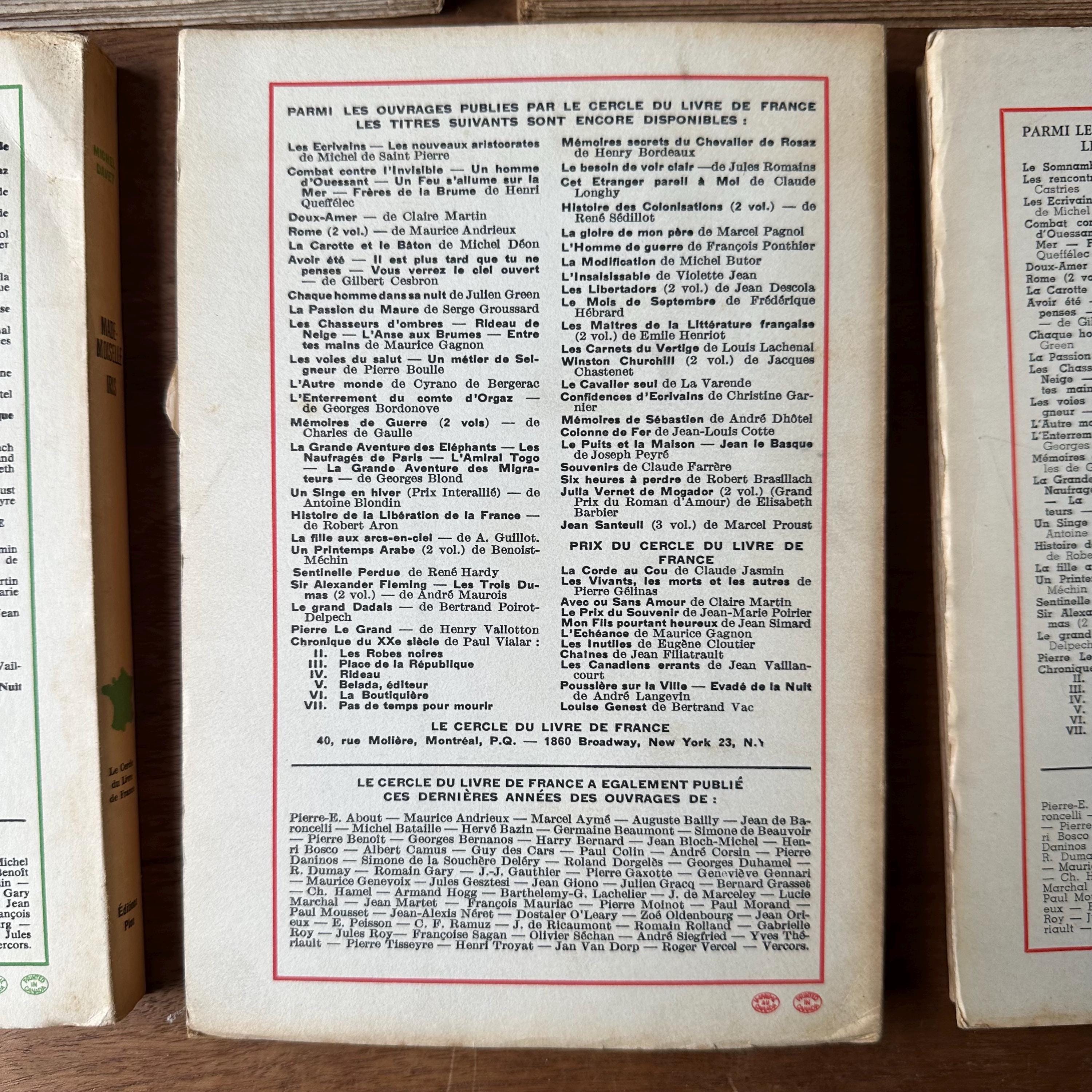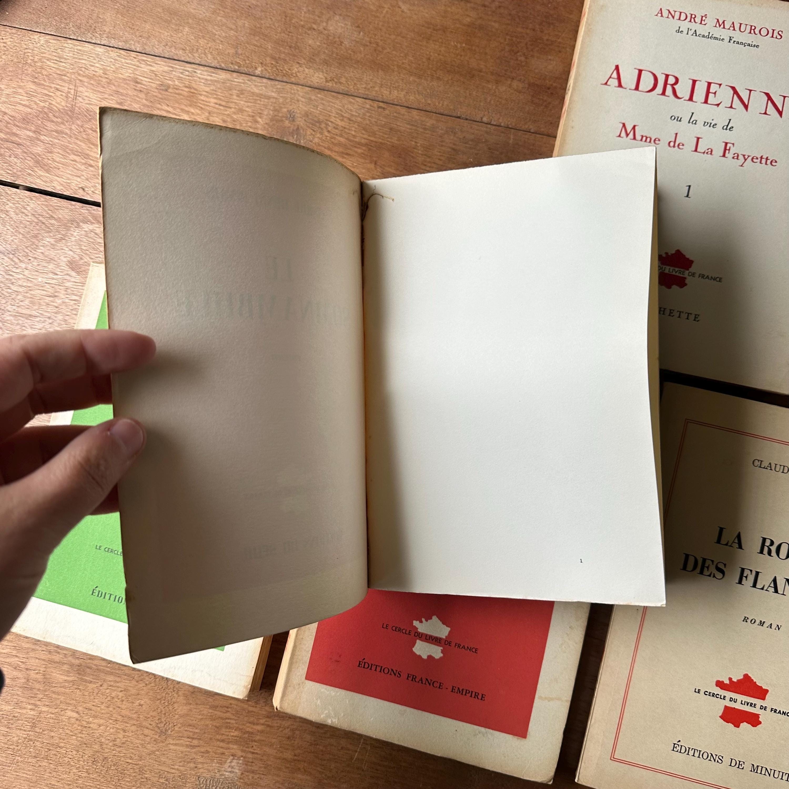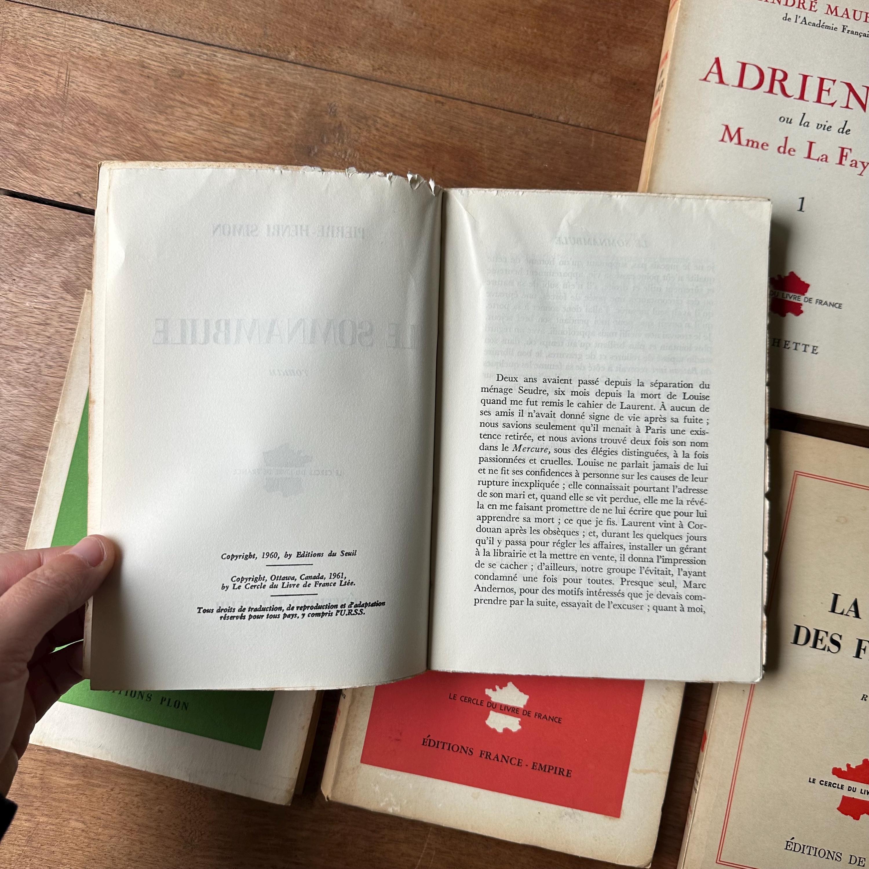 This is a set of 5 1960s era Le Cercle du Livre de France French paperbacks. The set includes La Route des Flandres by Claude Simon, Les Rencontres de Stanley by Duc de Castries, Adrienne ou la vie de Mme de la Fayette by Andre Maurois, Le Somnambule by Pierre-Henri Simon, and Mademoiselle Iris by Michel-Davet. Each book has a cream colored spine with the outline of France in green, red, or orange. The colors all vary in color but stay in the shades of red, green, and orange. Each book has rough cut pages.