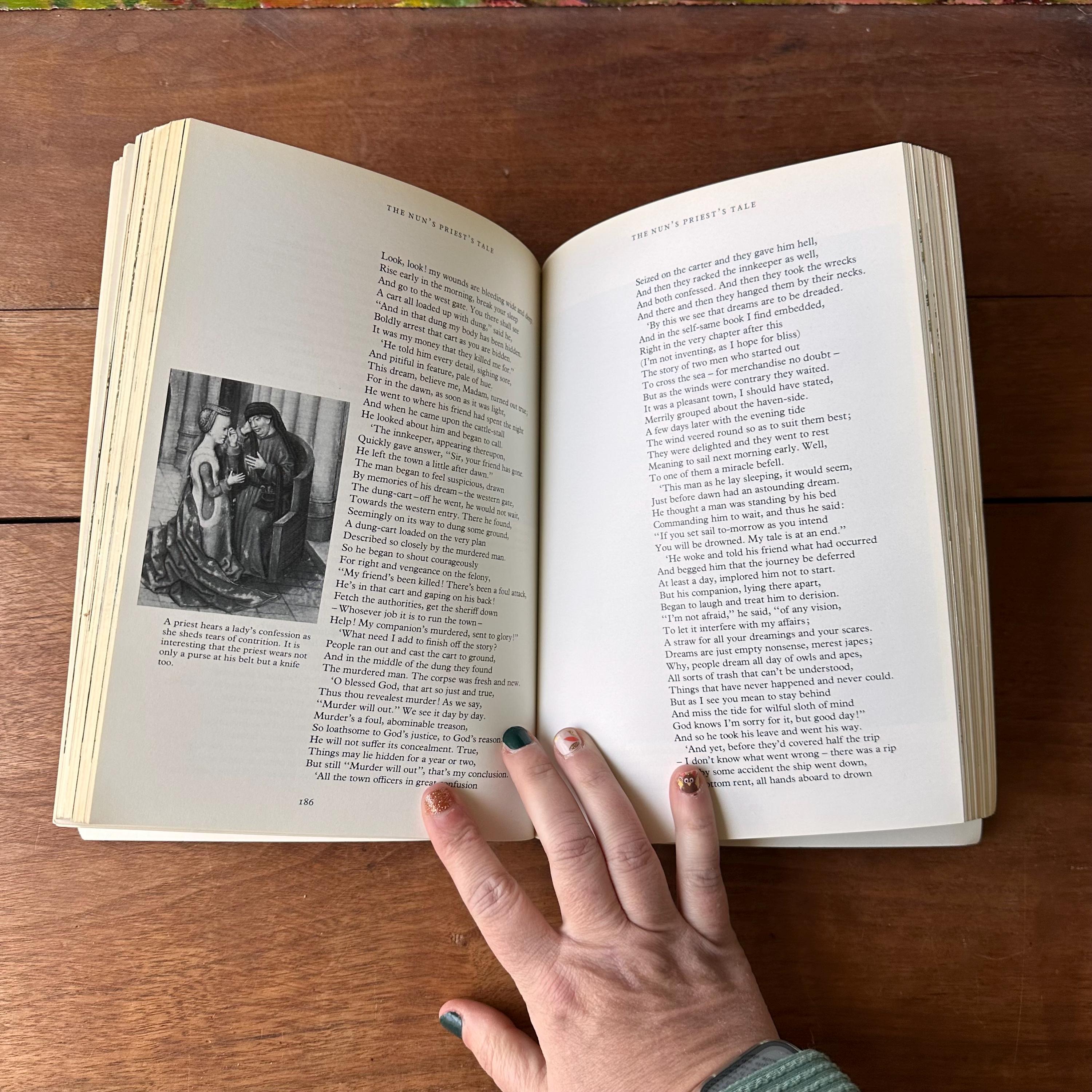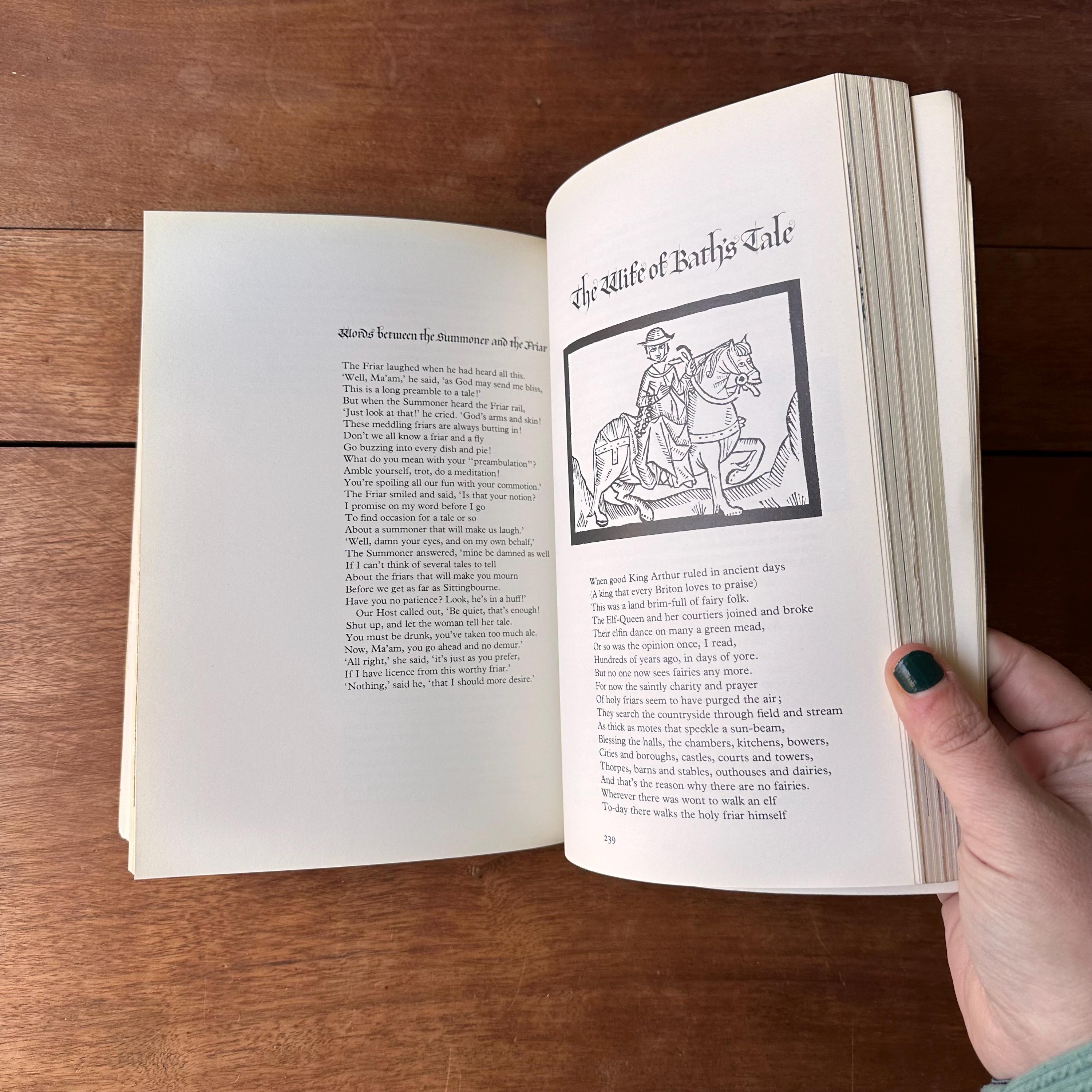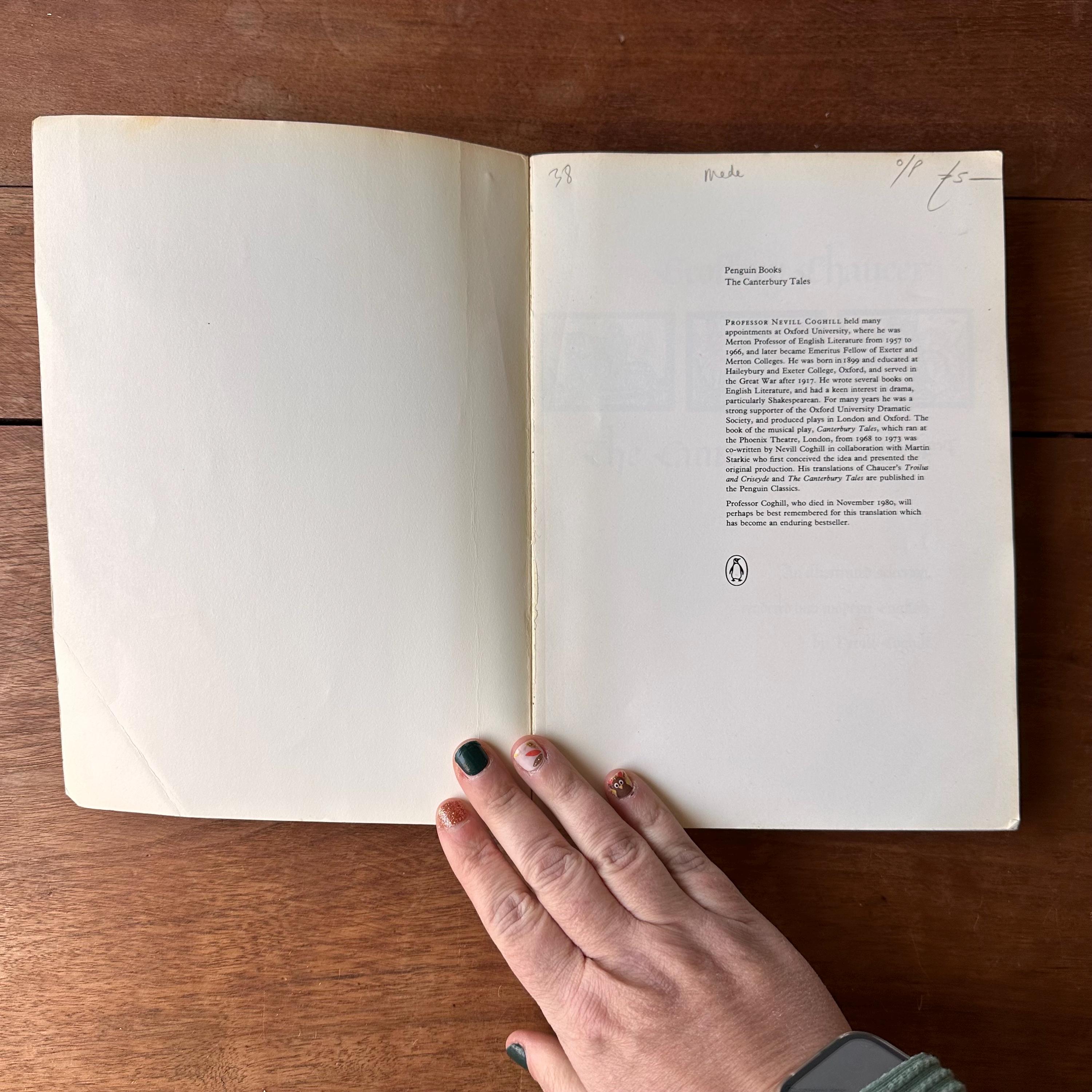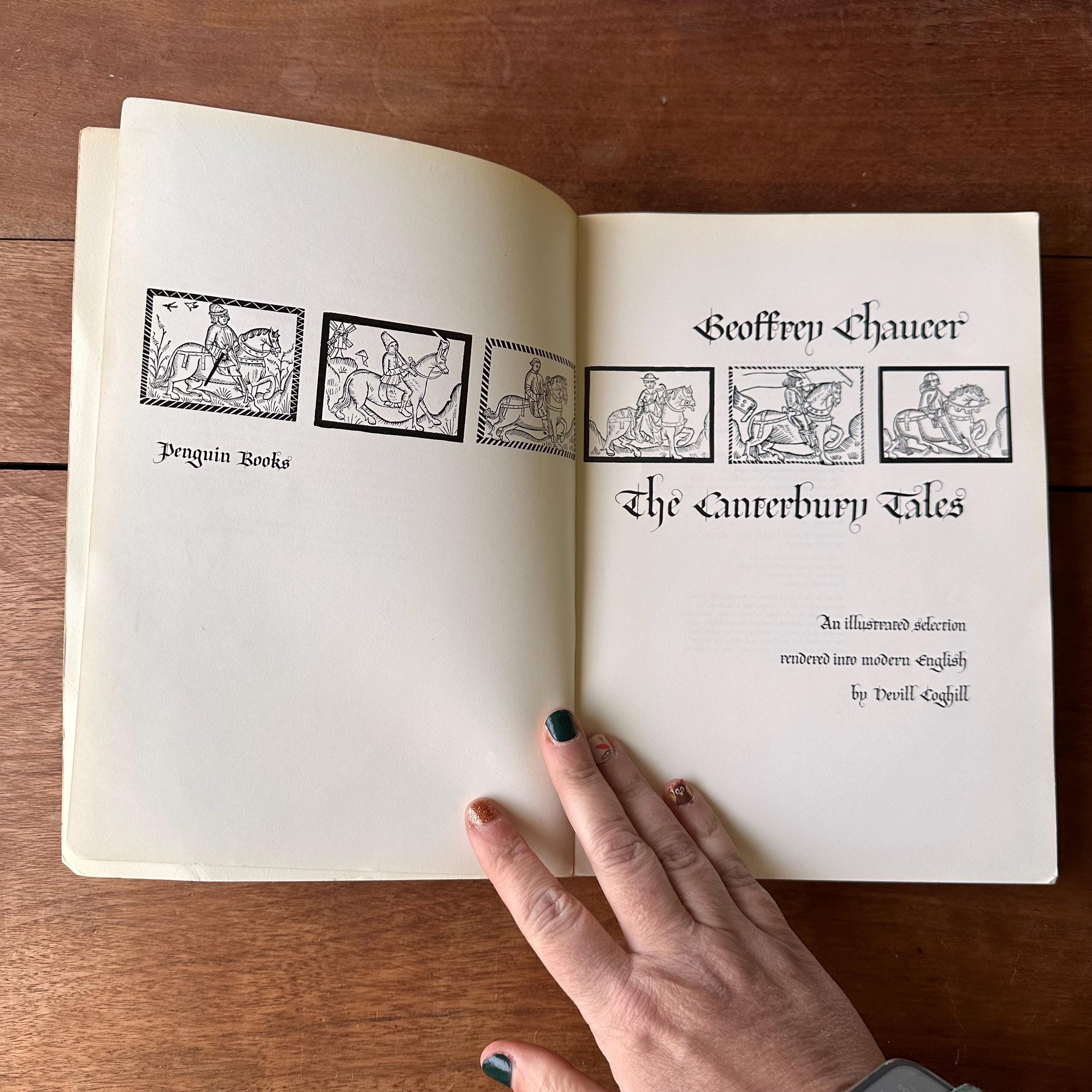 This is an illustrated edition of Geoffrey Chaucer's The Canterbury Tales, rendered into Modern English by Devill Coghill and published by Penguin Books in 1981. It is a thick paperback with black covers and a full color painting of medieval travelers on the cover. The lettering is Gothic script in white and yellow. The spine is also lettered in Gothic script with a full color painting. The book has both black and white and full color illustration plates and the complete text of The Canterbury Tales.